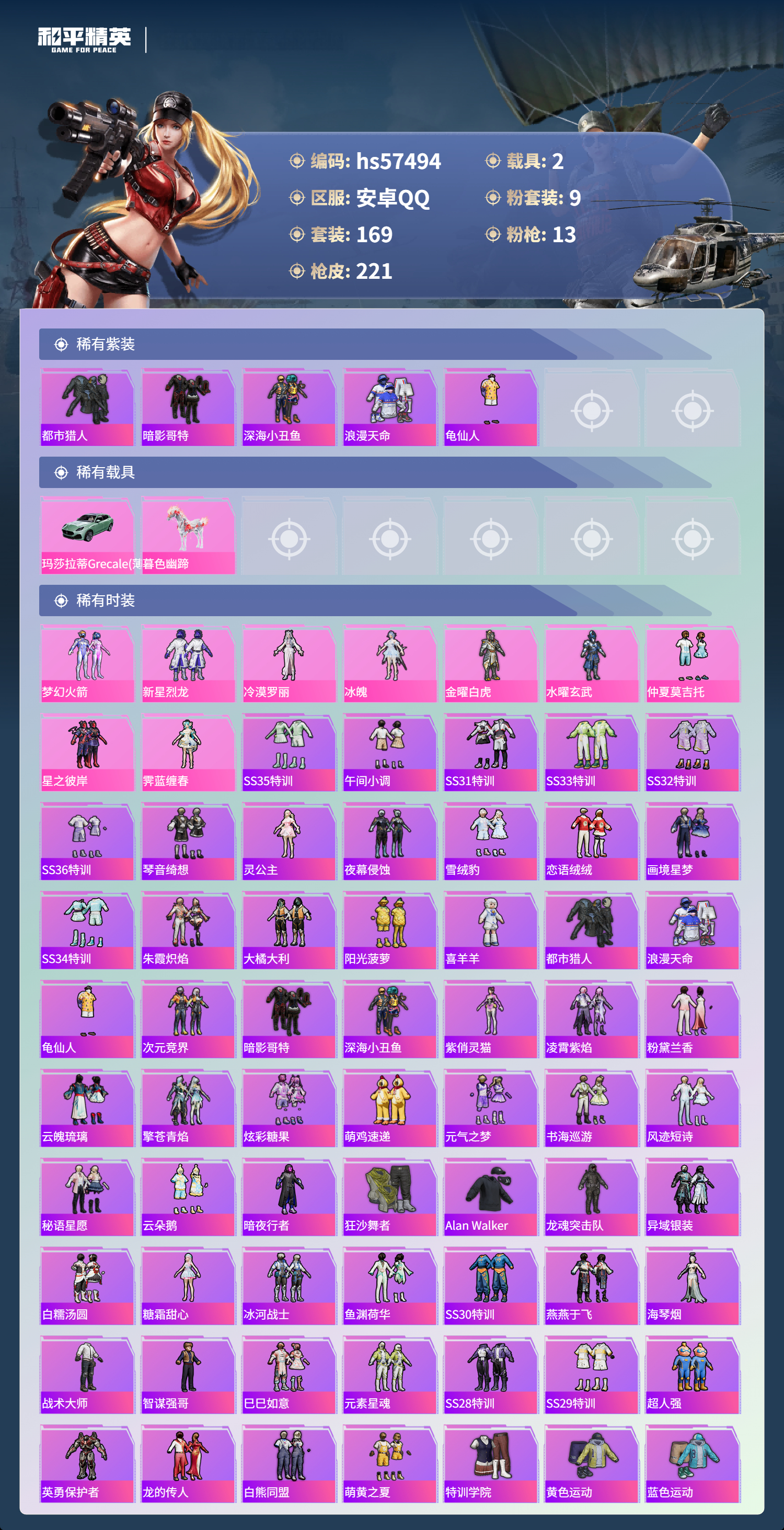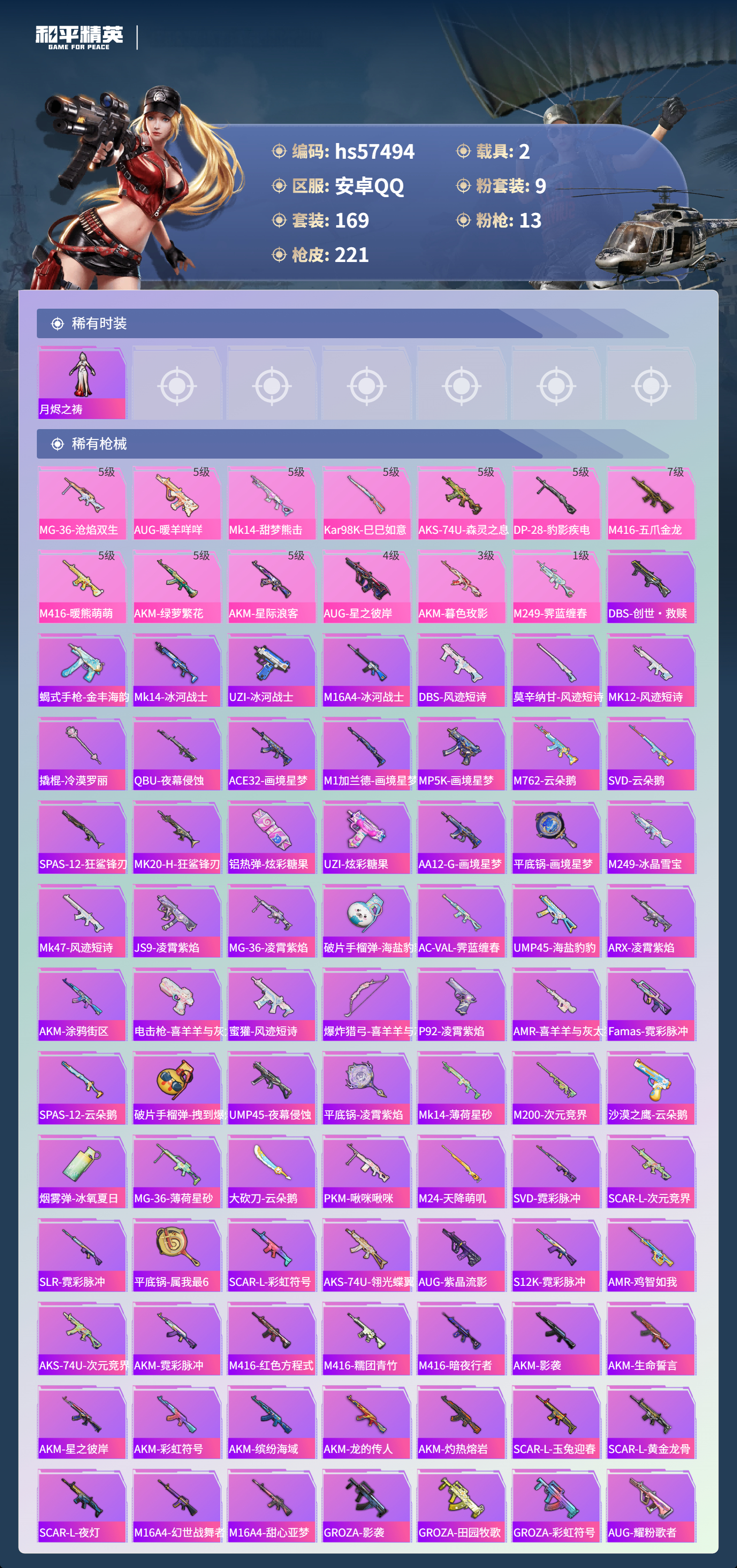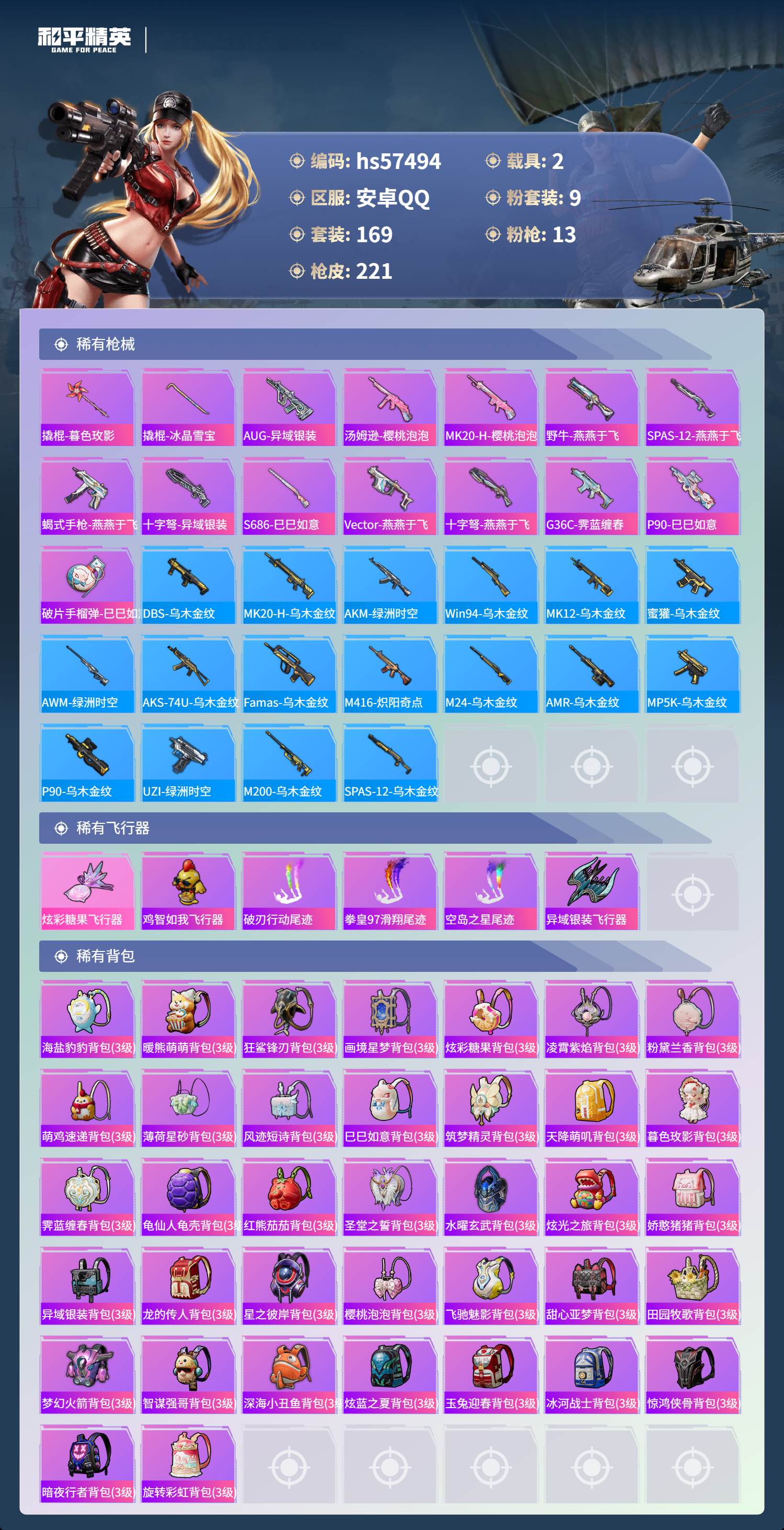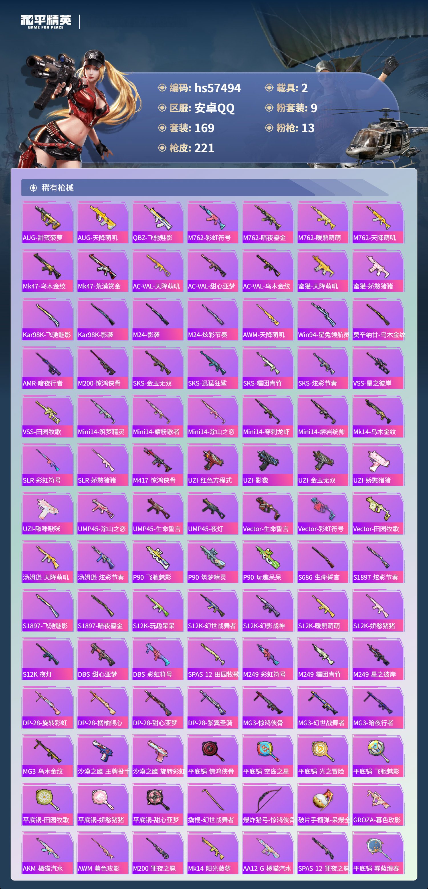 2载具-169套装-221呛皮-hs57494 安卓手q-13王牌印记-9粉装-13特效呛-2载具-73079热力值-169套装-221呛皮-3卓越印记-1传奇印记【9粉装】套装-金曜白虎套装-新星烈龙角色-冰魄套装-水曜玄武角色-霁蓝缠春套装-梦幻火箭角色-冷漠罗丽套装-仲夏莫吉托套装-星之彼岸【13特效呛】mk14-甜梦熊击/5级m249-霁蓝缠春/1级akm-暮色玫影/3级m416-暖熊萌萌/5