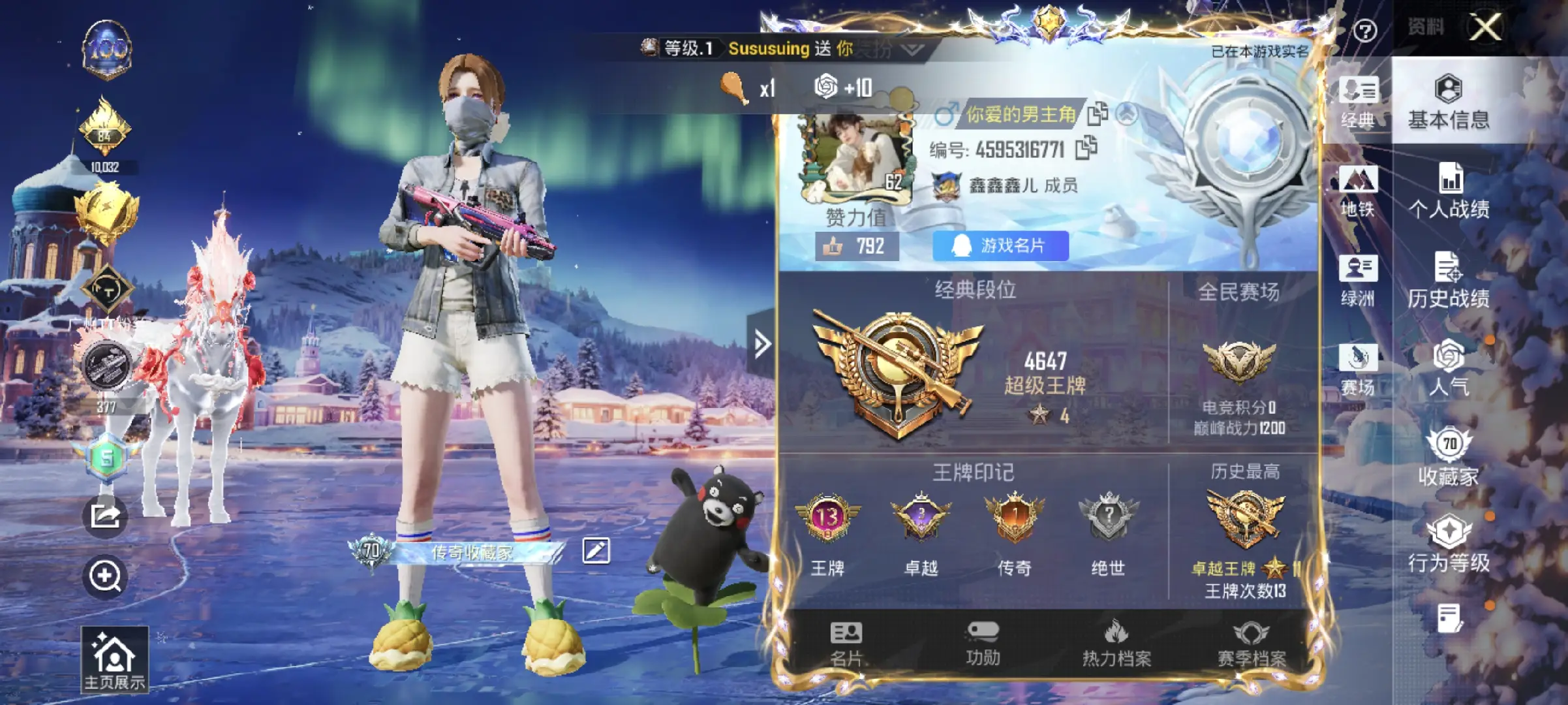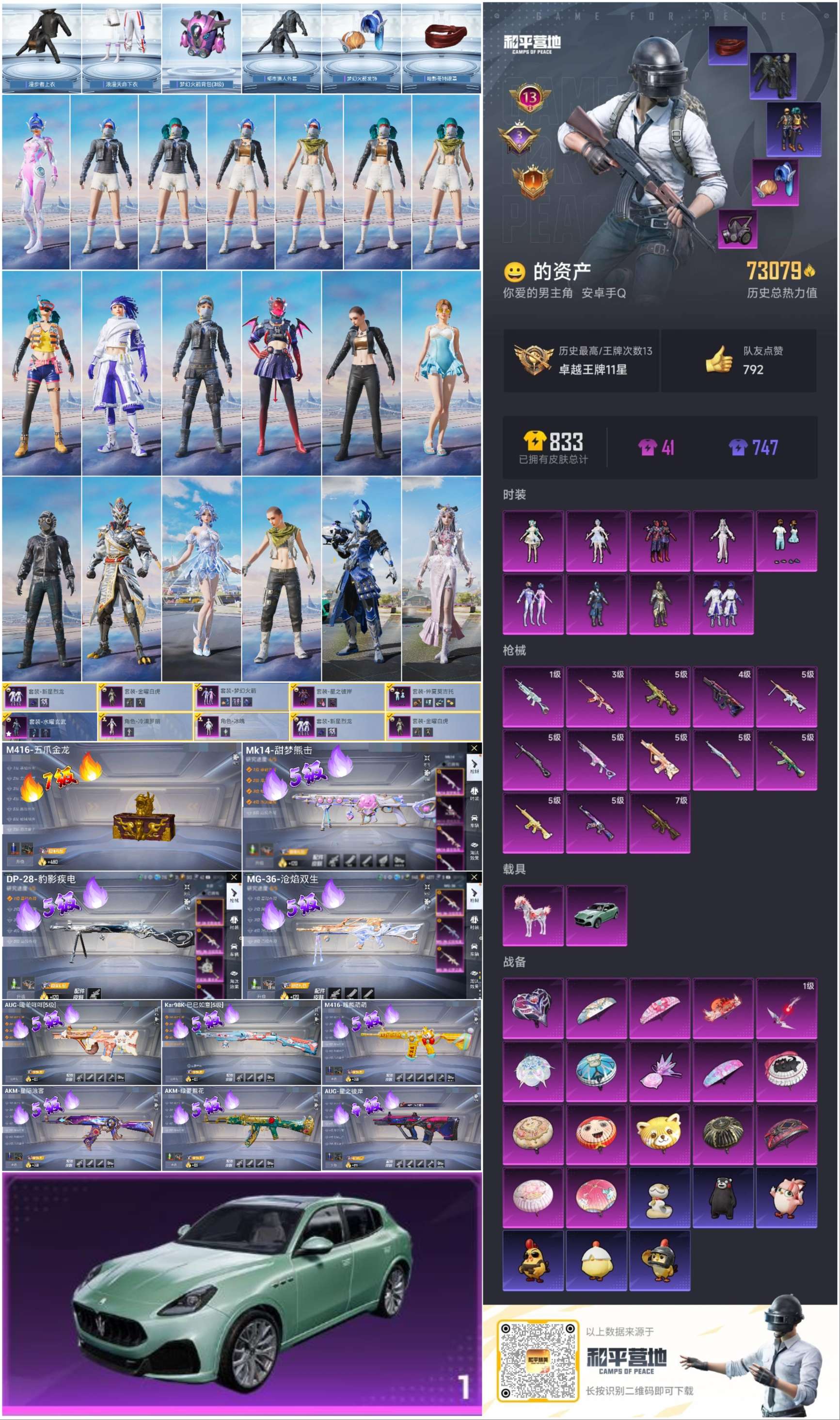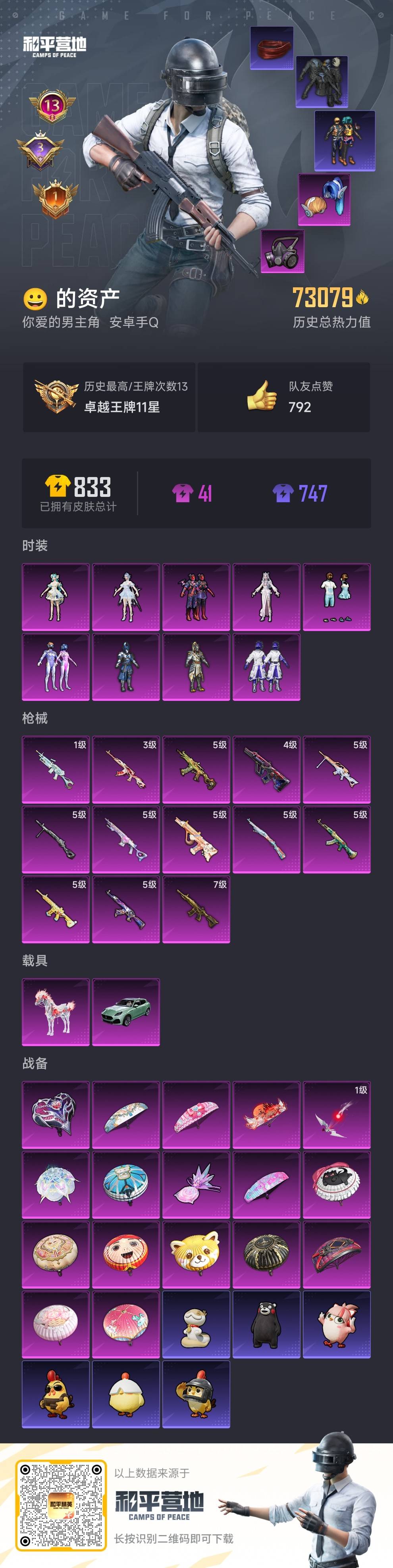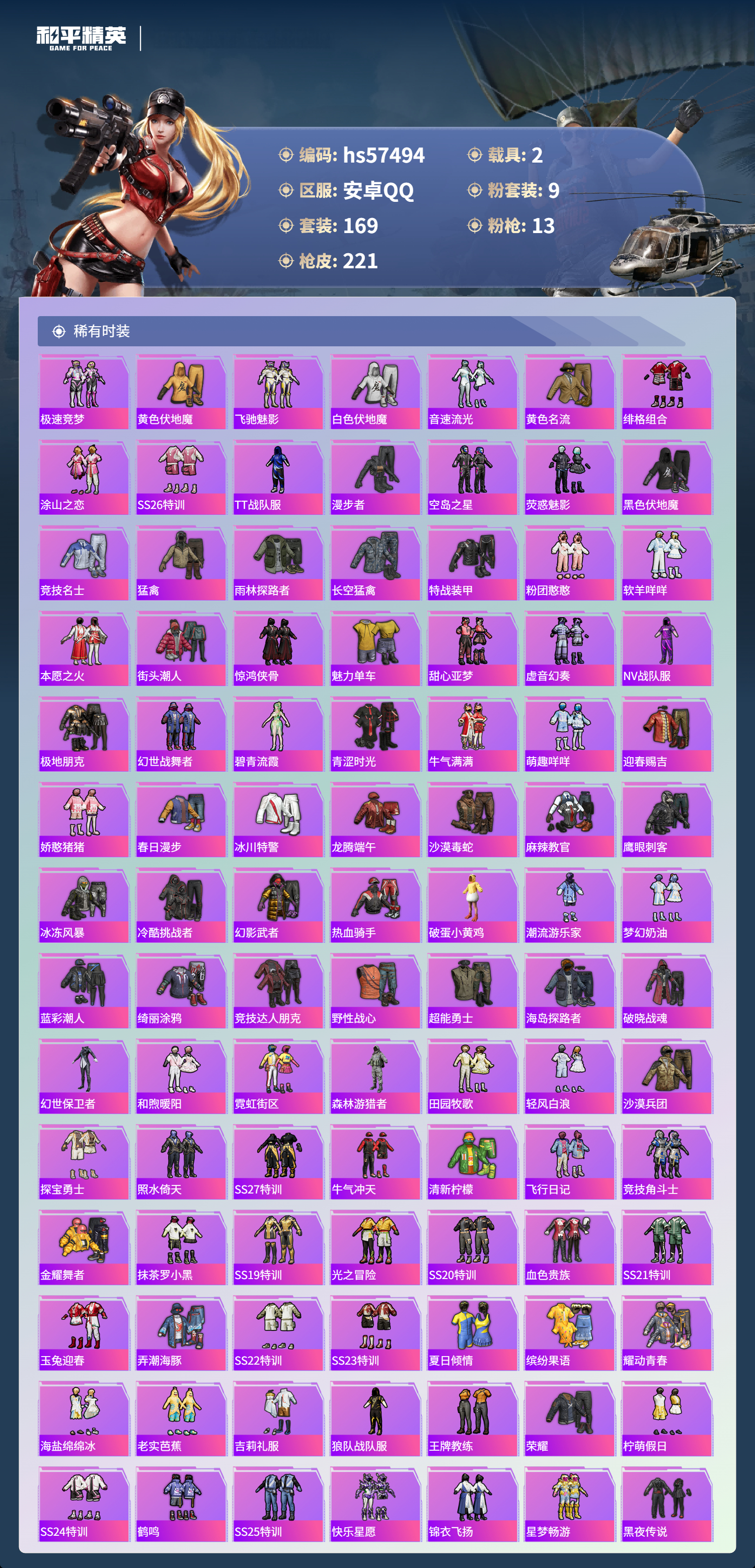 2载具-169套装-221呛皮-hs57494 安卓手q-13王牌印记-9粉装-13特效呛-2载具-73079热力值-169套装-221呛皮-3卓越印记-1传奇印记【9粉装】套装-金曜白虎套装-新星烈龙角色-冰魄套装-水曜玄武角色-霁蓝缠春套装-梦幻火箭角色-冷漠罗丽套装-仲夏莫吉托套装-星之彼岸【13特效呛】mk14-甜梦熊击/5级m249-霁蓝缠春/1级akm-暮色玫影/3级m416-暖熊萌萌/5