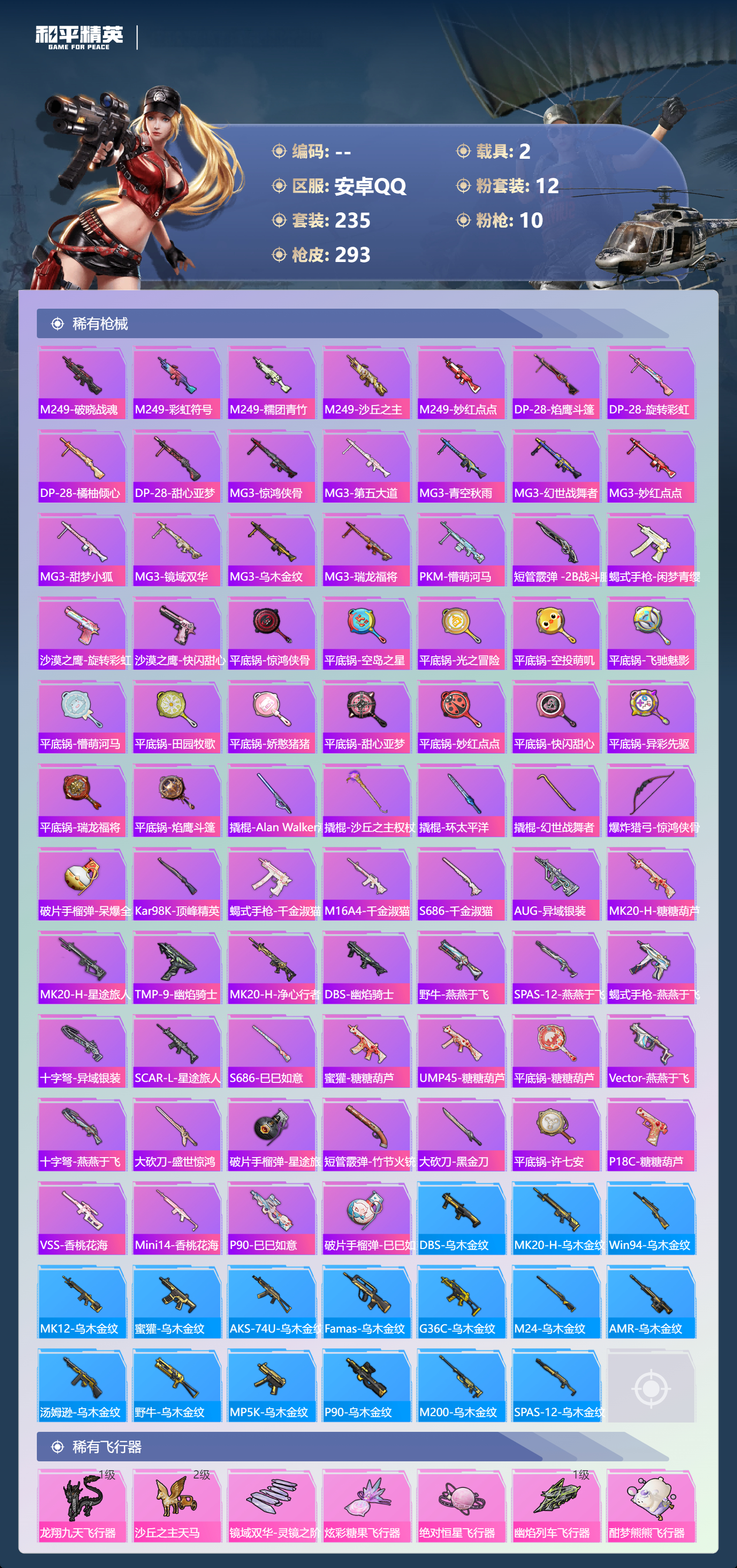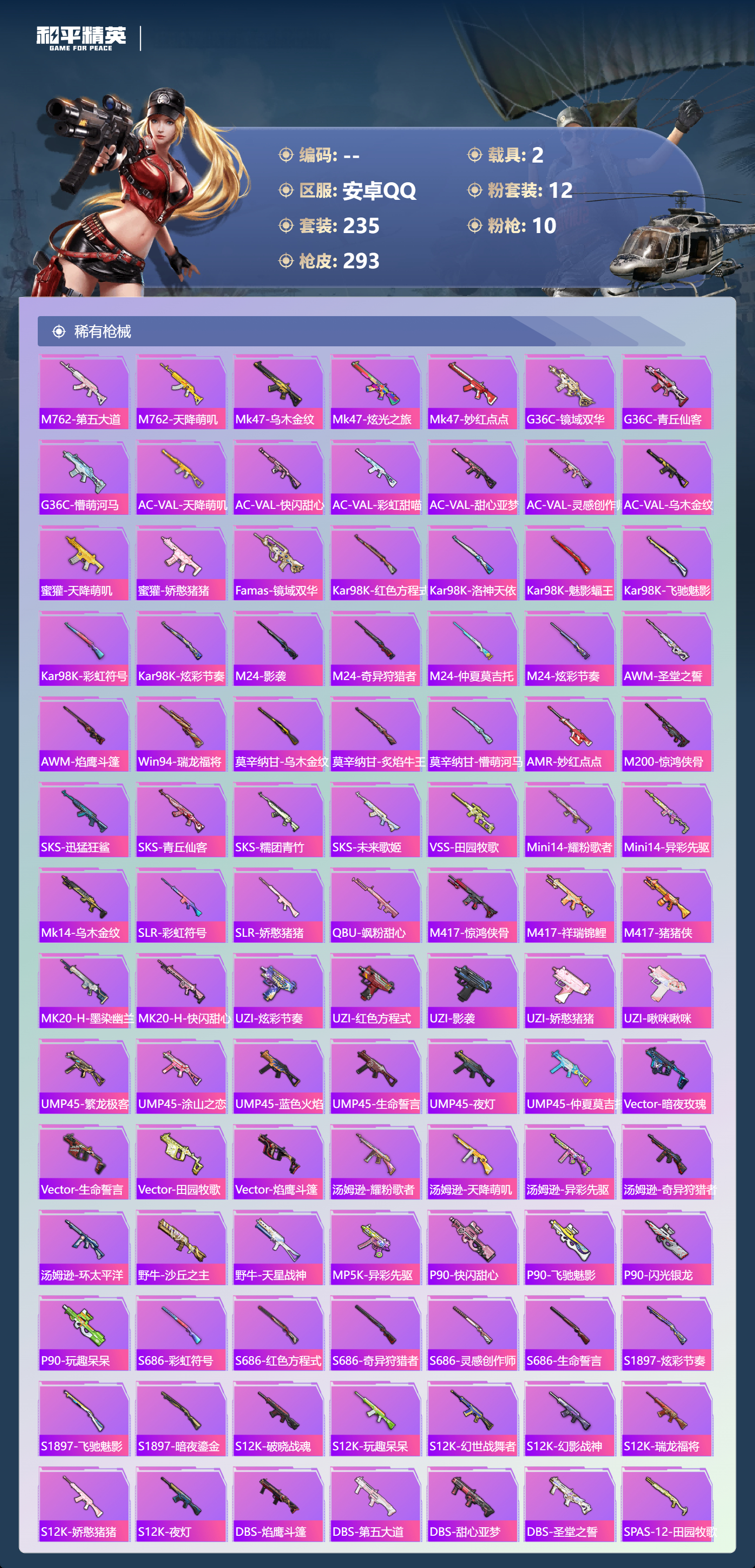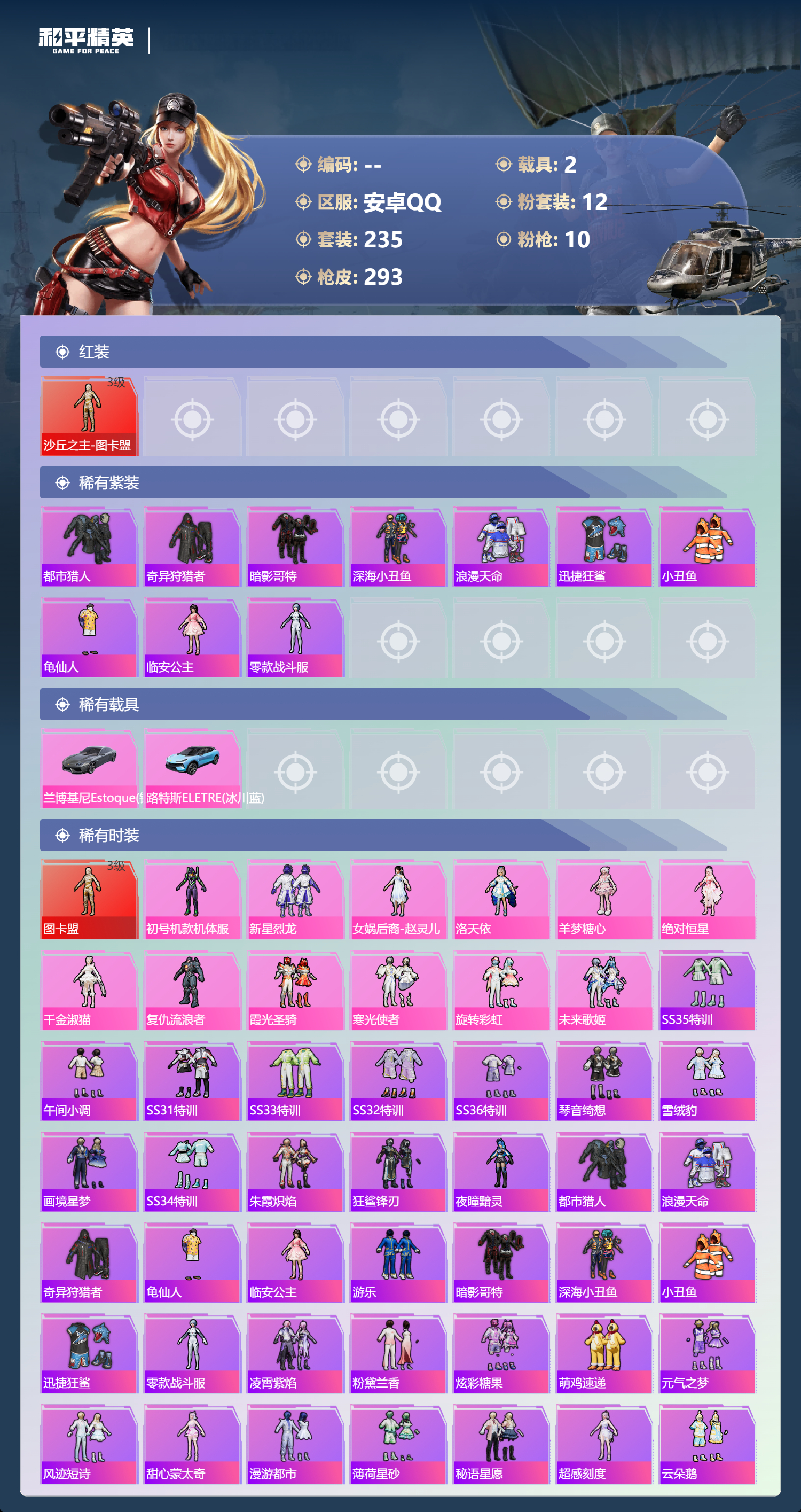 hs57486 安卓手q-16王牌印记-1红装-12粉装-10特效呛-2载具-热力值-235套装-293呛皮-8卓越印记-4传奇印记【1红装】沙丘之主-图卡盟/3级【12粉装】套装-寒光使者套装-旋转彩虹套装-新星烈龙角色-羊梦糖心角色-复仇流浪者角色-绝对恒星角色-洛天依套装-霞光圣骑套装-未来歌姬角色-千金淑猫女娲后裔-赵灵儿角色-初号机款机体服【10特