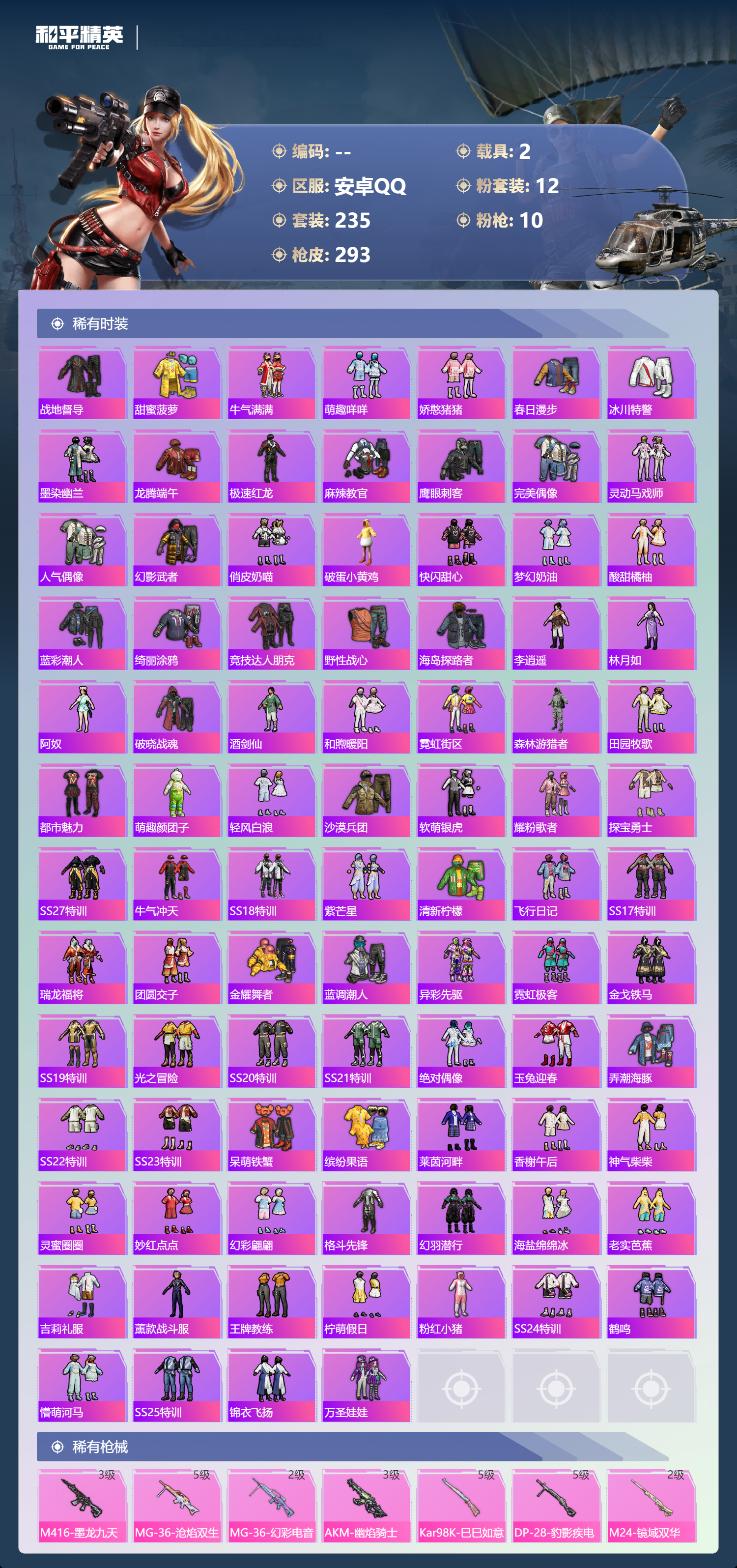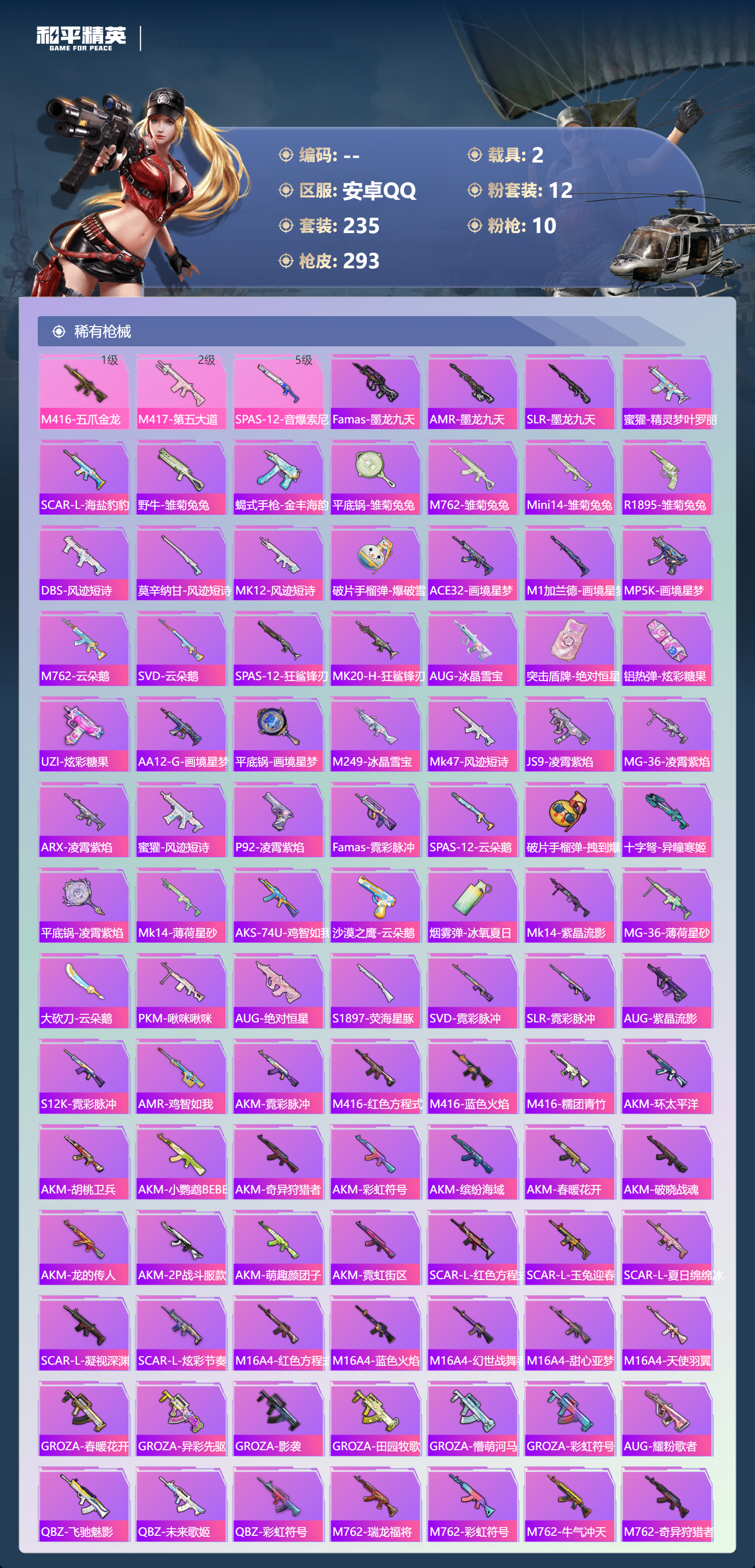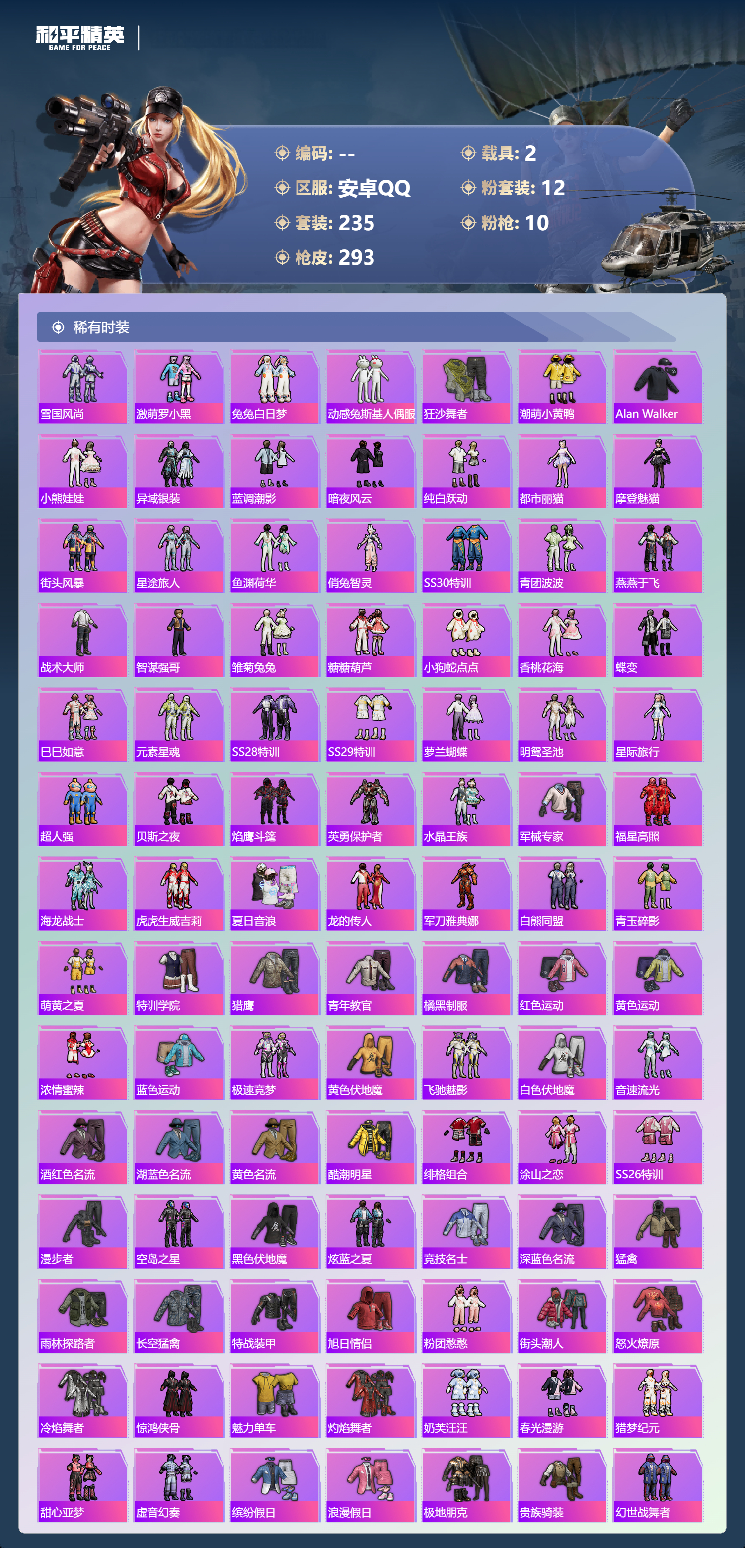 hs57486 安卓手q-16王牌印记-1红装-12粉装-10特效呛-2载具-热力值-235套装-293呛皮-8卓越印记-4传奇印记【1红装】沙丘之主-图卡盟/3级【12粉装】套装-寒光使者套装-旋转彩虹套装-新星烈龙角色-羊梦糖心角色-复仇流浪者角色-绝对恒星角色-洛天依套装-霞光圣骑套装-未来歌姬角色-千金淑猫女娲后裔-赵灵儿角色-初号机款机体服【10特