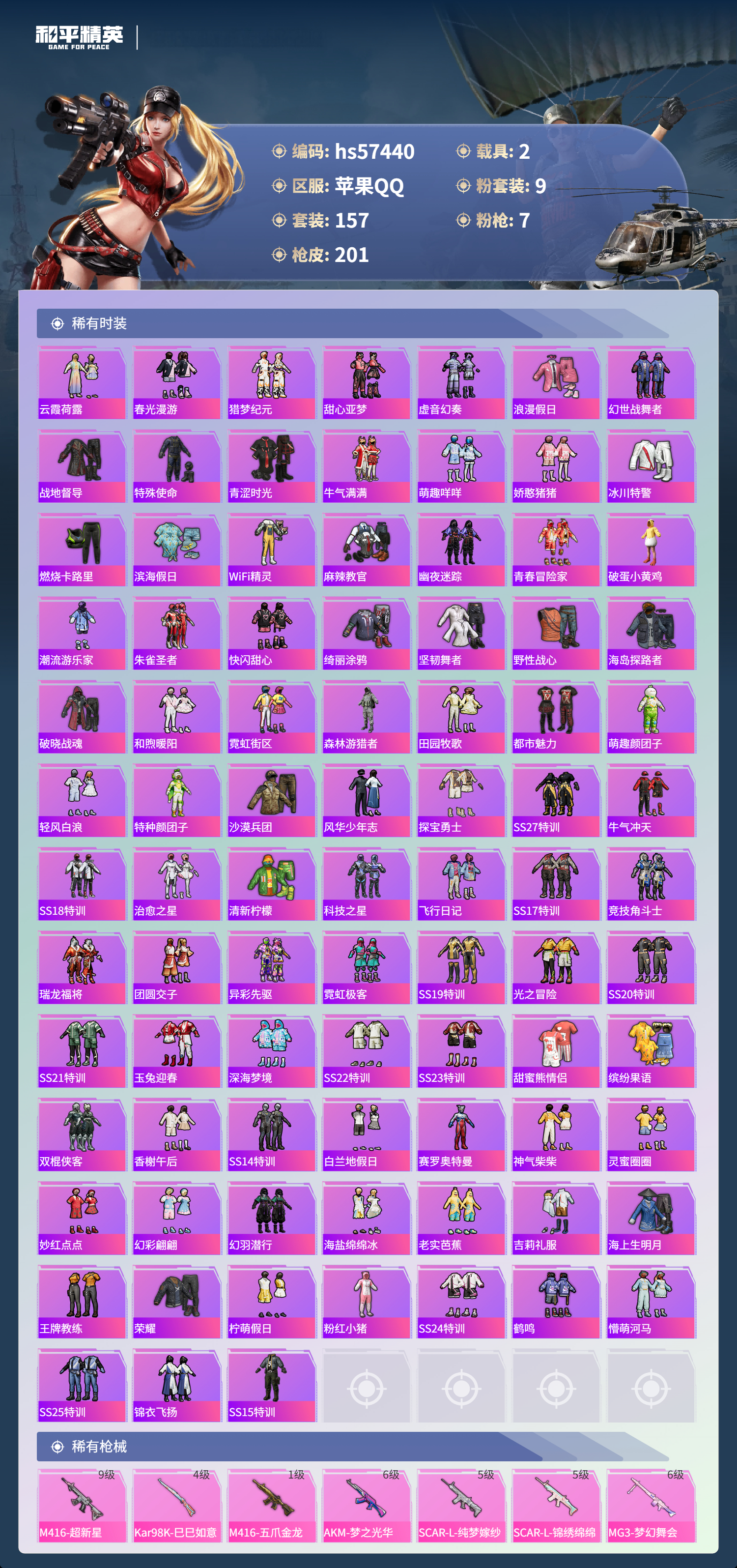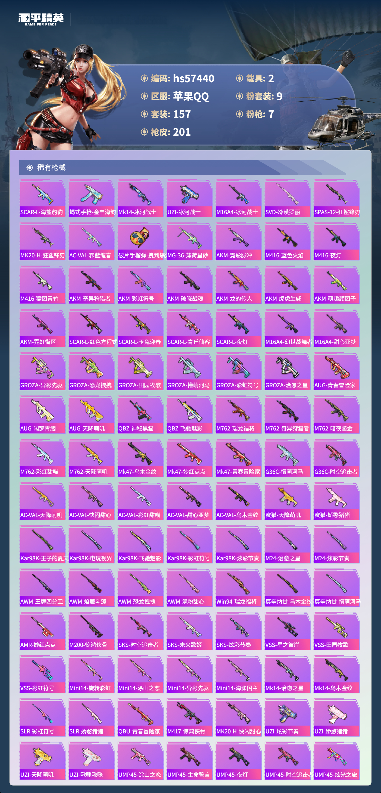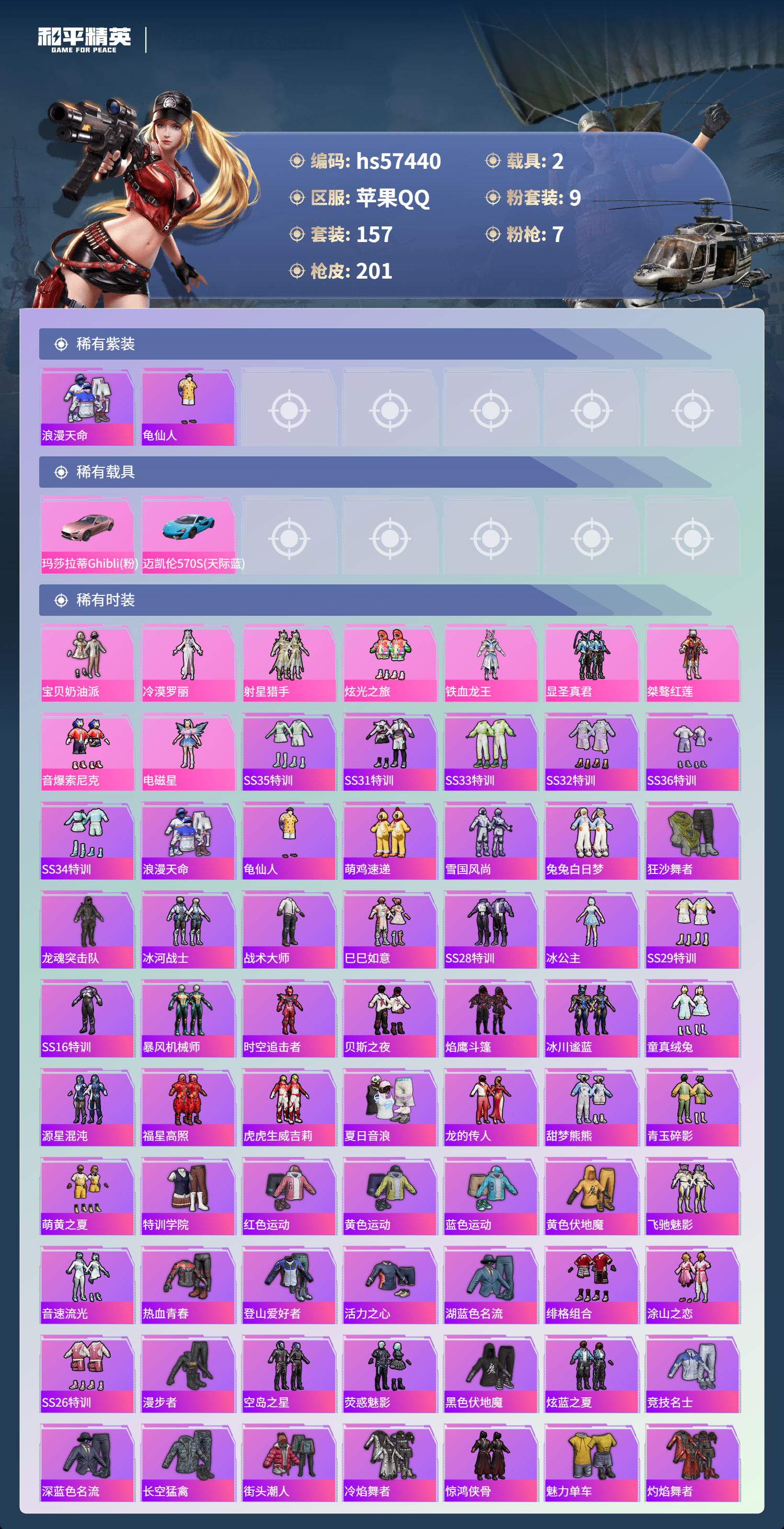 2载具-157套装-201呛皮-hs57440 苹果手q-12王牌印记-9粉装-7特效呛-2载具-74122热力值-157套装-201呛皮-3卓越印记【9粉装】套装-铁血龙王角色-冷漠罗丽套装-音爆索尼克套装-宝贝奶油派套装-显圣真君套装-桀骜红莲套装-炫光之旅套装-射星猎手角色-电磁星【7特效呛】mg3-梦幻舞会/6级scar-l-锦绣绵绵/5级m416-超新星/9级kar98k-巳巳如意/4级a