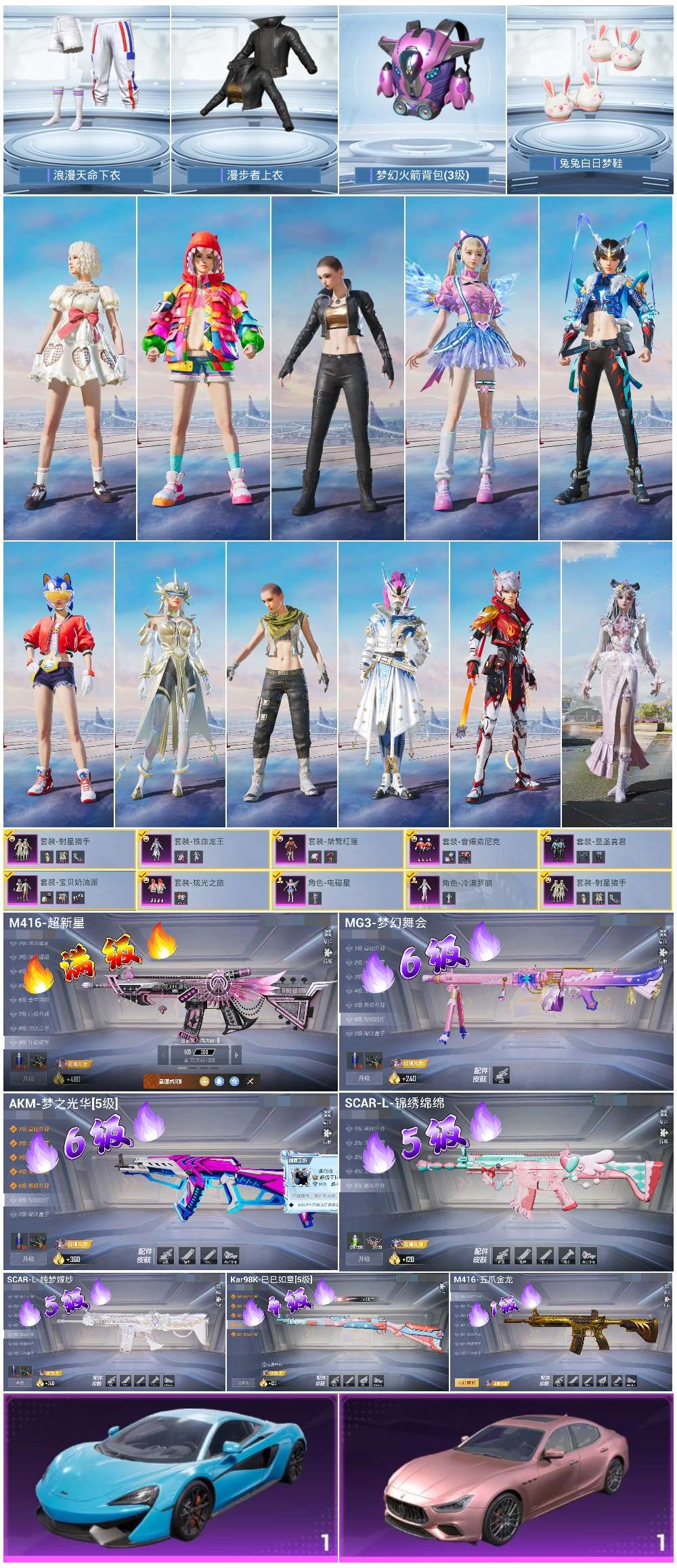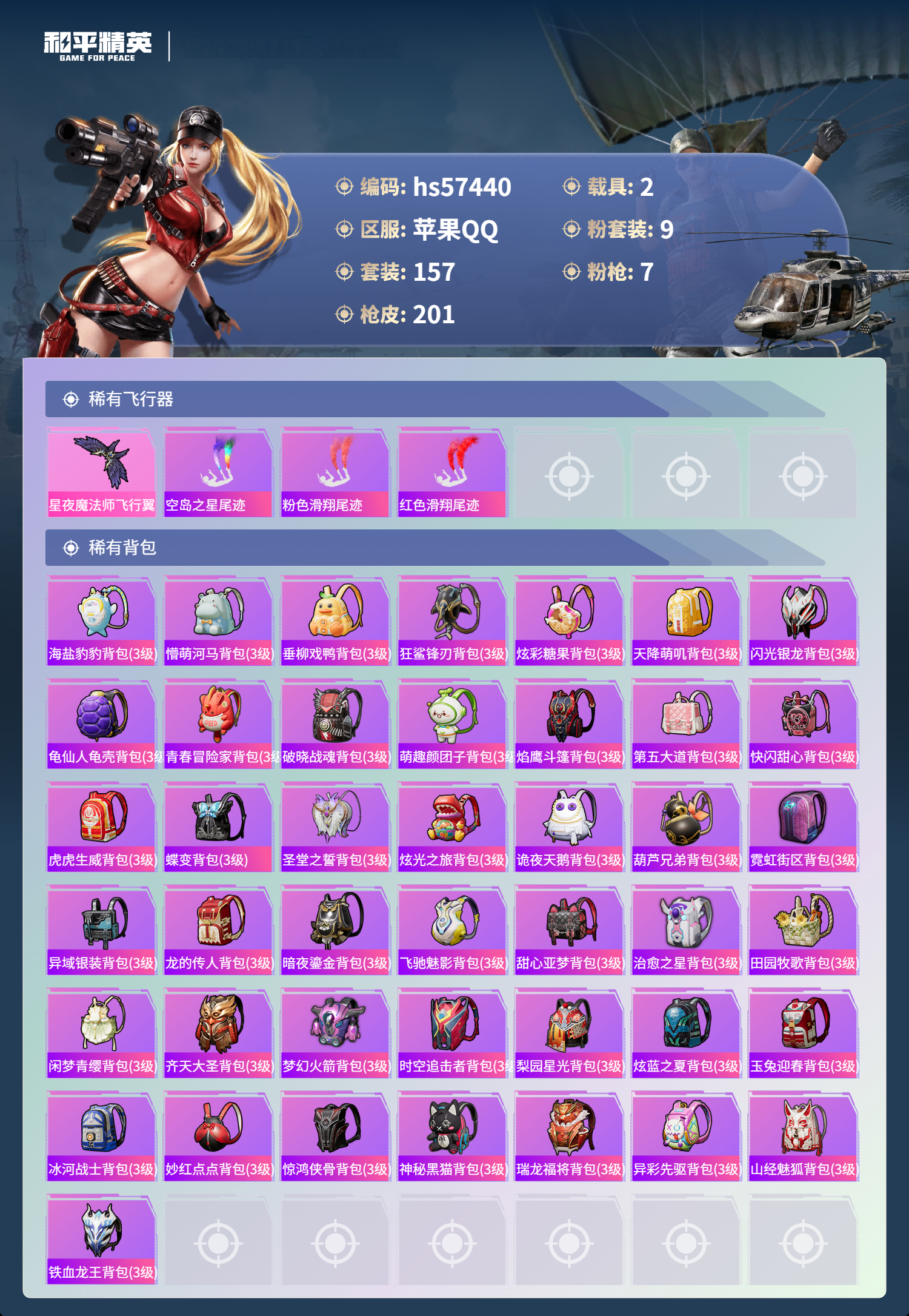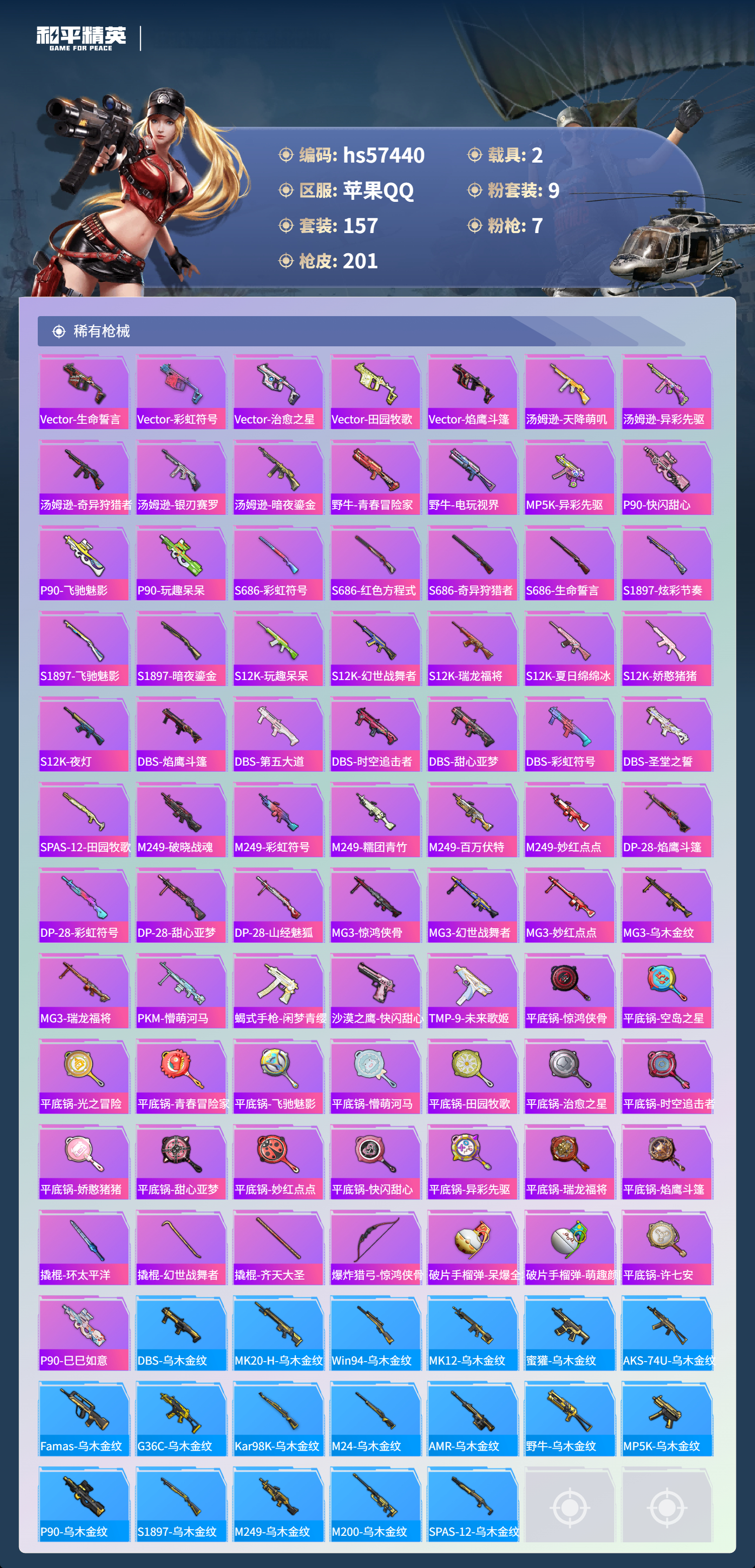 2载具-157套装-201呛皮-hs57440 苹果手q-12王牌印记-9粉装-7特效呛-2载具-74122热力值-157套装-201呛皮-3卓越印记【9粉装】套装-铁血龙王角色-冷漠罗丽套装-音爆索尼克套装-宝贝奶油派套装-显圣真君套装-桀骜红莲套装-炫光之旅套装-射星猎手角色-电磁星【7特效呛】mg3-梦幻舞会/6级scar-l-锦绣绵绵/5级m416-超新星/9级kar98k-巳巳如意/4级a