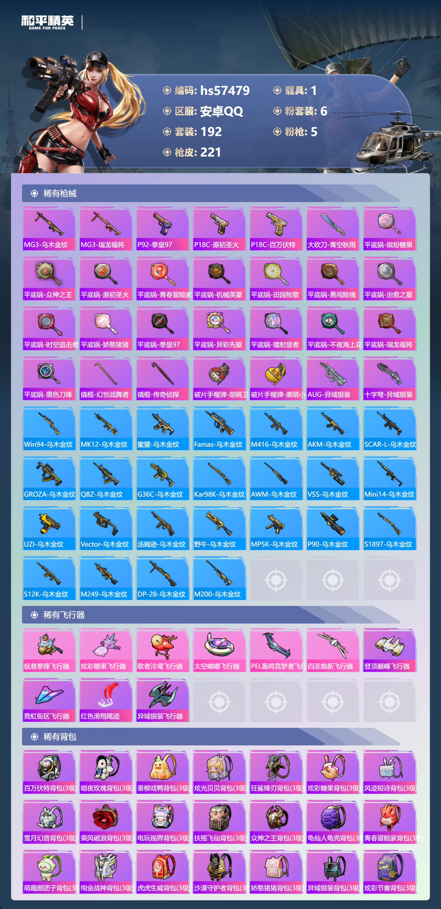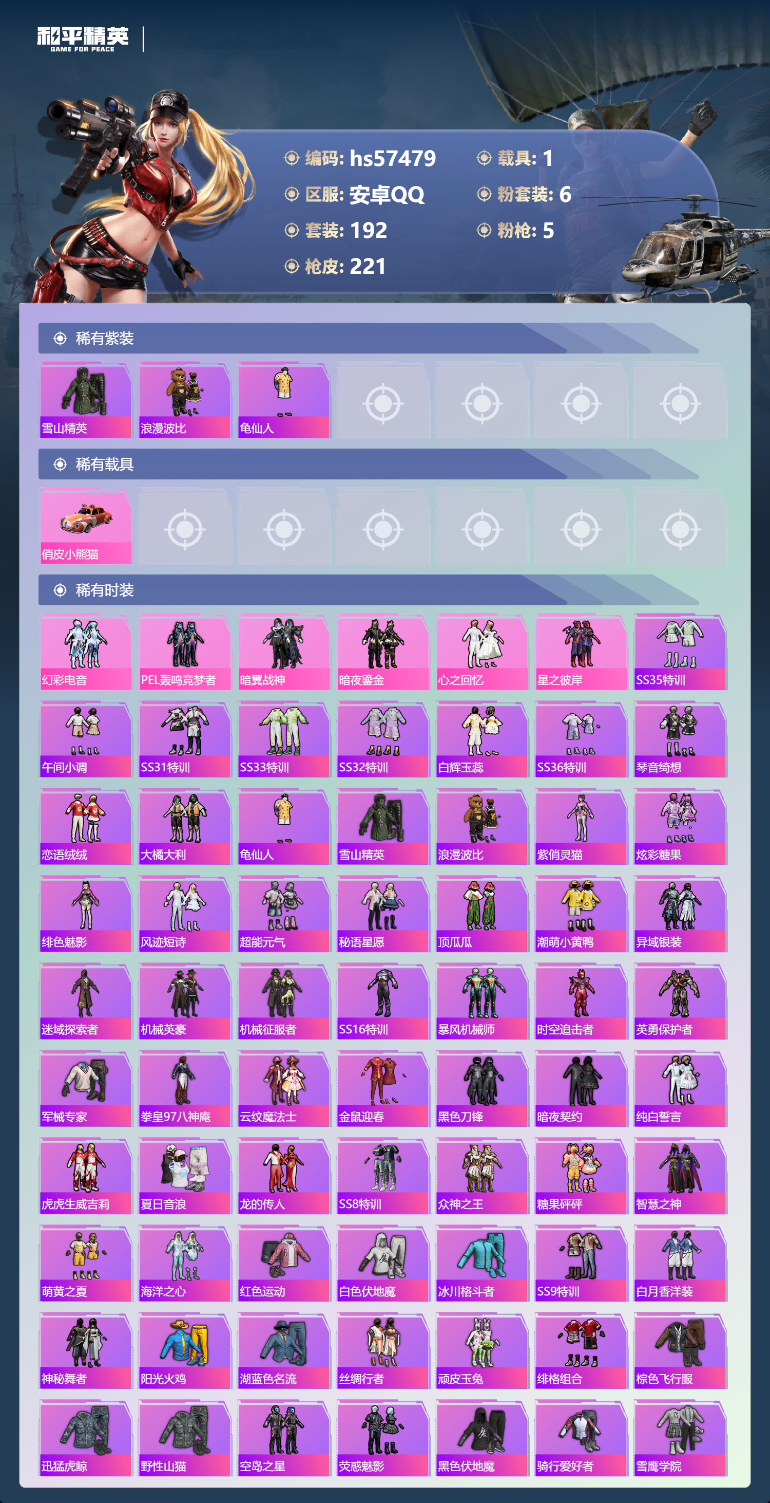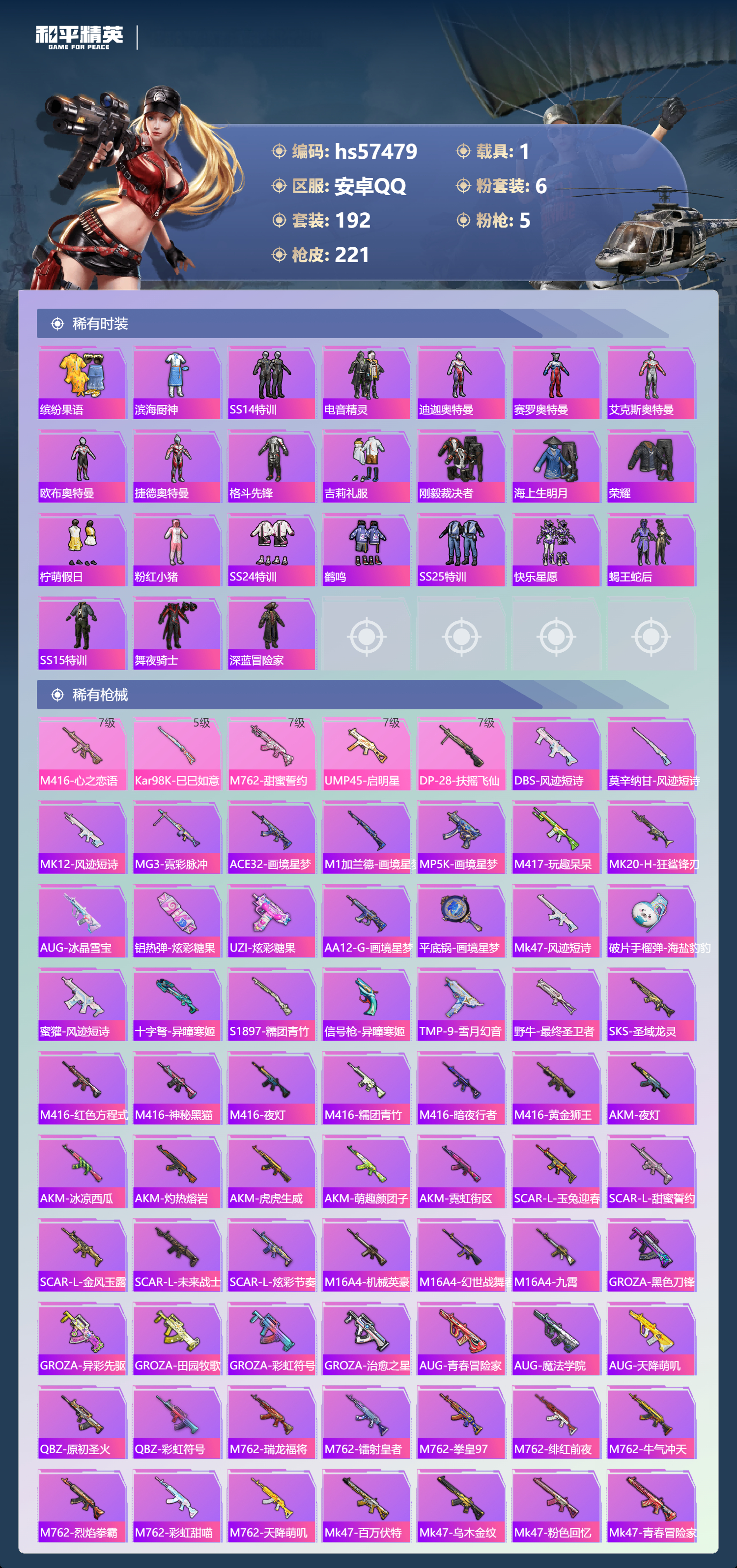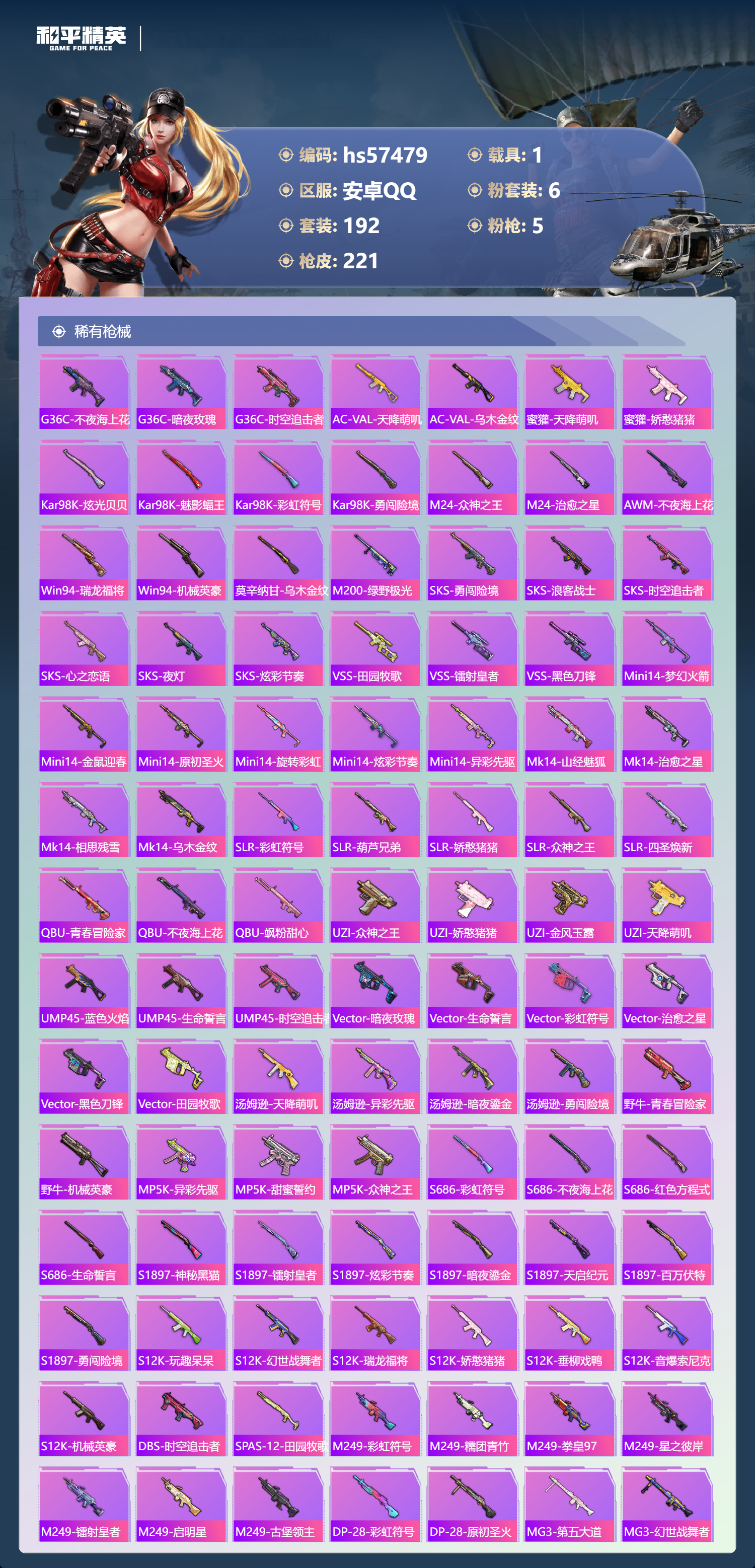 1载具-192套装-221呛皮-hs57479 安卓手q-11王牌印记-6粉装-5特效呛-1载具-79556热力值-192套装-221呛皮-1卓越印记【6粉装】套装-pel轰鸣竞梦者套装-心之回忆套装-幻彩电音套装-星之彼岸套装-暗夜鎏金套装-暗翼战神【5特效呛】kar98k-巳巳如意/5级m416-心之恋语/7级ump45-启明星/7级m762-甜蜜誓约/7级dp-28-扶摇飞仙/7级【3稀有紫装】雪山