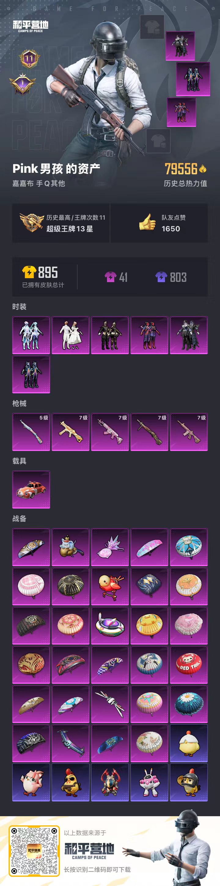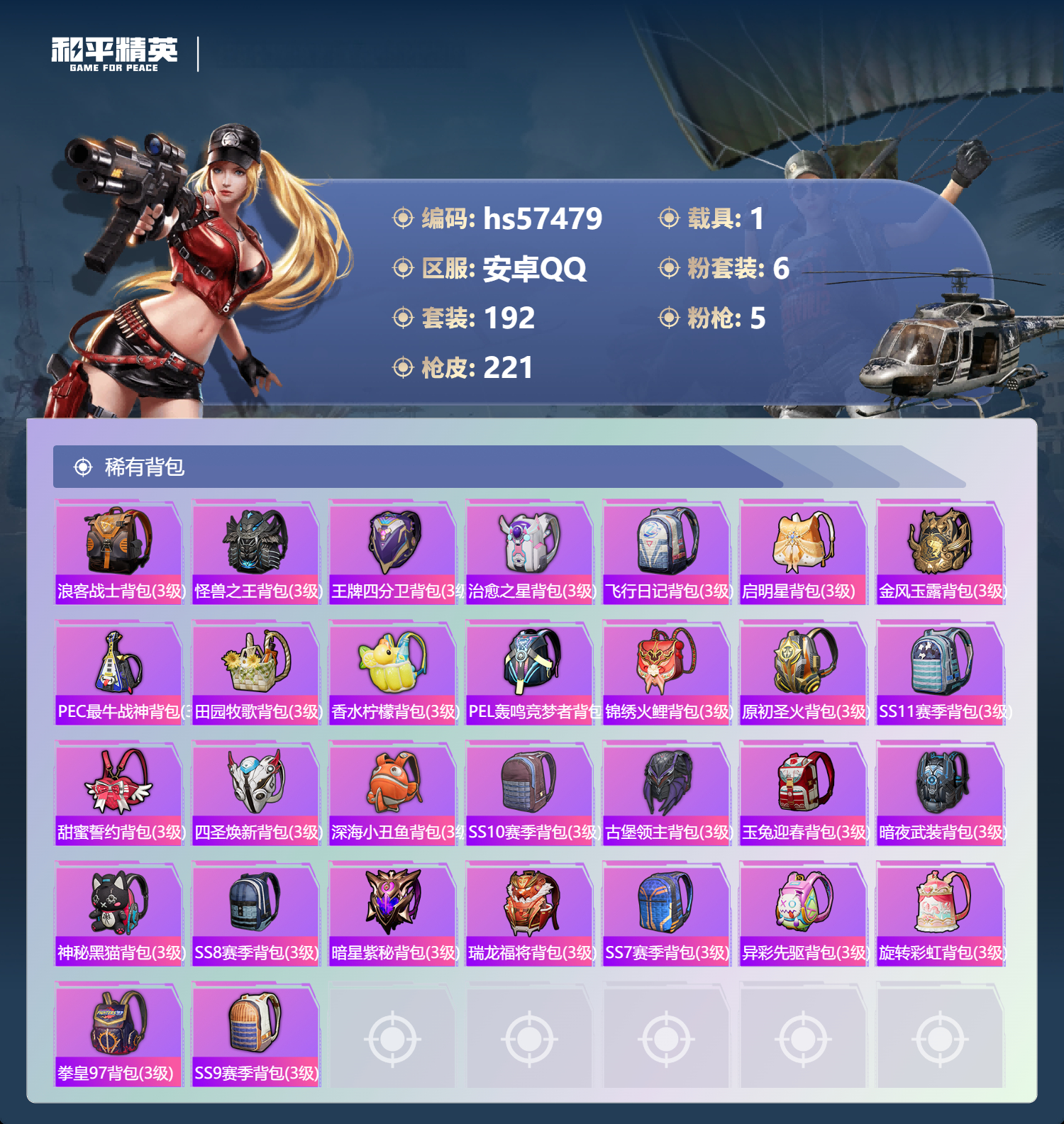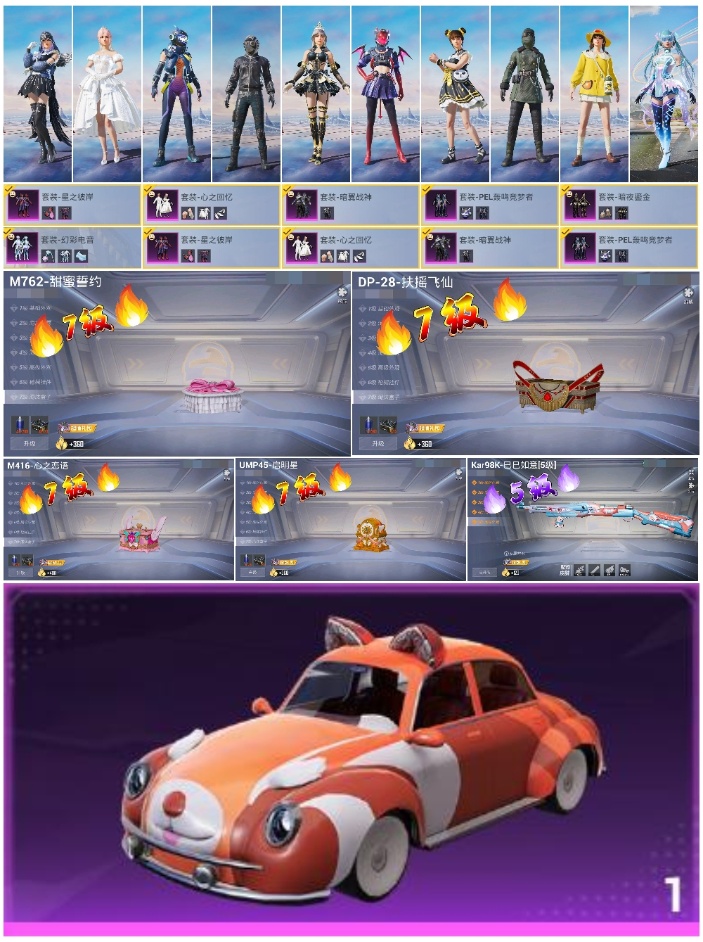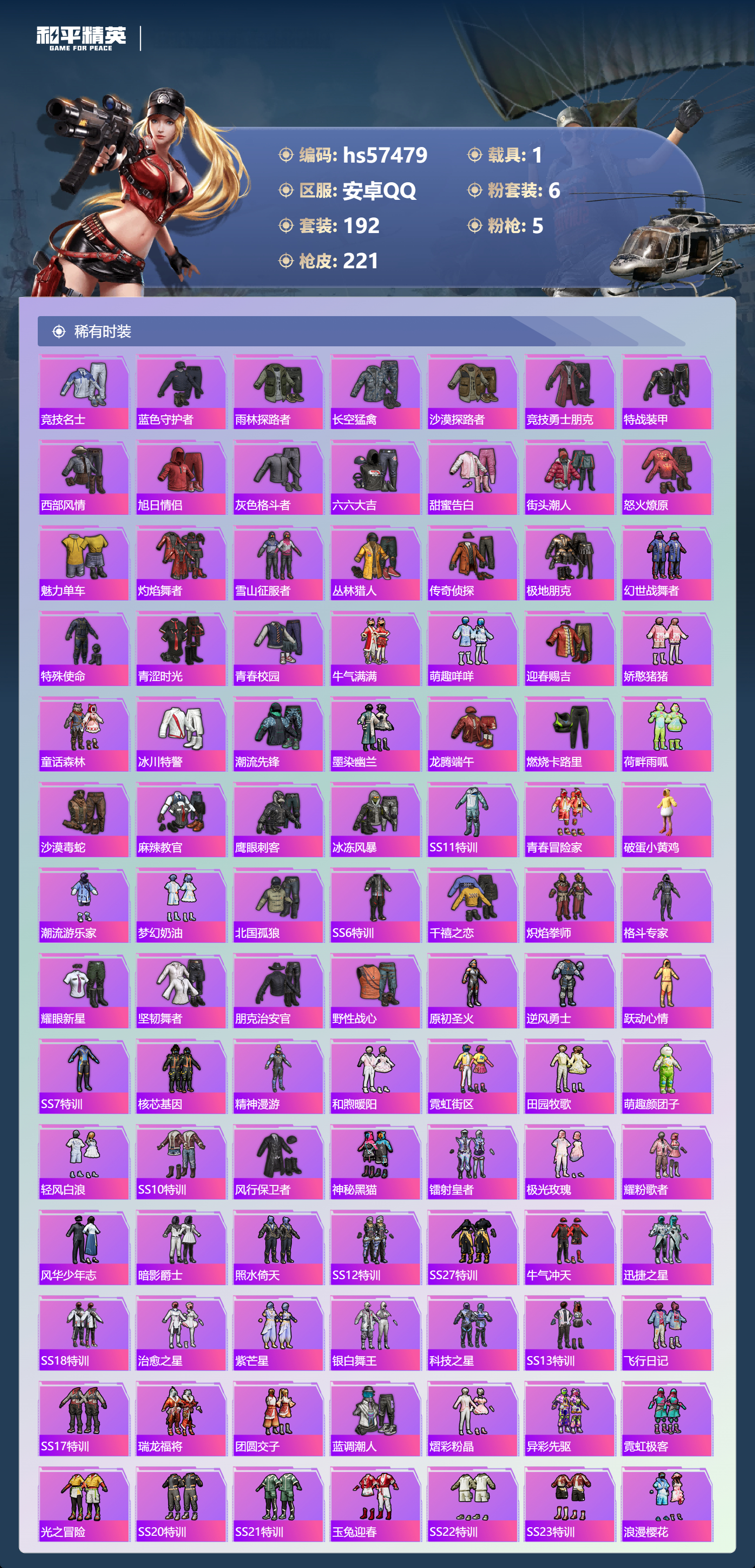 1载具-192套装-221呛皮-hs57479 安卓手q-11王牌印记-6粉装-5特效呛-1载具-79556热力值-192套装-221呛皮-1卓越印记【6粉装】套装-pel轰鸣竞梦者套装-心之回忆套装-幻彩电音套装-星之彼岸套装-暗夜鎏金套装-暗翼战神【5特效呛】kar98k-巳巳如意/5级m416-心之恋语/7级ump45-启明星/7级m762-甜蜜誓约/7级dp-28-扶摇飞仙/7级【3稀有紫装】雪山