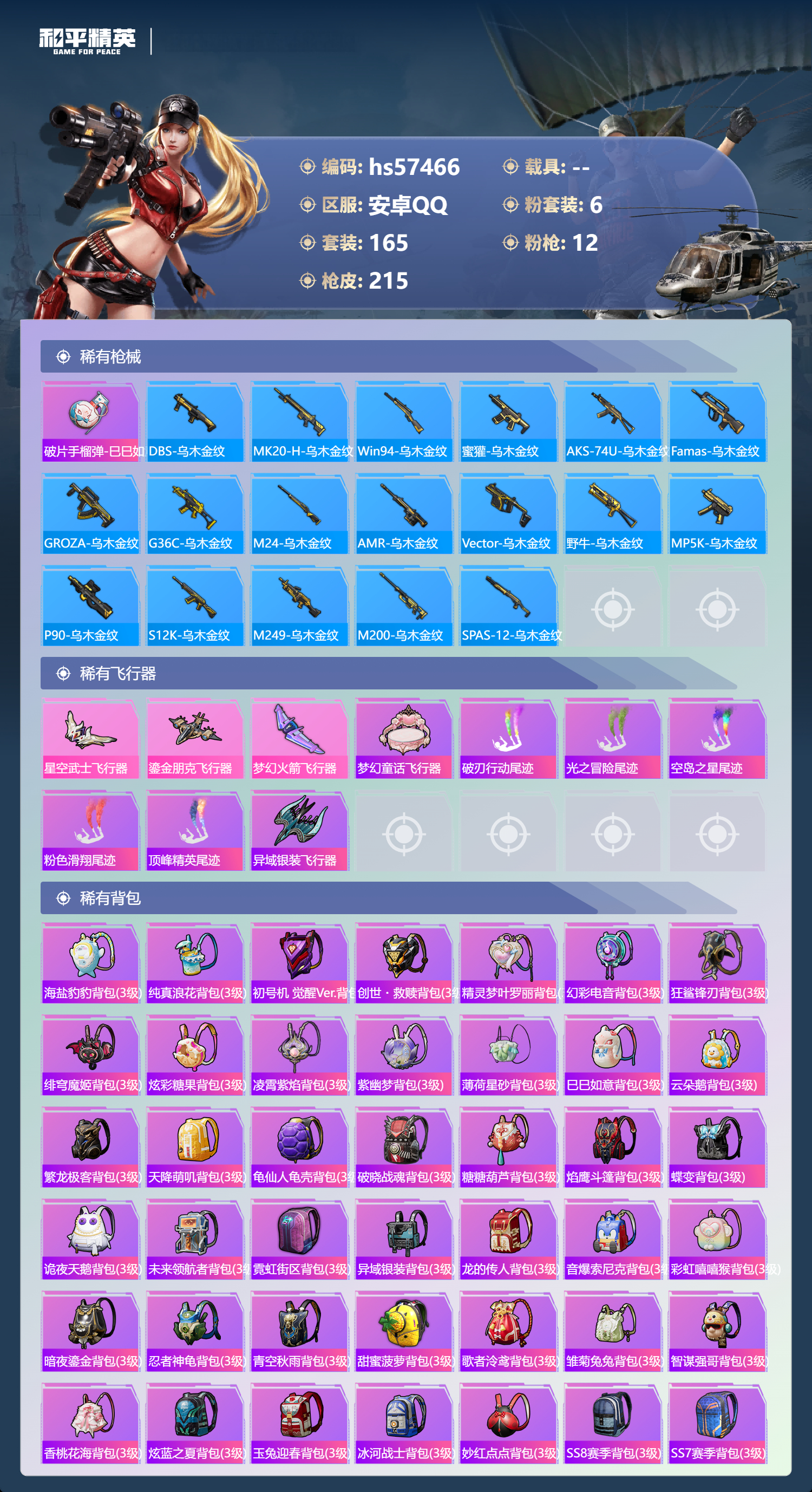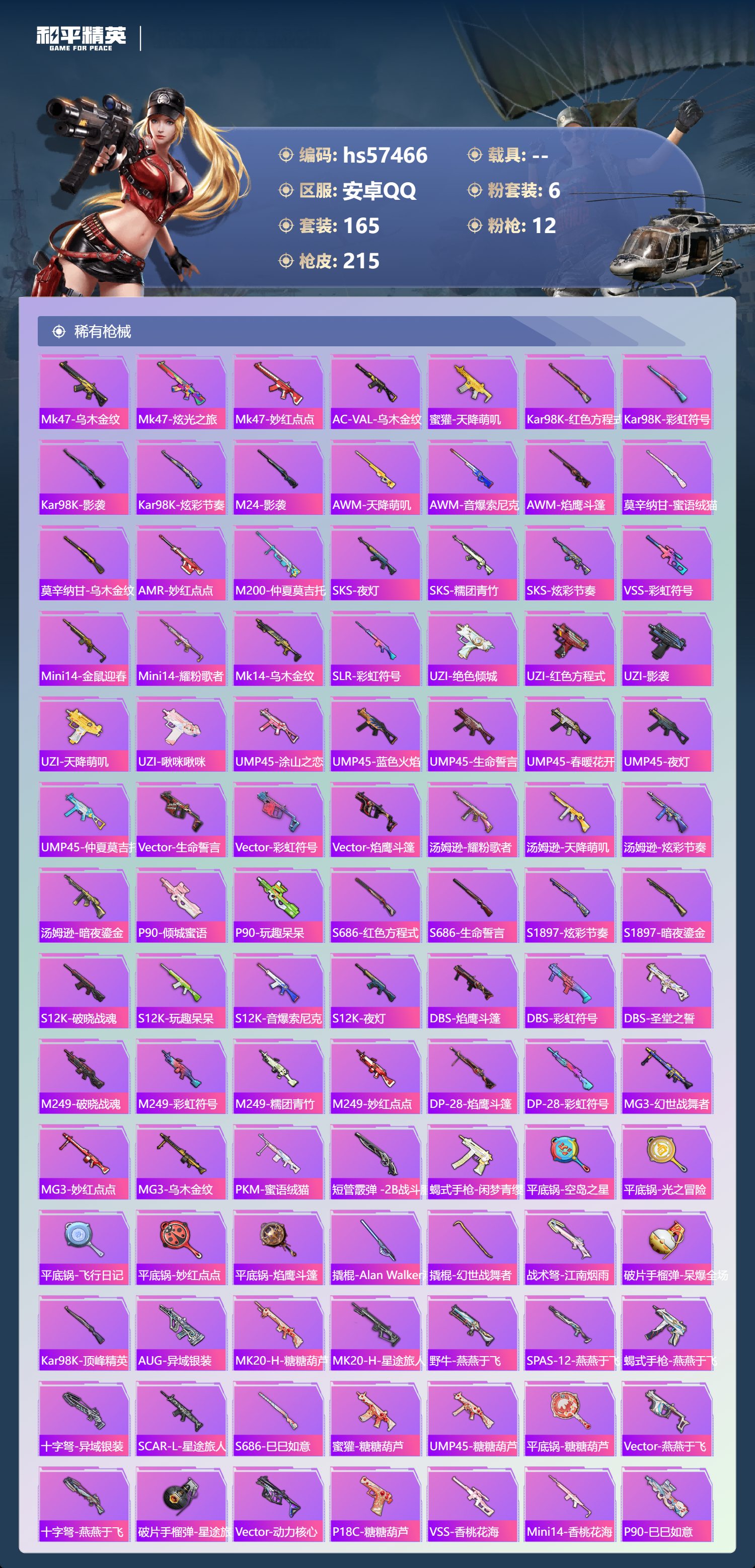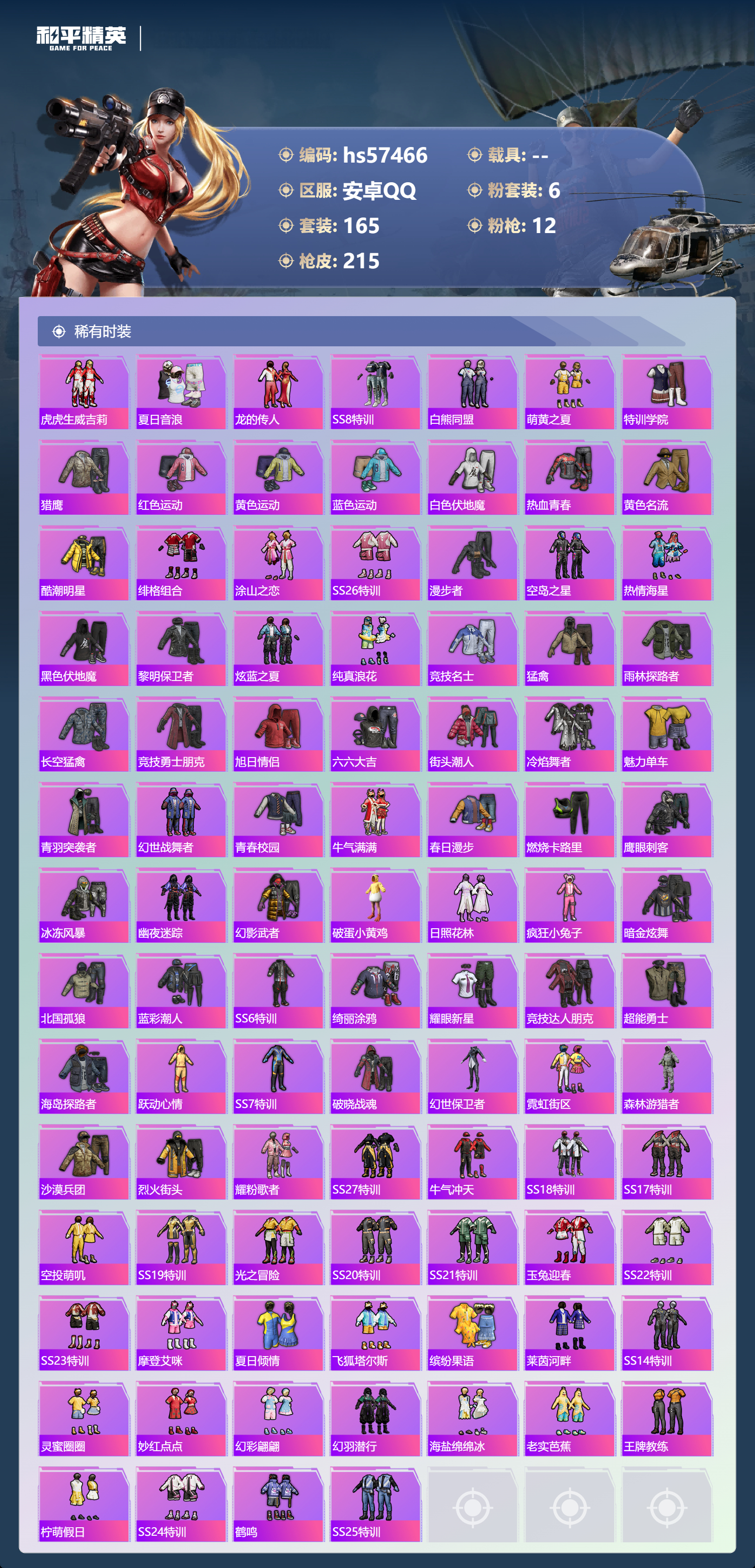 0载具-165套装-215呛皮-hs57466 安卓手q-13王牌印记-1红装-6粉装-12特效呛-77615热力值-165套装-215呛皮-2卓越印记【1红装】宇宙意志-塞卢姆/3级【6粉装】角色-千金淑猫角色-初号机 觉醒ver.套装-鎏金朋克角色-羊梦糖心套装-第五大道角色-烟云彩露【12特效呛】汤姆逊-热量炸弹/5级scar-l-纯梦嫁纱/7级平底锅-仲夏莫吉托/3级kar98k-巳巳如意/5级u