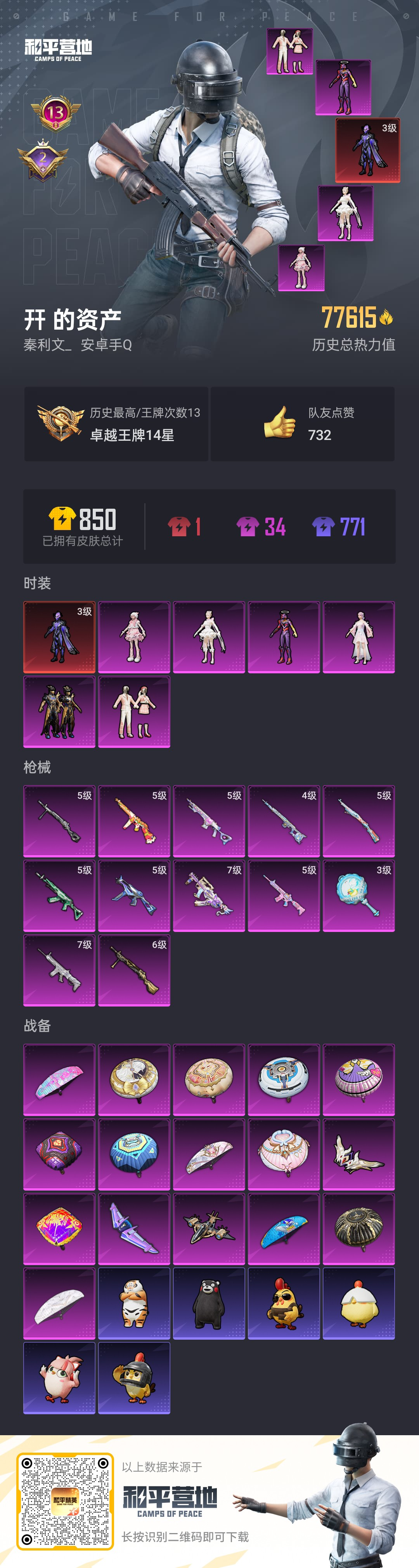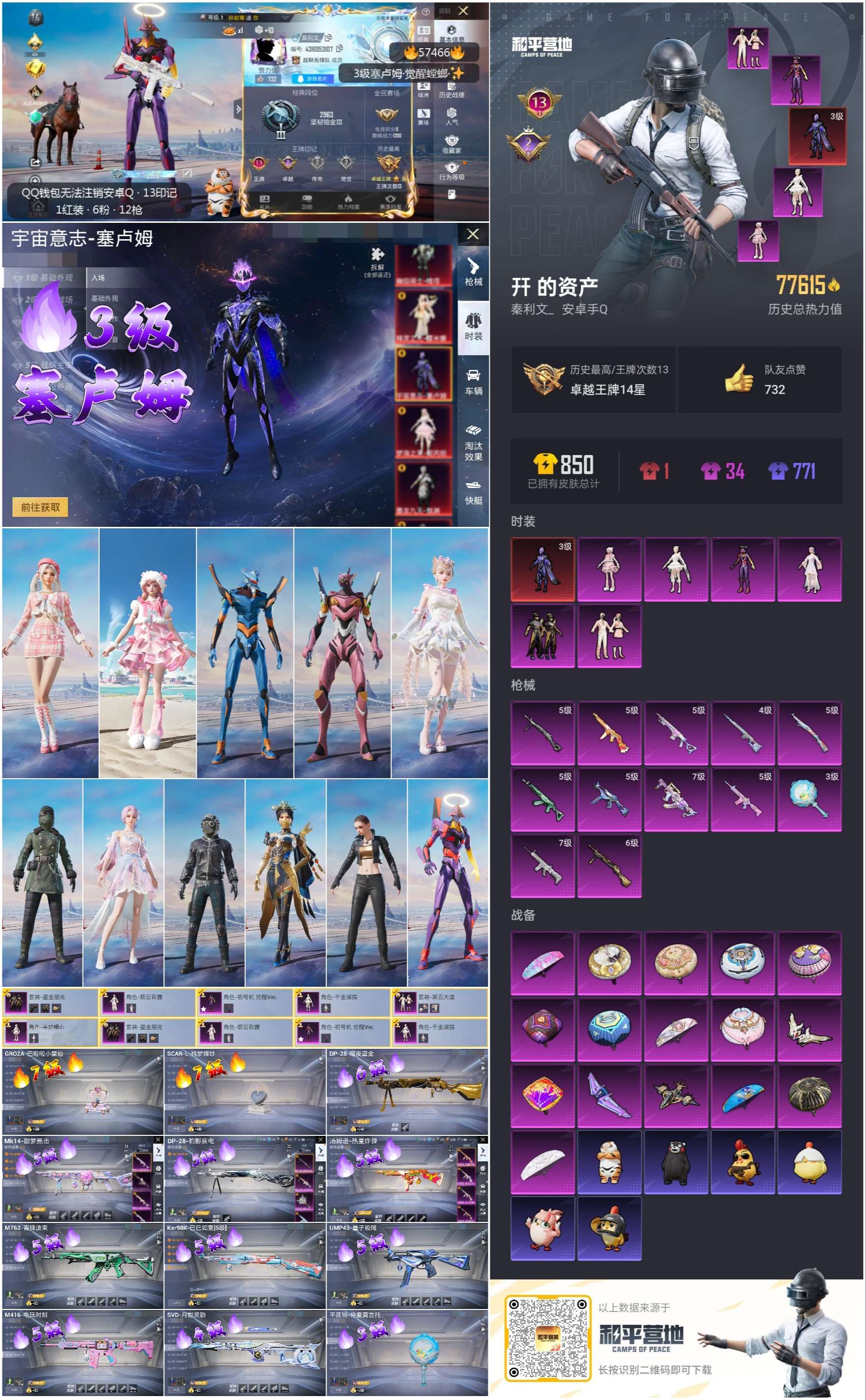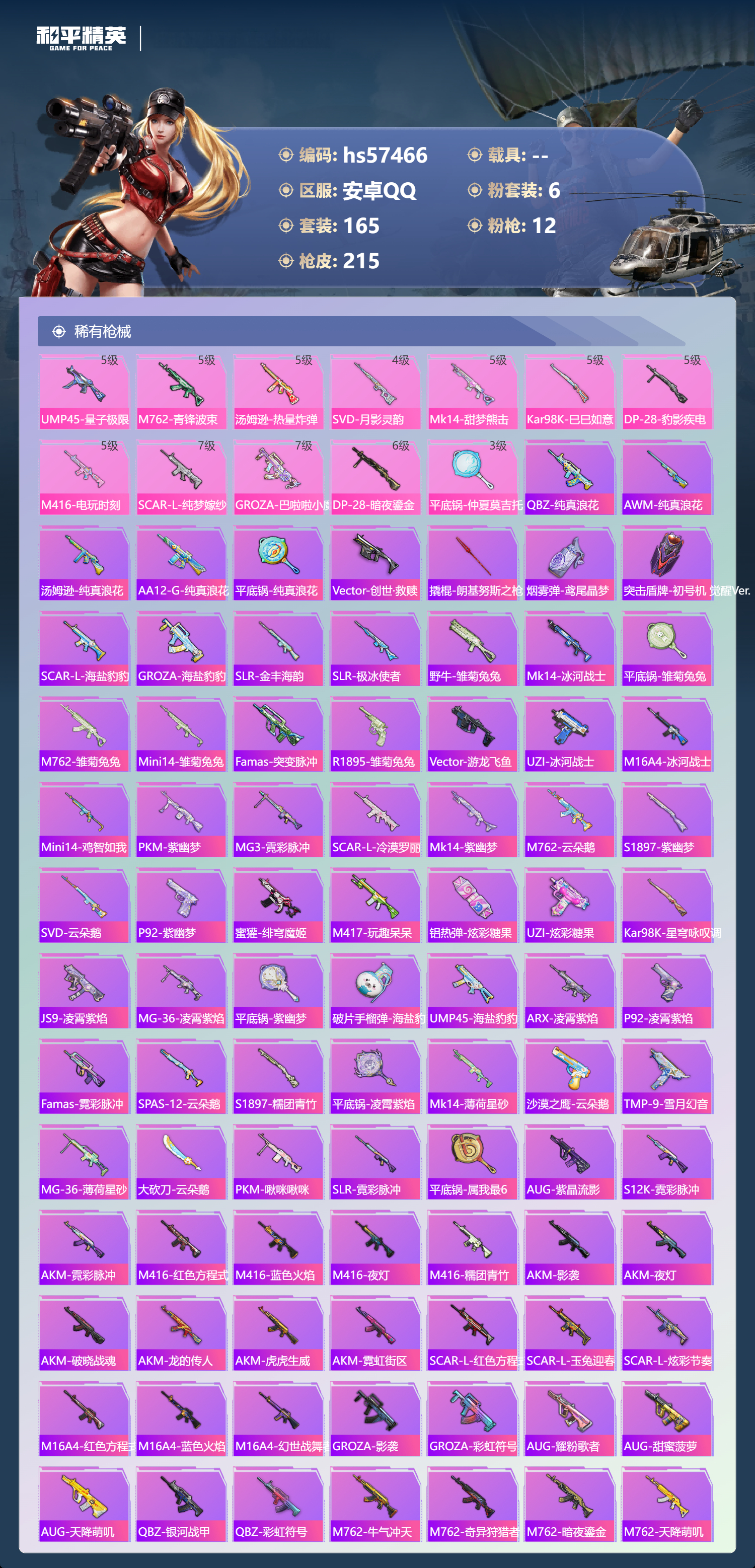 0载具-165套装-215呛皮-hs57466 安卓手q-13王牌印记-1红装-6粉装-12特效呛-77615热力值-165套装-215呛皮-2卓越印记【1红装】宇宙意志-塞卢姆/3级【6粉装】角色-千金淑猫角色-初号机 觉醒ver.套装-鎏金朋克角色-羊梦糖心套装-第五大道角色-烟云彩露【12特效呛】汤姆逊-热量炸弹/5级scar-l-纯梦嫁纱/7级平底锅-仲夏莫吉托/3级kar98k-巳巳如意/5级u