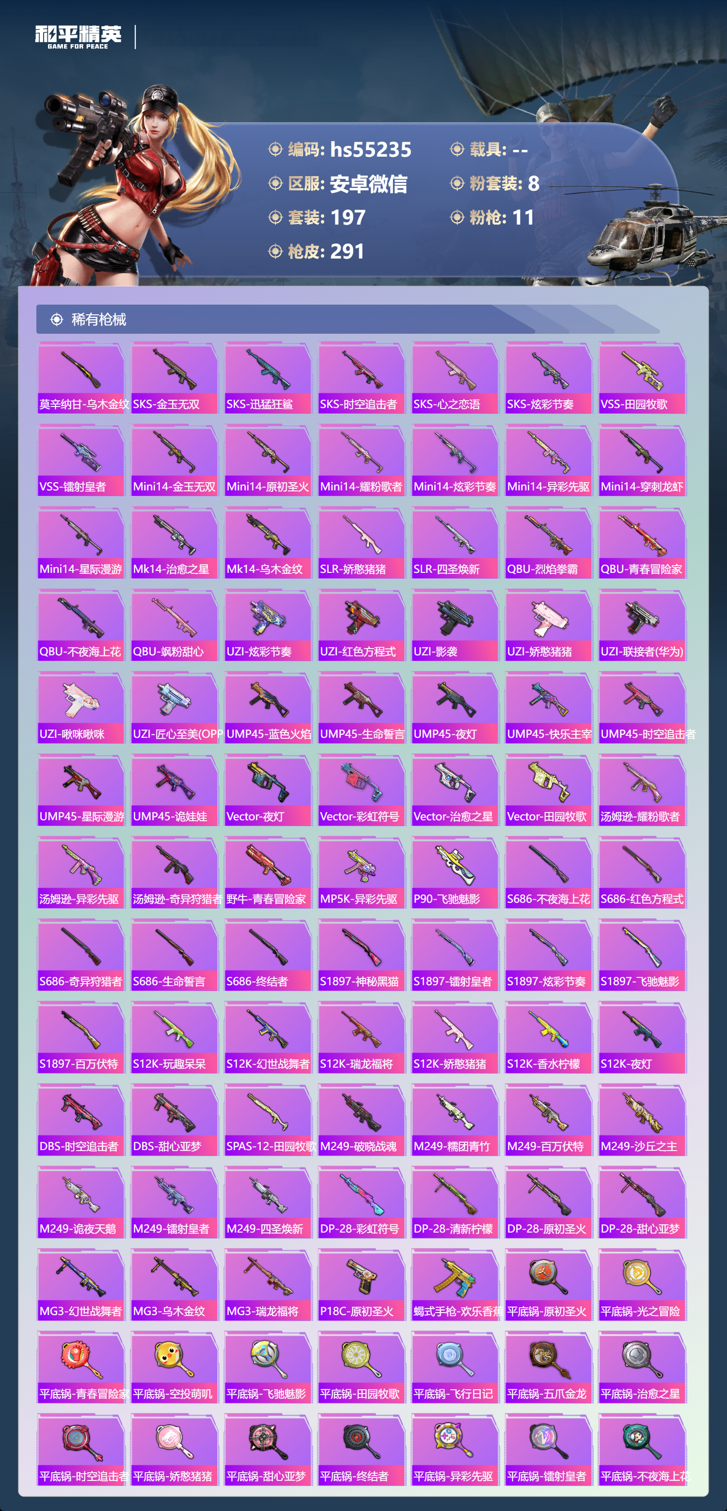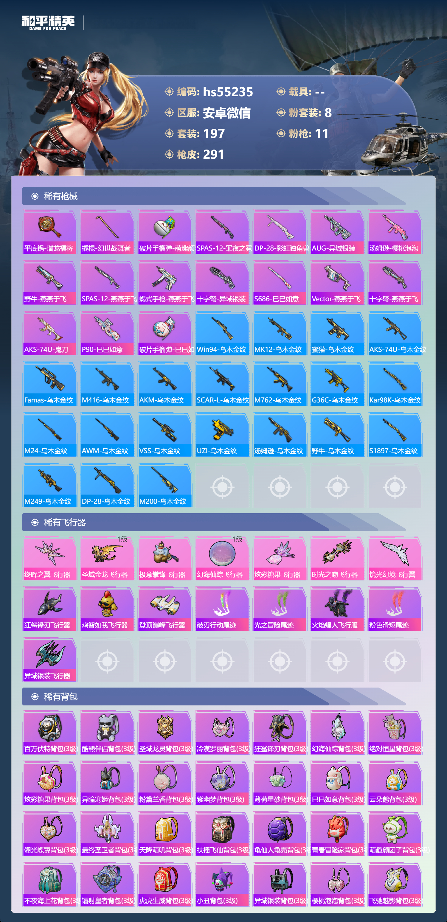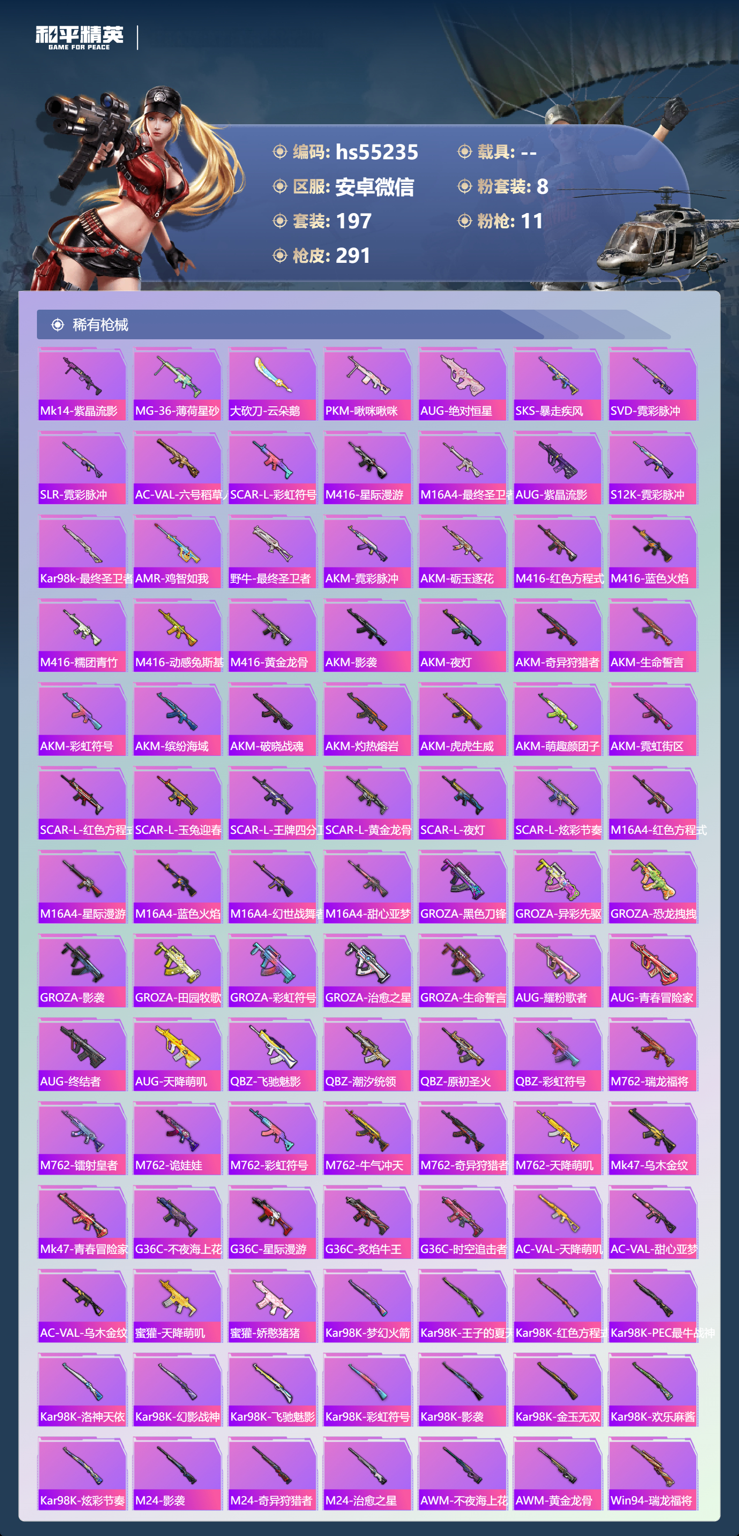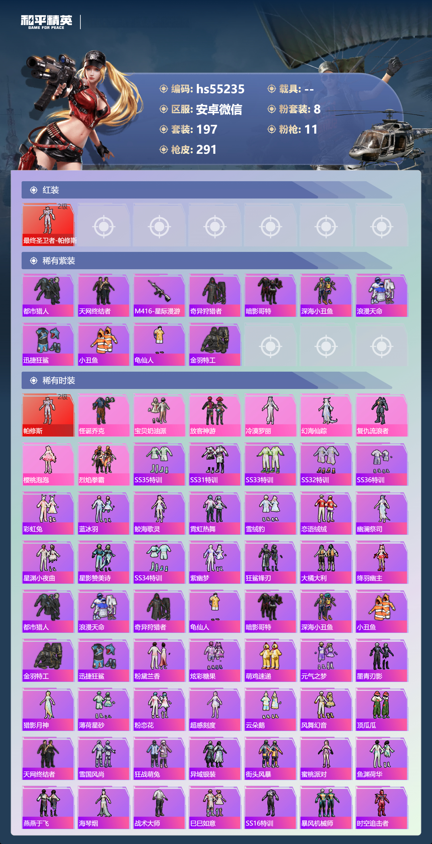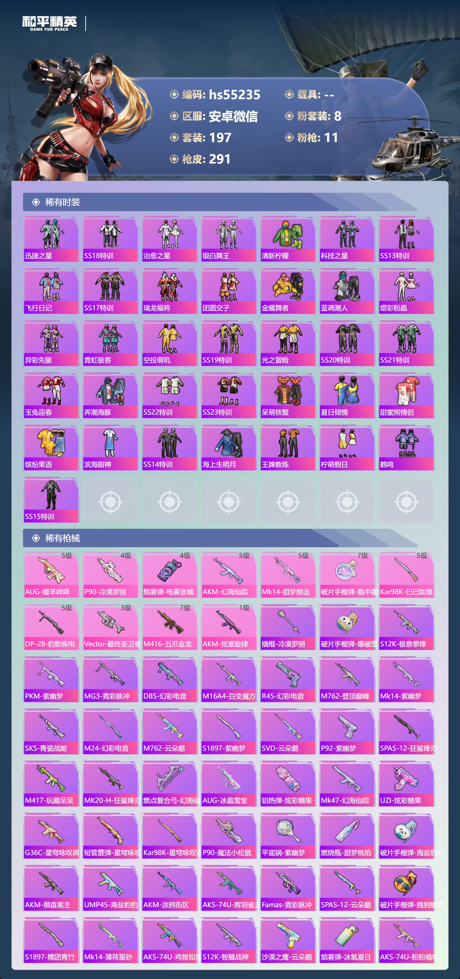 0载具-197套装-291呛皮-hs55235 安卓微信-16王牌印记-有战神框-1红装-8粉装-11特效呛-90747热力值-197套装-291呛皮-3卓越印记-2传奇印记【1红装】最终圣卫者-帕修斯/2级【8粉装】角色-樱桃泡泡角色-复仇流浪者角色-冷漠罗丽套装-宝贝奶油派角色-幻海仙踪套装-放客神游套装-烈焰拳霸套装-怪诞乔克【11特效呛】盐雾蛋-电雾迷城/4级akm-炫紫旋律/1级aug-暖羊咩咩