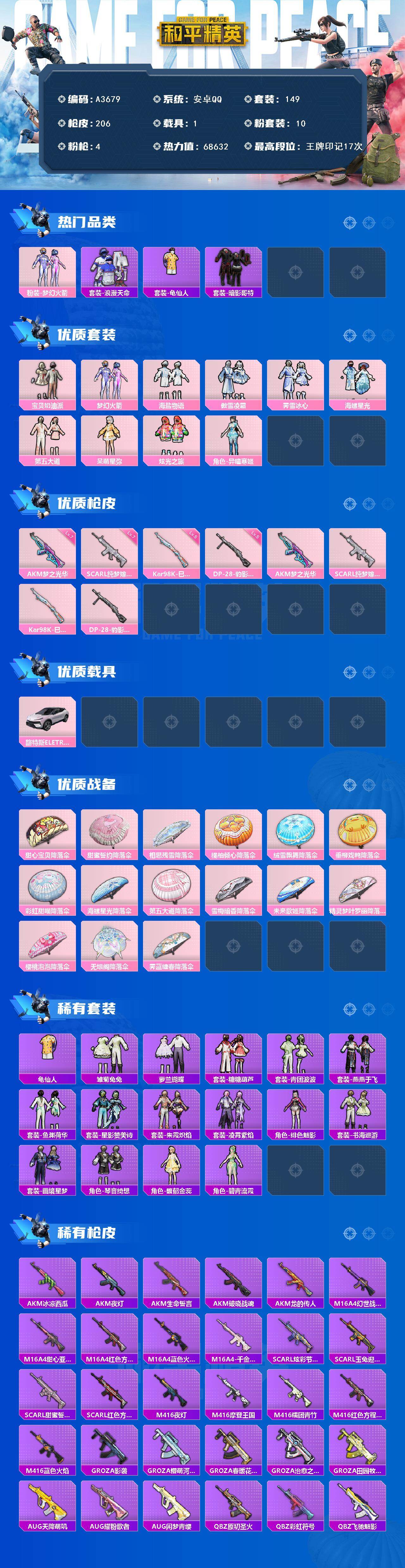 [15627734]安卓【男神号 粉装-梦幻火箭/粉装-傲雪凌霜/路特斯eletre(花绽灰)/akm-梦之光华/car-l-纯梦嫁纱】 手q-10粉装-4特效呛-1载具-0粉色飞行器-68632热力值-17王牌印记-149套装-206呛皮 【热门品类】:粉装-梦幻火箭,套装-浪漫天命,套装-龟仙人,套装-暗影哥特 【粉色套装】:粉装-宝贝奶油派,粉装-梦幻火箭,粉装-海盐物语,粉装-傲雪凌霜,粉装-霁雪冰心,粉装-海螺星光,粉装-第五大道,角色-呆萌星弥,粉装-炫光之旅,角色-异瞳寒姬 【粉色呛皮等级】:akm-梦之光华七级,scar-l-纯梦嫁纱七级,kar98k-巳巳如意五级,dp-28-豹影疾电五级 【粉色载具】:路特斯eletre(花绽灰) 【粉色呛皮】:akm-梦之光华,scar-l-纯梦嫁纱,kar98k-巳巳如意,dp-28-豹影疾电 【粉色降落伞】:甜心宝贝降落伞,甜蜜誓约降落伞,相思残雪降落伞,橘柚倾心降落伞,绒雪飘舞降落伞,垂柳戏鸭降落伞,彩虹甜喵降落伞,海螺星光降落伞,第五大道降落伞,雪梅暗香降落伞,未来歌姬降落伞,精灵梦叶罗丽降落伞,樱桃泡泡降落伞,无垠阁降落伞,霁蓝缠春降落伞 【稀有套装】:套装-龟仙人,套装-雏菊兔兔,套装-萝兰蝴蝶,套装-糖糖葫芦,套装-青团波波,套装-燕燕于飞,套装-鱼渊荷华,套装-星影赞美诗,套装-朱霞炽焰,套装-凌霄紫焰,角色-绯色魅影,套装-书海巡游,套装-画境星梦,套装-琴音绮想,角色-馥郁金蕊,角色-碧青流霞 【稀有呛皮】:akm-冰凉西瓜,akm-夜灯,akm-生命誓言,akm-破晓战魂,akm-龙的传人,m16a4-幻世战舞者,m16a4-甜心亚梦,m16a4-红色方程式,m16a4-蓝色火焰,m16a4-千金淑猫,scar-l-炫彩节奏,scar-l-玉兔迎春,scar-l-甜蜜誓约,scar-l-红色方程式,m416-夜灯,m416-摩登王国,m416-糯团青竹,m416-红色方程式,m416-蓝色火焰,groza-影袭,groza-懵萌河马,groza-春暖花开,groza-治愈之星,groza-田园牧歌,aug-天降萌叽,aug-耀粉歌者,aug-闲梦青缨,q-原初圣火,q-彩虹符号,q-飞驰魅影,m762-天降萌叽,m762-奇异狩猎者,m762-牛气冲天,m762-甜心宝贝,m76