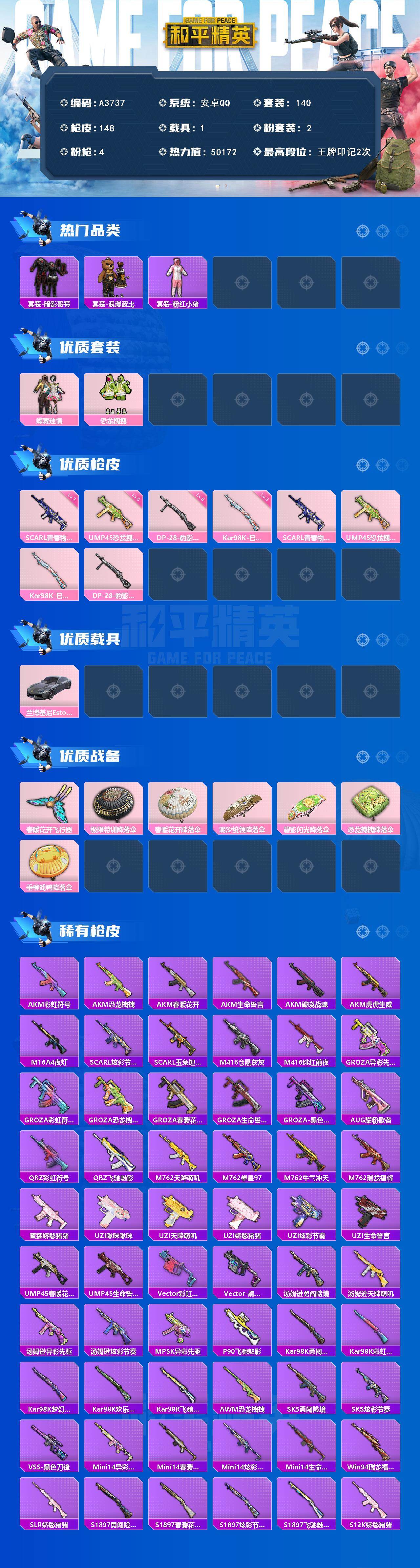 [15628025]安卓【小号/暗影哥特】 手q-2粉装-4特效呛-1载具-2粉色飞行器-50172热力值-2王牌印记-140套装-148呛皮 【热门品类】:套装-暗影哥特,套装-浪漫波比,套装-粉红小猪 【粉色套装】:粉装-蝶舞迷情,粉装-恐龙拽拽 【粉色呛皮等级】:scar-l-青春物语七级,ump45-恐龙拽拽五级,kar98k-巳巳如意三级,dp-28-豹影疾电五级 【粉色载具】:兰博基尼estoque(银翼灰) 【粉色呛皮】:scar-l-青春物语,ump45-恐龙拽拽,kar98k-巳巳如意,dp-28-豹影疾电 【粉色飞行器】:春暖花开飞行器 【粉色降落伞】:极限特训降落伞,春暖花开降落伞,潮汐统领降落伞,碧影闪光降落伞,恐龙拽拽降落伞,垂柳戏鸭降落伞,炫彩糖果降落伞 【稀有套装】:套装-炫彩糖果 【稀有呛皮】:aug-冰晶雪宝,akm-彩虹符号,akm-恐龙拽拽,akm-春暖花开,akm-生命誓言,akm-破晓战魂,akm-虎虎生威,m16a4-夜灯,scar-l-炫彩节奏,scar-l-玉兔迎春,m416-仓鼠灰灰,m416-绯红前夜,groza-异彩先驱,groza-彩虹符号,groza-恐龙拽拽,groza-春暖花开,groza-生命誓言,groza-黑色刀锋,aug-耀粉歌者,q-彩虹符号,q-飞驰魅影,m762-天降萌叽,m762-拳皇97,m762-牛气冲天,m762-瑞龙福将,蜜獾-娇憨猪猪,uzi-啾咪啾咪,uzi-天降萌叽,uzi-娇憨猪猪,uzi-炫彩节奏,uzi-生命誓言,ump45-春暖花开,ump45-生命誓言,vect-彩虹符号,vect-黑色刀锋,汤姆逊-勇闯险境,汤姆逊-天降萌叽,汤姆逊-异彩先驱,汤姆逊-炫彩节奏,mp5k-异彩先驱,p90-飞驰魅影,kar98k-勇闯险境,kar98k-彩虹符号,kar98k-梦幻火箭,kar98k-欢乐麻酱,kar98k-飞驰魅影,awm-恐龙拽拽,sks-勇闯险境,sks-炫彩节奏,vss-黑色刀锋,mini14-异彩先驱,mini14-春暖花开,mini14-炫彩节奏,mini14-生命誓言,win94-瑞龙福将,slr-娇憨猪猪,s1897-勇闯险境,s1897-春暖花开,s1897-炫彩节奏,s1897-飞驰魅影,s12k-瑞龙福将,s12k-香水柠檬,s1