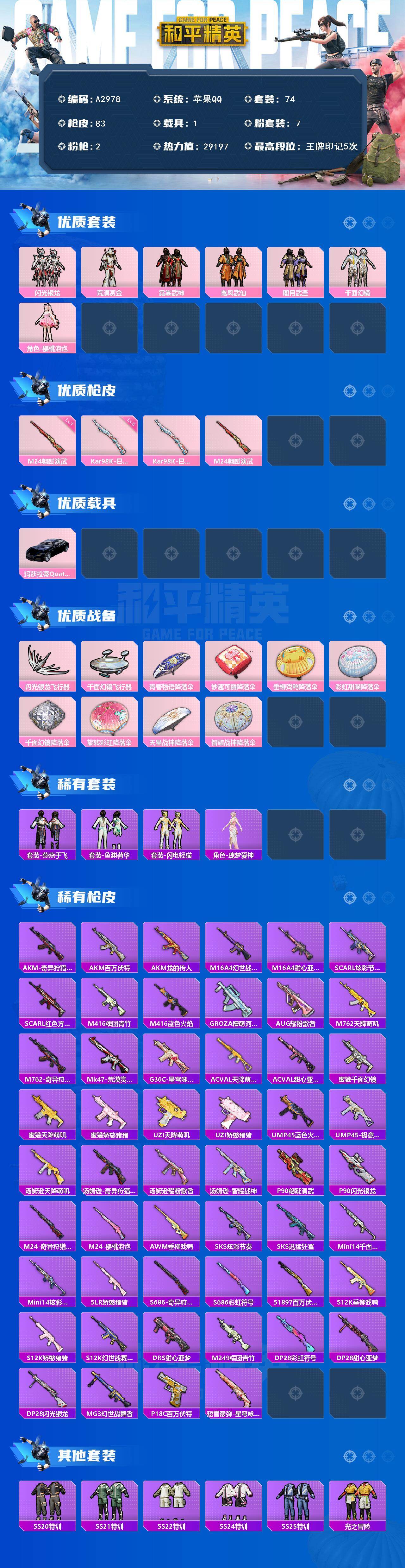 [15628351]苹果【男神号 粉装-闪光银龙/粉装-荒漠赏金/玛莎拉蒂quattropte(夜幕蓝)/kar98k-巳巳如意/m24-翩跹演武】 手q-7粉装-2特效呛-1载具-3粉色飞行器-29197热力值-5王牌印记-74套装-83呛皮 【热门品类】:套装-奇异狩猎者 【粉色套装】:粉装-闪光银龙,粉装-荒漠赏金,粉装-霓裳武神,粉装-鸾凤武仙,粉装-朗月武圣,粉装-千面幻镜,角色-樱桃泡泡 【粉色呛皮等级】:kar98k-巳巳如意五级,m24-翩跹演武七级 【粉色载具】:玛莎拉蒂quattropte(夜幕蓝) 【粉色呛皮】:kar98k-巳巳如意,m24-翩跹演武 【粉色飞行器】:闪光银龙飞行器,千面幻镜飞行器 【粉色降落伞】:青春物语降落伞,妙趣可丽降落伞,垂柳戏鸭降落伞,彩虹甜喵降落伞,千面幻镜降落伞,旋转彩虹降落伞,天星战神降落伞,智耀战神降落伞,炫彩糖果降落伞 【稀有套装】:套装-雪国风尚,套装-燕燕于飞,套装-鱼渊荷华,套装-闪电轻猫,角色-瑰梦爱神,套装-炫彩糖果 【稀有呛皮】:aug-冰晶雪宝,akm-奇异狩猎者,akm-百万伏特,akm-龙的传人,m16a4-幻世战舞者,m16a4-甜心亚梦,scar-l-炫彩节奏,scar-l-红色方程式,m416-糯团青竹,m416-蓝色火焰,groza-懵萌河马,aug-耀粉歌者,m762-天降萌叽,m762-奇异狩猎者,mk47-荒漠赏金,g36c-星穹咏叹调,ac-val-天降萌叽,ac-val-甜心亚梦,蜜獾-千面幻镜,蜜獾-天降萌叽,蜜獾-娇憨猪猪,uzi-天降萌叽,uzi-娇憨猪猪,ump45-蓝色火焰,ump45-极意拳锋,汤姆逊-天降萌叽,汤姆逊-奇异狩猎者,汤姆逊-耀粉歌者,汤姆逊-智耀战神,p90-翩跹演武,p90-闪光银龙,m24-奇异狩猎者,m24-樱桃泡泡,awm-垂柳戏鸭,sks-炫彩节奏,sks-迅猛狂鲨,mini14-千面幻镜,mini14-炫彩节奏,slr-娇憨猪猪,s686-奇异狩猎者,s686-彩虹符号,s1897-百万伏特,s12k-垂柳戏鸭,s12k-娇憨猪猪,s12k-幻世战舞者,dbs-甜心亚梦,m249-糯团青竹,dp-28-彩虹符号,dp-28-甜心亚梦,dp-28-闪光银龙,mg3-幻世战舞者,p18c-百万伏特,短管霰弹-星穹咏叹调 【其他套装】:套装