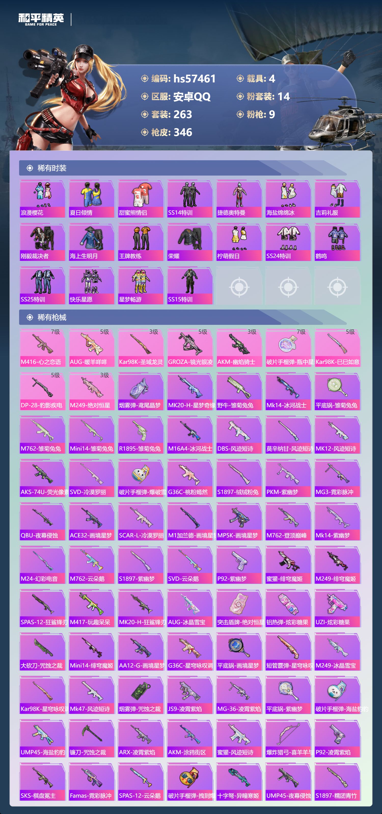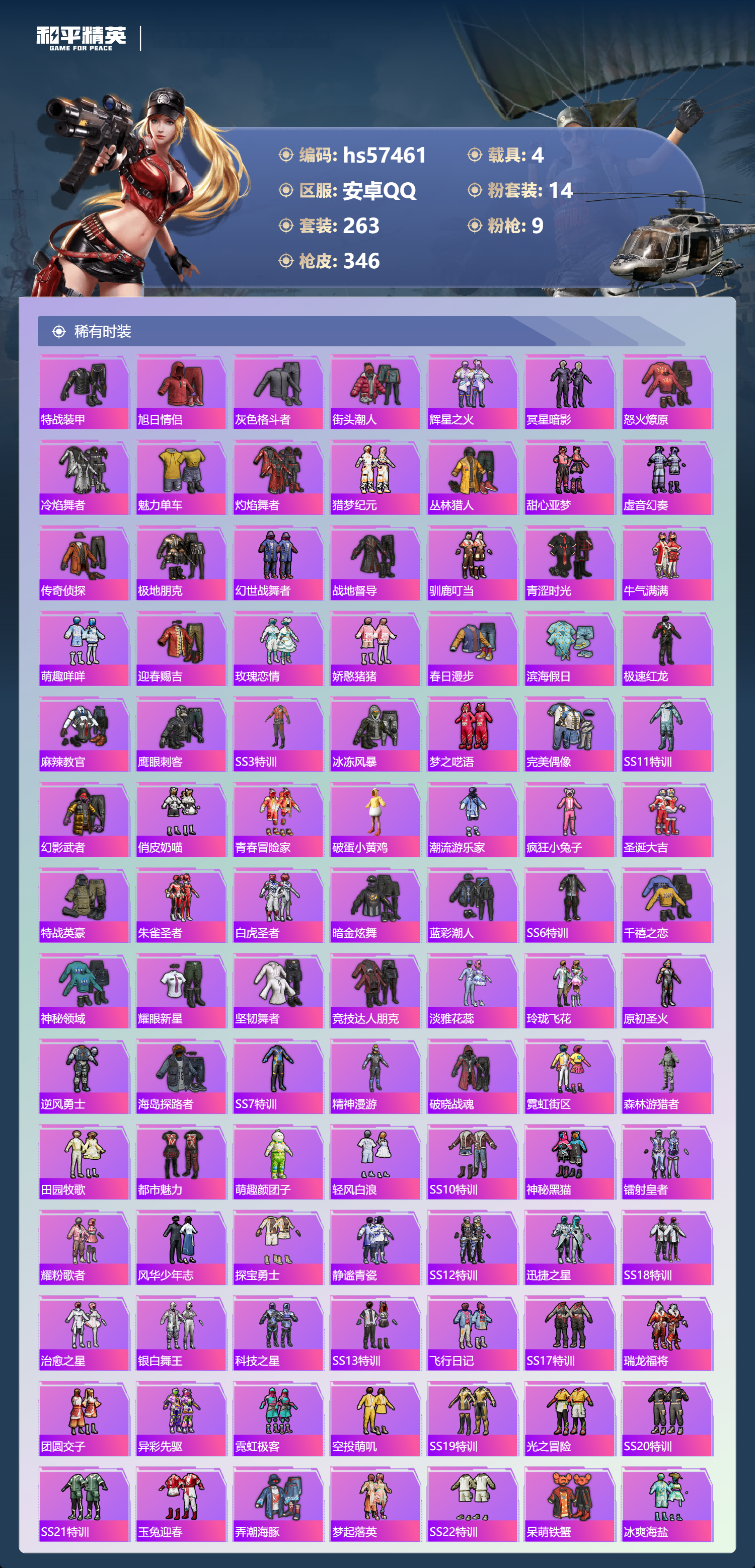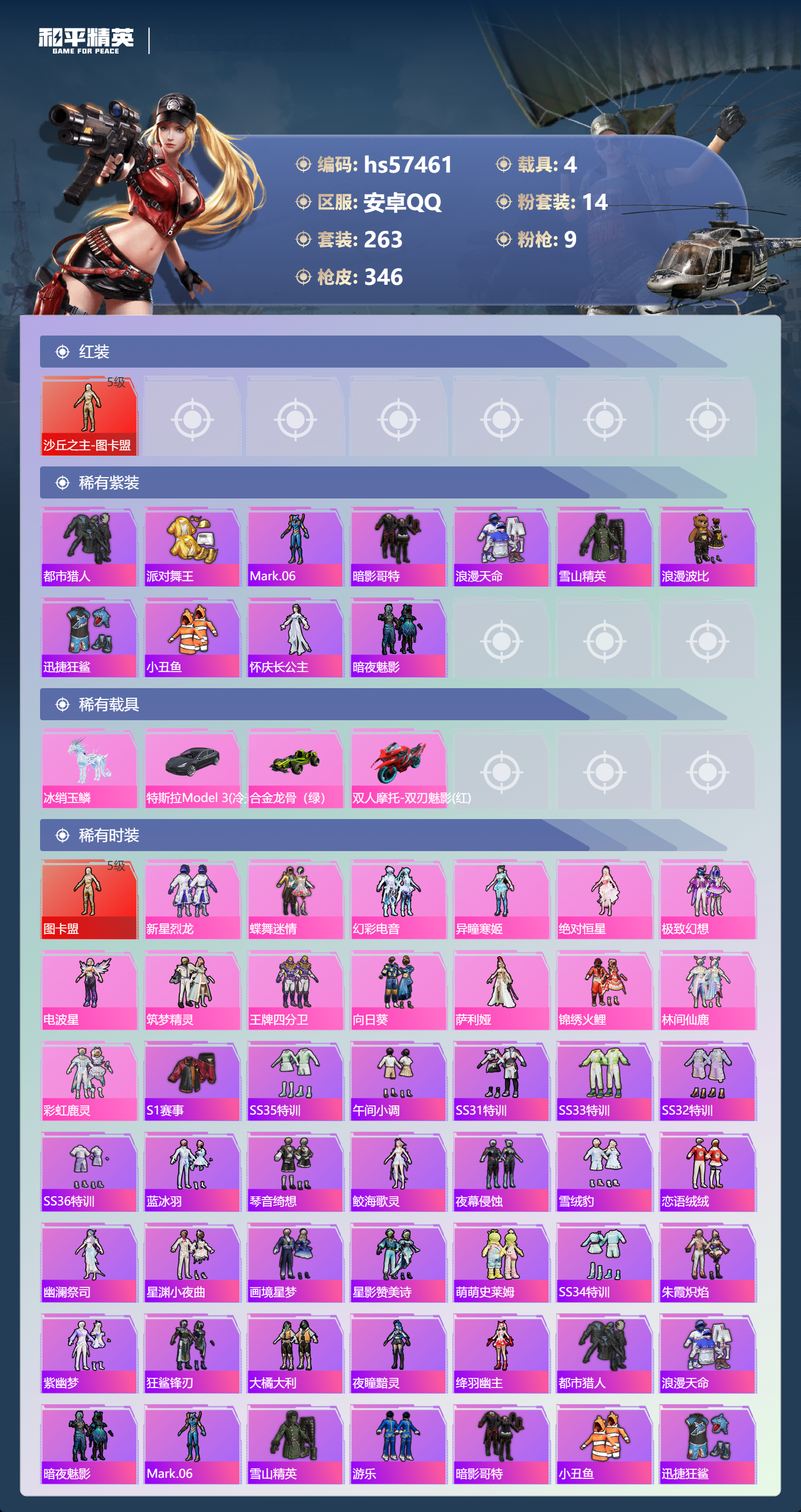 hs57461 安卓手q-16王牌印记-1红装-14粉装-9特效呛-4载具-热力值-263套装-346呛皮-3卓越印记【1红装】沙丘之主-图卡盟/5级【14粉装】套装-彩虹鹿灵套装-王牌四分卫套装-筑梦精灵套装-极致幻想套装-向日葵套装-蝶舞迷情角色-萨利娅套装-锦绣火鲤角色-异瞳寒姬角色-绝对恒星套装-林间仙鹿套装-新星烈龙套装-幻彩电音角色-电波星【