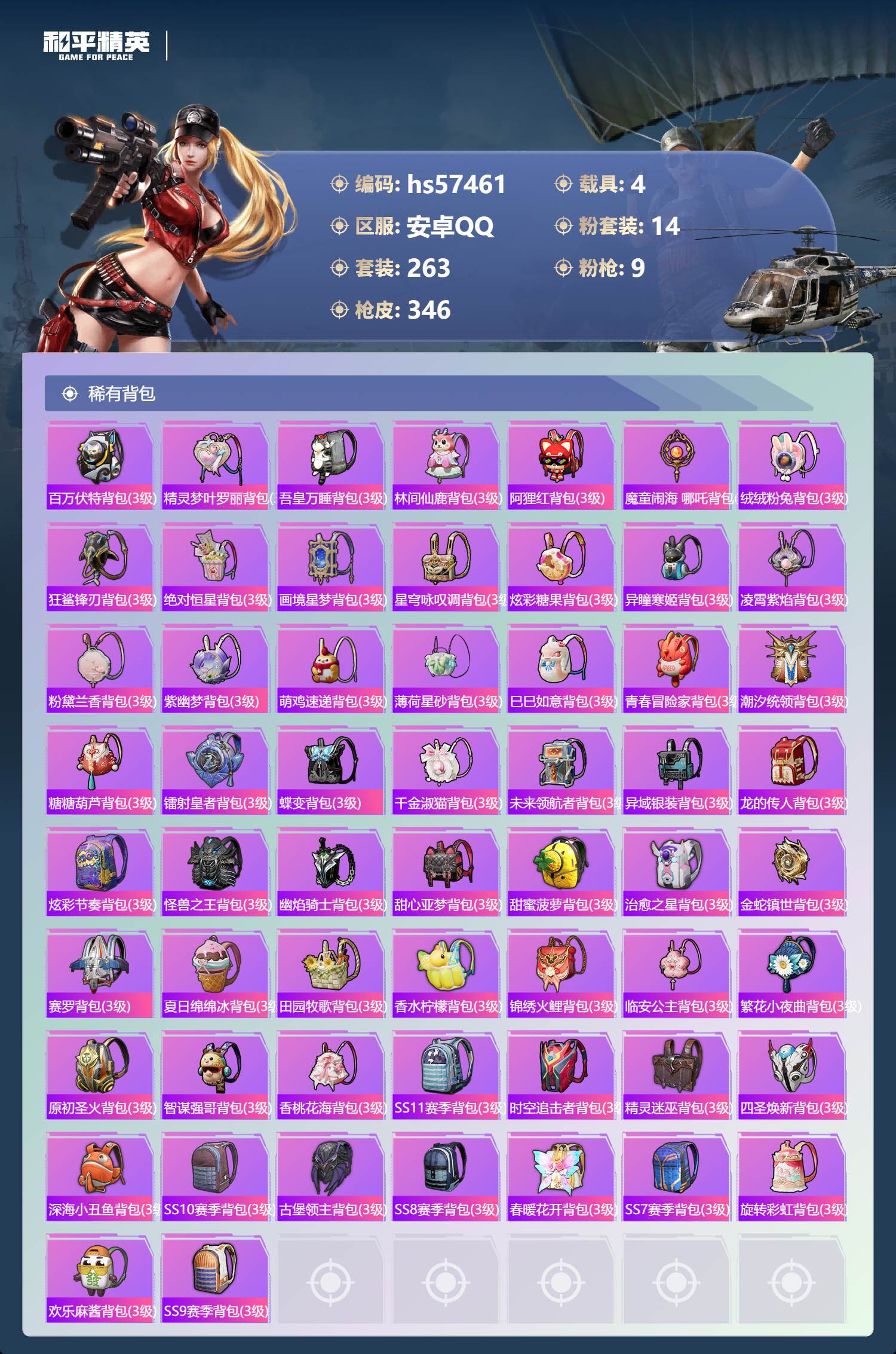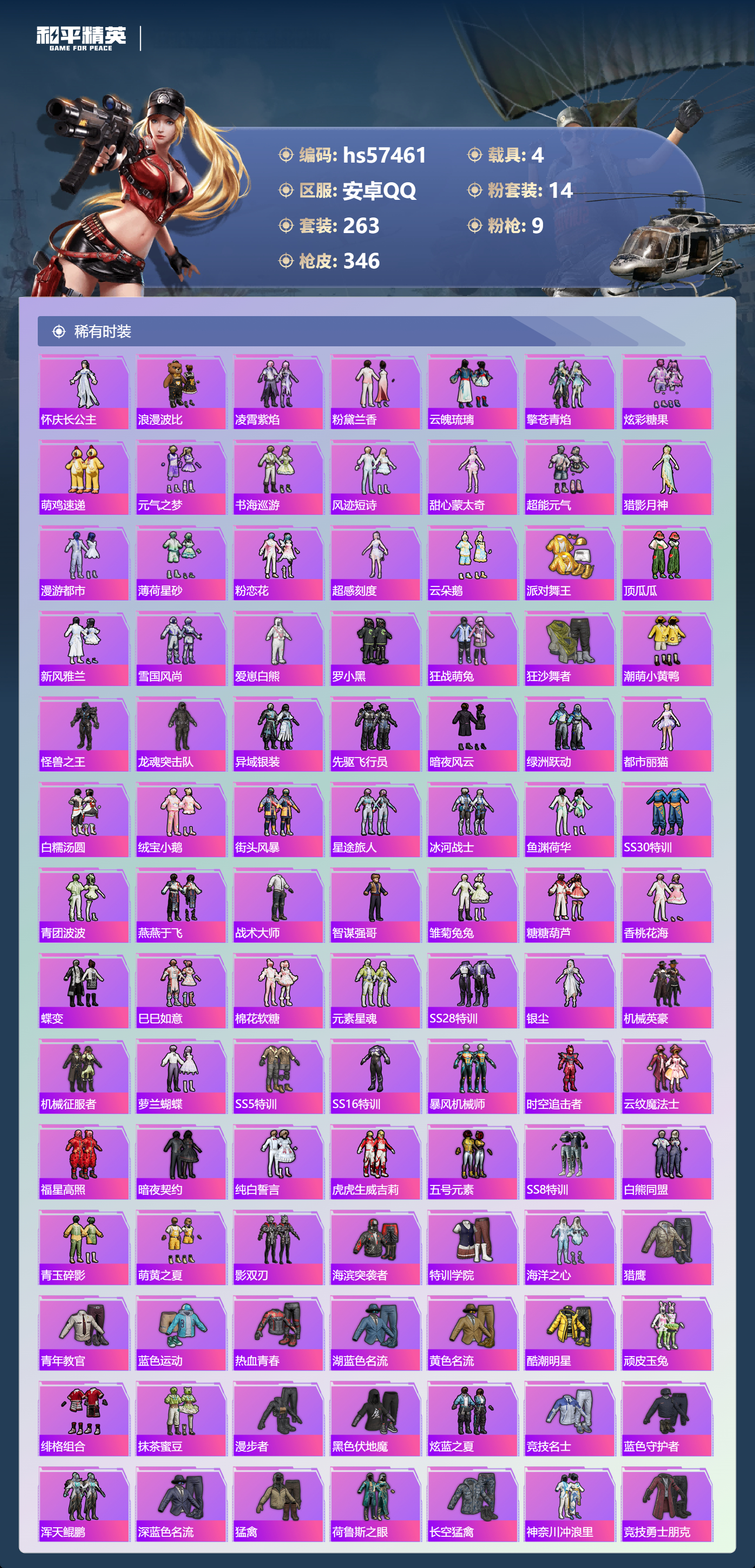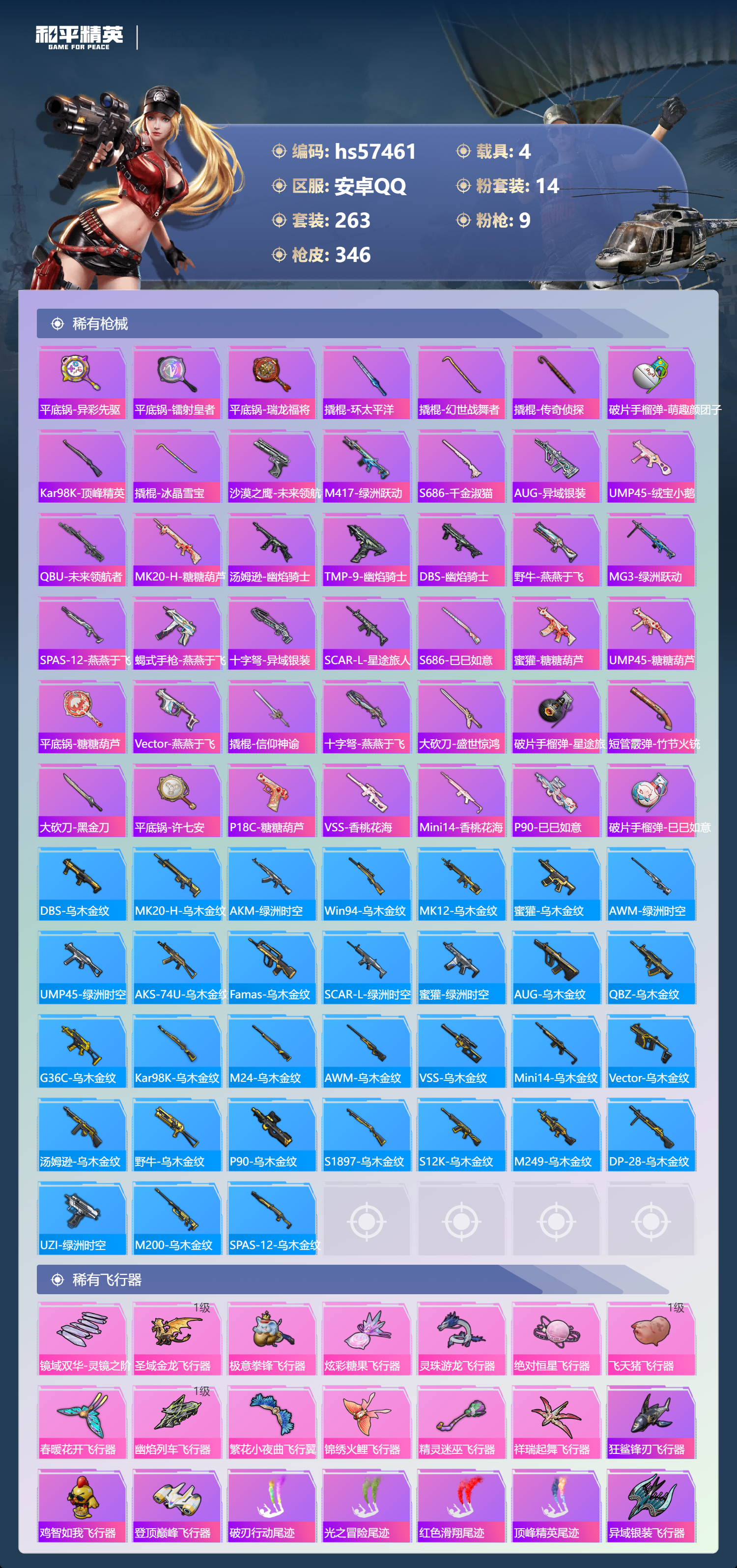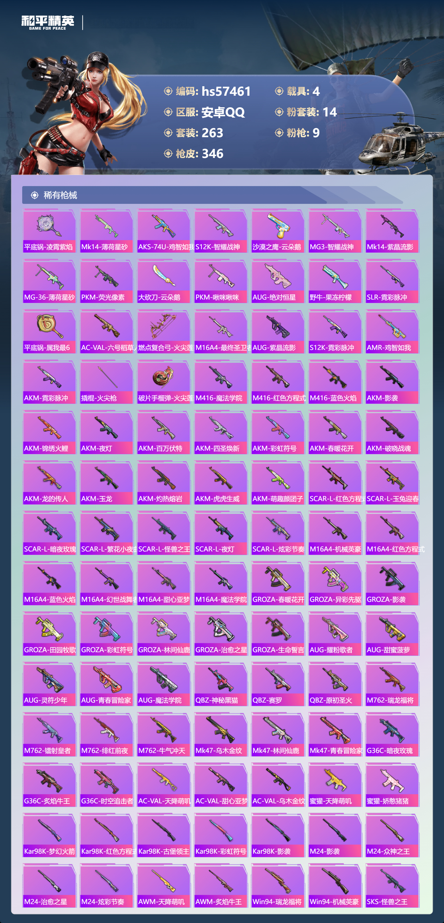hs57461 安卓手q-16王牌印记-1红装-14粉装-9特效呛-4载具-热力值-263套装-346呛皮-3卓越印记【1红装】沙丘之主-图卡盟/5级【14粉装】套装-彩虹鹿灵套装-王牌四分卫套装-筑梦精灵套装-极致幻想套装-向日葵套装-蝶舞迷情角色-萨利娅套装-锦绣火鲤角色-异瞳寒姬角色-绝对恒星套装-林间仙鹿套装-新星烈龙套装-幻彩电音角色-电波星【