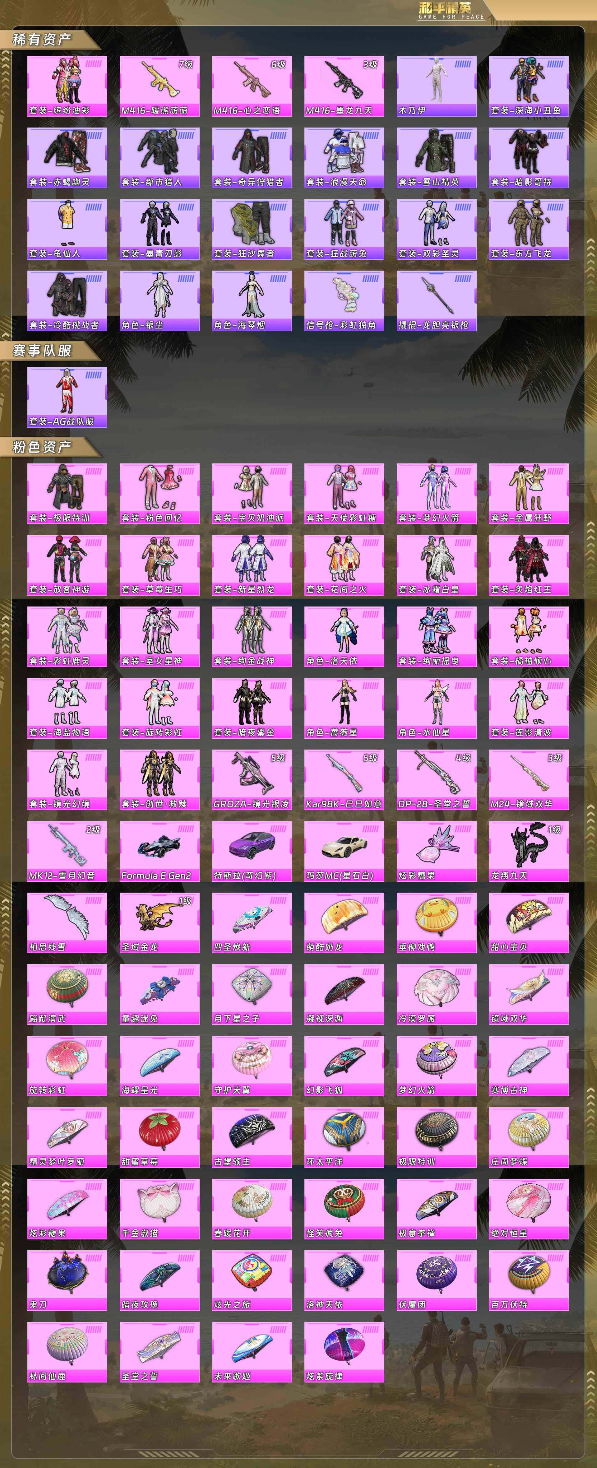 身法号/猪妹/木乃伊/深海小丑鱼/都市/赤蝎幽灵/红眼罩/奇异狩猎者/双彩圣灵/信号呛-彩虹独角/极限特训/粉色回忆/梦幻火箭/花间之火/草莓生巧/绚丽摇曳/莲影清波/橘柚倾心/海盐物语/暗夜堡金/镜光幻境/groza-镜光银凌/98k如意/dp28圣堂之誓/m24镜域双华/fmula e gen2/特斯拉/玛莎mc/ 没战神框(27粉装8粉呛3载具)hp5030-4粉色飞行器-118800热力值-18王牌印记-278套装-330呛皮 【热门品类】:粉装-梦幻火箭,粉装-缤纷油彩,套装-浪漫天命,套装-赤蝎幽灵,套装-都市猎人,套装-冥河战士,套装-深海小丑鱼,套装-小丑鱼,套装-奇异狩猎者,套装-金羽特工,套装-忍者信条,套装-暗夜行者,套装-ag战队服,套装-龟仙人,套装-暗影哥特,撬棍-龙胆亮银呛 【粉色套装】:粉装-极限特训,粉装-粉色回忆,粉装-宝贝奶油派,粉装-天使彩虹糖,粉装-梦幻火箭,粉装-金属狂野,粉装-缤纷油彩,粉装-放客神游,粉装-新星烈龙,粉装-花间之火,粉装-草莓生巧,粉装-绚金战神,粉装-冰霜白皇,粉装-炙焰红王,粉装-彩虹鹿灵,角色-洛天依,粉装-海盐物语,粉装-绚丽摇曳,粉装-橘柚倾心,粉装-旋转彩虹,粉装-暗夜鎏金,角色-蔷薇星,角色-水仙星,粉装-室女星神,粉装-莲影清波,粉装-镜光幻境,套装-创世·救赎 【粉色呛皮等级】:m416-心之恋语六级,m416-暖熊萌萌七级,m416-墨龙九天三级,groza-镜光银凌五级,汤姆逊-星月云朵二级mk12-雪月幻音,kar98k-巳巳如意五级,m24-镜域双华三级,dp-28-圣堂之誓四级 【粉色载具】:特斯拉model x(奇幻紫),玛莎拉蒂mc20(星石白),fmula e gen2(幽光蓝) 【粉色呛皮】:m416-心之恋语,m416-暖熊萌萌,m416-墨龙九天,groza-镜光银凌,kar98k-巳巳如意,m24-镜域双华,mk12-雪月幻音,dp-28-圣堂之誓 【粉色飞行器】:相思残雪飞行器,龙翔九天飞行器,圣域金龙飞行器 【粉色降落伞】:绝对恒星降落伞,极限特训降落伞,百万伏特降落伞,凝视深渊降落伞,甜心宝贝降落伞,春暖花开降落伞,梦幻火箭降落伞,炫紫旋律降落伞,古堡领主降落伞,伏魔团降落伞,四圣焕新降落伞,童趣迷兔降落伞,怪笑疯兔降落伞,暗夜玫瑰降落伞,林间仙鹿降落伞,洛神天依降落伞,庄周梦蝶降落伞,环太平洋降落伞,垂柳戏鸭降落伞,翩跹演武降落伞,甜蜜草莓降落伞,旋转彩虹降落伞,海螺星光降落伞,未来歌姬降落伞,炫光之旅降落伞,萌酷奶龙降落伞,圣堂之誓降落伞,镜域双华降落伞,精灵梦叶罗丽降落伞,守护天翼降落伞,千金淑猫降落伞,鬼刀降落伞,赛博古神降落伞,幻影飞狐降落伞,月下星之子降落伞,冷漠罗丽降落伞,极意拳锋降落伞,炫彩糖果降落伞 【稀有套装】:套装-龟仙人,套装-巳巳如意,套装-糖糖葫芦,套装-青团波波,角色-光矢逐梦,套装-燕燕于飞,套装-鱼渊荷华,角色-风玲,角色-海琴烟,角色-冰晶湖光,套装-粉恋花,套装-紫幽梦,套装-蓝冰羽,套装-霓虹热舞,套装-炫彩糖果 【稀有呛皮】:aug-冰晶雪宝,akm-四圣焕新,akm-彩虹符号,akm-影袭,akm-星之彼岸,akm-春暖花开,akm-环太平洋,akm-百万伏特,akm-破晓战魂,akm-缤纷海域,akm-虎虎生威,akm-霓虹街区,akm-龙的传人,akm-玄冥寒域,m16a4-冥河战士,m16a4-凝视深渊,m16a4-甜心亚梦,m16a4-红色方程式,m16a4-蓝色火焰,m16a4-千金淑猫,scar-l-玉兔迎春,scar-l-甜蜜誓约,scar-l-碧影闪光,scar-l-粉色回忆,scar-l-红色方程式,m416-暗夜行者,m416-糯团青竹,m416-红色方程式,m416-蓝色火焰,m416-黄金狮王,groza-2b战斗服款,groza-异彩先驱,groza-彩虹符号,groza-影袭,groza-懵萌河马,groza-春暖花开,groza-田园牧歌,groza-紫翼圣骑,groza-马卡龙,aug-2p战斗服款,aug-凝视深渊,aug-耀粉歌者,aug-青春冒险家,aug-月影灵韵,q-原初圣火,q-彩虹符号,q-洛神天依,q-相思残雪,q-赛罗,q-飞驰魅影,m762-动感兔斯基,m762-天降萌叽,m762-奇异狩猎者,m762-快乐主宰,m762-瑞龙福将,m762-甜心宝贝,m762-绯红前夜,mk47-妙红点点,mk47-洛神天依,mk47-百万伏特,mk47-青春冒险家,g36c-冷魅冰骑,g36c-懵萌河马,g36c-时空追击者,g36c-暗夜玫瑰,g36c-炙焰牛王,g36c-星穹咏叹调,ac-val-天降萌叽,ac-val-快闪甜心,ac-val-甜心亚梦,蜜獾-千面幻镜,蜜獾-垂柳戏鸭,蜜獾-天降萌叽,蜜獾-娇憨猪猪,famas-墨龙九天,uzi-古堡领主,uzi-啾咪啾咪,uzi-娇憨猪猪,uzi-影袭,uzi-炫彩节奏,uzi-红色方程式,uzi-金玉无双,uzi-幻影飞狐,ump45-繁龙极客,ump45-快乐主宰,ump45-时空追击者,ump45-春暖花开,ump45-炫光之旅,ump45-生命誓言,ump45-蓝色火焰,ump45-诡娃娃,ump45-金玉无双,ump45-极意拳锋,vect-焰鹰斗篷,vect-夜灯,vect-彩虹符号,vect-治愈之星,vect-田园牧歌,vect-金玉无双,vect-创世·救赎,汤姆逊-天降萌叽,汤姆逊-异彩先驱,汤姆逊-炫彩节奏,汤姆逊-环太平洋,汤姆逊-耀粉歌者,汤姆逊-银刃赛罗,汤姆逊-樱桃泡泡,野牛-夜灯,野牛-扶摇飞仙,野牛-青春冒险家,mp5k-异彩先驱,aks-74u-翎光蝶翼,aks-74u-鬼刀,p90-快闪甜心,p90-甜蜜旋律,p90-飞驰魅影,p90-巳巳如意,kar98k-古堡领主,kar98k-幻影战神,kar98k-彩虹符号,kar98k-影袭,kar98k-梦幻火箭,kar98k-炫彩节奏,kar98k-王子的夏天,kar98k-红色方程式,kar98k-金玉无双,kar98k-飞驰魅影,m24-影袭,m24-歌者泠鸢,m24-治愈之星,m24-奇异狩猎者,awm-焰鹰斗篷,awm-圣堂之誓,awm-垂柳戏鸭,awm-绿意幻情,awm-飒粉甜心,sks-夜灯,sks-心之恋语,sks-时空追击者,sks-炫彩节奏,sks-糯团青竹,sks-金玉无双,vss-田园牧歌,mini14-原初圣火,mini14-异彩先驱,mini14-春暖花开,mini14-炫彩节奏,mini14-耀粉歌者,mini14-金玉无双,mini14-马卡龙,mk14-扶摇飞仙,mk14-童趣迷兔,win94-瑞龙福将,slr-四圣焕新,slr-娇憨猪猪,slr-彩虹符号,