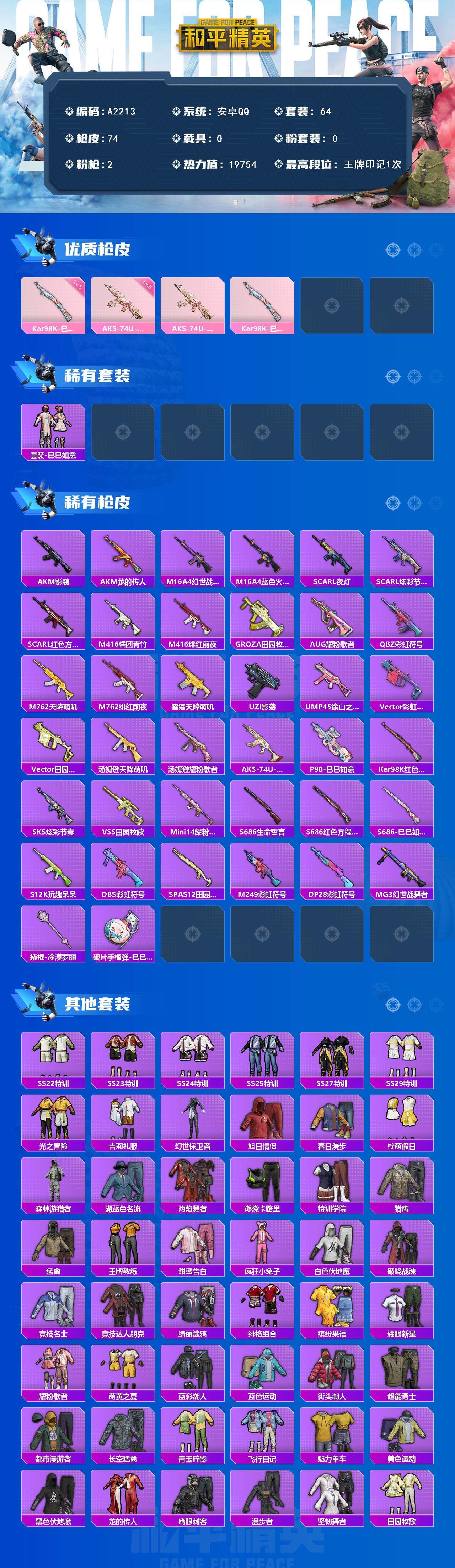 [15628682]安卓【小号 aks-74u-星穹咏叹调/套装-巳巳如意/akm-影袭/akm-龙的传人】 手q-0粉装-2特效呛-0载具-1粉色飞行器-19754热力值-1王牌印记-64套装-74呛皮 【粉色呛皮等级】:aks-74u-星穹咏叹调五级,kar98k-巳巳如意五级 【粉色呛皮】:aks-74u-星穹咏叹调,kar98k-巳巳如意 【粉色降落伞】:炫彩糖果降落伞 【稀有套装】:套装-巳巳如意 【稀有呛皮】:akm-影袭,akm-龙的传人,m16a4-幻世战舞者,m16a4-蓝色火焰,scar-l-夜灯,scar-l-炫彩节奏,scar-l-红色方程式,m416-糯团青竹,m416-绯红前夜,groza-田园牧歌,aug-耀粉歌者,q-彩虹符号,m762-天降萌叽,m762-绯红前夜,蜜獾-天降萌叽,uzi-影袭,ump45-涂山之恋,vect-彩虹符号,vect-田园牧歌,汤姆逊-天降萌叽,汤姆逊-耀粉歌者,aks-74u-鬼刀,p90-巳巳如意,kar98k-红色方程式,sks-炫彩节奏,vss-田园牧歌,mini14-耀粉歌者,s686-生命誓言,s686-红色方程式,s686-巳巳如意,s12k-玩趣呆呆,dbs-彩虹符号,spas-12-田园牧歌,m249-彩虹符号,dp-28-彩虹符号,mg3-幻世战舞者,撬棍-冷漠罗丽,破片手留单-巳巳如意 【其他套装】:套装-ss22特训,套装-ss23特训,套装-ss24特训,套装-ss25特训,套装-ss27特训,套装-ss29特训,套装-光之冒险,套装-吉莉礼服,套装-幻世保卫者,套装-旭日情侣,套装-春日漫步,套装-柠萌假日,套装-森林游猎者,套装-湖蓝色名流,套装-灼焰舞者,套装-燃烧卡路里,套装-特训学院,套装-猎鹰,套装-猛禽,套装-王牌教练,套装-甜蜜告白,套装-疯狂小兔子,套装-白色伏地魔,套装-破晓战魂,套装-竞技名士,套装-竞技达人朋克,套装-绮丽涂鸦,套装-绯格组合,套装-缤纷果语,套装-耀眼新星,套装-耀粉歌者,套装-萌黄之夏,套装-蓝彩潮人,套装-蓝色运动,套装-街头潮人,套装-超能勇士,套装-都市漫游者,套装-长空猛禽,套装-青玉碎影,套装-飞行日记,套装-魅力单车,套装-黄色运动,套装-黑色伏地魔,套装-龙的传人,套装-鹰眼刺客,套装-漫步者,套装-坚韧舞者,套装-田