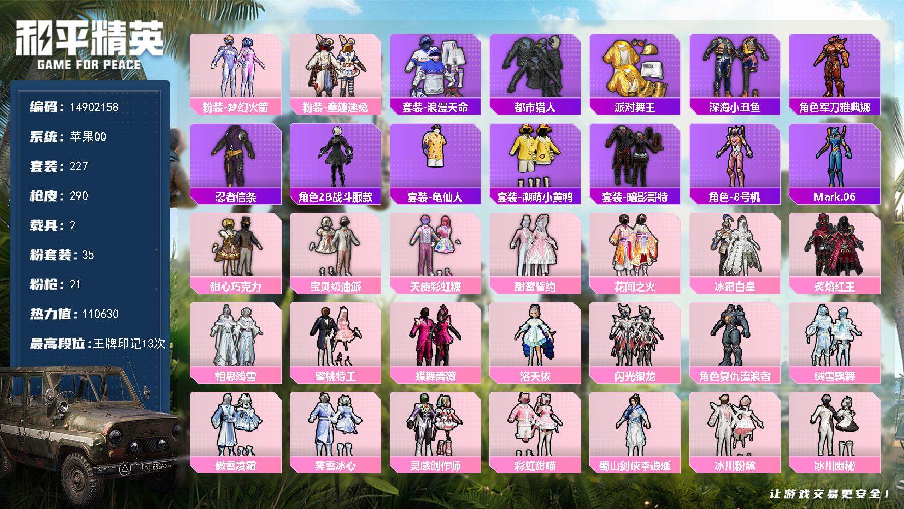 [15528340]" dfx238有二次苹果q-4稀有2载具35粉装21特效呛18热门227套装290呛皮 110630热力值 13印记 历史超级王牌17星 梦幻火箭 宝贝奶油派 天使彩虹糖 甜心巧克力 都市猎人 派对舞王(金靴子) 暗夜契约 暗影哥特 m416-五爪金龙 7级 m416-至情至圣 1级scar-l-时空协奏 3级 【4稀有】 都市猎人 浪漫天命 派对舞王 派对舞王(金靴子) 【2载具】 玛莎拉蒂m白色 双人摩托梦幻火箭 【35粉装】 觉醒初号机 圣堂之誓 梦幻火箭 狂花道·不知火舞 猪猪侠 李 宝贝奶油派 天使彩虹糖 甜心巧克力 千金淑猫 洛天依 金丰海韵 闪光银龙 仲夏莫吉托 青空秋雨 第五大道 甜蜜誓约 花间之火 冰川幽秘 灵感创作师 暗夜鎏金 童趣迷兔 冰霜白皇 绒雪飘舞 炙焰红王 霁雪冰心 傲雪凌霜 霞光圣骑 相思残雪 彩虹甜喵 冰川粉黛 冰川红玫 蜜桃特工 蝶舞蔷薇 复仇流浪者 【21特效呛】 scar-l-梦幻火箭 5级 m416-五爪金龙 7级 scar-l-锦绣绵绵 5级 m416-电玩时刻 5级 akm-甜心宝贝 5级 akm-绿萝繁花 5级 kar98k-巳巳如意 5级 m762-青锋波束 5级 aug-暖羊咩咩 5级 p90-能量风暴 5级 ump45-量子极限 5级 groza-镜光银凌 5级 m416-暖熊萌萌 1级 m416-至情至圣 1级 dp-28-暗夜鎏金 5级 m24-莲影清波 2级 m416-风花雪月 1级 mg3-洛神天依 6级 m249-彩虹甜喵 5级 vect-环太平洋 5级 【18热门】 8号机 mark.06 龟仙人 2b战斗服款 雪山精英 潮萌小黄鸭 鹰眼刺客 迅捷狂鲨 深海小丑鱼 jteam追光队服 暗夜契约 暗影哥特 纯白誓言 忍者信条 狂沙舞者 漫步者 军刀雅典娜 英勇保护者 【4飞行器】 梦幻火箭飞行器 祥瑞锦鲤飞行器 绒雪飘舞飞行器 闪光银龙飞行器 【4头盔】 童趣迷兔头盔 梦幻火箭头盔 甜心宝贝头盔 幻影战神头盔 【4背包】 梦幻火箭背包 甜心宝贝背包 幻影战神背包 甜蜜誓约背包"