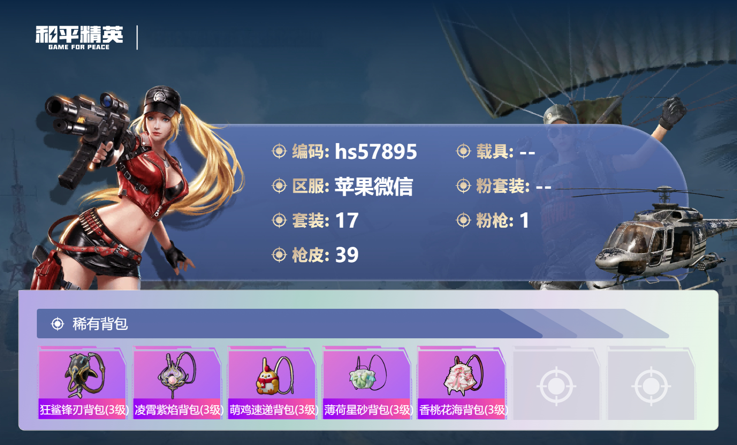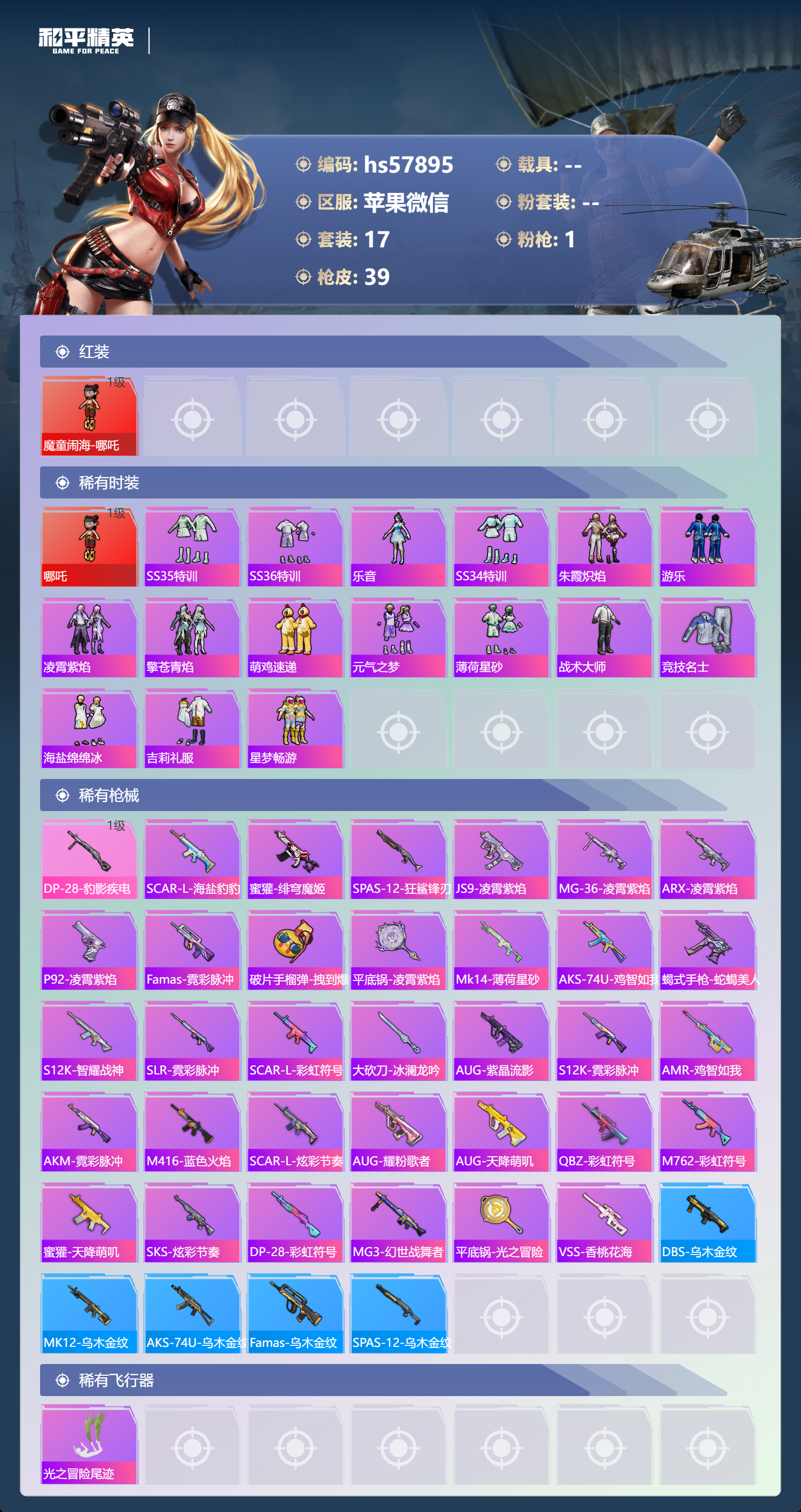 0载具-17套装-39呛皮-hs57895 苹果微信-0王牌印记-1红装-1特效呛-10178热力值-17套装-39呛皮【1红装】魔童闹海-哪吒/1级【1特效呛】dp-28-豹影疾电/1级【17稀有时装】哪吒/1级ss35特训ss36特训乐音ss34特训朱霞炽焰游乐凌霄紫焰擎苍青焰萌鸡速递元气之梦薄荷星砂战术大师竞技名士海盐绵绵冰吉莉礼服星梦畅游【39稀有呛械】dbs-乌木金纹sca