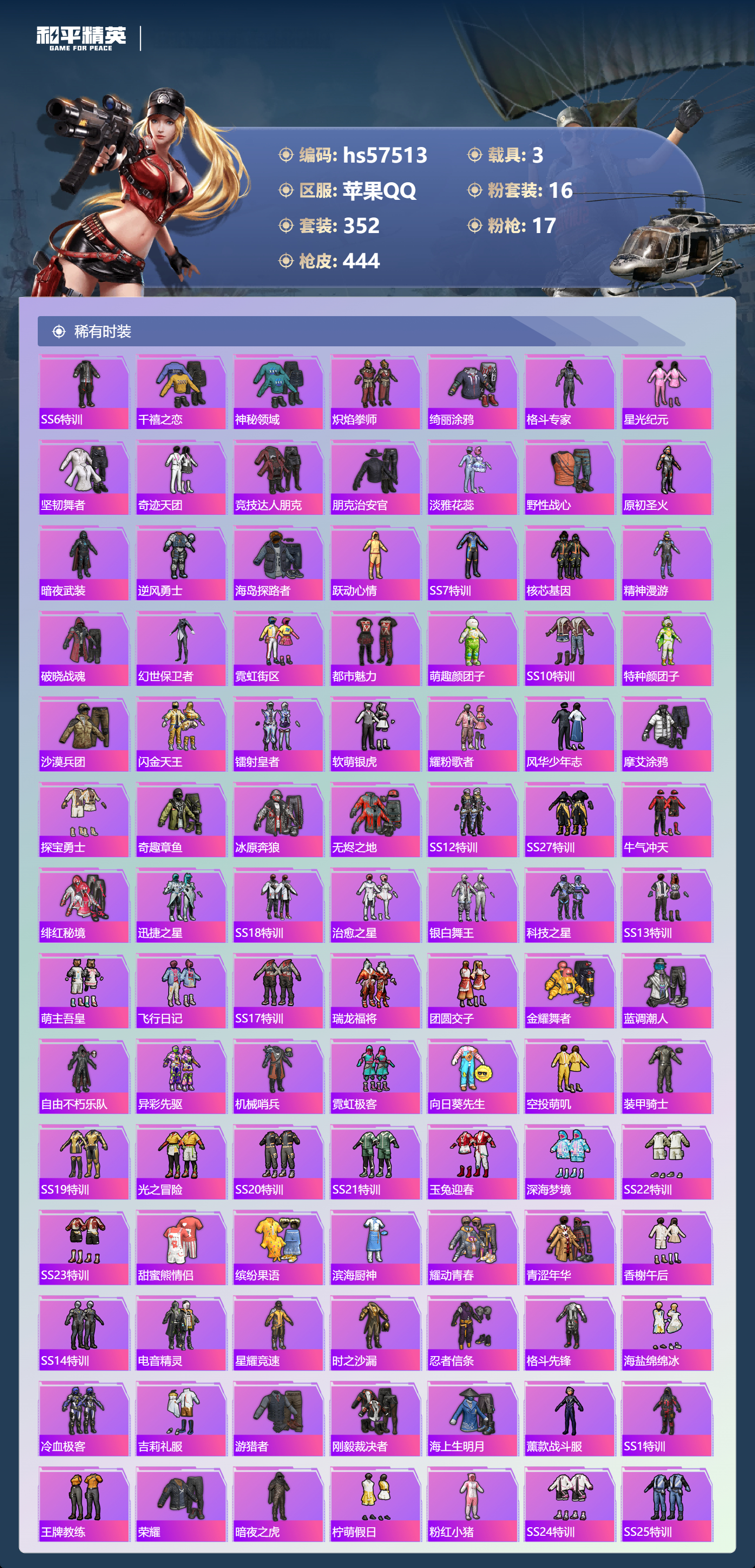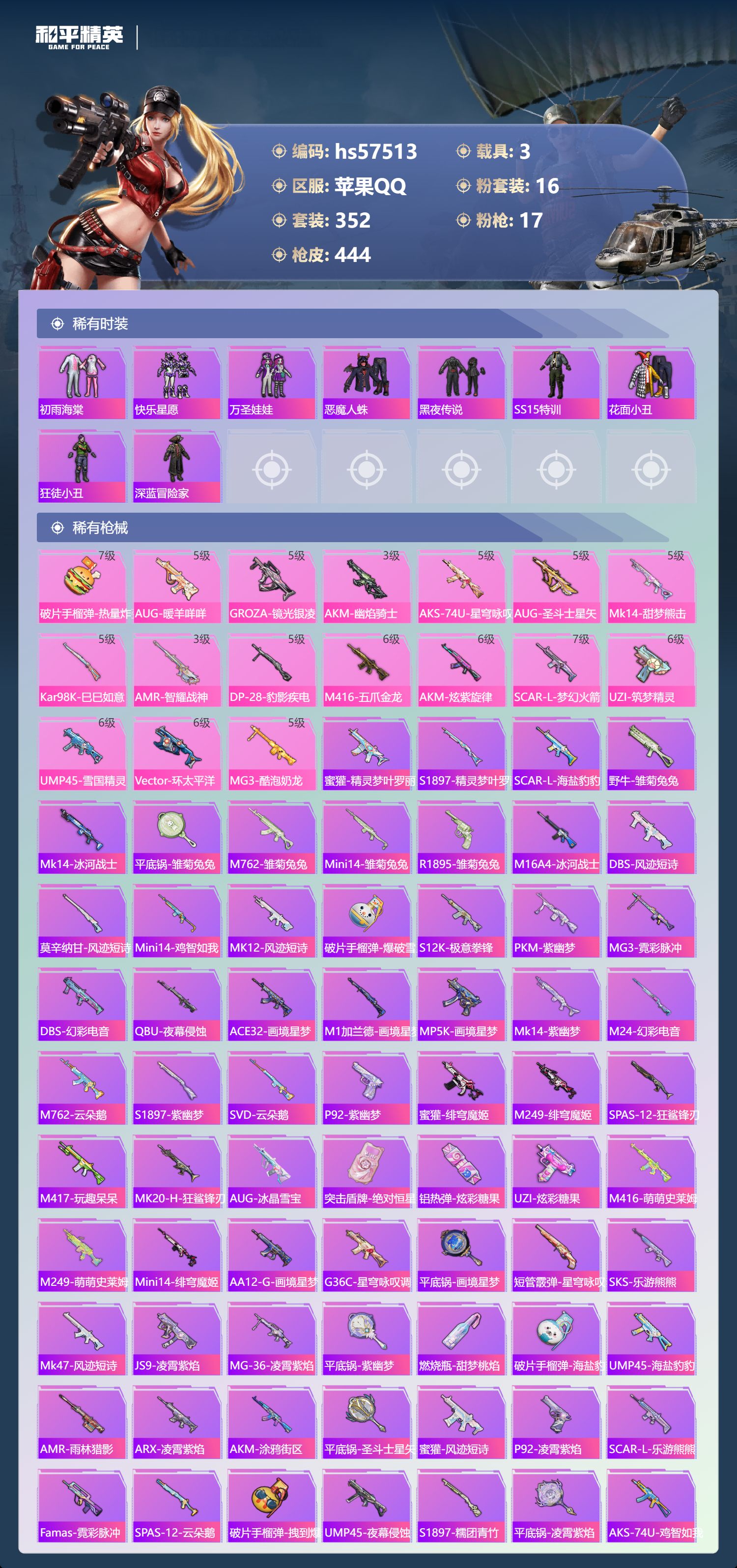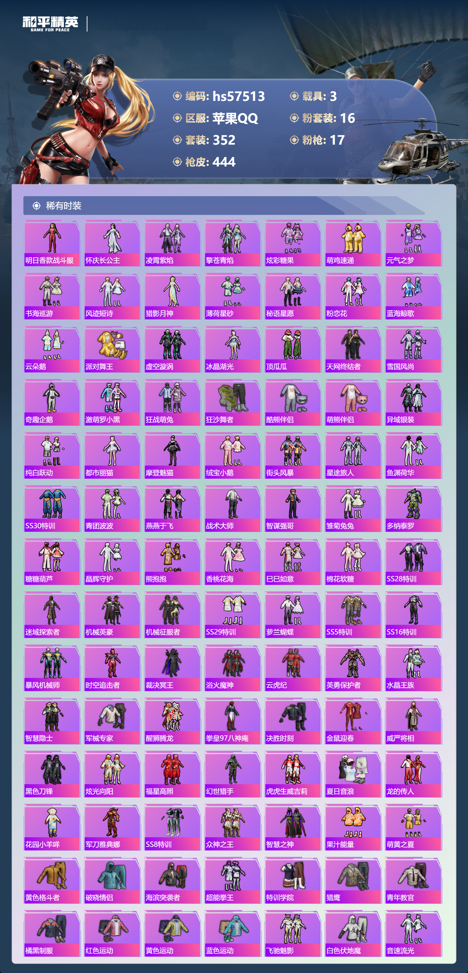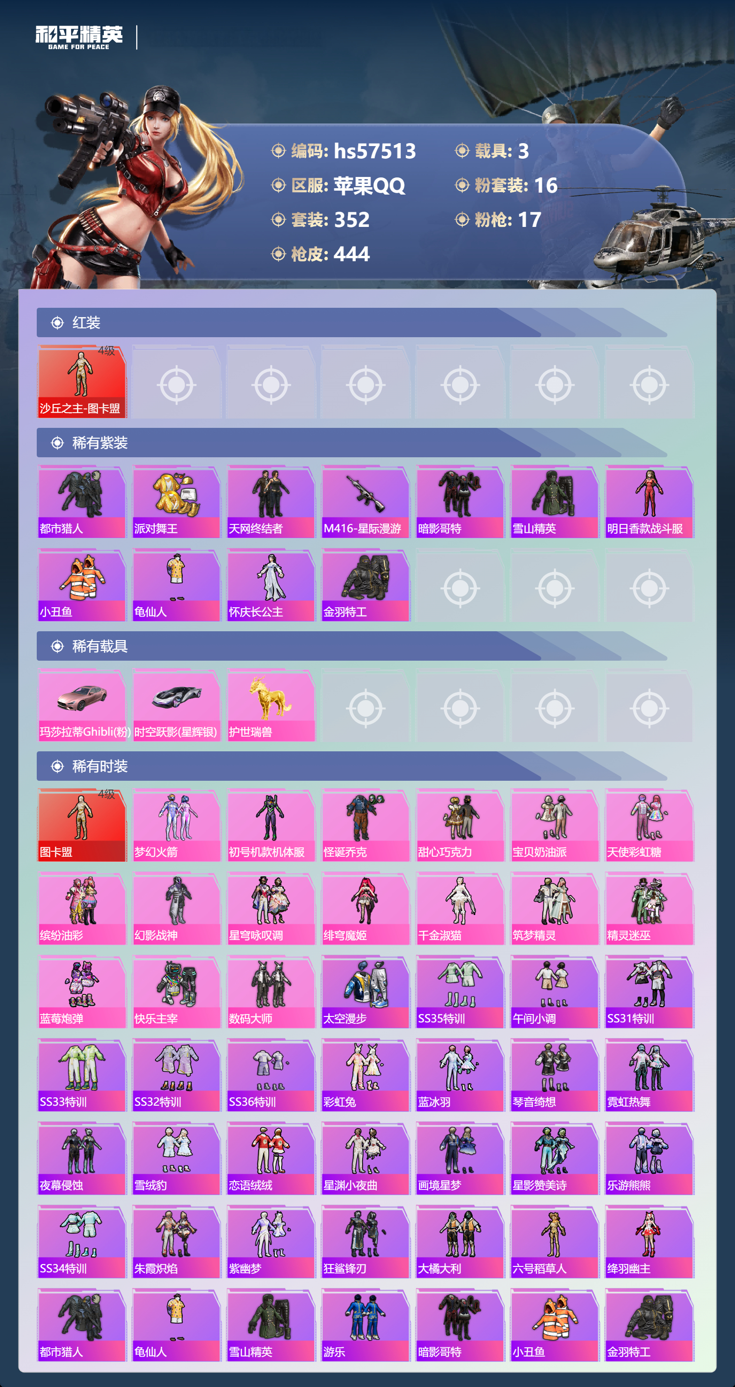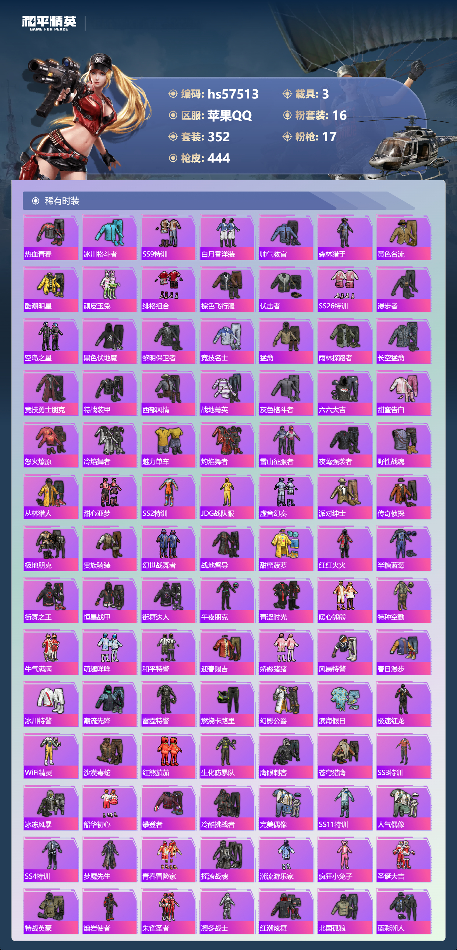 3载具-352套装-444呛皮-hs57513 苹果手q-31王牌印记-有战神框-1红装-16粉装-17特效呛-3载具-热力值-352套装-444呛皮-7卓越印记-4传奇印记【1红装】沙丘之主-图卡盟/4级【16粉装】角色-千金淑猫套装-天使彩虹糖套装-甜心巧克力套装-精灵迷巫套装-缤纷油彩套装-数码大师角色-绯穹魔姬套装-宝贝奶油派角色-初号机款机体服套装-怪诞乔克套装-蓝莓炮弹套装-星穹