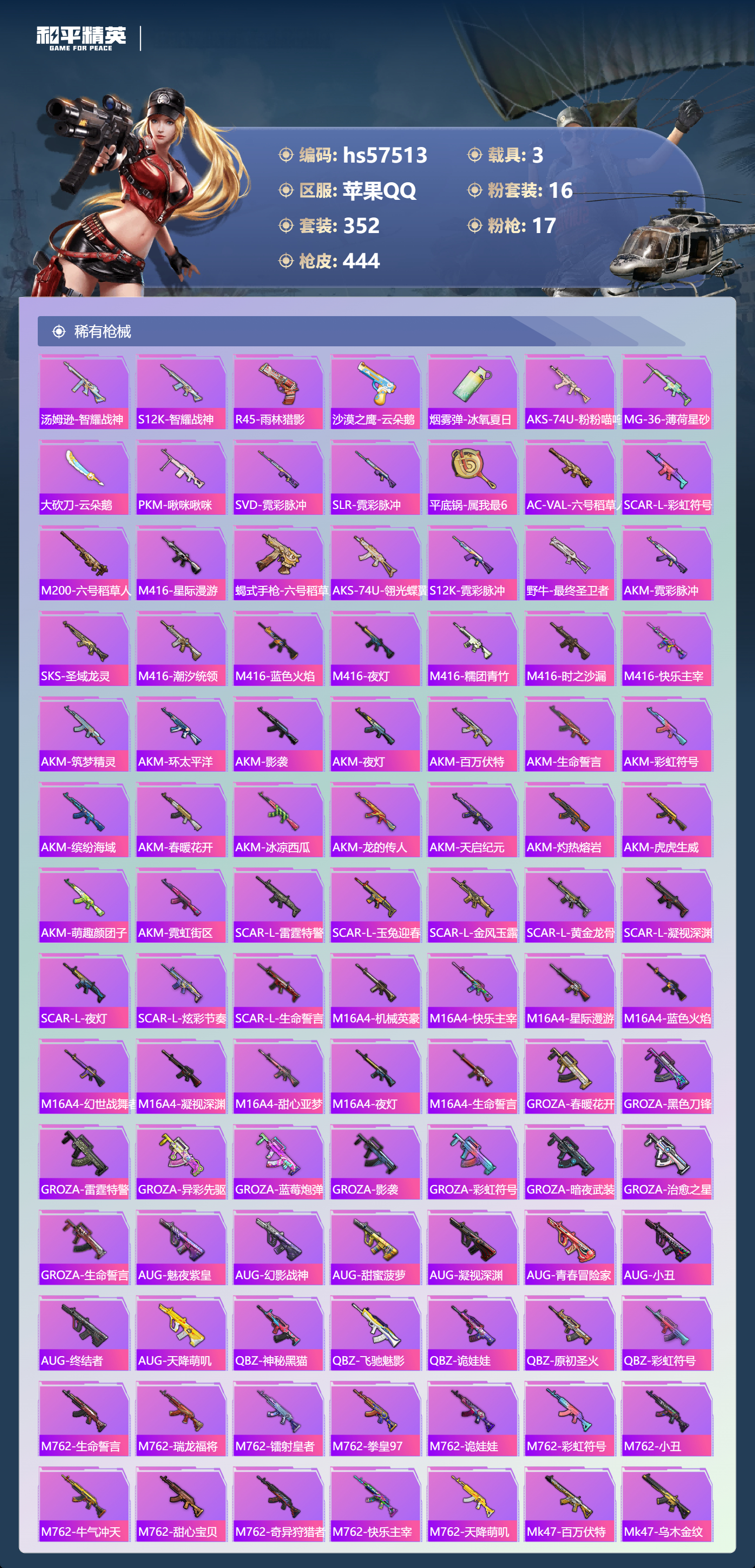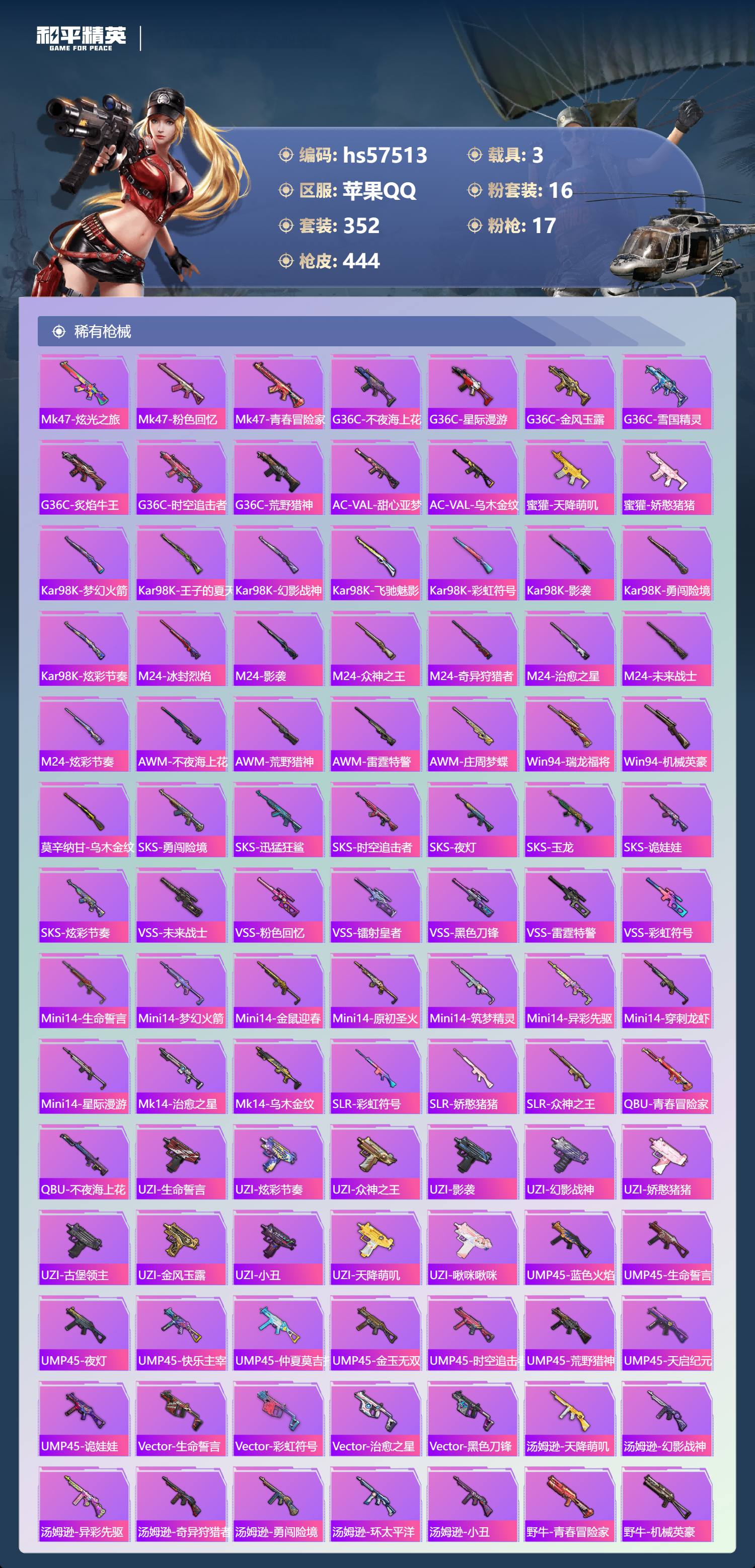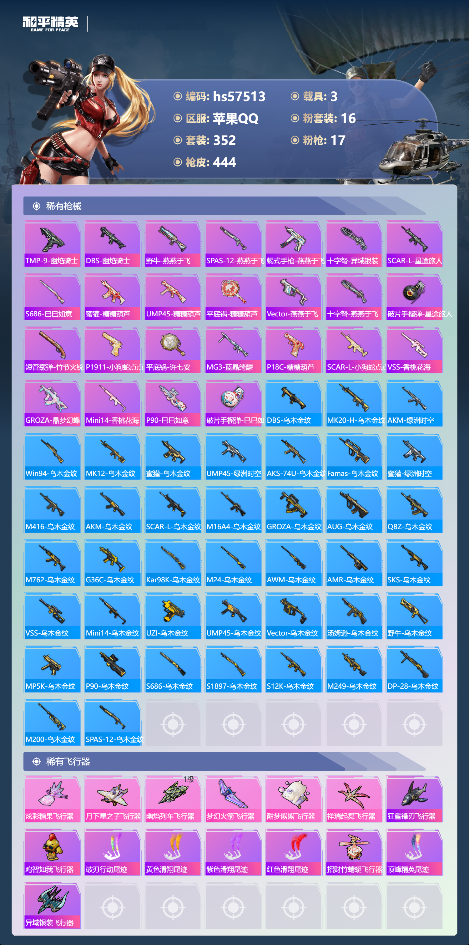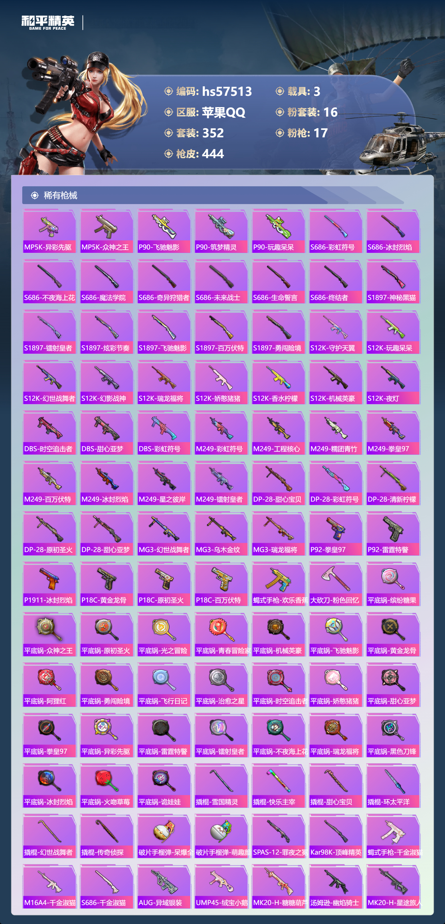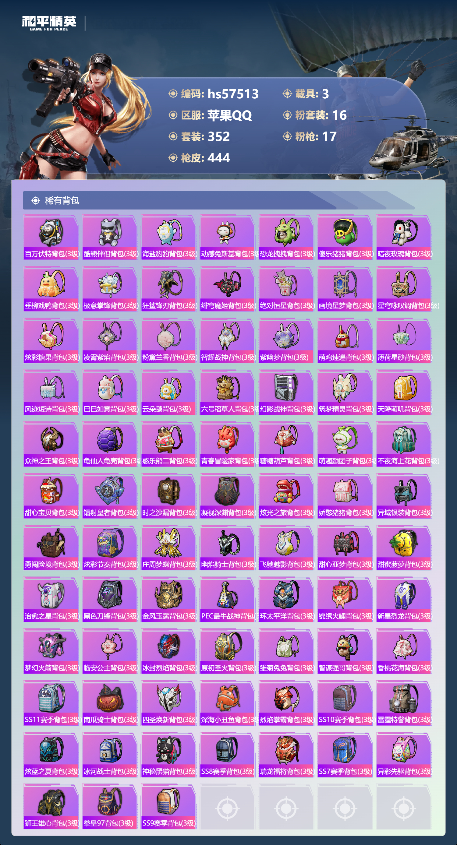 3载具-352套装-444呛皮-hs57513 苹果手q-31王牌印记-有战神框-1红装-16粉装-17特效呛-3载具-热力值-352套装-444呛皮-7卓越印记-4传奇印记【1红装】沙丘之主-图卡盟/4级【16粉装】角色-千金淑猫套装-天使彩虹糖套装-甜心巧克力套装-精灵迷巫套装-缤纷油彩套装-数码大师角色-绯穹魔姬套装-宝贝奶油派角色-初号机款机体服套装-怪诞乔克套装-蓝莓炮弹套装-星穹