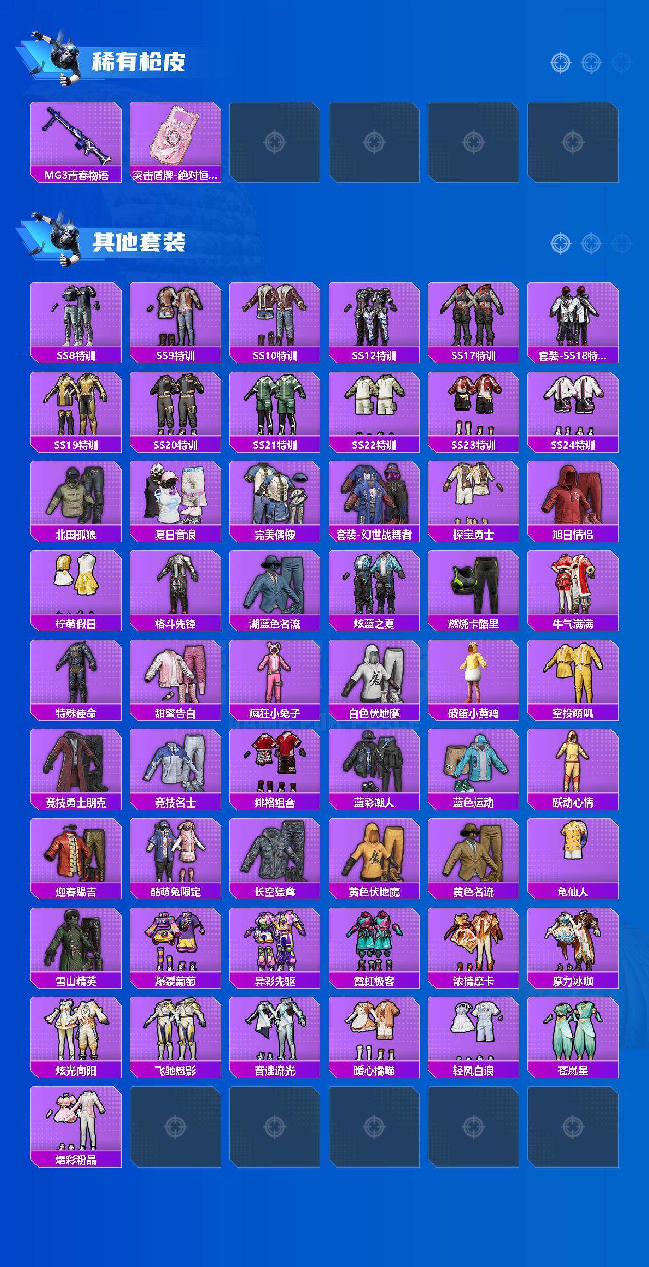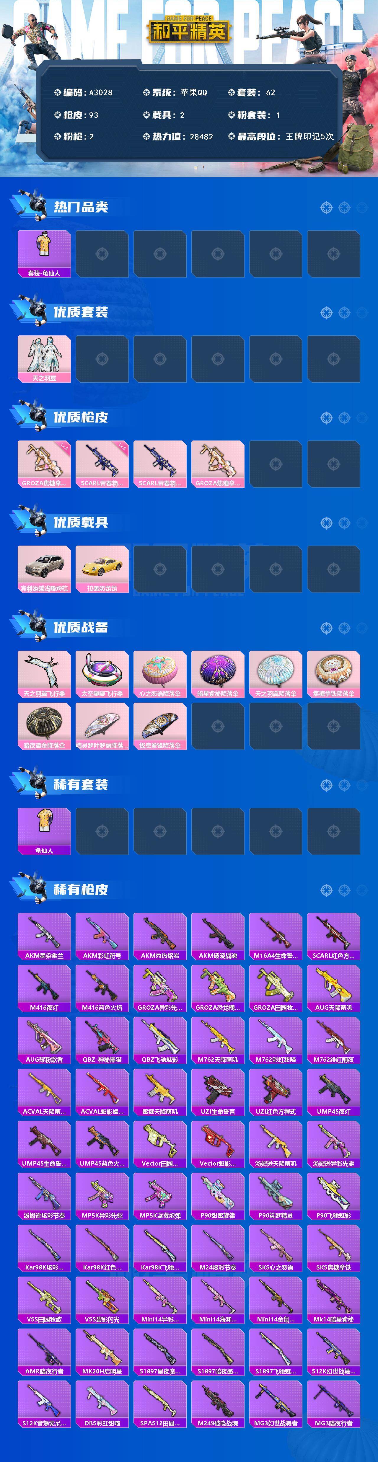 [15632262]苹果【小号】 手q-1粉装-2特效呛-2载具-3粉色飞行器-28482热力值-5王牌印记-62套装-93呛皮 【热门品类】:套装-龟仙人 【粉色套装】:粉装-天之羽翼 【粉色呛皮等级】:scar-l-青春物语五级,groza-焦糖拿铁五级 【粉色载具】:宾利添越(浅瞪羚棕),拉轰奶龙龙 【粉色呛皮】:scar-l-青春物语,groza-焦糖拿铁 【粉色飞行器】:天之羽翼飞行器,太空嘟嘟飞行器 【粉色降落伞】:心之恋语降落伞,暗星紫秘降落伞,天之羽翼降落伞,焦糖拿铁降落伞,暗夜鎏金降落伞,精灵梦叶罗丽降落伞,极意拳锋降落伞,炫彩糖果降落伞 【稀有套装】:套装-龟仙人,套装-雪国风尚,套装-炫彩糖果 【稀有呛皮】:aug-冰晶雪宝,akm-墨染幽兰,akm-彩虹符号,akm-灼热熔岩,akm-破晓战魂,m16a4-生命誓言,scar-l-红色方程式,m416-夜灯,m416-蓝色火焰,groza-异彩先驱,groza-恐龙拽拽,groza-田园牧歌,aug-天降萌叽,aug-耀粉歌者,q-神秘黑猫,q-飞驰魅影,m762-天降萌叽,m762-彩虹甜喵,m762-绯红前夜,ac-val-天降萌叽,ac-val-魅影蝠王,蜜獾-天降萌叽,uzi-生命誓言,uzi-红色方程式,ump45-夜灯,ump45-生命誓言,ump45-蓝色火焰,vect-田园牧歌,vect-魅影蝠王,汤姆逊-天降萌叽,汤姆逊-异彩先驱,汤姆逊-炫彩节奏,mp5k-异彩先驱,mp5k-蓝莓炮弹,p90-甜蜜旋律,p90-筑梦精灵,p90-飞驰魅影,kar98k-炫彩节奏,kar98k-红色方程式,kar98k-飞驰魅影,m24-炫彩节奏,sks-心之恋语,sks-焦糖拿铁,vss-田园牧歌,vss-碧影闪光,mini14-异彩先驱,mini14-海渊国主,mini14-金鼠迎春,mk14-暗星紫秘,amr-暗夜行者,mk20-h-启明星,s1897-星夜魔法师,s1897-暗夜鎏金,s1897-飞驰魅影,s12k-音爆索尼克,s12k-幻世战舞者,dbs-彩虹甜喵,spas-12-田园牧歌,m249-破晓战魂,mg3-幻世战舞者,mg3-暗夜行者,mg3-青春物语,突击盾牌-绝对恒星 【其他套装】:套装-ss8特训,套装-ss9特训,套装-ss10特训,套装-ss12特训,套