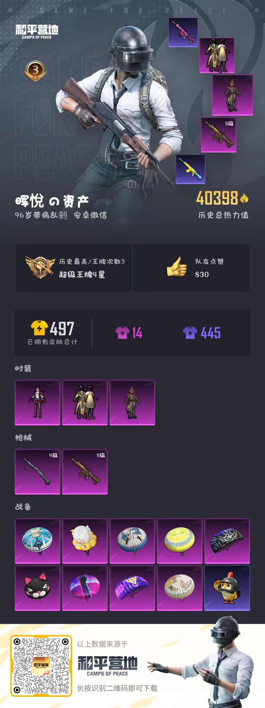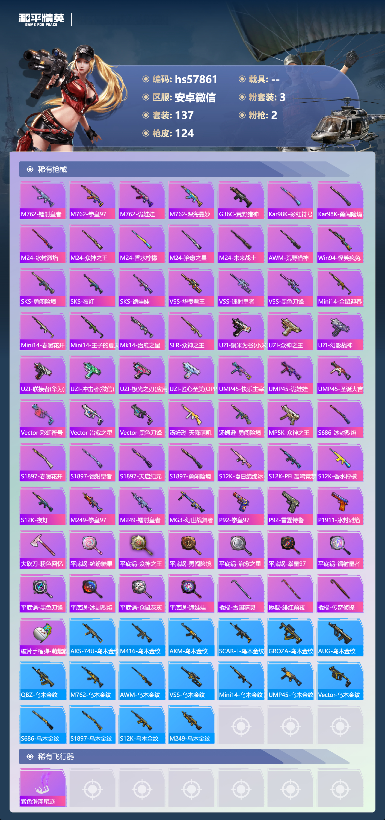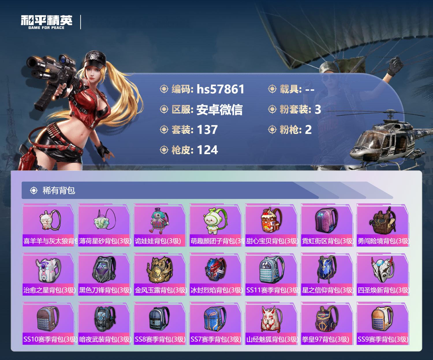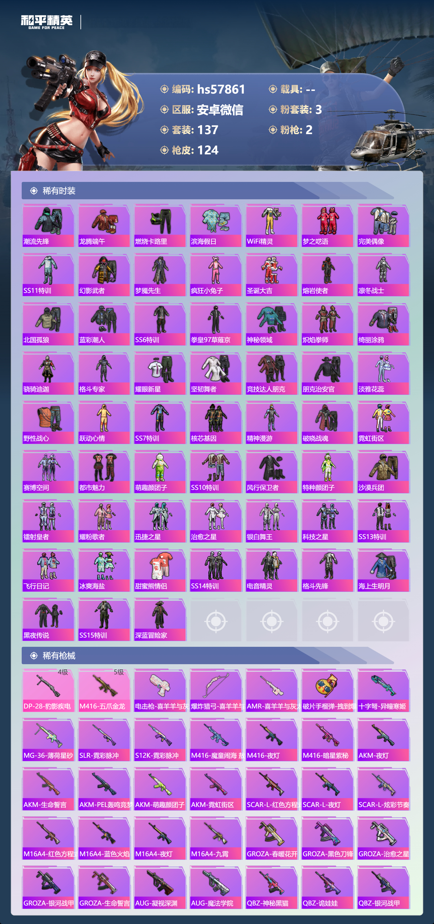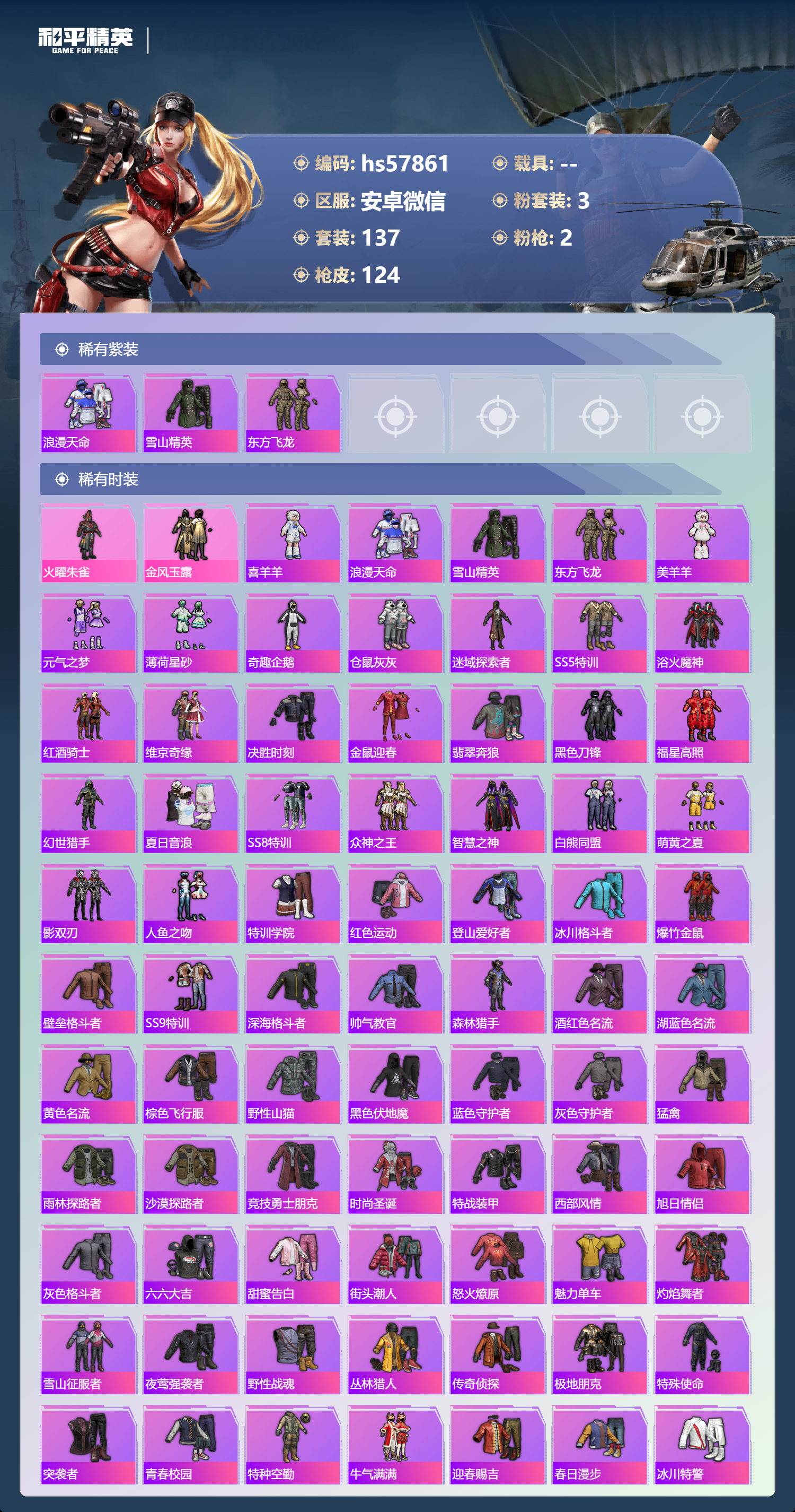 0载具-137套装-124呛皮-安卓微信-3王牌印记-3粉装-2特效呛-40698热力值-137套装-124呛皮【3粉装】套装-火曜朱雀角色-罪夜之冕套装-金风玉露【2特效呛】m416-五爪金龙/5级dp-28-豹影疾电/4级【3稀有紫装】浪漫天命雪山精英东方飞龙【136稀有时装】喜羊羊浪漫天命雪山精英东方飞龙美羊羊元气之梦薄荷星砂火曜朱雀金风玉露奇趣企鹅仓鼠灰灰迷域探索者ss5特训浴火魔神