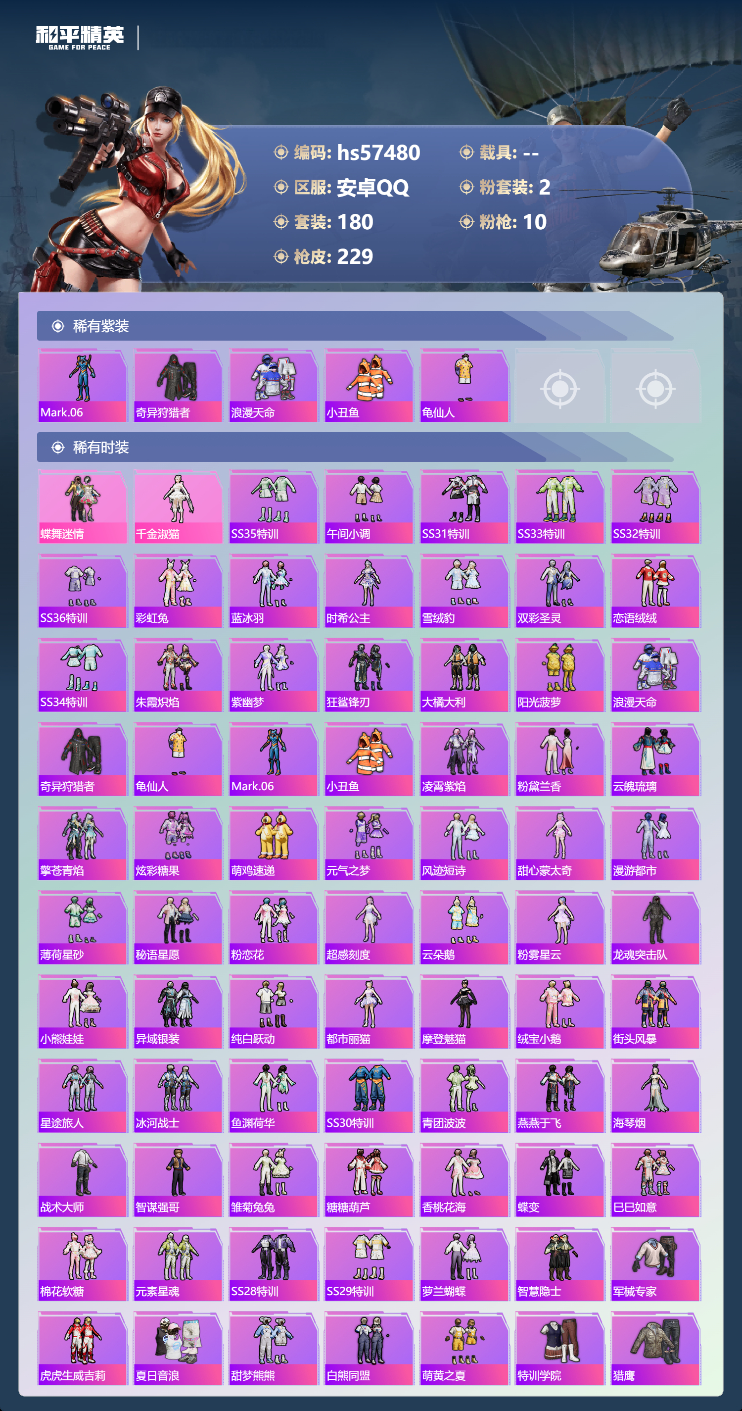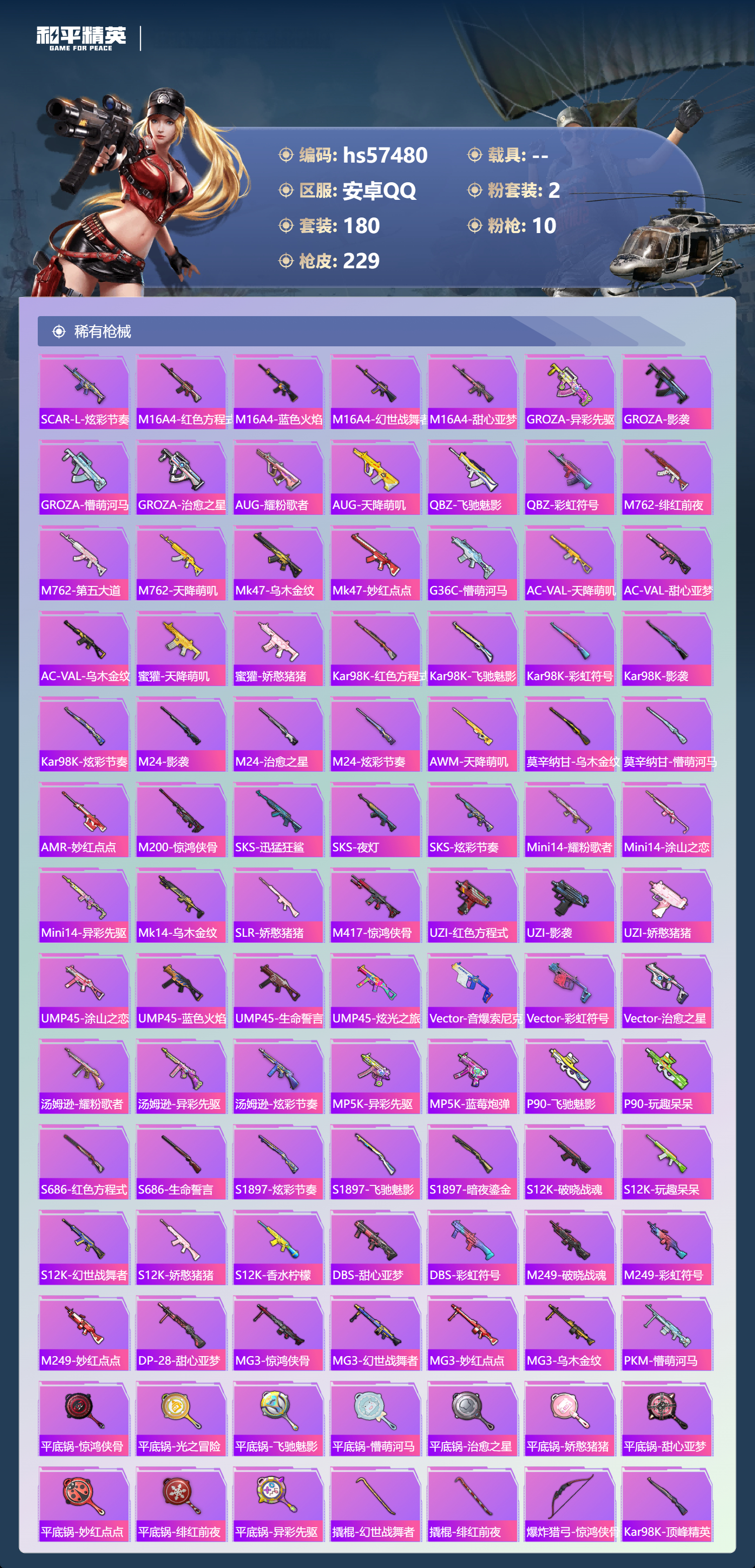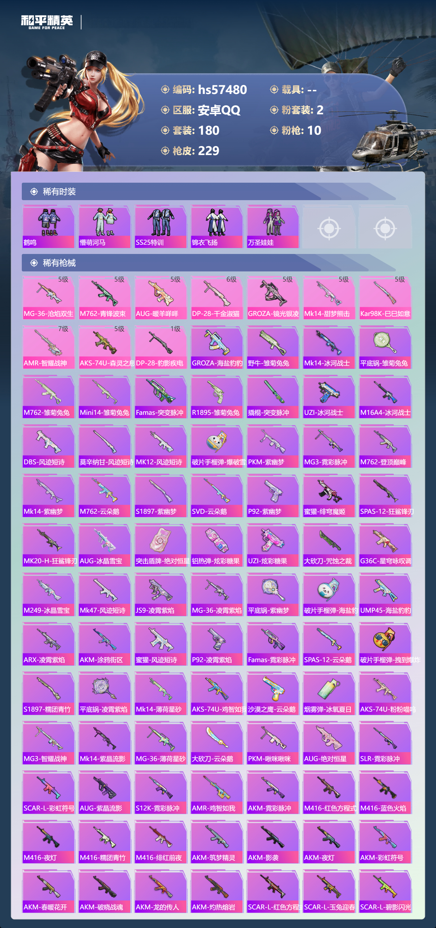 0载具-180套装-229呛皮-hs57480 安卓手q-18王牌印记-2粉装-10特效呛-64679热力值-180套装-229呛皮-6卓越印记-3传奇印记【2粉装】套装-蝶舞迷情角色-千金淑猫【10特效呛】mk14-甜梦熊击/5级aug-暖羊咩咩/5级dp-28-千金淑猫/6级dp-28-豹影疾电/1级mg-36-沧焰双生/5级aks-74u-森灵之息/5级m762-青锋波束/5级kar98k-巳巳如意/5