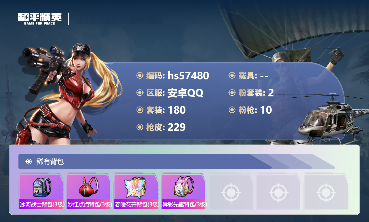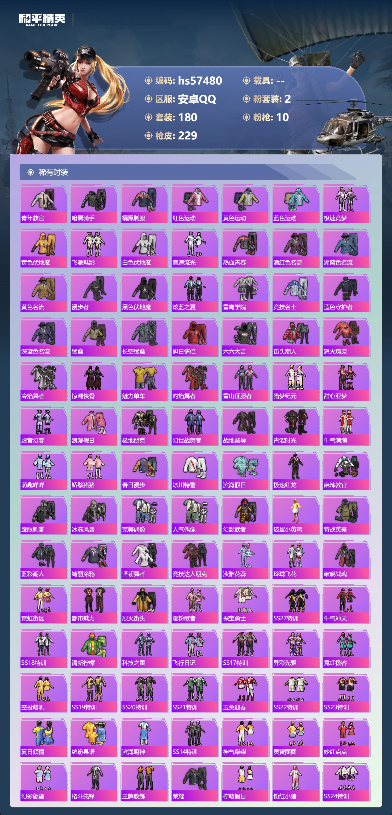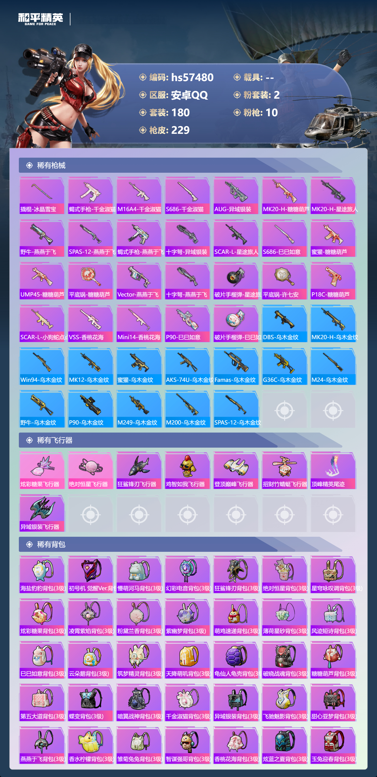 0载具-180套装-229呛皮-hs57480 安卓手q-18王牌印记-2粉装-10特效呛-64679热力值-180套装-229呛皮-6卓越印记-3传奇印记【2粉装】套装-蝶舞迷情角色-千金淑猫【10特效呛】mk14-甜梦熊击/5级aug-暖羊咩咩/5级dp-28-千金淑猫/6级dp-28-豹影疾电/1级mg-36-沧焰双生/5级aks-74u-森灵之息/5级m762-青锋波束/5级kar98k-巳巳如意/5