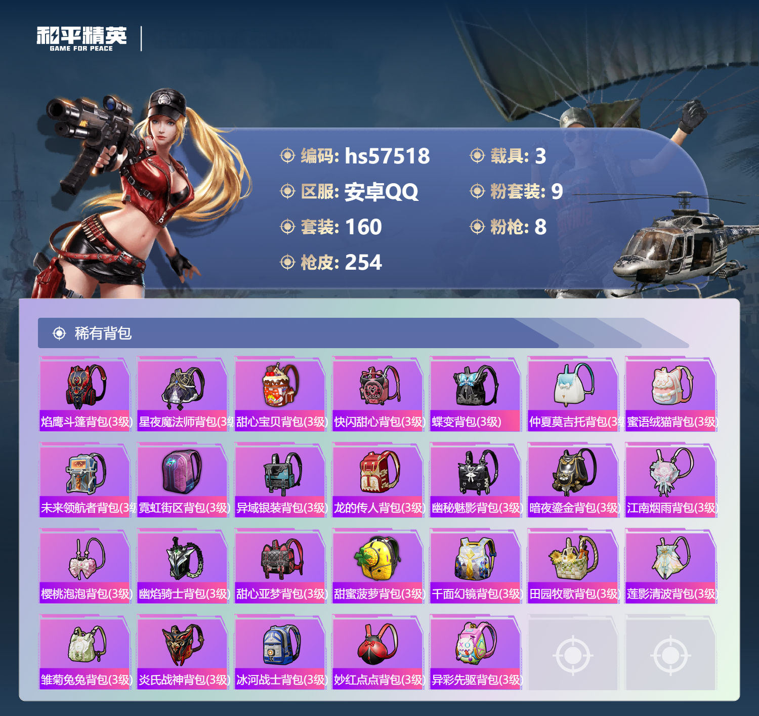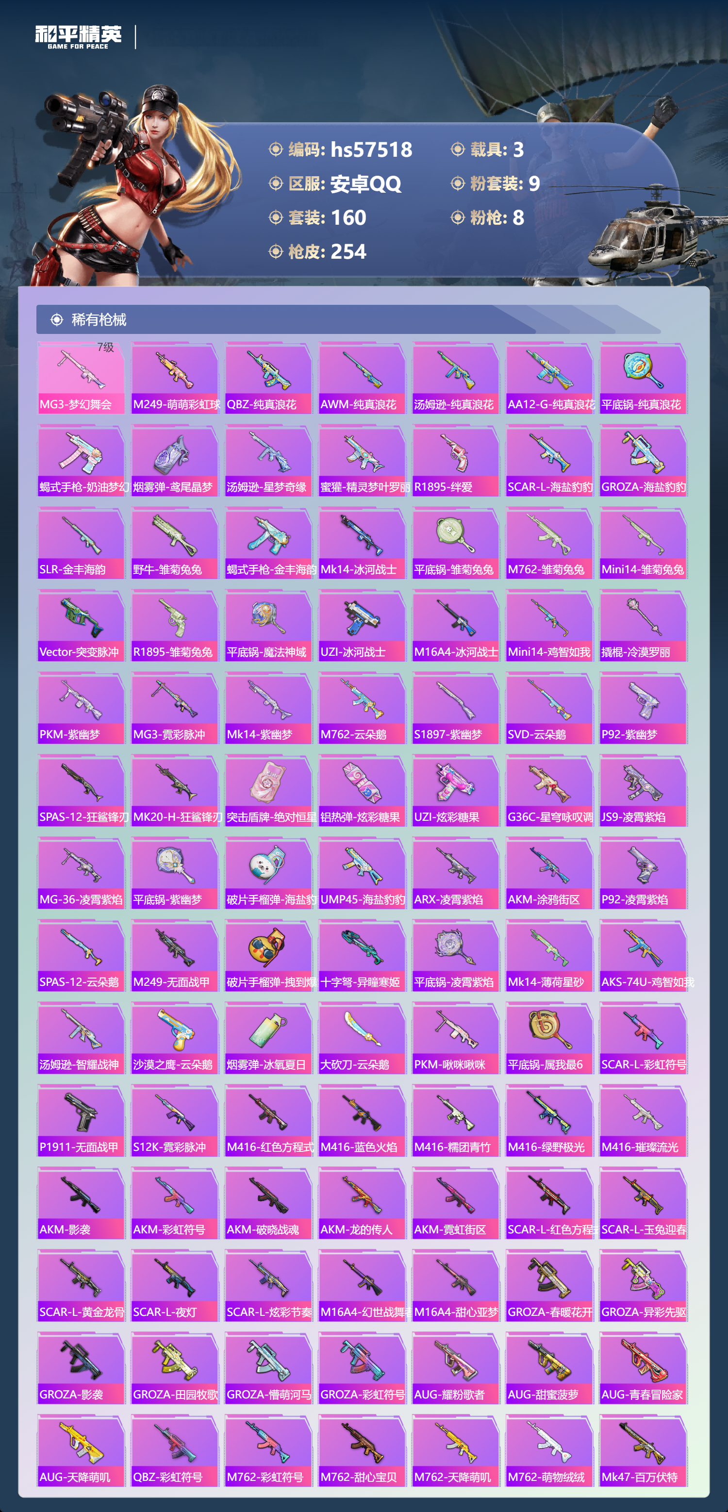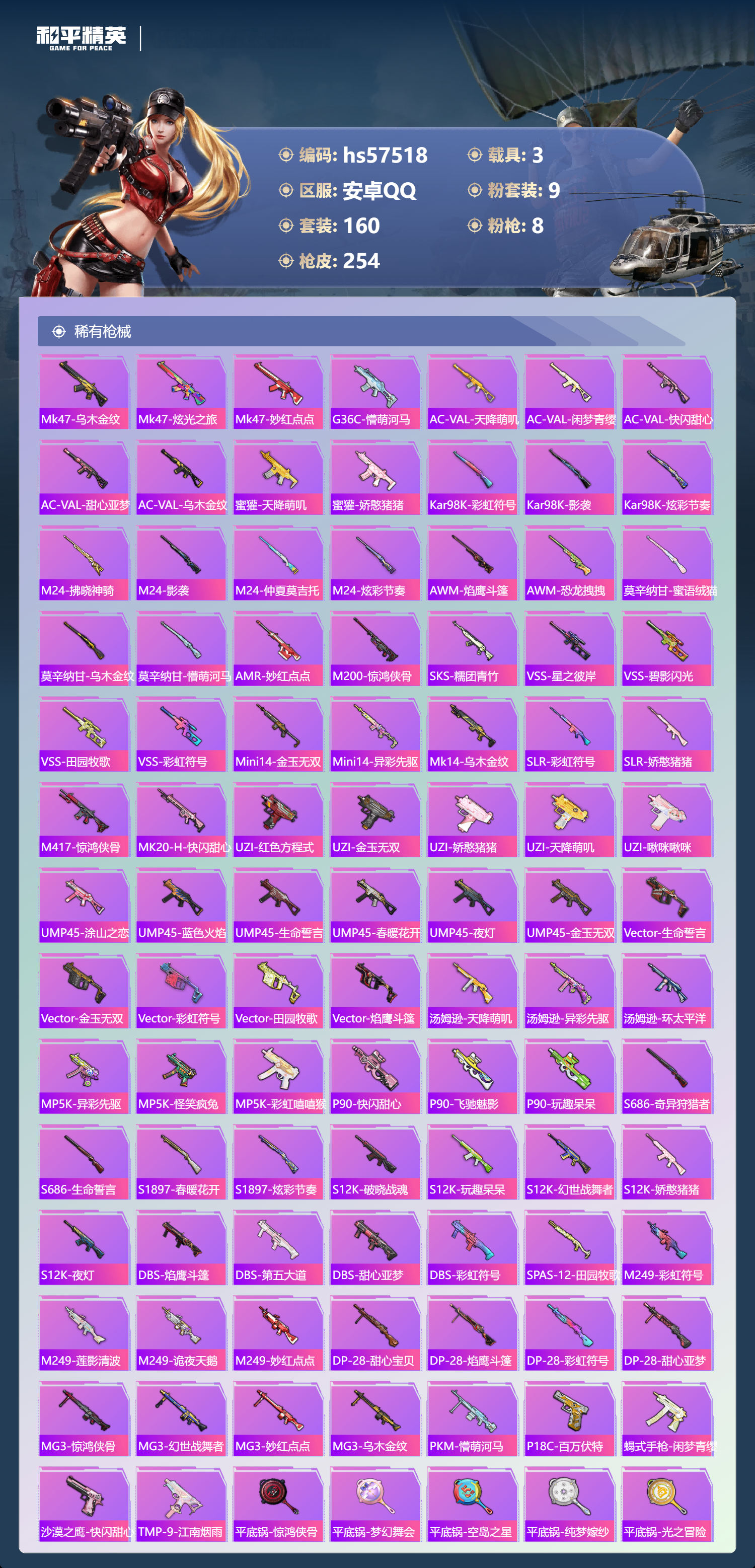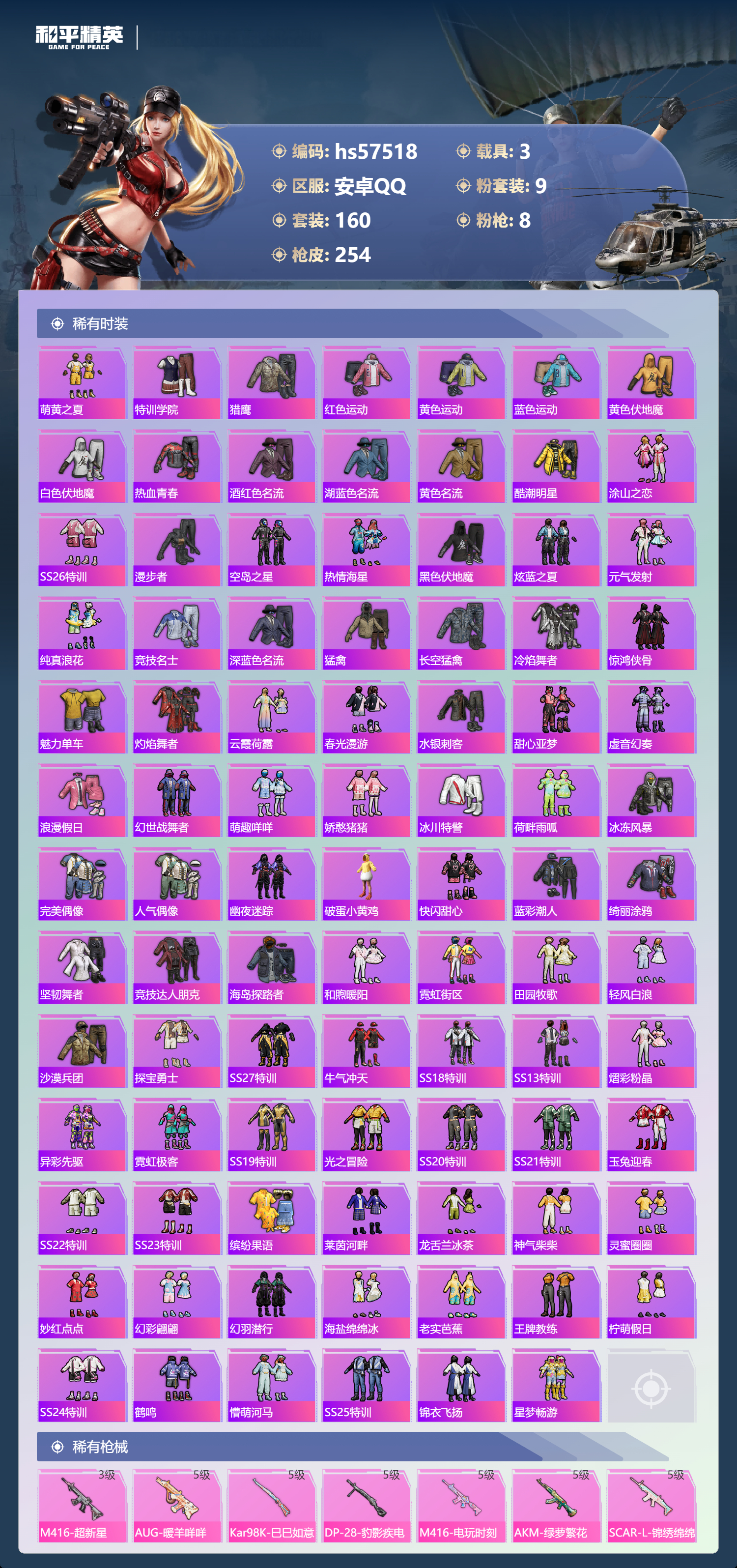 hs57518 安卓手q-18王牌印记-有战神框-9粉装-8特效呛-3载具-77299热力值-160套装-254呛皮-9卓越印记-9传奇印记【9粉装】套装-星穹咏叹调角色-洛天依套装-宝贝奶油派套装-天使彩虹糖套装-绚金战神套装-第五大道套装-甜心巧克力角色-冷漠罗丽套装-金丰海韵【8特效呛】m416-超新星/3级akm-绿萝繁花/5级mg3-梦幻舞会/7级aug-暖羊咩
