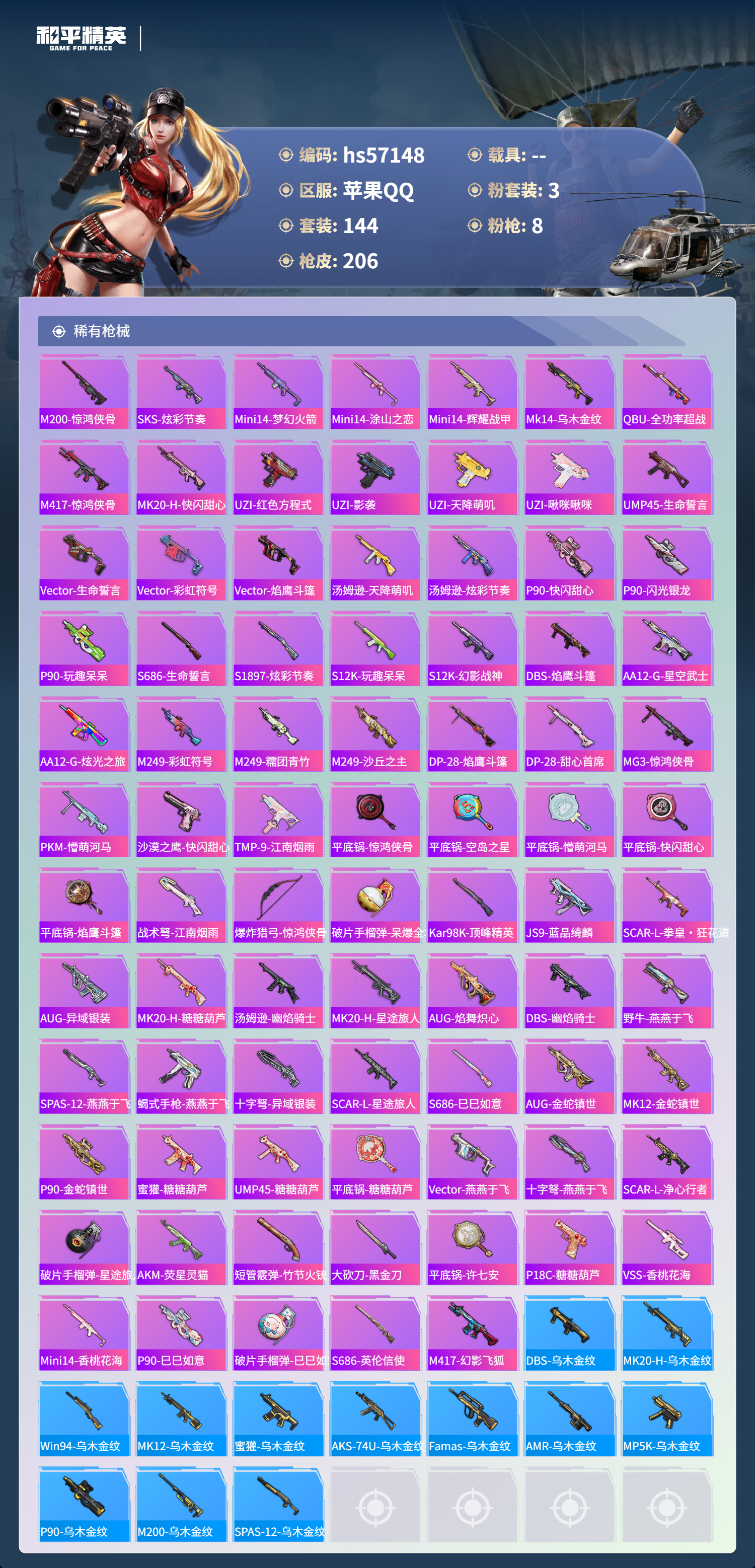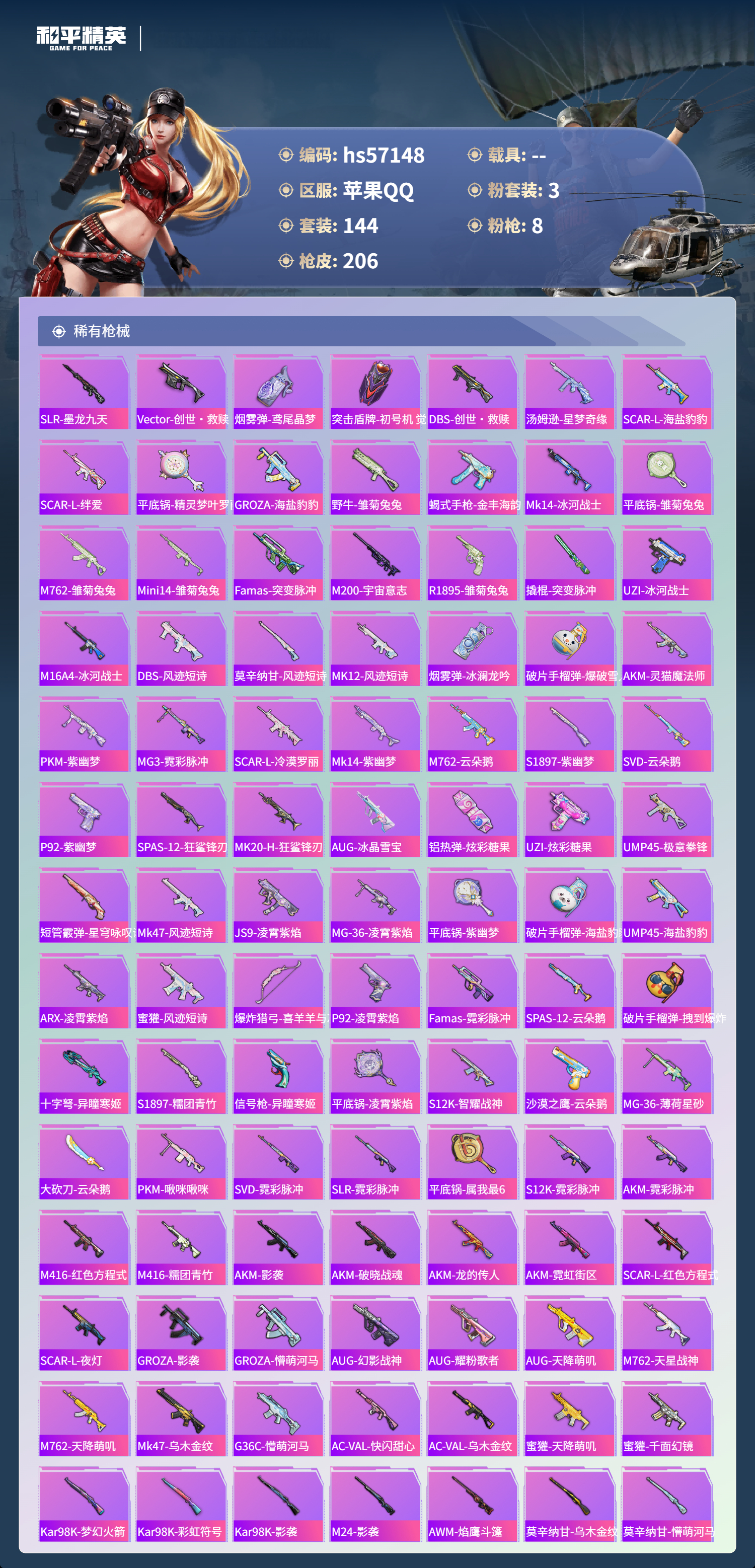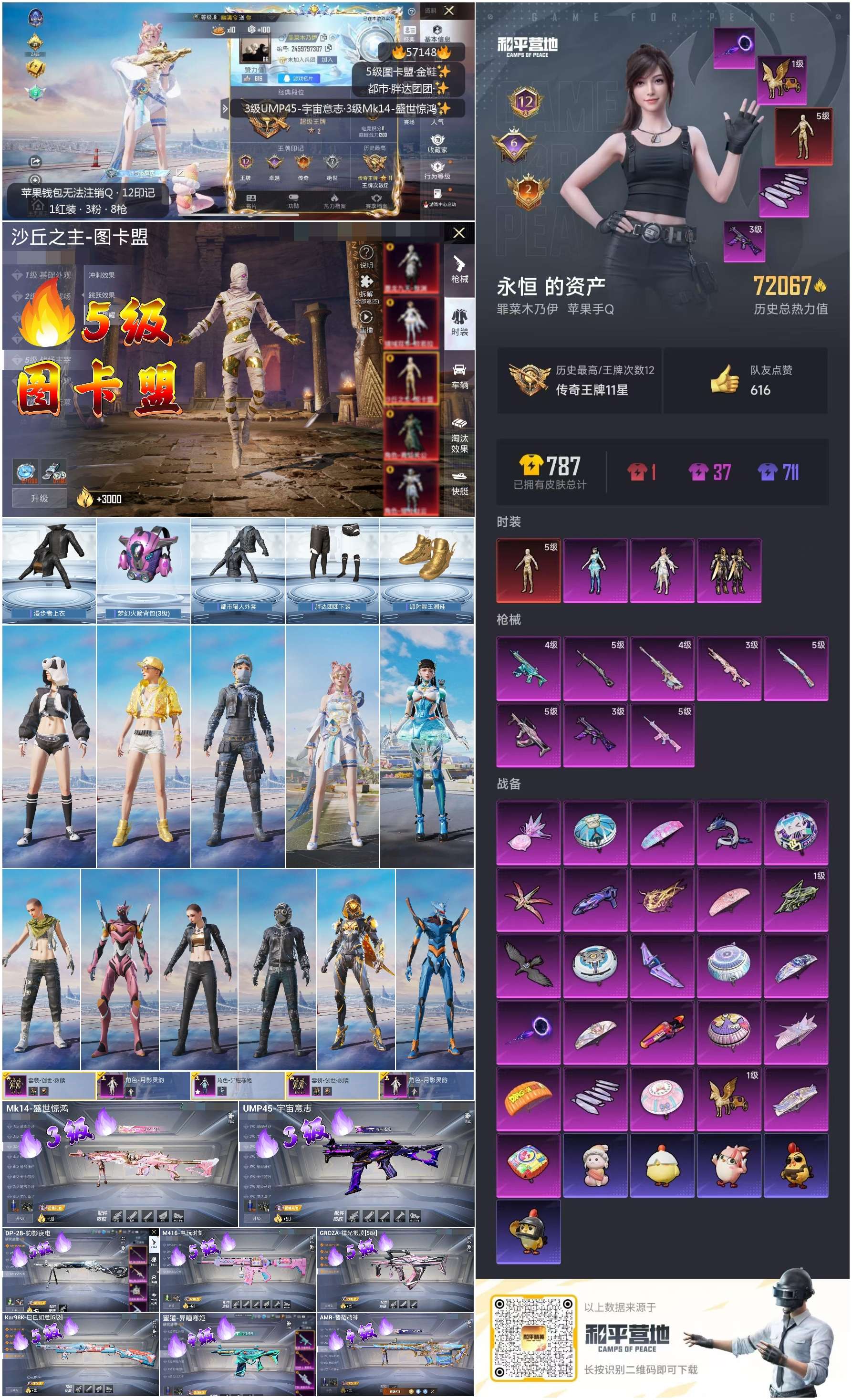 2384455苹果手q-12王牌印记-1红装-3粉装-8特效呛-72067热力值-144套装-206呛皮-6卓越印记-2传奇印记 【1红装】沙丘之主-图卡盟/5级 【3粉装】角色-月影灵韵套装-创世·救赎角色-异瞳寒姬 【8特效呛】groza-镜光银凌/5级dp-28-豹影疾电/5级mk14-盛世惊鸿/3级ump45-宇宙意志/3级m416-电玩时刻/5级蜜獾-异瞳寒姬/4