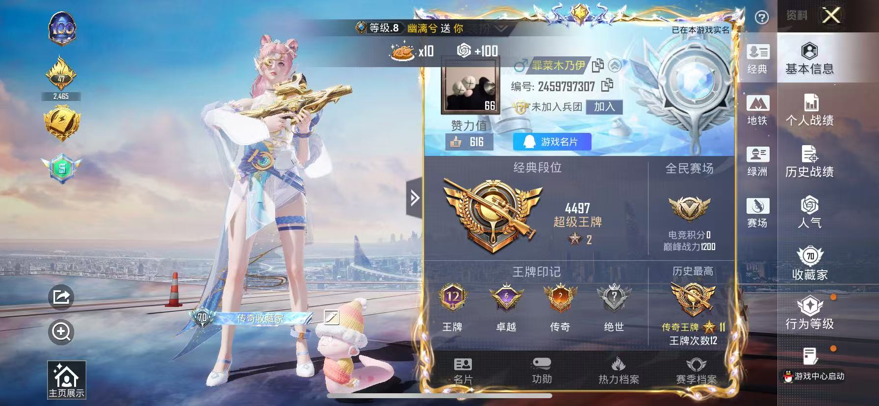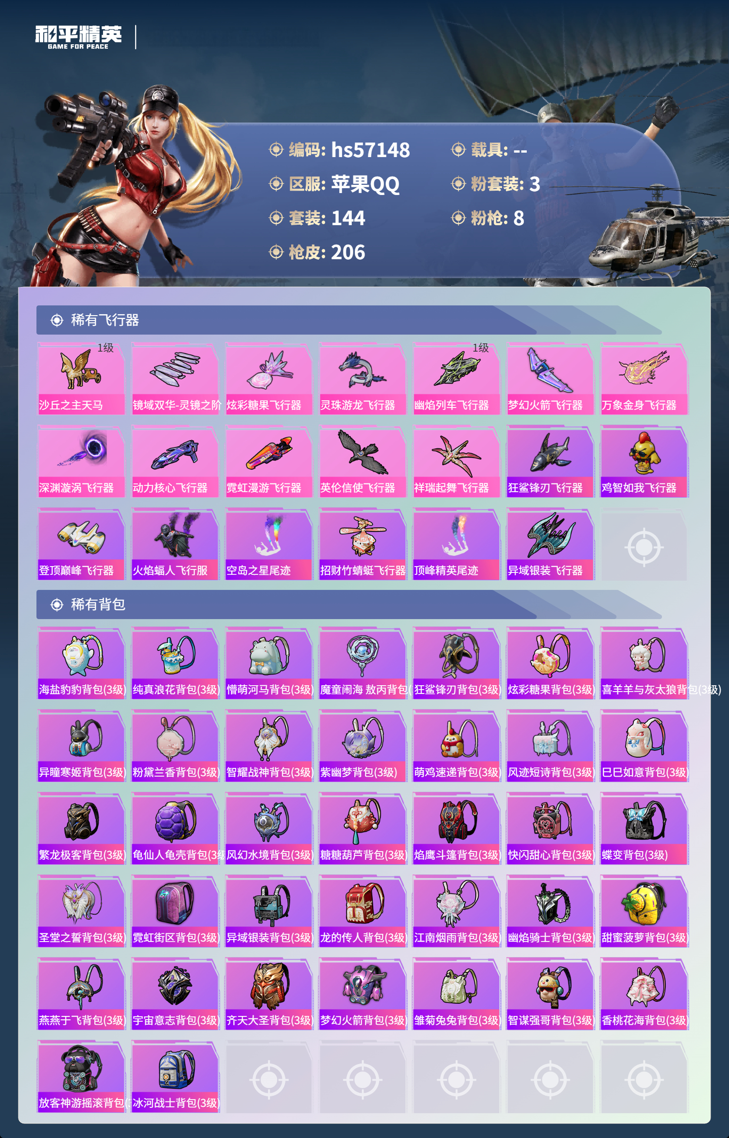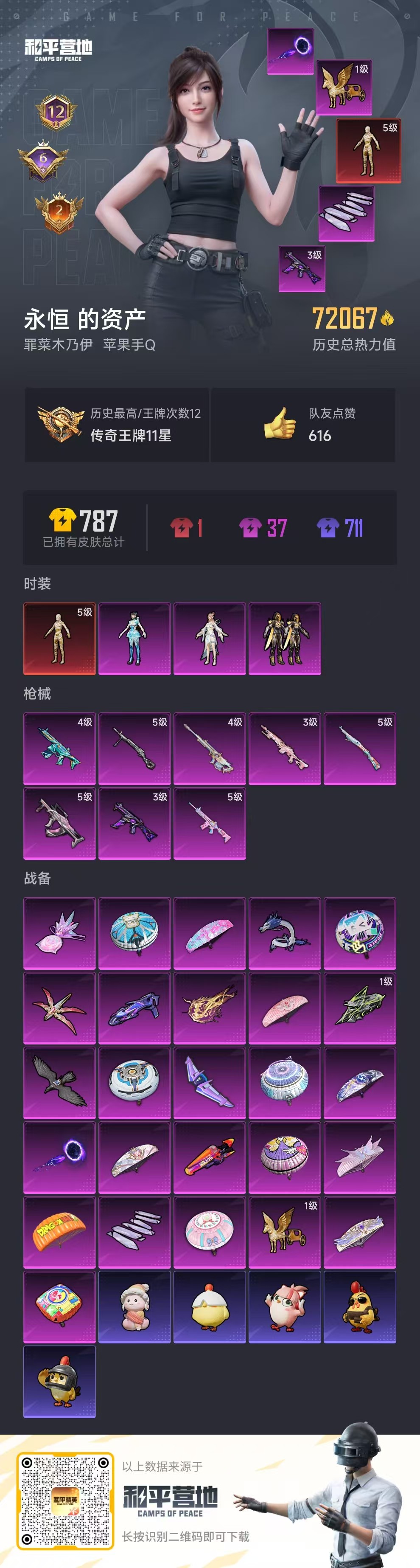 2384455苹果手q-12王牌印记-1红装-3粉装-8特效呛-72067热力值-144套装-206呛皮-6卓越印记-2传奇印记 【1红装】沙丘之主-图卡盟/5级 【3粉装】角色-月影灵韵套装-创世·救赎角色-异瞳寒姬 【8特效呛】groza-镜光银凌/5级dp-28-豹影疾电/5级mk14-盛世惊鸿/3级ump45-宇宙意志/3级m416-电玩时刻/5级蜜獾-异瞳寒姬/4