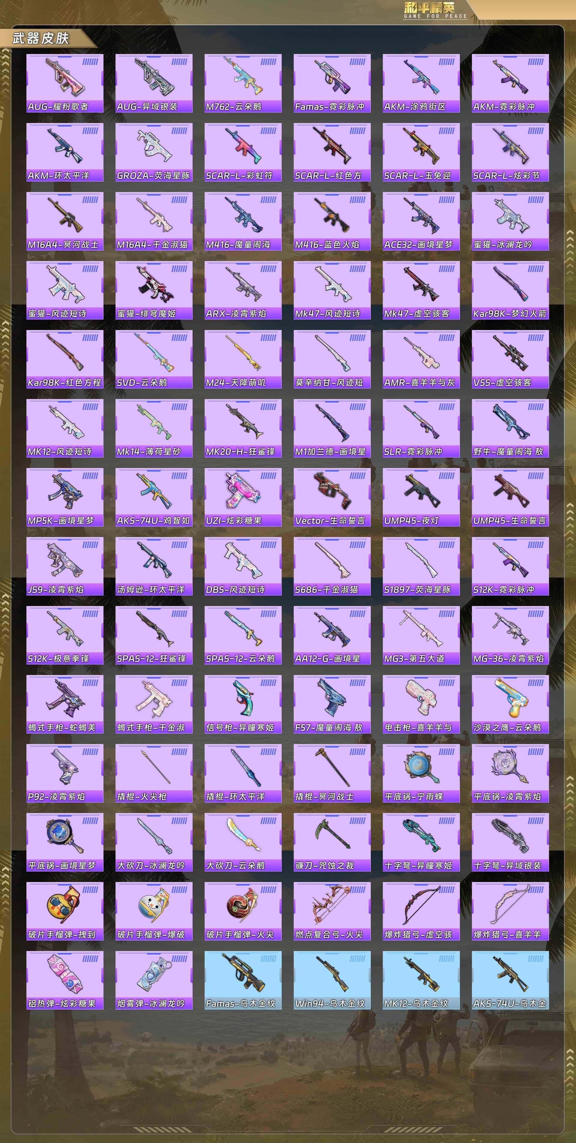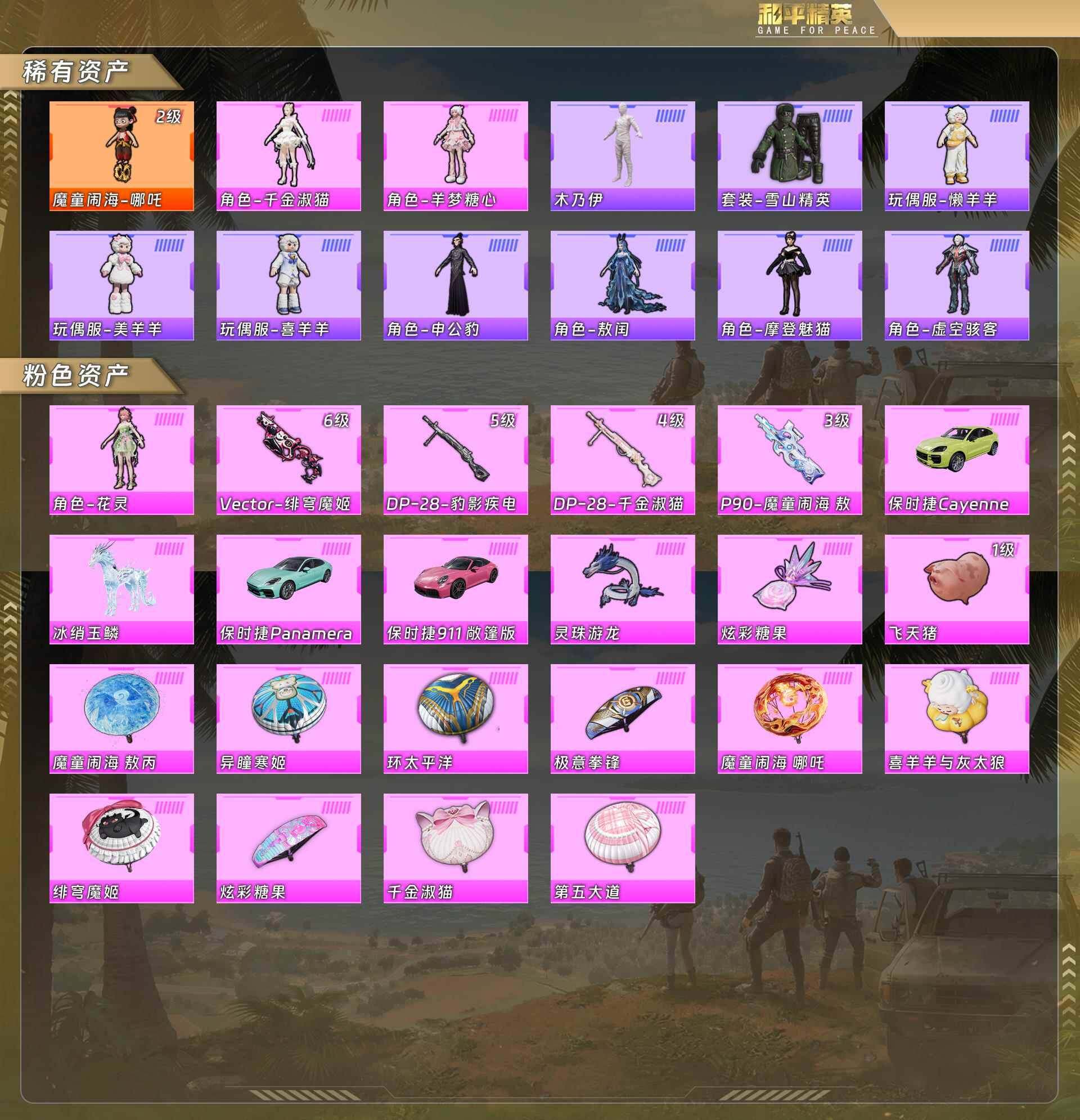 身法号/魔童闹海-哪吒2级/千金淑猫/羊梦糖心/木乃伊/美羊羊/喜羊羊/敖闰/摩登魅猫/虚空骇客/花灵/维克托绯穹魔姬/dp-28-豹影疾电/dp-28-千金淑猫/p90-魔童闹海 敖/保时捷cayenne/冰绡玉鳞/保时捷panamera/保时捷911敞篷版 没战神框(1神装-3粉装-4粉呛-4载具)hp5035-3粉色飞行器-31910热力值-4王牌印记-51套装-88呛皮 【红色神装等级】:魔童闹海-哪吒二级 【红色角色神装】:魔童闹海-哪吒 【热门品类】:套装-冥河战士 【粉色套装】:角色-千金淑猫,角色-花灵,角色-羊梦糖心 【粉色呛皮等级】:vect-绯穹魔姬六级,p90-魔童闹海 敖丙三级,dp-28-千金淑猫四级,dp-28-豹影疾电五级 【粉色载具】:保时捷911 敞篷版(星珀红),保时捷panamera(梦幻青),保时捷cayenne(橄榄绿),冰绡玉鳞 【粉色呛皮】:vect-绯穹魔姬,p90-魔童闹海 敖丙,dp-28-千金淑猫,dp-28-豹影疾电 【粉色飞行器】:飞天猪飞行器,灵珠游龙飞行器 【粉色降落伞】:环太平洋降落伞,第五大道降落伞,千金淑猫降落伞,绯穹魔姬降落伞,喜羊羊与灰太狼降落伞,魔童闹海 哪吒降落伞,魔童闹海 敖丙降落伞,异瞳寒姬降落伞,极意拳锋降落伞,炫彩糖果降落伞 【稀有套装】:套装-雪国风尚,角色-摩登魅猫,套装-彩虹兔,套装-云朵鹅,套装-雪绒豹,角色-虚空骇客,套装-朱霞炽焰,套装-凌霄紫焰,套装-擎苍青焰,玩偶服-懒羊羊,玩偶服-美羊羊,玩偶服-喜羊羊,角色-敖闰,角色-申公豹,角色-绯色魅影,角色-紫俏灵猫,角色-紫霄电母,套装-书海巡游,套装-画境星梦,套装-琴音绮想,套装-炫彩糖果 【稀有呛皮】:akm-环太平洋,m16a4-冥河战士,m16a4-千金淑猫,scar-l-炫彩节奏,scar-l-玉兔迎春,scar-l-红色方程式,m416-蓝色火焰,groza-荧海星豚,aug-耀粉歌者,m762-云朵鹅,mk47-虚空骇客,蜜獾-绯穹魔姬,ace32-画境星梦,arx-凌霄紫焰,ump45-夜灯,ump45-生命誓言,vect-生命誓言,汤姆逊-环太平洋,mp5k-画境星梦,js9-凌霄紫焰,kar98k-梦幻火箭,kar98k-红色方程式,vss-虚空骇客,amr-喜羊羊与灰太狼,svd-云朵鹅,m1加兰德-画境星梦,s686-千金淑猫,s1897-荧海星豚,s12k-极意拳锋,aa12-g-画境星梦,spas-12-云朵鹅,mg3-第五大道,mg-36-凌霄紫焰,p92-凌霄紫焰,蝎式手呛-千金淑猫,蝎式手呛-蛇蝎美人,沙墨之鹦-云朵鹅,爆炸猎弓-虚空骇客,爆炸猎弓-喜羊羊与灰太狼,大砍刀-云朵鹅,镰刀-咒蚀之裁,平底锅-宁雨蝶,平底锅-凌霄紫焰,平底锅-画境星梦 【其他套装】:套装-幻世战舞者,套装-沙暴袭击者,套装-灼焰舞者,套装-特训学院,套装-猛禽,套装-破蛋小黄鸡,套装-竞技名士,套装-缤纷果语,套装-耀粉歌者,套装-野性山猫,套装-长空猛禽,套装-顽皮玉兔,套装-雪山精英 【稀有头盔】:梦幻火箭头盔3级,梦幻火箭头盔1级 【营地id】:1014715612