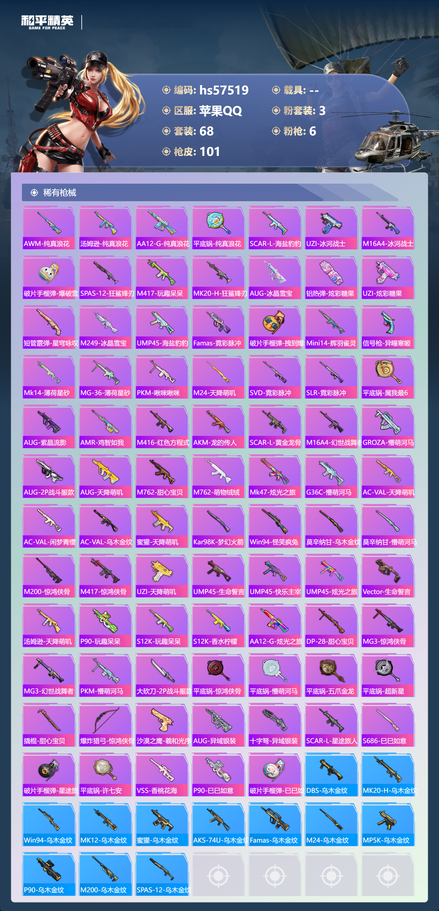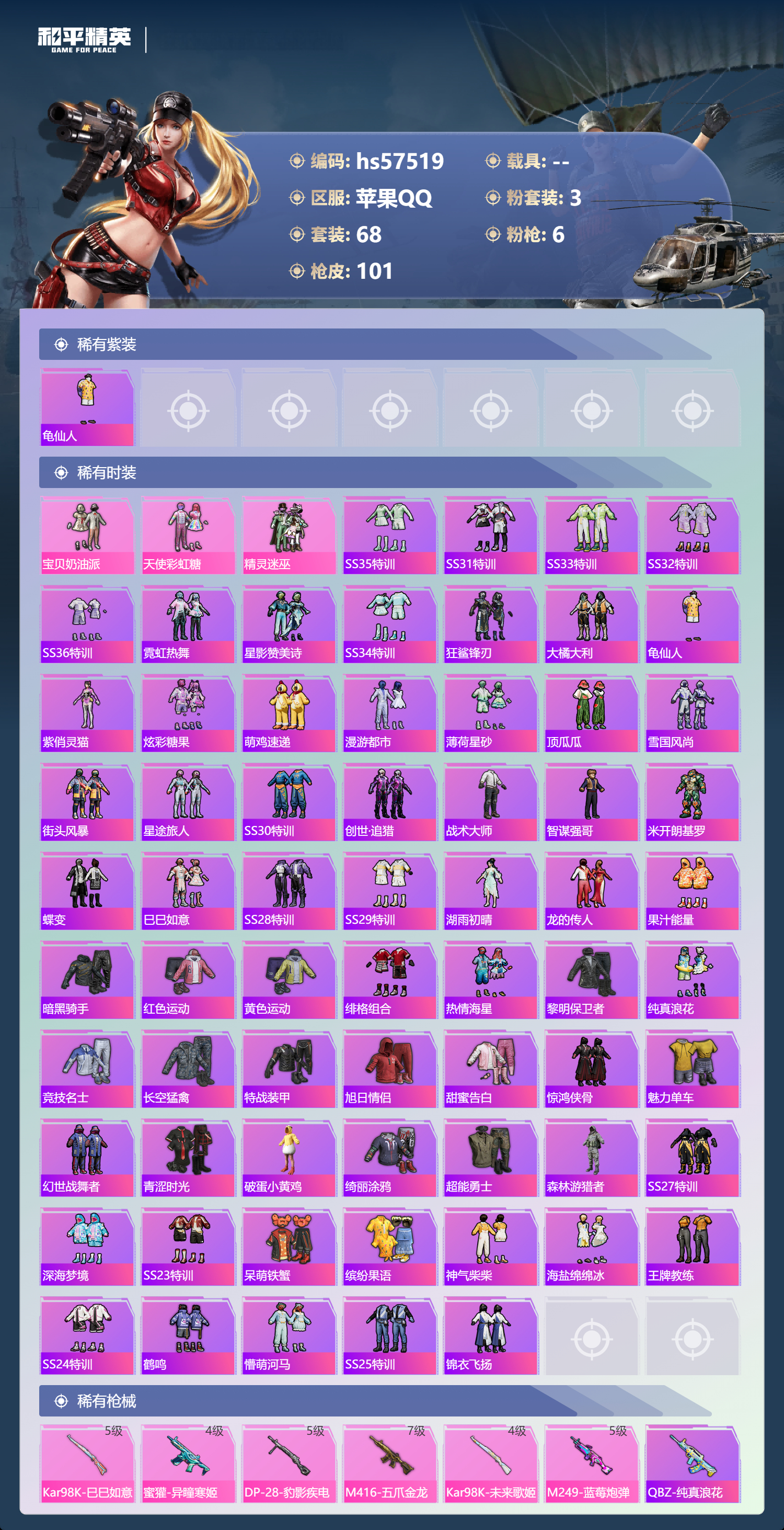 0载具-68套装-101呛皮-hs57519 苹果手q-4王牌印记-3粉装-6特效呛-33586热力值-68套装-101呛皮【3粉装】套装-精灵迷巫套装-天使彩虹糖套装-宝贝奶油派【6特效呛】蜜獾-异瞳寒姬/4级kar98k-未来歌姬/4级m249-蓝莓炮弹/5级kar98k-巳巳如意/5级dp-28-豹影疾电/5级m416-五爪金龙/7级【1稀有紫装】龟仙人【68稀有时装】宝贝奶油派天使彩虹糖ss3