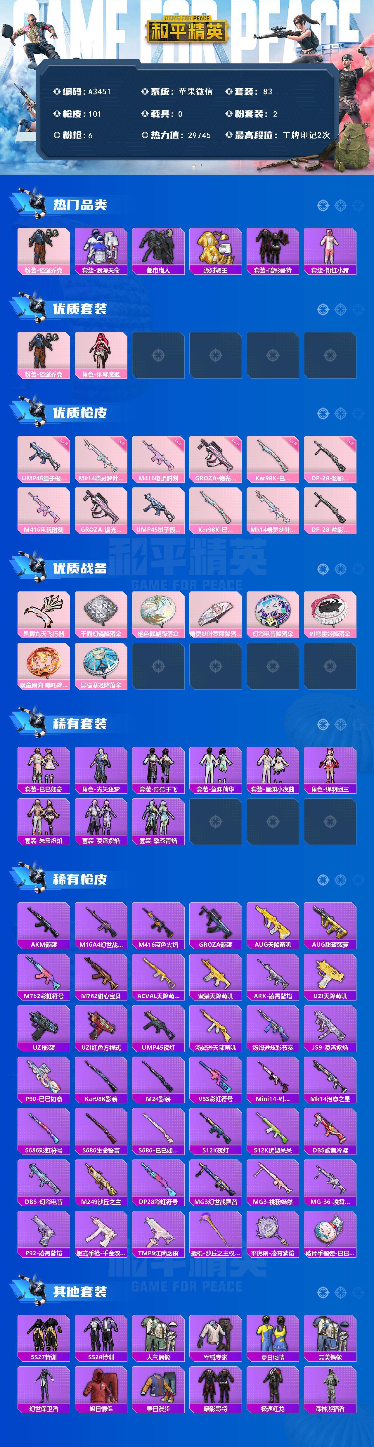 [15471330]苹果 【素材号 怪诞乔克/浪漫天命/都市猎人/派对舞王/暗影哥特/m416-电玩时刻五级】微信-2粉装-6特效呛-0载具-1粉色飞行器-29745热力值-2王牌印记-83套装-101呛皮 【热门品类】:粉装-怪诞乔克,套装-浪漫天命,套装-都市猎人,套装-派对舞王,套装-暗影哥特,套装-粉红小猪 【粉色套装】:粉装-怪诞乔克,角色-绯穹魔姬 【粉色呛皮等级】:m416-电玩时刻五级,groza-镜光银凌五级,ump45-量子极限五级,kar98k-巳巳如意五级,mk14-精灵梦叶罗丽五级,dp-28-豹影疾电五级 【粉色呛皮】:m416-电玩时刻,groza-镜光银凌,ump45-量子极限,kar98k-巳巳如意,mk14-精灵梦叶罗丽,dp-28-豹影疾电 【粉色飞行器】:凤舞九天飞行器 【粉色降落伞】:千面幻镜降落伞,绝色倾城降落伞,精灵梦叶罗丽降落伞,幻彩电音降落伞,绯穹魔姬降落伞,魔童闹海 哪吒降落伞,异瞳寒姬降落伞,炫彩糖果降落伞 【稀有套装】:套装-巳巳如意,角色-光矢逐梦,套装-燕燕于飞,套装-鱼渊荷华,套装-星渊小夜曲,角色-绛羽幽主,套装-朱霞炽焰,套装-凌霄紫焰,套装-擎苍青焰 【稀有呛皮】:akm-影袭,m16a4-幻世战舞者,m416-蓝色火焰,groza-影袭,aug-天降萌叽,aug-甜蜜菠萝,m762-彩虹符号,m762-甜心宝贝,ac-val-天降萌叽,蜜獾-天降萌叽,arx-凌霄紫焰,uzi-天降萌叽,uzi-影袭,uzi-红色方程式,ump45-夜灯,汤姆逊-天降萌叽,汤姆逊-炫彩节奏,js9-凌霄紫焰,p90-巳巳如意,kar98k-影袭,m24-影袭,vss-彩虹符号,mini14-绯穹魔姬,mk14-治愈之星,s686-彩虹符号,s686-生命誓言,s686-巳巳如意,s12k-玩趣呆呆,s12k-夜灯,dbs-歌者泠鸢,dbs-幻彩电音,m249-沙丘之主,dp-28-彩虹符号,mg3-幻世战舞者,mg3-桃粉嫣然,mg-36-凌霄紫焰,p92-凌霄紫焰,蝎式手呛-千金淑猫,tmp-9-江南烟雨,撬棍-沙丘之主权杖,平底锅-凌霄紫焰,破片手留单-巳巳如意 【其他套装】:套装-ss27特训,套装-ss28特训,套装-人气偶像,套装-军械专家,套装-夏日倾情,套装-完美偶像,套装-幻世保卫者,套装