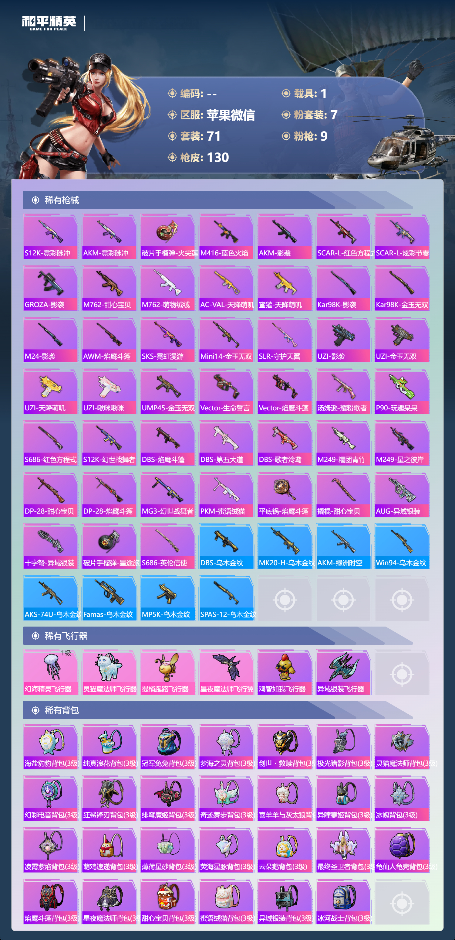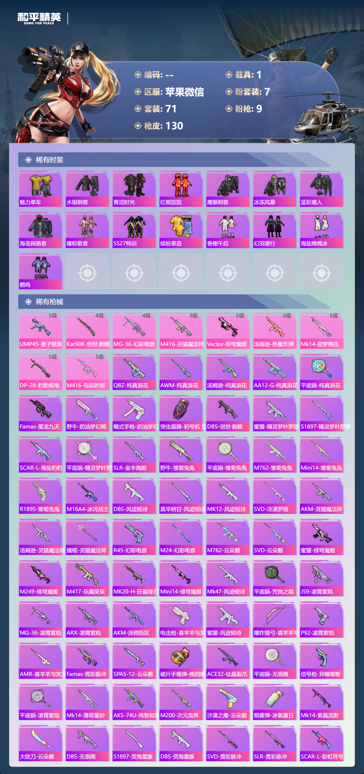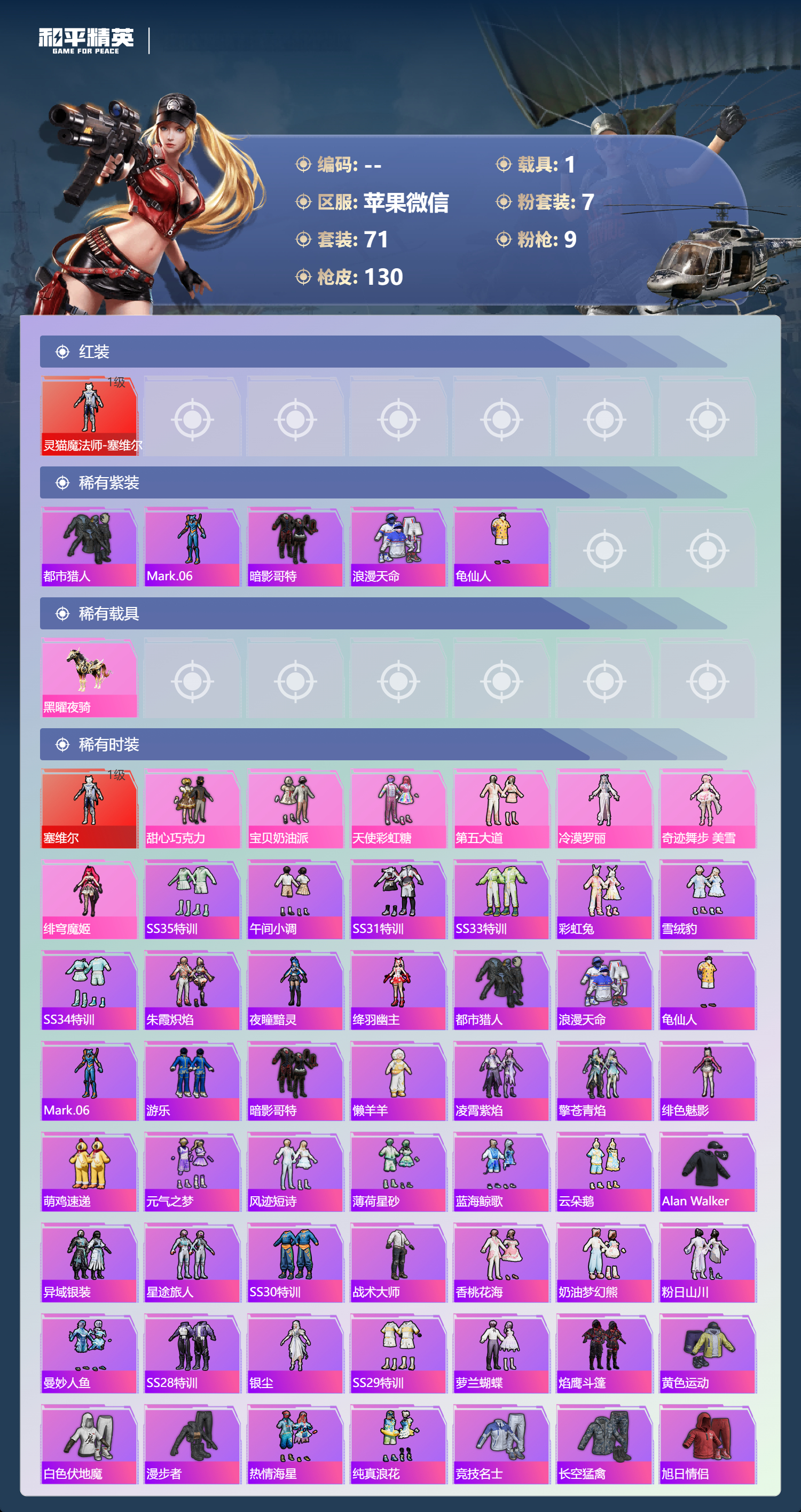 hs54434 苹果微信-5王牌印记-1红装-7粉装-9特效呛-1载具-44066热力值-71套装-130呛皮-3卓越印记-2传奇印记【1红装】灵猫魔法师-塞维尔/1级【7粉装】角色-奇迹舞步 美雪套装-宝贝奶油派套装-甜心巧克力套装-天使彩虹糖角色-冷漠罗丽套装-第五大道角色-绯穹魔姬【9特效呛】m416-电玩时刻/5级mg-36-幻彩电音/4级dp-28-豹影疾电/5级