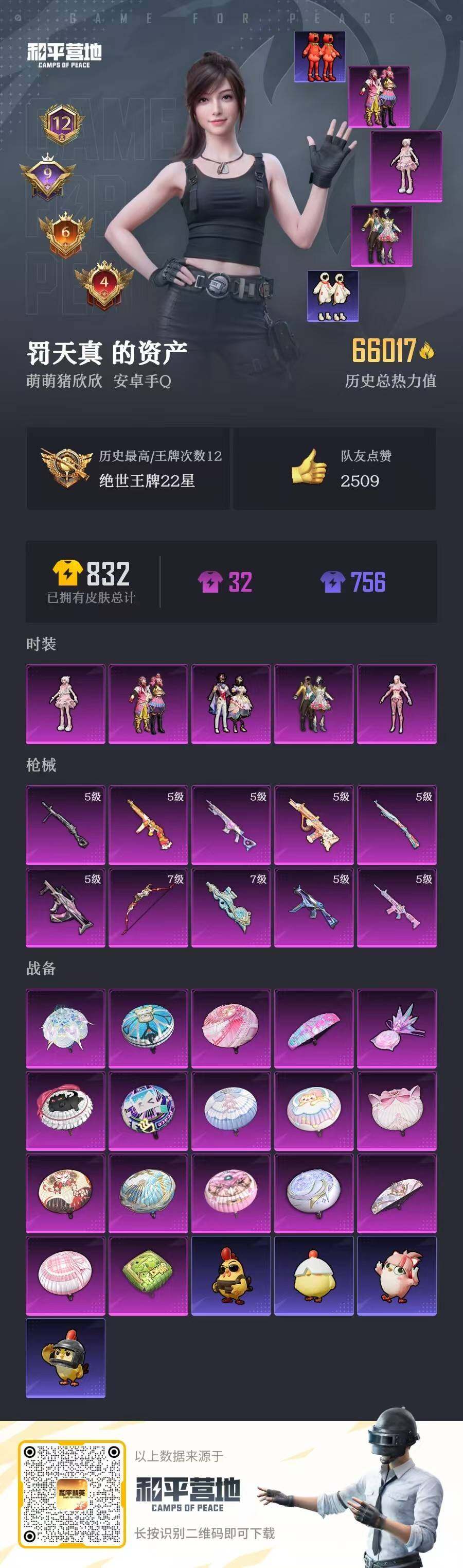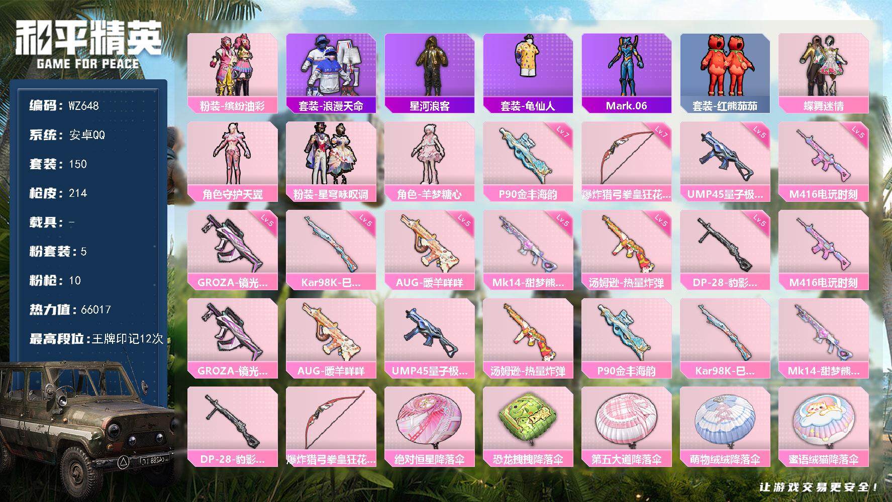 [15139046]安卓 手q-5粉装-10特效呛-0载具-1粉色飞行器-66017热力值-12王牌印记-150套装-214呛皮 【热门品类】:粉装-缤纷油彩,套装-浪漫天命,套装-星河浪客,套装-龟仙人,角色-mark.06,套装-红熊茄茄 【粉色套装】:粉装-蝶舞迷情,粉装-缤纷油彩,角色-守护天翼,粉装-星穹咏叹调,角色-羊梦糖心 【粉色呛皮等级】:m416-电玩时刻五级,groza-镜光银凌五级,aug-暖羊咩咩五级,ump45-量子极限五级,汤姆逊-热量炸弹五级,p90-金丰海韵七级,kar98k-巳巳如意五级,mk14-甜梦熊击五级,dp-28-豹影疾电五级,爆炸猎弓-拳皇·狂花道七级 【粉色呛皮】:m416-电玩时刻,groza-镜光银凌,aug-暖羊咩咩,ump45-量子极限,汤姆逊-热量炸弹,p90-金丰海韵,kar98k-巳巳如意,mk14-甜梦熊击,dp-28-豹影疾电,爆炸猎弓-拳皇·狂花道 【粉色降落伞】:绝对恒星降落伞,恐龙拽拽降落伞,第五大道降落伞,萌物绒绒降落伞,蜜语绒猫降落伞,精灵梦叶罗丽降落伞,鸢尾晶梦降落伞,守护天翼降落伞,金丰海韵降落伞,拳皇·狂花道降落伞,千金淑猫降落伞,幻彩电音降落伞,绯穹魔姬降落伞,无垠阁降落伞,异瞳寒姬降落伞 【稀有套装】:套装-龟仙人,套装-巳巳如意,套装-乐游熊熊,套装-雏菊兔兔,套装-萝兰蝴蝶,套装-小熊娃娃,套装-先驱飞行员,套装-糖糖葫芦,套装-青团波波,套装-棉花软糖,角色-摩登魅猫,套装-燕燕于飞,套装-鱼渊荷华,玩偶服-小狗蛇点点,套装-白辉玉蕊,套装-新风雅兰,套装-粉恋花,套装-紫幽梦,套装-蓝冰羽,套装-星影赞美诗,套装-极速光影,套装-彩虹兔,套装-云朵鹅,套装-雪绒豹,角色-夜瞳黯灵,套装-朱霞炽焰,套装-凌霄紫焰,套装-擎苍青焰,角色-绯色魅影,角色-紫俏灵猫,套装-炫彩糖果 【稀有呛皮】:aug-冰晶雪宝,m16a4-红色方程式,m16a4-蓝色火焰,scar-l-夜灯,scar-l-红色方程式,scar-l-小狗蛇点点,scar-l-冷漠罗丽,m416-糯团青竹,groza-荧海星豚,aug-天降萌叽,aug-耀粉歌者,aug-绝对恒星,m762-天降萌叽,m762-第五大道,m762-云朵鹅,g36c-镜域双华,g36c-桃粉嫣然,ac-val-快