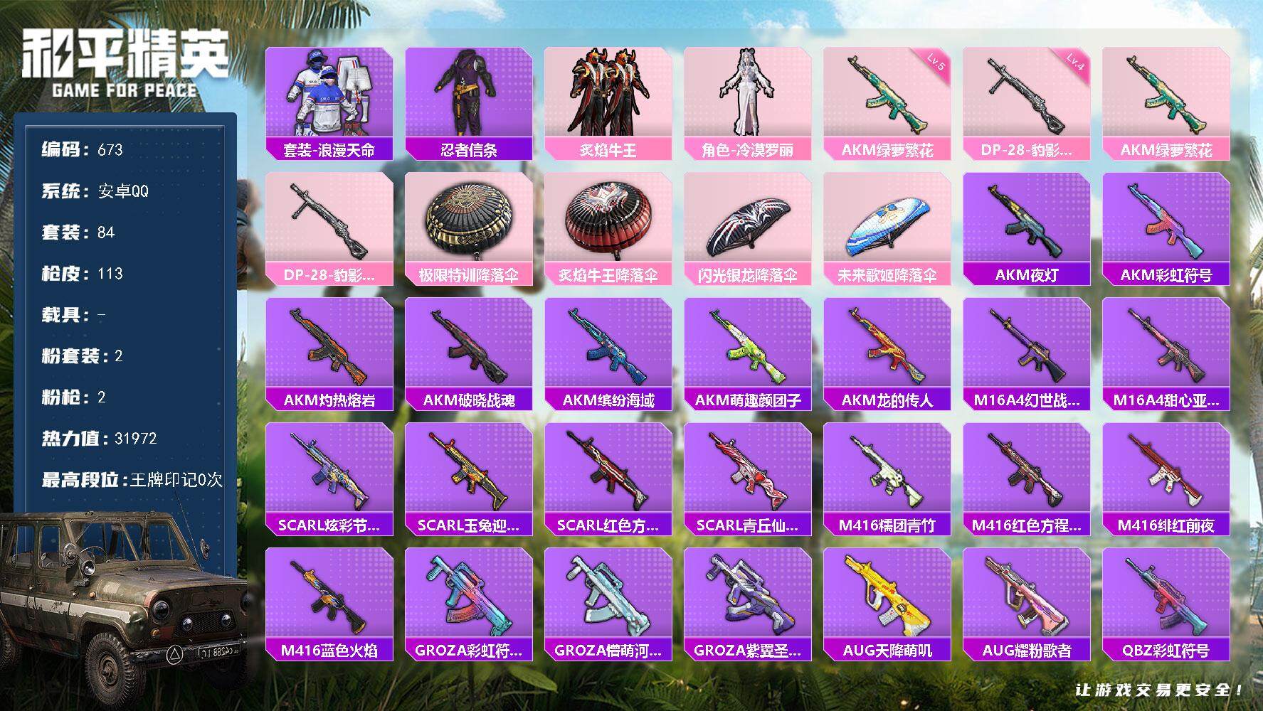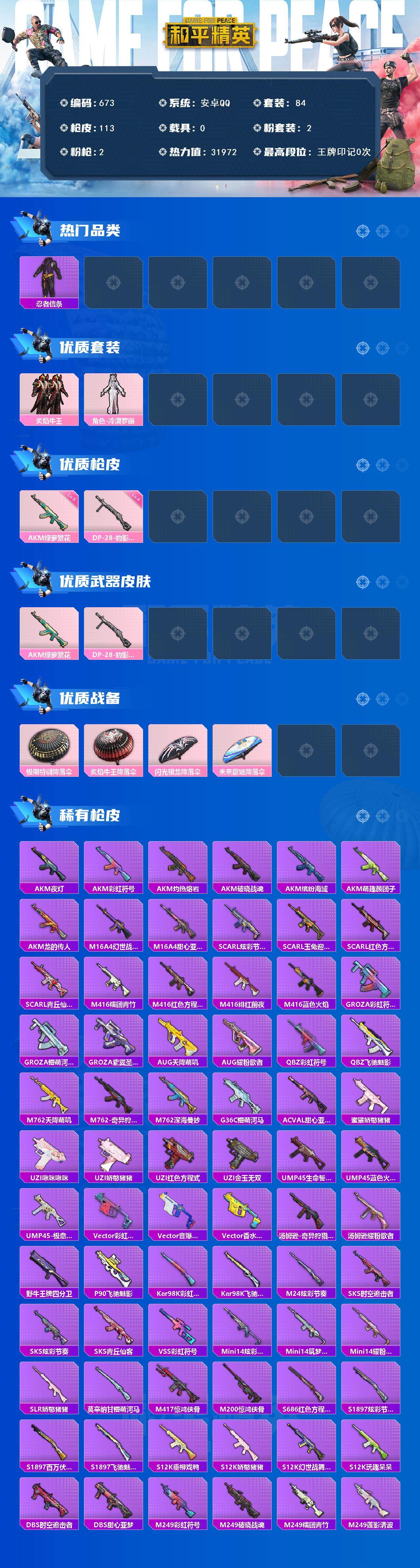 [15141510]安卓 手q-2粉装-2特效呛-0载具-0粉色飞行器-31972热力值-1王牌印记-84套装-113呛皮 【热门品类】:套装-浪漫天命,套装-忍者信条 【粉色套装】:粉装-炙焰牛王,角色-冷漠罗丽 【粉色呛皮等级】:akm-绿萝繁花五级,dp-28-豹影疾电四级 【粉色呛皮】:akm-绿萝繁花,dp-28-豹影疾电 【粉色降落伞】:极限特训降落伞,炙焰牛王降落伞,闪光银龙降落伞,未来歌姬降落伞 【稀有呛皮】:akm-夜灯,akm-彩虹符号,akm-灼热熔岩,akm-破晓战魂,akm-缤纷海域,akm-萌趣颜团子,akm-龙的传人,m16a4-幻世战舞者,m16a4-甜心亚梦,scar-l-炫彩节奏,scar-l-玉兔迎春,scar-l-红色方程式,scar-l-青丘仙客,m416-糯团青竹,m416-红色方程式,m416-绯红前夜,m416-蓝色火焰,groza-彩虹符号,groza-懵萌河马,groza-紫翼圣骑,aug-天降萌叽,aug-耀粉歌者,q-彩虹符号,q-飞驰魅影,m762-天降萌叽,m762-奇异狩猎者,m762-深海曼妙,g36c-懵萌河马,ac-val-甜心亚梦,蜜獾-娇憨猪猪,uzi-啾咪啾咪,uzi-娇憨猪猪,uzi-红色方程式,uzi-金玉无双,ump45-生命誓言,ump45-蓝色火焰,ump45-极意拳锋,vect-彩虹符号,vect-音爆索尼克,vect-香水柠檬,汤姆逊-奇异狩猎者,汤姆逊-耀粉歌者,野牛-王牌四分卫,p90-飞驰魅影,kar98k-彩虹符号,kar98k-飞驰魅影,m24-炫彩节奏,sks-时空追击者,sks-炫彩节奏,sks-青丘仙客,vss-彩虹符号,mini14-炫彩节奏,mini14-筑梦精灵,mini14-耀粉歌者,slr-娇憨猪猪,莫辛纳甘-懵萌河马,m417-惊鸿侠骨,m200-惊鸿侠骨,s686-红色方程式,s1897-炫彩节奏,s1897-百万伏特,s1897-飞驰魅影,s12k-玩趣呆呆,s12k-垂柳戏鸭,s12k-娇憨猪猪,s12k-幻世战舞者,dbs-时空追击者,dbs-甜心亚梦,m249-彩虹符号,m249-破晓战魂,m249-糯团青竹,m249-莲影清波,dp-28-彩虹符号,dp-28-甜心亚梦,dp-28-紫翼圣骑,mg3-幻世战舞者,mg3-惊鸿侠骨,