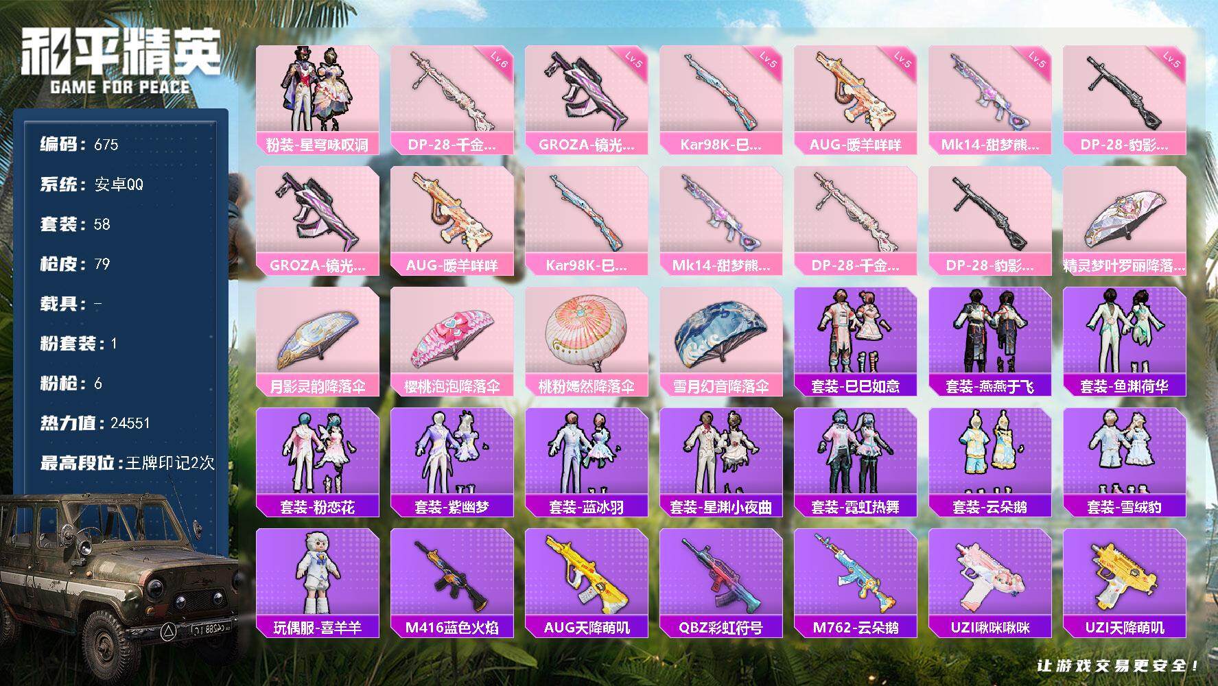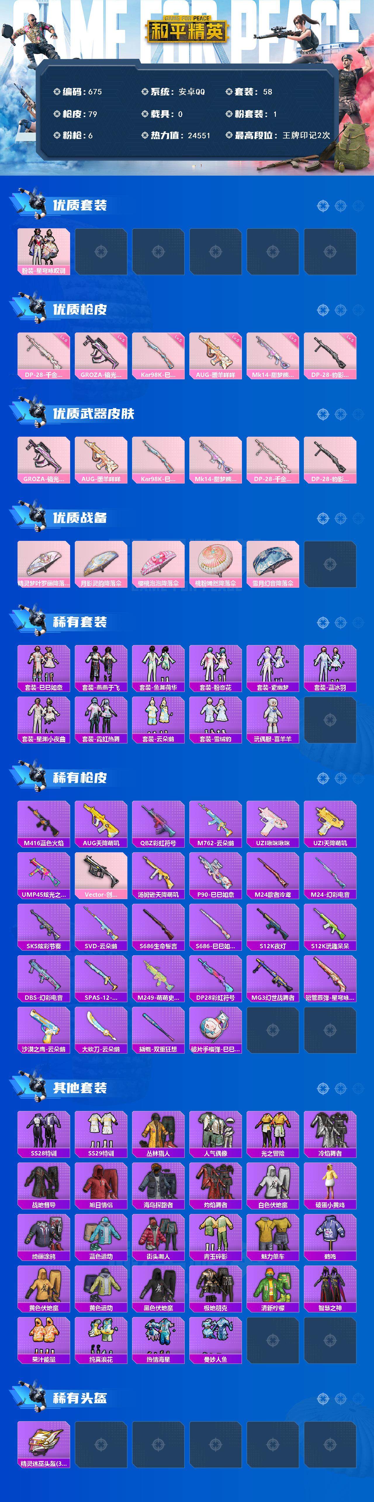 [15142392]安卓 手q-1粉装-6特效呛-0载具-0粉色飞行器-24551热力值-2王牌印记-58套装-79呛皮 【粉色套装】:粉装-星穹咏叹调 【粉色呛皮等级】:groza-镜光银凌五级,aug-暖羊咩咩五级,kar98k-巳巳如意五级,mk14-甜梦熊击五级,dp-28-千金淑猫六级,dp-28-豹影疾电五级 【粉色呛皮】:groza-镜光银凌,aug-暖羊咩咩,kar98k-巳巳如意,mk14-甜梦熊击,dp-28-千金淑猫,dp-28-豹影疾电 【粉色降落伞】:精灵梦叶罗丽降落伞,月影灵韵降落伞,樱桃泡泡降落伞,桃粉嫣然降落伞,雪月幻音降落伞 【稀有套装】:套装-巳巳如意,套装-燕燕于飞,套装-鱼渊荷华,套装-粉恋花,套装-紫幽梦,套装-蓝冰羽,套装-星渊小夜曲,套装-霓虹热舞,套装-云朵鹅,套装-雪绒豹,玩偶服-喜羊羊 【稀有呛皮】:m416-蓝色火焰,aug-天降萌叽,q-彩虹符号,m762-云朵鹅,uzi-啾咪啾咪,uzi-天降萌叽,ump45-炫光之旅,vect-创世·救赎,汤姆逊-天降萌叽,p90-巳巳如意,m24-歌者泠鸢,m24-幻彩电音,sks-炫彩节奏,svd-云朵鹅,s686-生命誓言,s686-巳巳如意,s12k-玩趣呆呆,s12k-夜灯,dbs-幻彩电音,spas-12-云朵鹅,m249-萌萌史莱姆,dp-28-彩虹符号,mg3-幻世战舞者,短管霰弹-星穹咏叹调,沙墨之鹦-云朵鹅,大砍刀-云朵鹅,撬棍-双重狂想,破片手留单-巳巳如意 【其他套装】:套装-ss28特训,套装-ss29特训,套装-丛林猎人,套装-人气偶像,套装-光之冒险,套装-冷焰舞者,套装-战地督导,套装-旭日情侣,套装-海岛探路者,套装-灼焰舞者,套装-白色伏地魔,套装-破蛋小黄鸡,套装-绮丽涂鸦,套装-蓝色运动,套装-街头潮人,套装-青玉碎影,套装-魅力单车,套装-鹤鸣,套装-黄色伏地魔,套装-黄色运动,套装-黑色伏地魔,套装-极地朋克,套装-清新柠檬,套装-智慧之神,套装-果汁能量,套装-纯真浪花,套装-热情海星,套装-曼妙人鱼 【稀有头盔】:精灵迷巫头盔3级 【稀有背包】:深海小丑鱼背包3级 【营地id】:950072597