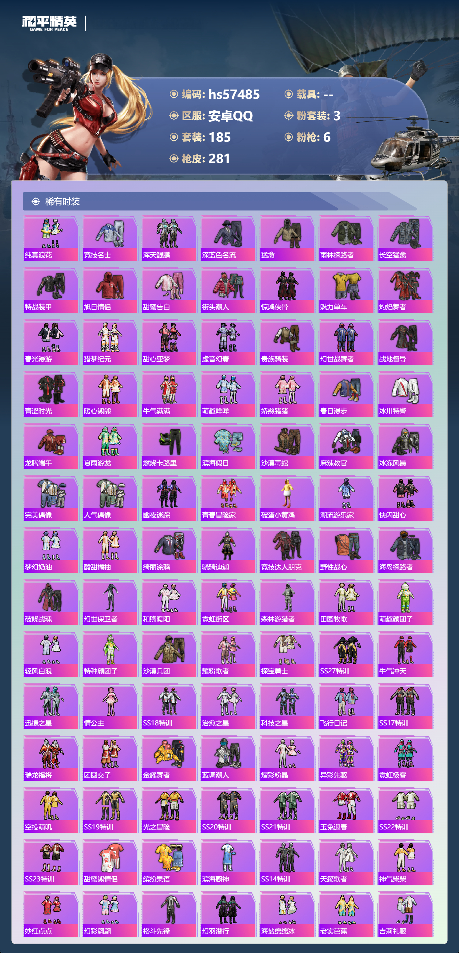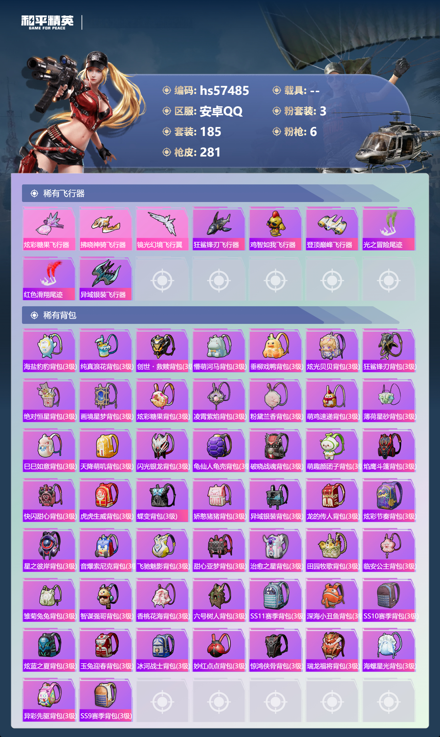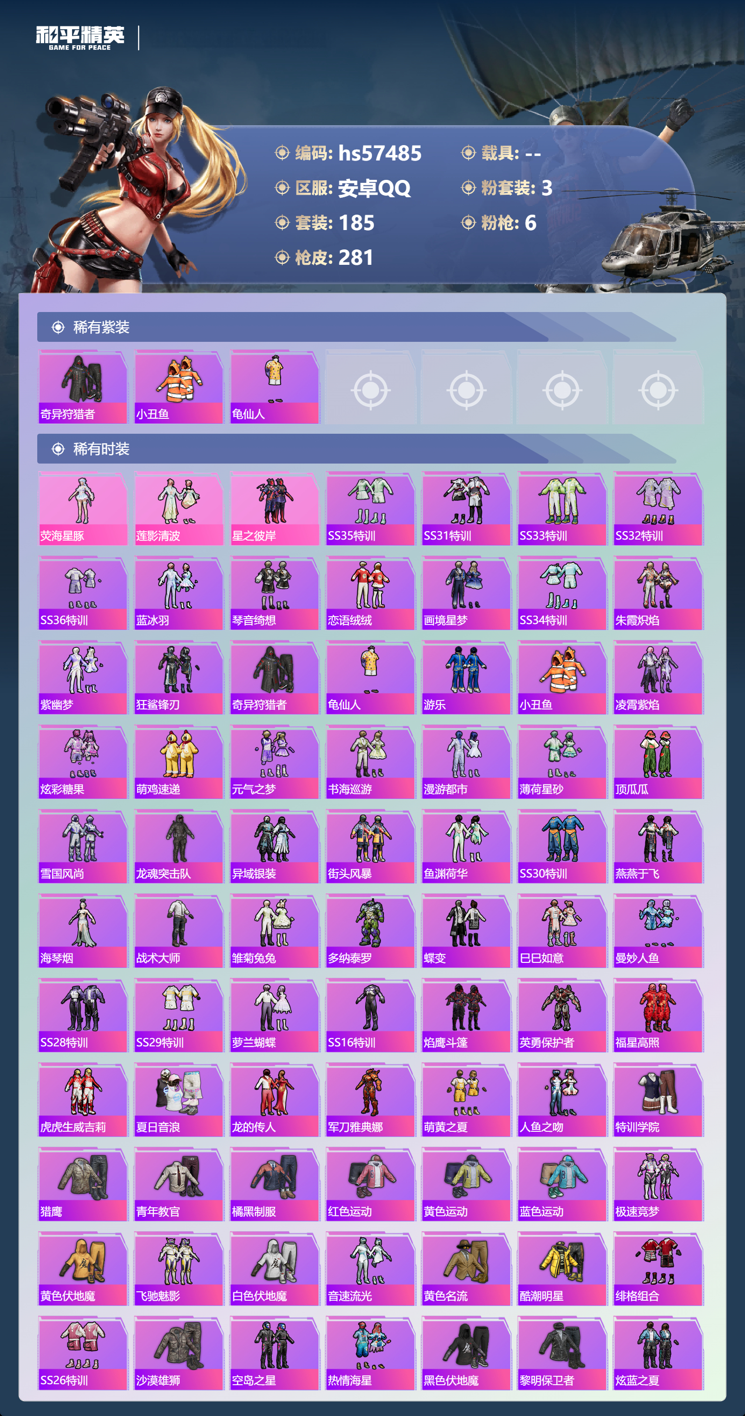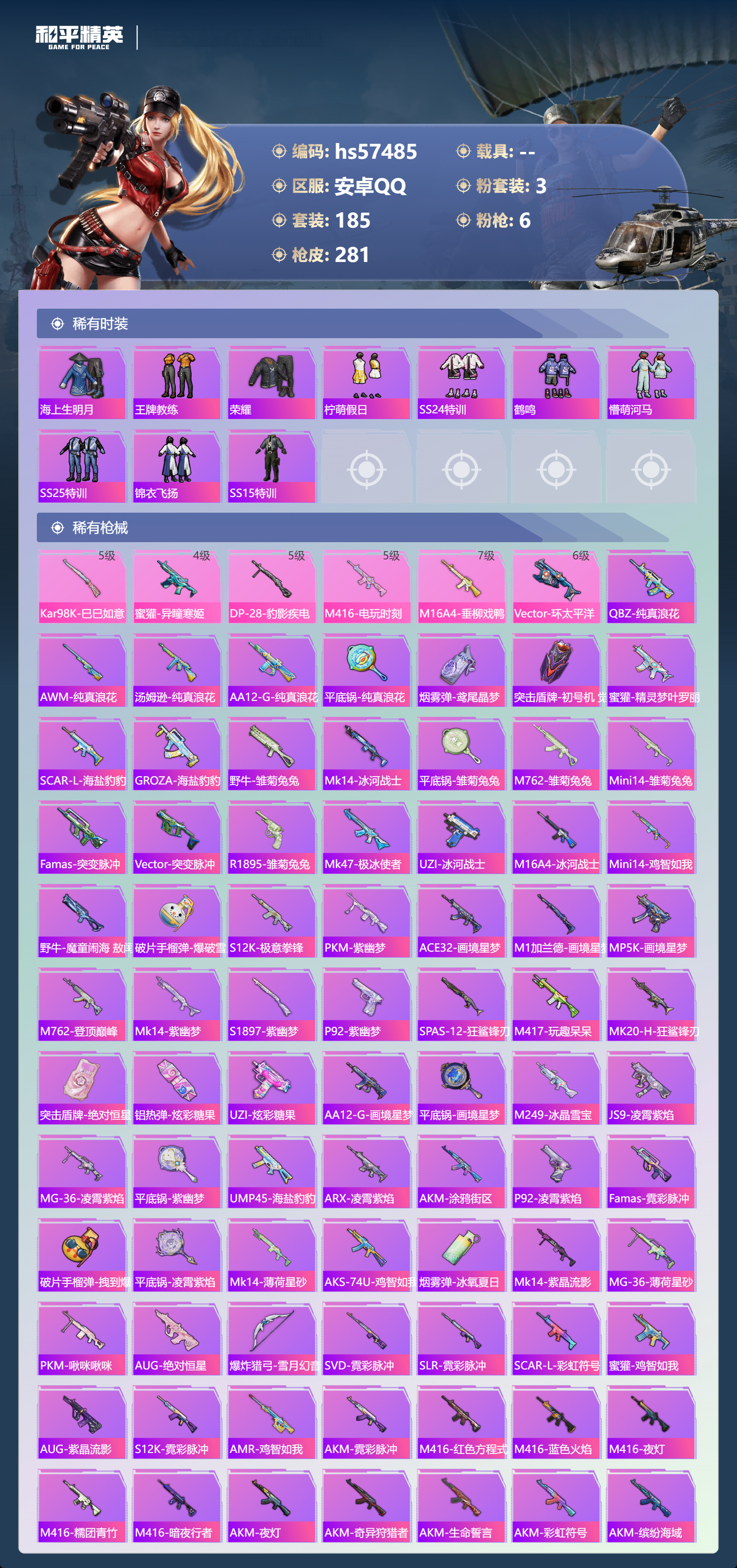 0载具-185套装-281呛皮-hs57485 安卓手q-13王牌印记-3粉装-6特效呛-80460热力值-185套装-281呛皮-2卓越印记-2传奇印记【3粉装】套装-星之彼岸套装-莲影清波角色-荧海星豚【6特效呛】dp-28-豹影疾电/5级m16a4-垂柳戏鸭/7级蜜獾-异瞳寒姬/4级m416-电玩时刻/5级vect-环太平洋/6级kar98k-巳巳如意/5级【3稀有紫装】奇异狩猎者小丑鱼龟仙人