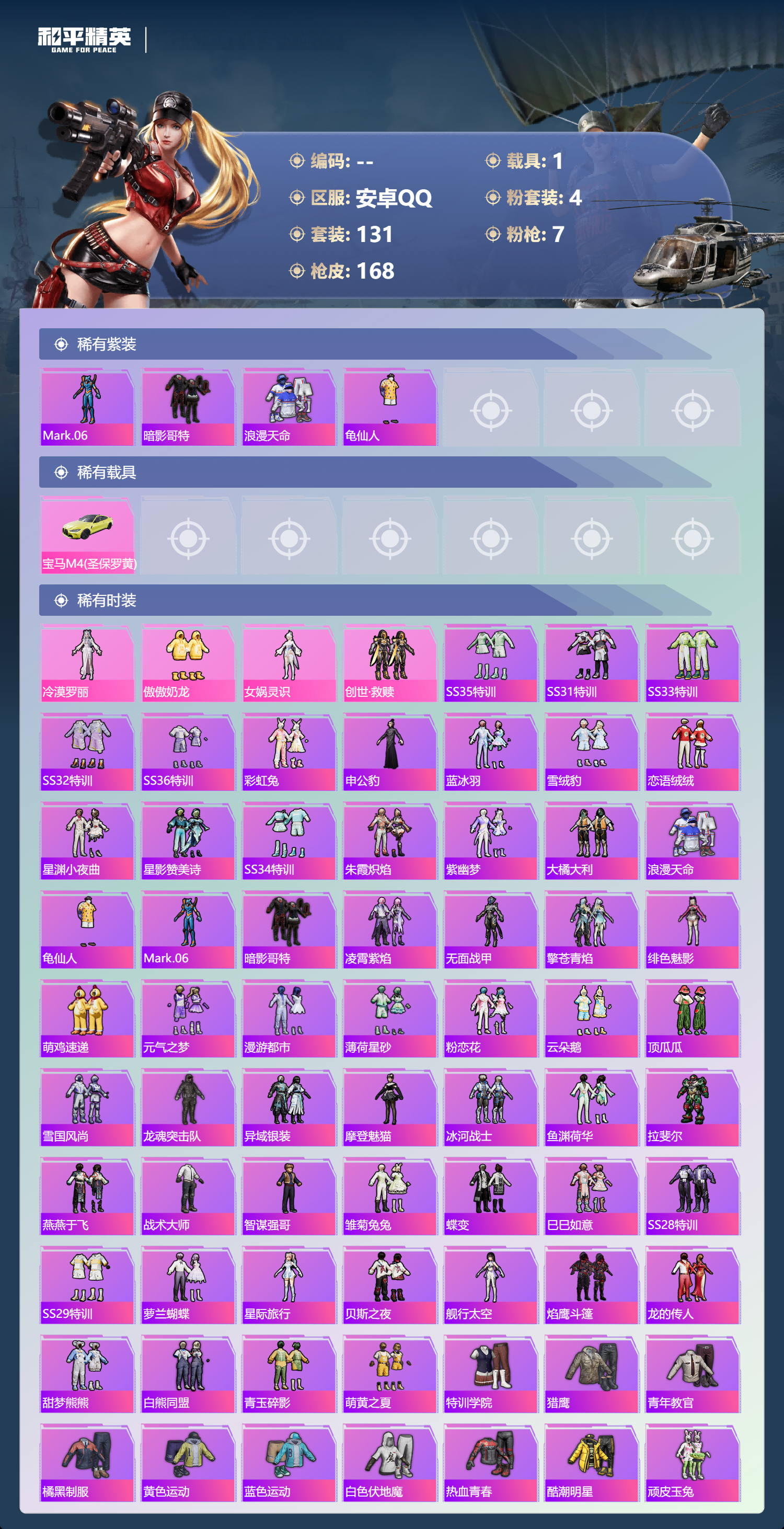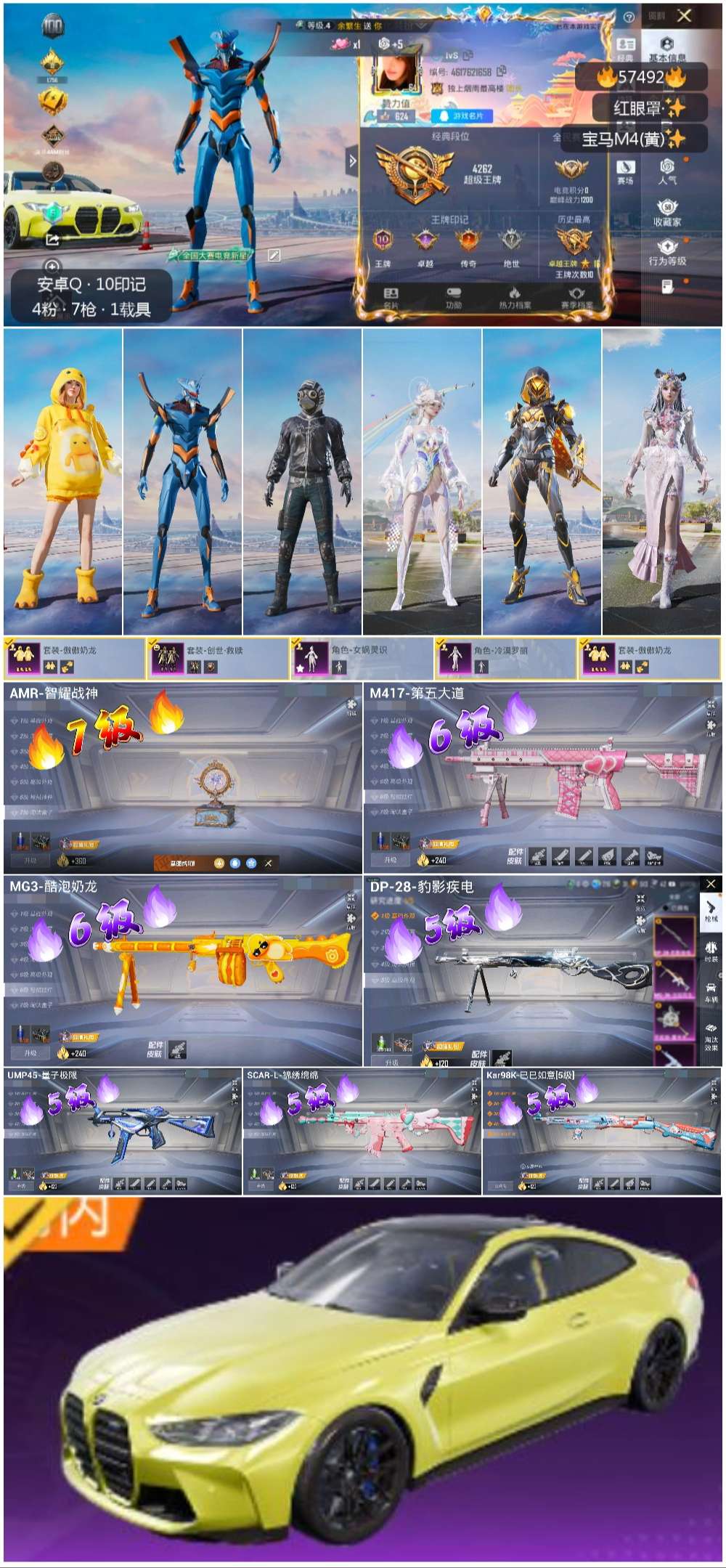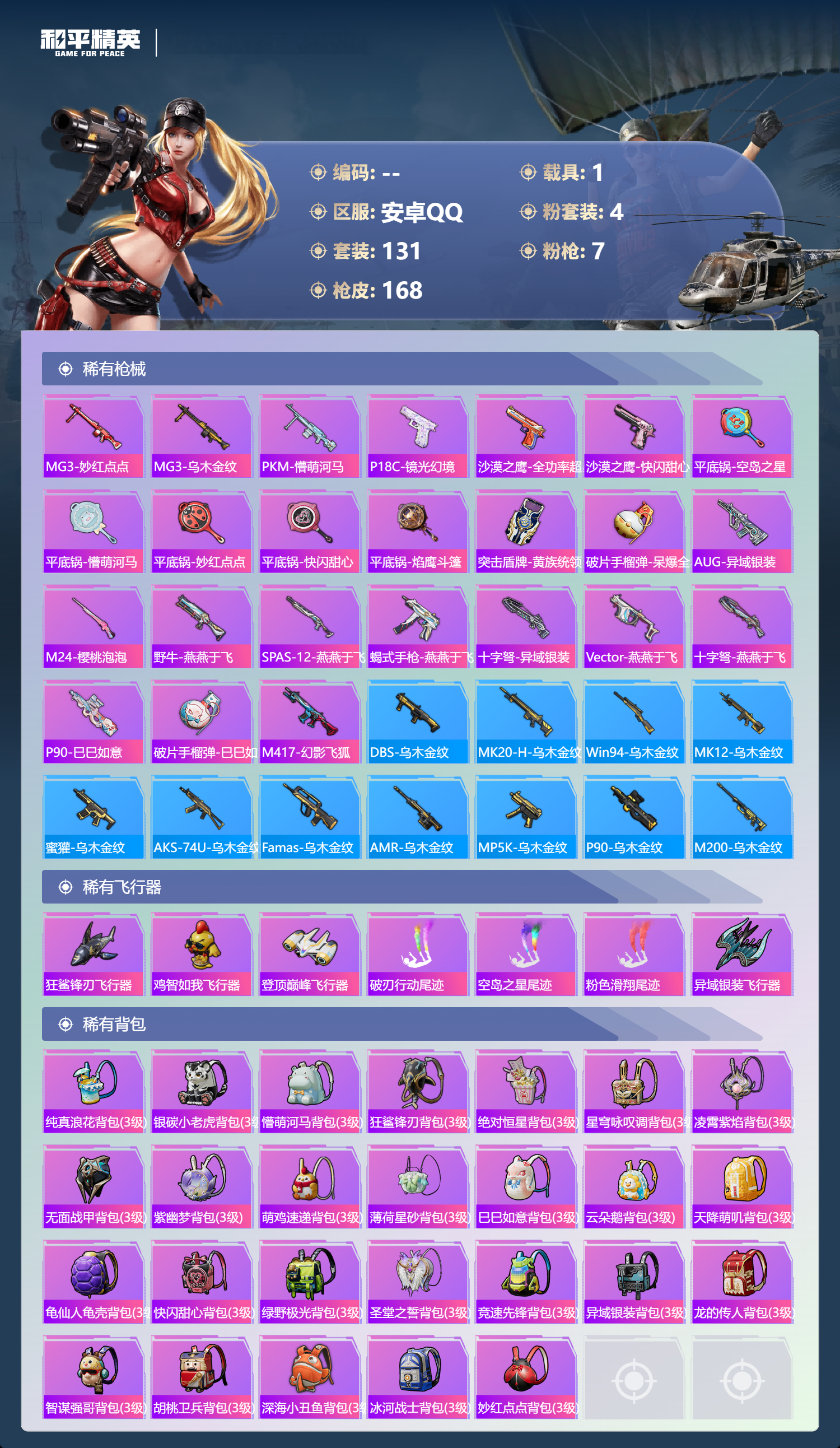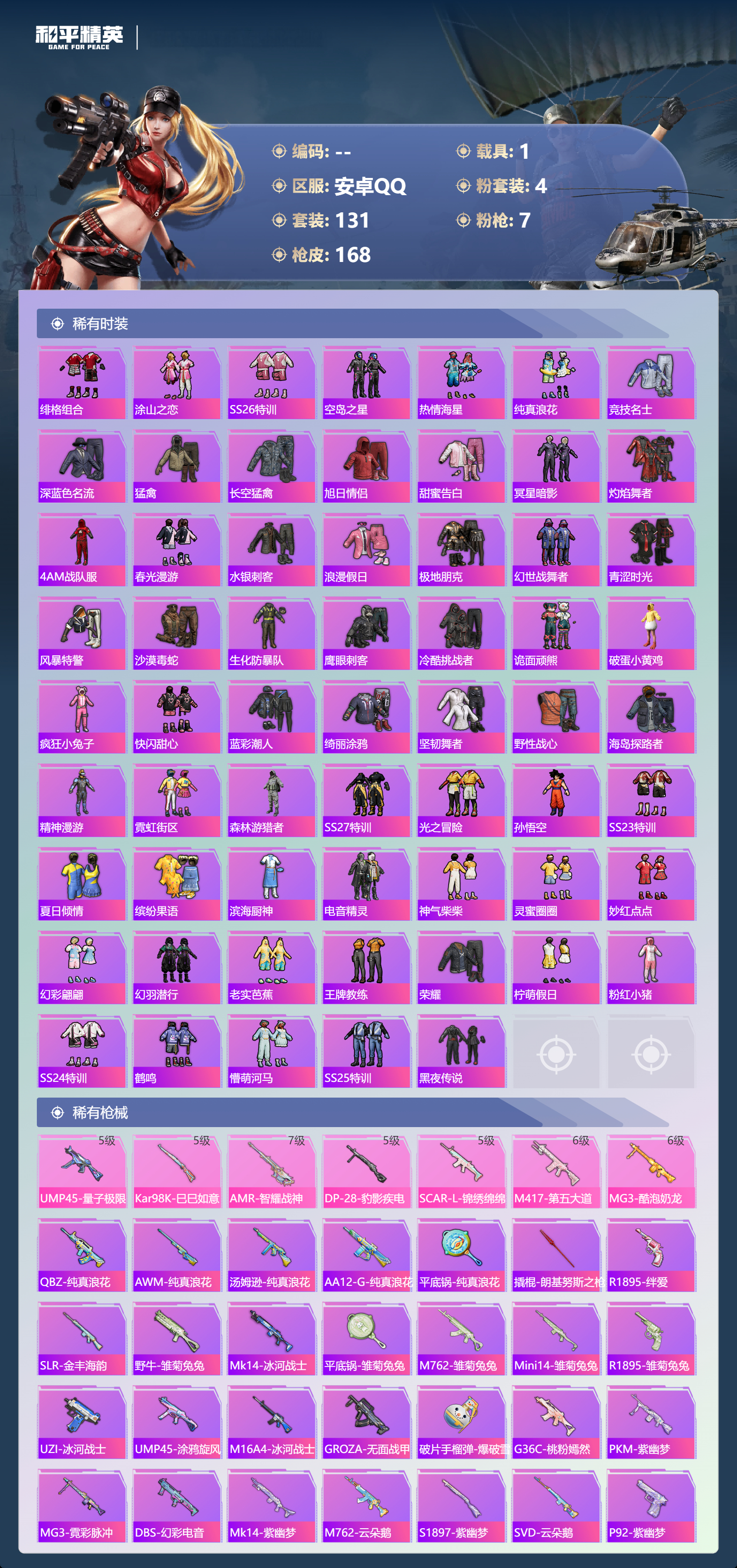 2392124安卓手q-10王牌印记-4粉装-7特效呛-1载具-50862热力值-131套装-168呛皮-5卓越印记-2传奇印记 【4粉装】角色-女娲灵识套装-傲傲奶龙角色-冷漠罗丽套装-创世·救赎 【7特效呛】dp-28-豹影疾电/5级mg3-酷泡奶龙/6级scar-l-锦绣绵绵/5级kar98k-巳巳如意/5级amr-智耀战神/7级m417-第五大道/6级ump45