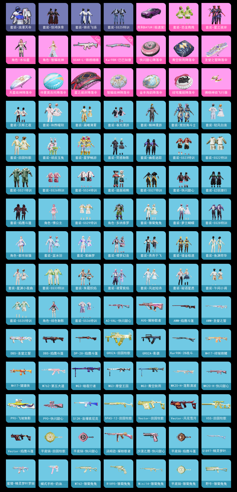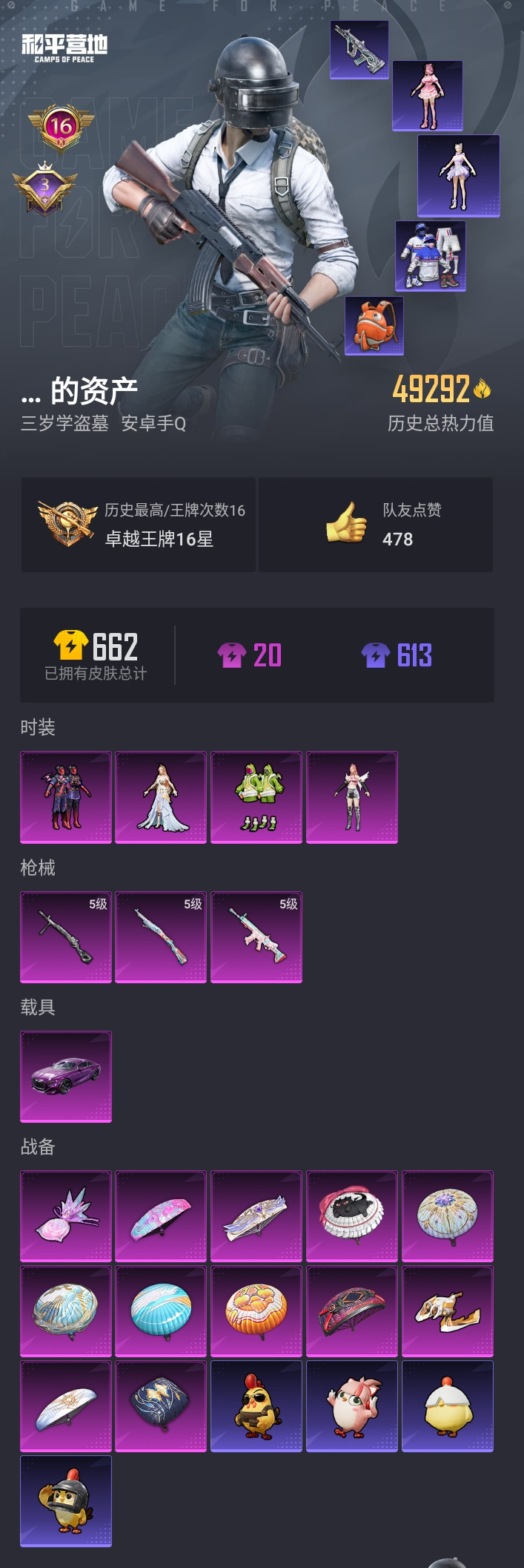 【和平精英】【lyhp20104】4粉装,3特效呛,1载具,历史最高段位:卓越王牌16星 王牌印记16次 热力值:49292,128套装,175呛械,230装备,111战备;套装:套装-星之彼岸,套装-恐龙拽拽,角色-水仙星,角色-智耀战神,套装-特训学院,套装-猎鹰,套装-青年教官,套装-橘黑制服,套装-红色运动,套装-黄色运动,套装-蓝色运动,套装-黄色伏地魔,套装-白色伏地魔,套装-黑色伏地魔,套装-竞技名士,套装-深蓝色名流,套装-酒红色名流,套装-湖蓝色名流,套装-黄色名流,套装-猛禽,套装-长空猛禽,套装-海岛探路者,套装-旭日情侣,套装-冷焰舞者,套装-灼焰舞者,套装-浪漫天命,套装-春日漫步,套装-龙腾端午,套装-街头潮人,套装-暗金炫舞,套装-蓝彩潮人,套装-魅力单车,套装-荣耀,套装-热血青春,套装-青涩时光,套装-缤纷果语,套装-龙魂突击队,套装-冰川特警,套装-元素星魂,套装-极速红龙,套装-麻辣教官,套装-破蛋小黄鸡,套装-疯狂小兔子,套装-精神漫游,套装-霓虹街区,套装-萌黄之夏,套装-顽皮玉兔,套装-白糯汤圆,套装-诡面顽熊,套装-战术大师,套装-飞行日记,套装-竞技角斗士,套装-吉莉礼服,套装-星梦畅游,套装-ss21特训,套装-玉兔迎春,套装-ss22特训,套装-和煦暖阳,套装-田园牧歌,套装-轻风白浪,套装-光之冒险,套装-绯格组合,套装-ss23特训,套装-王牌教练,套装-柠萌假日,套装-ss24特训,套装-荧惑魅影,套装-龟仙人,套装-涂山之恋,套装-ss25特训,套装-惊鸿侠骨,套装-锦衣飞扬,套装-晨曦薄雾,套装-香桃花海,套装-龙的传人,套装-冰河战士,套装-ss26特训,套装-快闪甜心,套装-春光漫游,套装-漫游都市,套装-空岛之星,套装-贝斯之夜,套装-焰鹰斗篷,套装-幽夜迷踪,套装-幻羽潜行,套装-ss27特训,套装-老实芭蕉,套装-ss28特训,角色-多纳泰罗,角色-情公主,套装-街头风暴,套装-海盐绵绵冰,套装-蝶变,套装-ss29特训,套装-雏菊兔兔,套装-萝兰蝴蝶,角色-绯色魅影,套装-异域银装,角色-都市丽猫,套装-星途旅人,角色-怀庆长公主,套装-ss30特训,套装-镭金极速,套装-ss31特训,套装-鱼渊荷华,套装-燕燕于飞,套装-智谋强哥,套装-紫幽梦,套装-ss33特训,套装-巳巳如意,套装-ss32特训,套装-樱梦幻音,套装-蓝冰羽,套装-顶瓜瓜,套装-大橘大利,套装-星渊小夜曲,套装-元气之梦,套装-ss34特训,套装-朱霞炽焰,套装-凌霄紫焰,套装-薄荷星砂,套装-ss35特训,套装-午间小调,套装-秘语星愿,套装-风迹短诗,套装-ss36特训,套装-雪国风尚,套装-萌鸡速递;呛皮:ac-val-乌木金纹,ac-val-天降萌叽,ac-val-快闪甜心,蜜獾-天降萌叽,蜜獾-精灵梦叶罗丽,蜜獾-风迹短诗,蜜獾-乌木金纹,akm-破晓战魂,akm-霓虹街区,akm-涂鸦街区,akm-彩虹符号,akm-龙的传人,akm-棋盘冕主,akm-霓彩脉冲,aug-耀粉歌者,aug-天降萌叽,aug-异域银装,aug-紫晶流影,m762-彩虹符号,m762-第五大道,m762-天降萌叽,m762-雏菊兔兔,5级scar-l-锦绣绵绵,scar-l-红色方程式,scar-l-夜灯,scar-l-炫彩节奏,scar-l-玉兔迎春,scar-l-星途旅人,scar-l-海盐豹豹,groza-影袭,groza-田园牧歌,groza-海盐豹豹,m416-蓝色火焰,m416-红色方程式,famas-霓彩脉冲,famas-乌木金纹,mk47-乌木金纹,mk47-风迹短诗,g36c-星穹咏叹调,ace32-冰晶雪宝,m16a4-冰河战士,m16a4-千金淑猫,arx-凌霄紫焰,awm-天降萌叽,awm-圣堂之誓,awm-焰鹰斗篷,m200-惊鸿侠骨,m200-乌木金纹,莫辛纳甘-乌木金纹,莫辛纳甘-镭金极速,莫辛纳甘-风迹短诗,5级kar98k-巳巳如意,kar98k-彩虹符号,kar98k-2b战斗服款,amr-乌木金纹,win94-乌木金纹,m417-惊鸿侠骨,m417-祥瑞锦鲤,m417-玩趣呆呆,m417-猪猪侠,mk20-h-莲影清波,mk20-h-快闪甜心,mk20-h-星途旅人,mk20-h-狂鲨锋刃,mk20-h-乌木金纹,vss-田园牧歌,vss-彩虹符号,vss-香桃花海,mini14-涂山之恋,mini14-香桃花海,mini14-雏菊兔兔,mini14-镭金极速,mk12-风迹短诗,mk12-乌木金纹,sks-炫彩节奏,slr-彩虹符号,slr-霓彩脉冲,mk14-冰河战士,mk14-紫幽梦,野牛-雏菊兔兔,野牛-燕燕于飞,汤姆逊-耀粉歌者,汤姆逊-炫彩节奏,汤姆逊-天降萌叽,p90-飞驰魅影,p90-快闪甜心,p90-玩趣呆呆,p90-巳巳如意,p90-乌木金纹,vect-生命誓言,vect-风花雪月,vect-田园牧歌,vect-焰鹰斗篷,vect-燕燕于飞,aks-74u-鸡智如我,aks-74u-乌木金纹,uzi-天降萌叽,uzi-冰河战士,uzi-啾咪啾咪,uzi-炫彩糖果,js9-凌霄紫焰,mp5k-乌木金纹,ump45-夜灯,ump45-涂山之恋,ump45-海盐豹豹,ump45-绒宝小鹅,spas-12-田园牧歌,spas-12-燕燕于飞,spas-12-狂鲨锋刃,spas-12-乌木金纹,s12k-破晓战魂,s12k-夜灯,s12k-音爆索尼克,s12k-玩趣呆呆,s12k-霓彩脉冲,s686-生命誓言,s686-彩虹符号,s686-千金淑猫,s686-巳巳如意,dbs-彩虹符号,dbs-圣堂之誓,dbs-焰鹰斗篷,dbs-月影灵韵,dbs-风迹短诗,dbs-乌木金纹,s1897-精灵梦叶罗丽,s1897-紫幽梦,s1897-糯团青竹,mg-36-凌霄紫焰,mg-36-薄荷星砂,m249-彩虹符号,m249-萌萌史莱姆,m249-冰晶雪宝,mg3-幻世战舞者,mg3-乌木金纹,mg3-暗夜行者,mg3-青空秋雨,mg3-摩登王国,mg3-惊鸿侠骨,mg3-霓彩脉冲,pkm-啾咪啾咪,pkm-紫幽梦,5级dp-28-豹影疾电,dp-28-焰鹰斗篷,p92-紫幽梦,p92-凌霄紫焰,r1895-雏菊兔兔,r1895-镭金极速,沙墨之鹦-快闪甜心,蝎式手呛-奶油梦幻熊,蝎式手呛-千金淑猫,蝎式手呛-燕燕于飞,平底锅-田园牧歌,平底锅-光之冒险,平底锅-惊鸿侠骨,平底锅-快闪甜心,平底锅-空岛之星,平底锅-焰鹰斗篷,平底锅-雏菊兔兔,平底锅-紫幽梦,平底锅-属我最6,平底锅-凌霄紫焰,撬棍-冷漠罗丽,撬棍-冰晶雪宝,破片手留单-呆爆全场,破片手留单-星途旅人,破片手留单-海盐豹豹,破片手留单-拽到爆炸,破片手留单-巳巳如意,破片手留单