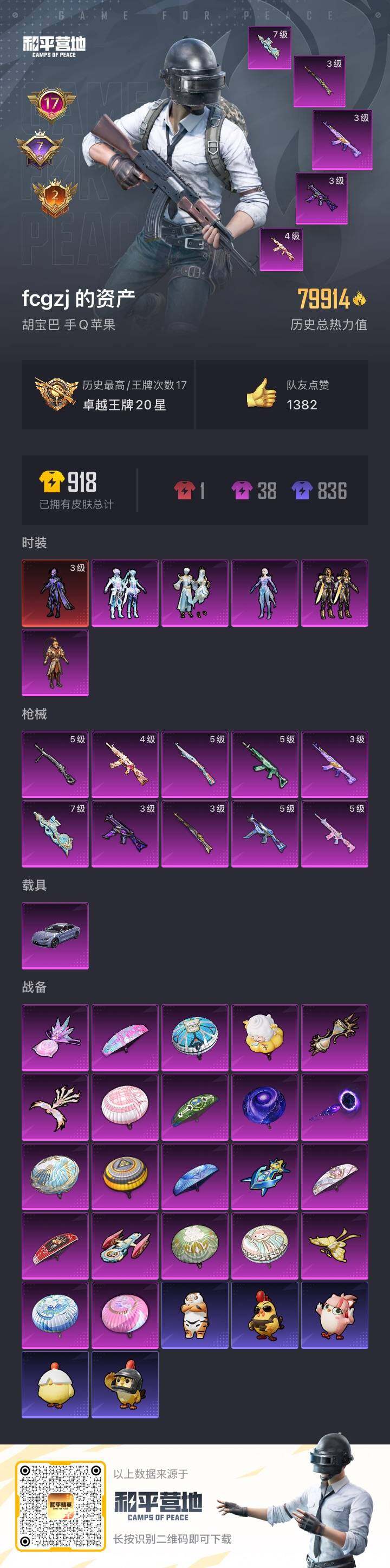 [15183365]苹果 手q-1神装-5粉装-10特效呛-1载具-7粉色飞行器-79914热力值-17王牌印记-150套装-255呛皮 【红色神装等级】:宇宙意志-塞卢姆三级 【红色角色神装】:宇宙意志-塞卢姆 【热门品类】:套装-龟仙人,角色-8号机,角色-mark.06 【粉色套装】:粉装-齐天大圣,套装-创世·救赎,角色-冰域雷影,粉装-金丰海韵,粉装-幻彩电音 【粉色呛皮等级】:akm-魔法神域三级,m416-电玩时刻五级,m762-青锋波束五级,ump45-量子极限五级,ump45-宇宙意志三级,aks-74u-星穹咏叹调四级,p90-金丰海韵七级,kar98k-创世·救赎三级,kar98k-巳巳如意五级,dp-28-豹影疾电五级 【粉色载具】:仰望u7(阿盖尔紫) 【粉色呛皮】:akm-魔法神域,m416-电玩时刻,m762-青锋波束,ump45-量子极限,ump45-宇宙意志,aks-74u-星穹咏叹调,p90-金丰海韵,kar98k-创世·救赎,kar98k-巳巳如意,dp-28-豹影疾电 【粉色飞行器】:庄周梦蝶飞行器,冠军兔兔飞行器,深渊漩涡飞行器,凤舞九天飞行器,时光之吻飞行器 【粉色降落伞】:海渊国主降落伞,百合蜜语降落伞,筑梦精灵降落伞,歌者泠鸢降落伞,第五大道降落伞,闲梦青缨降落伞,精灵梦叶罗丽降落伞,创世·救赎降落伞,星梦奇缘降落伞,金丰海韵降落伞,忍者神龟降落伞,宇宙意志降落伞,喜羊羊与灰太狼降落伞,异瞳寒姬降落伞,炫彩糖果降落伞 【稀有套装】:套装-龟仙人,套装-巳巳如意,角色-甜心蒙太奇,套装-雪国风尚,套装-雏菊兔兔,套装-萝兰蝴蝶,套装-小熊娃娃,套装-糖糖葫芦,套装-青团波波,角色-俏兔智灵,套装-燕燕于飞,套装-鱼渊荷华,套装-雨林猎影,套装-粉恋花,套装-紫幽梦,套装-蓝冰羽,角色-瑰梦爱神,套装-彩虹兔,套装-云朵鹅,套装-雪绒豹,角色-绛羽幽主,套装-朱霞炽焰,套装-凌霄紫焰,套装-擎苍青焰,玩偶服-懒羊羊,角色-紫俏灵猫,套装-炫彩糖果 【稀有呛皮】:aug-冰晶雪宝,akm-彩虹符号,akm-破晓战魂,akm-虎虎生威,akm-霓虹街区,m16a4-幻世战舞者,m16a4-甜心亚梦,m16a4-红色方程式,m16a4-蓝色火焰,scar-l-炫彩节奏,scar-l-玉兔迎春,scar-