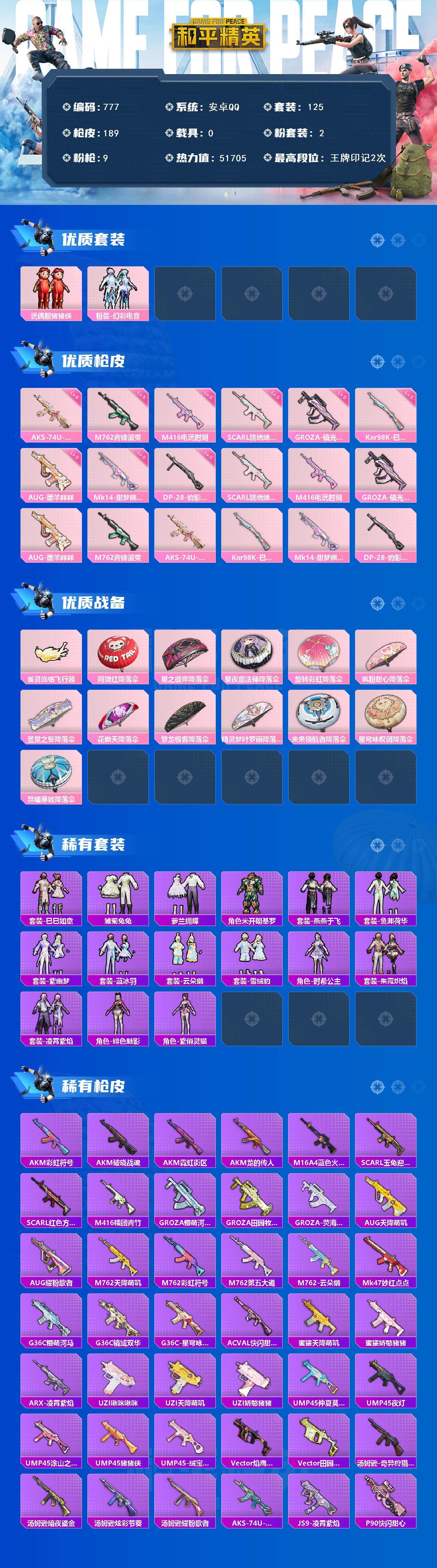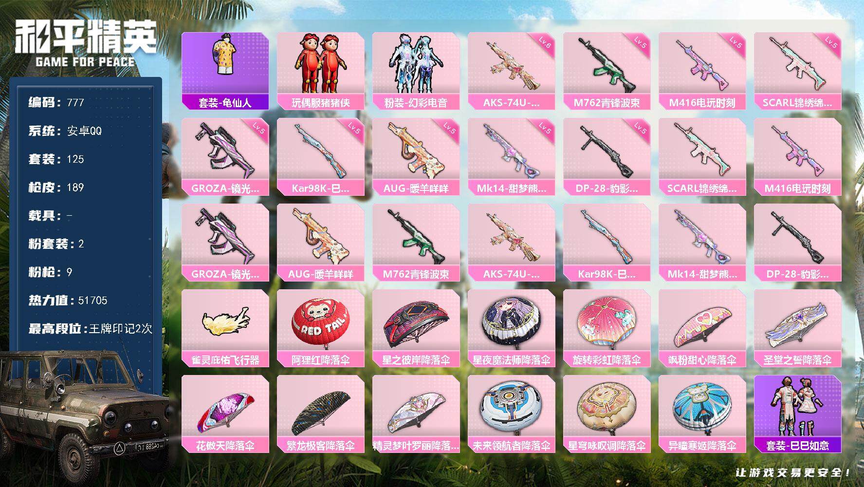 [15237979]安卓 手q-2粉装-9特效呛-0载具-2粉色飞行器-51705热力值-2王牌印记-125套装-189呛皮 【热门品类】:套装-龟仙人 【粉色套装】:玩偶服-猪猪侠,粉装-幻彩电音 【粉色呛皮等级】:scar-l-锦绣绵绵五级,m416-电玩时刻五级,groza-镜光银凌五级,aug-暖羊咩咩五级,m762-青锋波束五级,aks-74u-星穹咏叹调六级,kar98k-巳巳如意五级,mk14-甜梦熊击五级,dp-28-豹影疾电五级 【粉色呛皮】:scar-l-锦绣绵绵,m416-电玩时刻,groza-镜光银凌,aug-暖羊咩咩,m762-青锋波束,aks-74u-星穹咏叹调,kar98k-巳巳如意,mk14-甜梦熊击,dp-28-豹影疾电 【粉色飞行器】:雀灵庇佑飞行器 【粉色降落伞】:阿狸红降落伞,星之彼岸降落伞,星夜魔法师降落伞,旋转彩虹降落伞,飒粉甜心降落伞,圣堂之誓降落伞,花傲天降落伞,繁龙极客降落伞,精灵梦叶罗丽降落伞,未来领航者降落伞,星穹咏叹调降落伞,异瞳寒姬降落伞,炫彩糖果降落伞 【稀有套装】:套装-龟仙人,套装-巳巳如意,套装-雏菊兔兔,套装-萝兰蝴蝶,角色-米开朗基罗,套装-燕燕于飞,套装-鱼渊荷华,套装-紫幽梦,套装-蓝冰羽,套装-云朵鹅,套装-雪绒豹,角色-时希公主,套装-朱霞炽焰,套装-凌霄紫焰,角色-绯色魅影,角色-紫俏灵猫 【稀有呛皮】:aug-冰晶雪宝,akm-彩虹符号,akm-破晓战魂,akm-霓虹街区,akm-龙的传人,m16a4-蓝色火焰,scar-l-玉兔迎春,scar-l-红色方程式,m416-糯团青竹,groza-懵萌河马,groza-田园牧歌,groza-荧海星豚,aug-天降萌叽,aug-耀粉歌者,m762-天降萌叽,m762-彩虹符号,m762-第五大道,m762-云朵鹅,mk47-妙红点点,g36c-镜域双华,g36c-懵萌河马,g36c-星穹咏叹调,ac-val-快闪甜心,蜜獾-天降萌叽,蜜獾-娇憨猪猪,arx-凌霄紫焰,uzi-啾咪啾咪,uzi-天降萌叽,uzi-娇憨猪猪,ump45-仲夏莫吉托,ump45-夜灯,ump45-涂山之恋,ump45-猪猪侠,ump45-绒宝小鹅,vect-焰鹰斗篷,vect-田园牧歌,汤姆逊-奇异狩猎者,汤姆逊-暗夜鎏金,汤姆逊-炫彩节奏