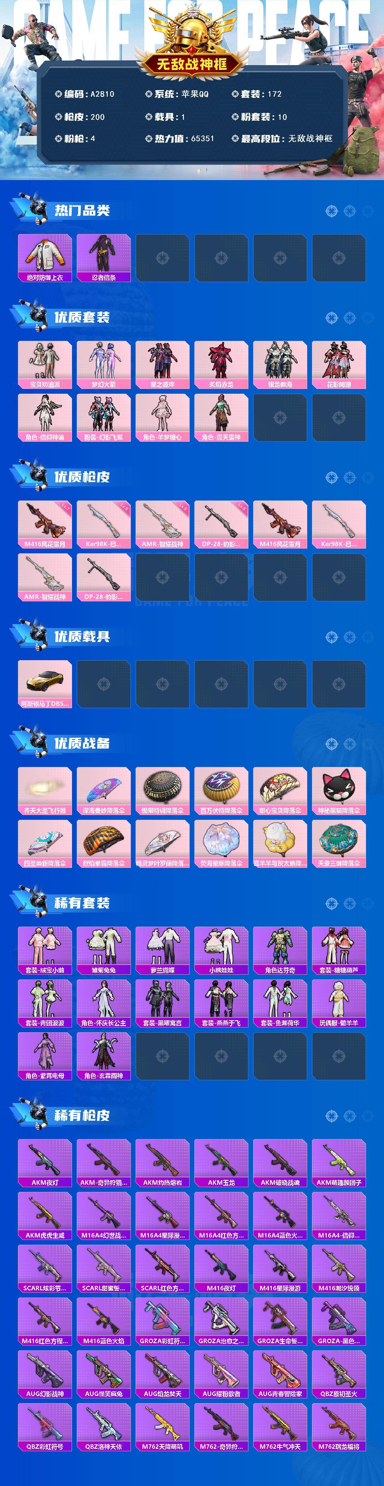 [15628425]苹果【男神号 粉装-宝贝奶油派/m416-风花雪月/阿斯顿马丁dbs(金)/粉装-梦幻火箭/kar98k-巳巳如意】 手q-无敌战神框-10粉装-4特效呛-1载具-2粉色飞行器-65351热力值-14王牌印记-172套装-200呛皮 【热门品类】:粉装-梦幻火箭,绝对防御上衣,套装-浪漫天命,套装-深海小丑鱼,套装-奇异狩猎者,套装-忍者信条,套装-潮萌小黄鸭,套装-暗影哥特,套装-粉红小猪,角色-mark.06,m416-星际漫游 【粉色套装】:粉装-宝贝奶油派,粉装-梦幻火箭,粉装-星之彼岸,粉装-炙焰赤龙,粉装-银龙傲海,粉装-花影阑珊,角色-信仰神谕,粉装-幻影飞狐,角色-羊梦糖心,角色-震天雷神 【粉色呛皮等级】:m416-风花雪月七级,kar98k-巳巳如意五级,amr-智耀战神五级,dp-28-豹影疾电五级 【粉色载具】:阿斯顿马丁dbs(金) 【粉色呛皮】:m416-风花雪月,kar98k-巳巳如意,amr-智耀战神,dp-28-豹影疾电 【粉色飞行器】:齐天大圣飞行器 【粉色降落伞】:深海曼妙降落伞,极限特训降落伞,百万伏特降落伞,甜心宝贝降落伞,神秘黑猫降落伞,四圣焕新降落伞,烈焰拳霸降落伞,精灵梦叶罗丽降落伞,荧海星豚降落伞,喜羊羊与灰太狼降落伞,天象三御降落伞,炫彩糖果降落伞 【稀有套装】:套装-绒宝小鹅,套装-雪国风尚,套装-雏菊兔兔,套装-萝兰蝴蝶,套装-小熊娃娃,角色-达芬奇,套装-糖糖葫芦,套装-青团波波,角色-怀庆长公主,套装-黑曜寓言,套装-燕燕于飞,套装-鱼渊荷华,玩偶服-懒羊羊,角色-紫霄电母,角色-玄霖雨神,套装-炫彩糖果,角色-银色战姬 【稀有呛皮】:s12k-镜光械姬,scar-l-镜光械姬,akm-夜灯,akm-奇异狩猎者,akm-灼热熔岩,akm-玉龙,akm-破晓战魂,akm-萌趣颜团子,akm-虎虎生威,m16a4-幻世战舞者,m16a4-星际漫游,m16a4-红色方程式,m16a4-蓝色火焰,m16a4-信仰神谕,scar-l-炫彩节奏,scar-l-甜蜜誓约,scar-l-红色方程式,m416-夜灯,m416-星际漫游,m416-潮汐统领,m416-红色方程式,m416-蓝色火焰,groza-彩虹符号,groza-治愈之星,groza-生命誓言,groza-黑色刀锋,aug-幻影战神,aug