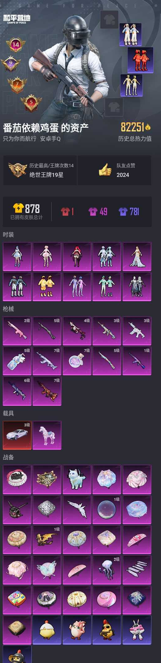 【和平精英】【lyhp20138】10粉装,12特效呛,2载具,历史最高段位:绝世王牌19星 王牌印记14次 热力值:82251,155套装,248呛械,306装备,140战备;套装:套装-梦幻火箭,套装-吟月归客,套装-薄荷物语,套装-憨憨奶龙,套装-未来领航者,角色-绯穹魔姬,角色-智耀战神,套装-幻彩电音,角色-奇迹舞步 美雪,角色-奇迹舞步 美琪,套装-红色运动,套装-黄色运动,套装-黄色伏地魔,套装-黑色伏地魔,套装-骑行爱好者,套装-竞技名士,套装-深蓝色名流,套装-湖蓝色名流,套装-长空猛禽,套装-海岛探路者,套装-旭日情侣,套装-浪漫天命,套装-特殊使命,套装-甜蜜告白,套装-蓝彩潮人,套装-魅力单车,套装-绮丽涂鸦,套装-耀眼新星,套装-都市漫游者,套装-雪山精英,套装-幻世战舞者,套装-暗影哥特,套装-青涩时光,套装-缤纷果语,套装-滨海厨神,套装-破蛋小黄鸡,套装-鹤鸣,套装-动感兔斯基人偶服,套装-夏日音浪,套装-探宝勇士,套装-牛气满满,套装-牛气冲天,套装-ss18特训,套装-热情海星,套装-纯真浪花,套装-电音精灵,套装-吉莉礼服,套装-ss17特训,套装-瑞龙福将,套装-团圆交子,套装-炫光向阳,套装-福星高照,套装-豚鼠丹丹,套装-虎虎生威吉莉,套装-霓虹极客,套装-绿翡凌光,套装-月蓝流光,套装-ss19特训,套装-兔兔白日梦,套装-飞驰魅影,套装-音速流光,套装-炫蓝之夏,套装-ss20特训,套装-覆海蛟龙,套装-甜心亚梦,套装-虚音幻奏,套装-ss21特训,套装-红熊茄茄,套装-暖心橘喵,套装-幸运萌趣趣,套装-玉兔迎春,套装-绯格组合,套装-ss23特训,套装-妙红点点,套装-幻彩翩翩,套装-柠萌假日,套装-ss24特训,套装-软软马卡龙,套装-龟仙人,套装-ss25特训,套装-惊鸿侠骨,套装-锦衣飞扬,套装-香桃花海,套装-牛仔情诗,套装-果汁能量,套装-龙的传人,套装-冰河战士,套装-ss26特训,套装-快闪甜心,套装-春光漫游,套装-漫游都市,套装-空岛之星,套装-焰鹰斗篷,套装-幻羽潜行,套装-ss27特训,套装-恋语绒绒,套装-ss28特训,角色-mark.06,套装-创世·幻影,套装-雪夜云雾,套装-ss29特训,套装-雏菊兔兔,套装-萝兰蝴蝶,套装-异域银装,角色-蜜桃派对,角色-都市丽猫,套装-闪电轻猫,角色-糖霜甜心,套装-ss30特训,套装-青团波波,角色-夜瞳黯灵,角色-绛羽幽主,套装-糖糖葫芦,套装-小鸟芋圆,套装-ss31特训,套装-鱼渊荷华,套装-石蕴玉辉,套装-燕燕于飞,套装-晶灵使者,角色-瑰梦爱神,套装-紫幽梦,套装-粉恋花,套装-晶辉守护,套装-ss33特训,套装-云朵鹅,套装-汪仔布丁,套装-ss32特训,套装-彩虹兔,套装-青翼流星,套装-风舞幻音,套装-蓝冰羽,套装-顶瓜瓜,套装-雪绒豹,套装-大橘大利,角色-幽澜祭司,角色-鲛海歌灵,套装-星渊小夜曲,套装-霓虹热舞,套装-蜜露汐语,套装-星影赞美诗,玩偶服-美羊羊,套装-黄油吐司,套装-ss34特训,套装-擎苍青焰,套装-朱霞炽焰,套装-游乐,套装-凌霄紫焰,套装-薄荷星砂,套装-ss35特训,套装-午间小调,套装-风迹短诗,套装-琴音绮想,套装-画境星梦,套装-ss36特训,套装-雪国风尚;呛皮:7级m416-风花雪月,3级m416-灵猫魔法师,m416-葫芦兄弟,m416-糯团青竹,ace32-画境星梦,ace32-冰晶雪宝,3级蜜獾-荧海星豚,蜜獾-垂柳戏鸭,蜜獾-天降萌叽,蜜獾-糖糖葫芦,蜜獾-绯穹魔姬,蜜獾-鸡智如我,蜜獾-风迹短诗,蜜獾-绿洲时空,蜜獾-乌木金纹,1级akm-星际浪客,7级akm-幻海仙踪,akm-虎虎生威,akm-筑梦精灵,akm-龙的传人,akm-荧星灵猫,akm-玄冥寒域,akm-霓彩脉冲,akm-绿洲时空,m762-瑞龙福将,m762-彩虹符号,m762-天降萌叽,m762-雏菊兔兔,m762-云朵鹅,mk47-林间仙鹿,mk47-洛神天依,mk47-乌木金纹,mk47-妙红点点,mk47-幻海仙踪,mk47-风迹短诗,groza-彩虹符号,groza-异彩先驱,groza-晶梦幻蝶,groza-荧海星豚,m16a4-甜心亚梦,m16a4-幻世战舞者,m16a4-冰河战士,6级scar-l-青春物语,scar-l-夜灯,scar-l-青丘仙客,scar-l-彩虹符号,scar-l-玉兔迎春,scar-l-海盐豹豹,q-彩虹符号,q-洛神天依,q-飞驰魅影,q-纯真浪花,famas-月下星之子,famas-汪仔布丁,famas-乌木金纹,g36c-星穹咏叹调,g36c-乌木金纹,aug-青春冒险家,aug-异域银装,aug-紫晶流影,ac-val-甜心亚梦,ac-val-天降萌叽,ac-val-快闪甜心,arx-凌霄紫焰,莫辛纳甘-乌木金纹,莫辛纳甘-蜜语绒猫,莫辛纳甘-汪仔布丁,莫辛纳甘-风迹短诗,amr-妙红点点,amr-喜羊羊与灰太狼,amr-乌木金纹,5级kar98k-巳巳如意,kar98k-梦幻火箭,kar98k-彩虹符号,kar98k-炫彩节奏,kar98k-蓝莓炮弹,kar98k-飞驰魅影,kar98k-顶峰精英,kar98k-星穹咏叹调,kar98k-乌木金纹,m24-樱桃泡泡,m24-乌木金纹,svd-云朵鹅,win94-瑞龙福将,win94-乌木金纹,m200-惊鸿侠骨,m200-乌木金纹,awm-不夜海上花,awm-焰鹰斗篷,awm-纯真浪花,awm-奇迹舞步,sks-夜灯,sks-炫彩节奏,sks-糯团青竹,qbu-全功率超战,mk20-h-莲影清波,mk20-h-快闪甜心,mk20-h-樱桃泡泡,mk20-h-糖糖葫芦,mk20-h-乌木金纹,mini14-春暖花开,mini14-梦幻火箭,mini14-炫彩节奏,mini14-异彩先驱,mini14-星夜魔法师,mini14-香桃花海,mini14-雏菊兔兔,mini14-绯穹魔姬,mini14-鸡智如我,mini14-辉羽雀灵,2级mk14-樱桃泡泡,mk14-乌木金纹,mk14-冰河战士,mk14-紫幽梦,mk14-薄荷星砂,vss-碧影闪光,vss-香桃花海,m417-惊鸿侠骨,m417-玩趣呆呆,mk12-风迹短诗,mk12-乌木金纹,m1加兰德-画境星梦,4级vect-绯穹魔姬,vect-生命誓言,vect-彩虹符号,vect-暗夜玫瑰,vect-焰鹰斗篷,vect-燕燕于飞,uzi-炫彩节奏,uzi-天降萌叽,uzi-冰河战士,uzi-啾咪啾咪,uzi-汪仔布丁,p90-飞驰魅影,p90-筑梦精灵,p90-快闪甜心,p90-乌木金纹,ump45-夜灯,ump45-蓝色火焰,ump45-生命誓言,ump45-繁龙极客,ump45-海盐豹豹,ump45-糖糖葫芦,u