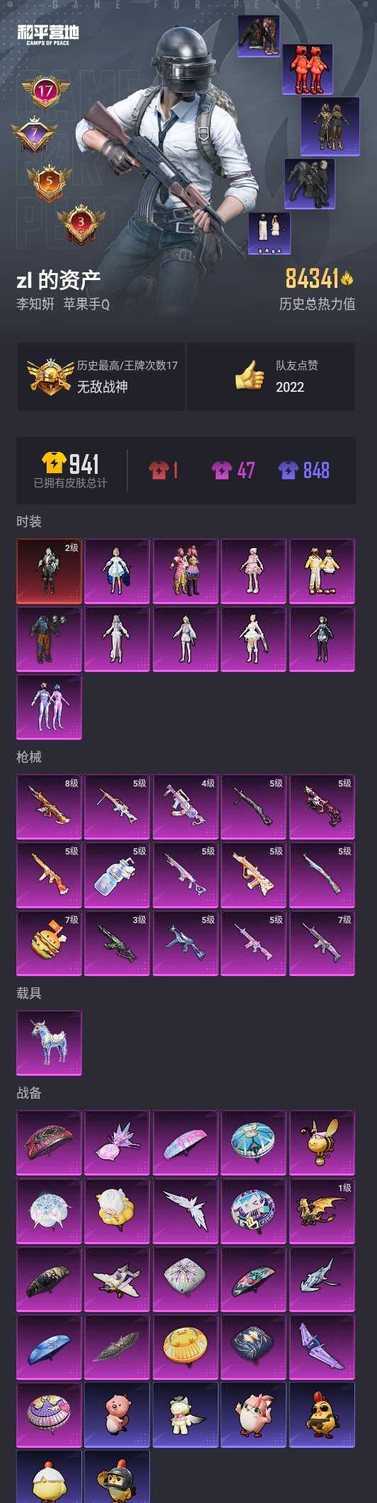 【和平精英】【lyhp20142】10粉装,15特效呛,1载具,历史最高段位:无敌战神 王牌印记17次 热力值:84341,183套装,265呛械,320装备,143战备;套装:幽焰骑士-维塔,套装-怪诞乔克,套装-梦幻火箭,套装-缤纷油彩,角色-洛天依,套装-暖熊萌萌,角色-脆鲨七海,角色-千金淑猫,角色-月下星之子,角色-冷漠罗丽,角色-羊梦糖心,套装-特训学院,套装-猎鹰,套装-蓝色运动,套装-黄色伏地魔,套装-白色伏地魔,套装-黑色伏地魔,套装-竞技名士,套装-黄色名流,套装-长空猛禽,套装-漫步者,套装-黎明保卫者,套装-海岛探路者,套装-旭日情侣,套装-赤蝎幽灵,套装-冷焰舞者,套装-都市猎人,套装-浪漫天命,套装-特战装甲,套装-战地菁英,套装-迎春赐吉,套装-春日漫步,套装-龙腾端午,套装-鹰眼刺客,套装-完美偶像,套装-幻影武者,套装-摇滚战魂,套装-街头潮人,套装-蓝彩潮人,套装-魅力单车,套装-绮丽涂鸦,套装-都市漫游者,套装-野性战心,套装-破晓战魂,套装-雪山精英,套装-幻世战舞者,套装-甜蜜菠萝,套装-暗影哥特,套装-弄潮海豚,套装-呆萌铁蟹,套装-夏日倾情,套装-甜蜜熊情侣,套装-青涩时光,套装-缤纷果语,套装-龙魂突击队,套装-冰川特警,套装-格斗先锋,套装-麻辣教官,套装-沙漠守护者,套装-小丑鱼,套装-破蛋小黄鸡,套装-疯狂小兔子,套装-纯白誓言,套装-智慧之神,套装-萌黄之夏,套装-动感兔斯基人偶服,套装-夏日音浪,套装-顽皮玉兔,套装-探宝勇士,套装-红红火火,套装-牛气满满,套装-战术大师,套装-牛气冲天,套装-曼妙人鱼,套装-热情海星,套装-纯真浪花,套装-星梦畅游,套装-霓虹极客,套装-ss19特训,套装-飞驰魅影,套装-音速流光,套装-炫蓝之夏,套装-ss20特训,套装-恶魔喵喵,套装-甜心亚梦,套装-虚音幻奏,套装-ss21特训,套装-萌趣咩咩,套装-娇憨猪猪,套装-荷畔雨呱,套装-红熊茄茄,套装-玉兔迎春,套装-ss22特训,套装-和煦暖阳,套装-田园牧歌,套装-轻风白浪,套装-熠彩粉晶,套装-光之冒险,套装-绯格组合,套装-ss23特训,套装-神气柴柴,套装-懵萌河马,套装-王牌教练,套装-柠萌假日,套装-青玉碎影,套装-ss24特训,套装-软软马卡龙,套装-龟仙人,套装-涂山之恋,套装-ss25特训,套装-惊鸿侠骨,套装-锦衣飞扬,套装-香桃花海,套装-龙的传人,套装-ss26特训,套装-快闪甜心,套装-春光漫游,套装-漫游都市,套装-焰鹰斗篷,套装-幻羽潜行,套装-ss27特训,套装-ss28特训,套装暗影刺翼,玩偶服-卖崽青蛙,角色-听雨铃兰,角色-极地流光,角色-粉雾星云,角色-情公主,角色-mark.06,套装-街头风暴,套装-海盐绵绵冰,套装-ss29特训,套装-雏菊兔兔,角色-狂花道·娜可露露,套装-萝兰蝴蝶,角色-绯色魅影,角色-紫俏灵猫,套装-异域银装,套装-ss30特训,套装-青团波波,角色-光矢逐梦,角色-夜瞳黯灵,套装-糖糖葫芦,套装-夜幕侵蚀,套装-镭金极速,套装-纯白跃动,套装-小鸟芋圆,套装-诡诞巡游,套装-ss31特训,套装-鱼渊荷华,套装-燕燕于飞,套装-紫幽梦,套装-粉恋花,套装-ss33特训,套装-云朵鹅,套装-ss32特训,套装-彩虹兔,套装-樱梦幻音,套装-蓝冰羽,套装-荒原牛仔,套装-顶瓜瓜,套装-雪绒豹,套装-圣穹绘梦,套装-极速光影,套装-炫彩糖果,玩偶服-美羊羊,套装-元气之梦,套装-ss34特训,套装-擎苍青焰,套装-朱霞炽焰,套装-凌霄紫焰,套装-薄荷星砂,套装-ss35特训,套装-午间小调,套装-秘语星愿,套装-风迹短诗,套装-琴音绮想,套装-粉黛兰香,套装-画境星梦,套装-错位像素,套装-ss36特训,套装-超能元气,套装-萌鸡速递;呛皮:ac-val-甜心亚梦,ac-val-乌木金纹,ac-val-天降萌叽,ac-val-快闪甜心,4级groza-巴啦啦小魔仙,groza-田园牧歌,groza-懵萌河马,groza-海盐豹豹,m762-天降萌叽,m762-雏菊兔兔,m762-云朵鹅,5级aug-暖羊咩咩,aug-耀粉歌者,aug-异域银装,aug-冰晶雪宝,aug-紫晶流影,8级m416-至情至圣,5级m416-电玩时刻,m416-红色方程式,m416-糯团青竹,m416-错位像素,m416-魔童闹海 敖闰,7级scar-l-梦幻火箭,scar-l-生命誓言,scar-l-夜灯,scar-l-炫彩节奏,scar-l-彩虹符号,scar-l-玉兔迎春,scar-l-拳皇·狂花道,scar-l-海盐豹豹,scar-l-乐游熊熊,mk47-乌木金纹,mk47-风迹短诗,ace32-画境星梦,ace32-冰晶雪宝,3级akm-幽焰骑士,akm-灼热熔岩,akm-影袭,akm-缤纷海域,akm-破晓战魂,akm-沙漠守护者,akm-涂鸦街区,akm-霓彩脉冲,akm-绿洲时空,蜜獾-娇憨猪猪,蜜獾-垂柳戏鸭,蜜獾-天降萌叽,蜜獾-糖糖葫芦,蜜獾-风迹短诗,蜜獾-乌木金纹,arx-凌霄紫焰,g36c-炙焰牛王,g36c-懵萌河马,famas-月下星之子,famas-霓彩脉冲,famas-乌木金纹,q-彩虹符号,q-洛神天依,q-飞驰魅影,q-纯真浪花,m16a4-甜心亚梦,m16a4-幻世战舞者,win94-乌木金纹,awm-黄金龙骨,awm-雷霆特警,awm-恐龙拽拽,awm-焰鹰斗篷,awm-纯真浪花,awm-绿洲时空,5级kar98k-巳巳如意,kar98k-梦幻火箭,kar98k-炫彩节奏,kar98k-飞驰魅影,amr-时光之誓,amr-喜羊羊与灰太狼,amr-乌木金纹,m200-仲夏莫吉托,m200-惊鸿侠骨,m200-乌木金纹,莫辛纳甘-乌木金纹,莫辛纳甘-懵萌河马,莫辛纳甘-镭金极速,莫辛纳甘-风迹短诗,svd-冷漠罗丽,svd-云朵鹅,svd-霓彩脉冲,m24-奇异狩猎者,m24-炫彩节奏,m24-青空秋雨,m24-乌木金纹,5级mk14-甜梦熊击,mk14-乌木金纹,mk14-紫幽梦,mk14-薄荷星砂,mk20-h-快闪甜心,mk20-h-星梦奇缘,mk20-h-糖糖葫芦,mk20-h-净心行者,mk20-h-狂鲨锋刃,mk20-h-乌木金纹,mini14-金玉无双,mini14-梦幻火箭,mini14-耀粉歌者,mini14-香桃花海,mini14-雏菊兔兔,mini14-绯穹魔姬,mini14-镭金极速,mini14-鸡智如我,sks-金玉无双,sks-迅猛狂鲨,sks-糯团青竹,sks-乐游熊熊,slr-沙漠守护者,slr-娇