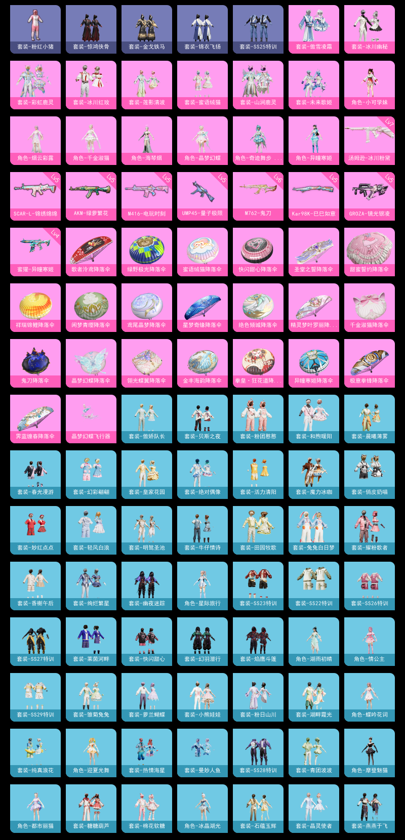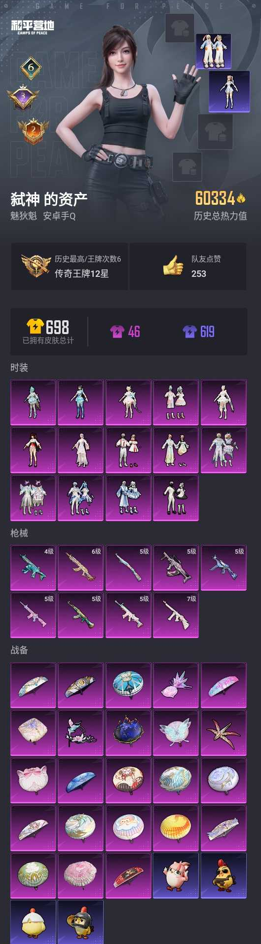 【和平精英】【lyhp20122】14粉装,9特效呛,0载具,历史最高段位:传奇王牌12星 王牌印记6次 热力值:60334,133套装,162呛械,266装备,114战备;套装:套装-彩虹鹿灵,套装-山涧鹿灵,套装-傲雪凌霜,套装-冰川幽秘,套装-冰川红玫,角色-小可学妹,套装-莲影清波,套装-未来歌姬,套装-蜜语绒猫,角色-烟云彩露,角色-异瞳寒姬,角色-千金淑猫,角色-晶梦幻蝶,角色-奇迹舞步 雅雅,套装-特训学院,套装-红色运动,套装-竞技名士,套装-长空猛禽,套装-六六大吉,套装-青春校园,套装-魅力单车,套装-耀眼新星,套装-热血青春,套装-幻世战舞者,套装-青涩时光,套装-缤纷果语,套装-元素星魂,套装-粉红小猪,套装-破蛋小黄鸡,套装-霓虹街区,套装-白熊同盟,套装-白糯汤圆,套装-战术大师,套装-耀粉歌者,套装-曼妙人鱼,套装-热情海星,套装-纯真浪花,套装-魔力冰咖,套装-兔兔白日梦,套装-粉团憨憨,套装-俏皮奶喵,套装-ss22特训,套装-和煦暖阳,套装-田园牧歌,套装-轻风白浪,套装-绚烂繁星,套装-绯格组合,套装-ss23特训,套装-莱茵河畔,套装-香榭午后,套装-妙红点点,套装-幻彩翩翩,套装-活力清阳,套装-王牌教练,套装-柠萌假日,套装-青玉碎影,套装-皇家花园,套装-春野茶蘼,套装-龟仙人,套装-ss25特训,套装-金戈铁马,套装-惊鸿侠骨,套装-锦衣飞扬,套装-晨曦薄雾,套装-绝对偶像,套装-香桃花海,套装-牛仔情诗,套装-龙的传人,套装-ss26特训,套装-快闪甜心,套装-春光漫游,套装-空岛之星,套装-明鸳圣池,角色-星际旅行,套装-傲娇队长,套装-贝斯之夜,套装-焰鹰斗篷,套装-幽夜迷踪,套装-幻羽潜行,套装-ss27特训,套装-老实芭蕉,套装-ss28特训,角色-蝶吟花词,角色-湖雨初晴,角色-迎夏光舞,角色-情公主,套装-街头风暴,套装-海盐绵绵冰,套装-蝶变,套装-湖畔霞光,套装-粉日山川,套装-小熊娃娃,套装-ss29特训,套装-雏菊兔兔,套装-萝兰蝴蝶,角色-绯色魅影,角色-紫俏灵猫,套装-芝莓熊熊,角色-摩登魅猫,角色-都市丽猫,套装-星途旅人,套装-ss30特训,套装-青团波波,套装-棉花软糖,套装-糖糖葫芦,套装-摩登天骄,套装-果冻柠檬,套装-ss31特训,套装-鱼渊荷华,套装-石蕴玉辉,套装-燕燕于飞,套装-智谋强哥,套装-晶灵使者,角色-海琴烟,套装-晶辉守护,套装-ss33特训,套装-巳巳如意,套装-ss32特训,角色-冰晶湖光,角色-幽澜祭司,角色-鲛海歌灵,套装-炫彩糖果,套装-ss34特训,套装-ss35特训,套装-午间小调,套装-秘语星愿,套装-风迹短诗,套装-琴音绮想,套装-画境星梦,角色-月烬之祷,套装-ss36特训,套装-雪国风尚,套装-萌鸡速递;呛皮:4级蜜獾-异瞳寒姬,蜜獾-天降萌叽,蜜獾-精灵梦叶罗丽,蜜獾-糖糖葫芦,蜜獾-风迹短诗,5级m416-电玩时刻,m416-糯团青竹,m16a4-红色方程式,m16a4-幻世战舞者,m16a4-冰河战士,m16a4-千金淑猫,5级groza-镜光银凌,groza-田园牧歌,groza-晶梦幻蝶,5级scar-l-锦绣绵绵,scar-l-拳皇·狂花道,scar-l-星途旅人,scar-l-海盐豹豹,ac-val-快闪甜心,ac-val-兔兔小魔女,5级akm-绿萝繁花,akm-霓虹街区,akm-彩虹符号,akm-龙的传人,akm-江南烟雨,6级m762-鬼刀,m762-第五大道,m762-天降萌叽,m762-雏菊兔兔,m762-果冻柠檬,m762-登顶巅峰,ace32-画境星梦,ace32-冰晶雪宝,mk47-妙红点点,mk47-风迹短诗,q-纯真浪花,aug-冰川粉黛,aug-冰晶雪宝,m200-惊鸿侠骨,m200-乌木金纹,win94-晶梦幻蝶,win94-乌木金纹,awm-音爆索尼克,awm-天降萌叽,awm-焰鹰斗篷,awm-纯真浪花,莫辛纳甘-乌木金纹,莫辛纳甘-蜜语绒猫,莫辛纳甘-风迹短诗,amr-妙红点点,amr-乌木金纹,5级kar98k-巳巳如意,kar98k-彩虹符号,svd-霓彩脉冲,mk20-h-快闪甜心,mk20-h-白蛇盈舞,mk20-h-星途旅人,mk20-h-糖糖葫芦,mk20-h-净心行者,mk20-h-乌木金纹,vss-田园牧歌,slr-彩虹符号,slr-金丰海韵,mini14-耀粉歌者,mini14-星夜魔法师,mini14-雏菊兔兔,mk14-冰河战士,mk12-风迹短诗,mk12-乌木金纹,m1加兰德-画境星梦,m417-惊鸿侠骨,sks-糯团青竹,5级ump45-量子极限,ump45-生命誓言,ump45-糖糖葫芦,野牛-雏菊兔兔,野牛-燕燕于飞,野牛-果冻柠檬,uzi-天降萌叽,uzi-啾咪啾咪,uzi-月影灵韵,uzi-炫彩糖果,mp5k-画境星梦,mp5k-乌木金纹,7级汤姆逊-冰川粉黛,汤姆逊-天降萌叽,汤姆逊-纯真浪花,p90-快闪甜心,p90-玩趣呆呆,p90-巳巳如意,p90-乌木金纹,vect-田园牧歌,vect-焰鹰斗篷,vect-燕燕于飞,aks-74u-乌木金纹,dbs-第五大道,dbs-彩虹符号,dbs-焰鹰斗篷,dbs-风迹短诗,dbs-乌木金纹,s12k-夏日绵绵冰,s12k-香水柠檬,s12k-玩趣呆呆,s686-白勺歌姬,s686-蜜语绒猫,s686-千金淑猫,s686-巳巳如意,spas-12-田园牧歌,spas-12-燕燕于飞,spas-12-乌木金纹,s1897-神秘黑猫,s1897-精灵梦叶罗丽,s1897-电光马卡龙,aa12-g-纯真浪花,aa12-g-画境星梦,dp-28-橘柚倾心,dp-28-甜蜜旋律,dp-28-焰鹰斗篷,m249-彩虹符号,m249-妙红点点,m249-莲影清波,m249-萌萌彩虹球,m249-冰晶雪宝,mg3-幻世战舞者,mg3-乌木金纹,mg3-妙红点点,mg3-惊鸿侠骨,mg-36-薄荷星砂,pkm-蜜语绒猫,p1911-创世·救赎,p1911-果冻柠檬,沙墨之鹦-快闪甜心,信号呛-异瞳寒姬,信号呛-彩虹独角兽,蝎式手呛-千金淑猫,蝎式手呛-燕燕于飞,p18c-糖糖葫芦,短管霰弹2b战斗服款,r1895-雏菊兔兔,平底锅-田园牧歌,平底锅-妙红点点,平底锅-惊鸿侠骨,平底锅-快闪甜心,平底锅-空岛之星,平底锅-焰鹰斗篷,平底锅-纯真浪花,平底锅-雏菊兔兔,平底锅-魔法神域,平底锅-糖糖葫芦,平底锅-画境星梦,撬棍-冰晶雪宝,爆炸猎弓-惊鸿侠骨,盐雾蛋-炽纹蛇影,十子怒-异瞳寒姬,十子怒-燕燕于飞,破片手留单-呆爆全场,破片手留单-星途旅人,破片手留单-拽到爆炸,破