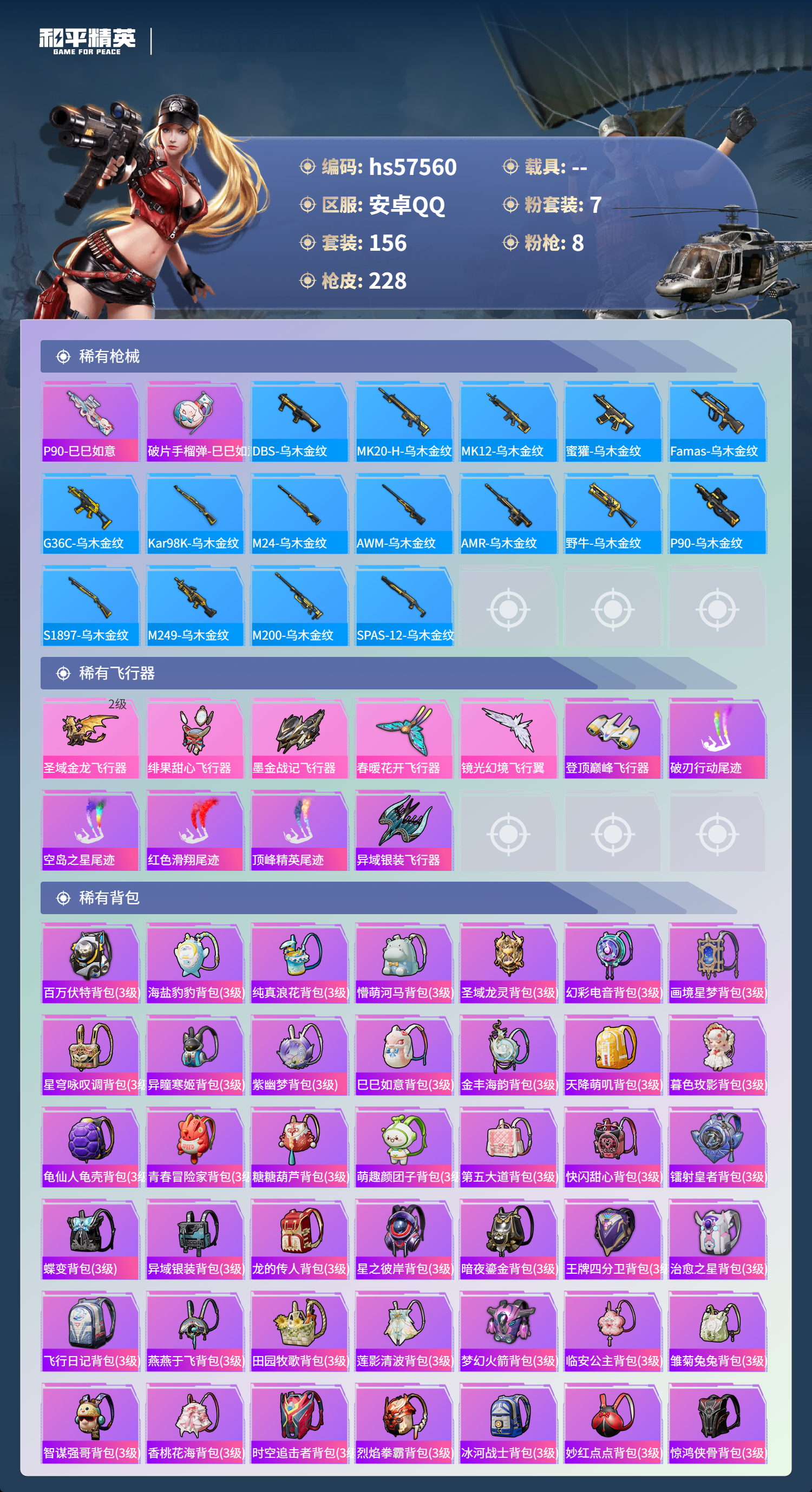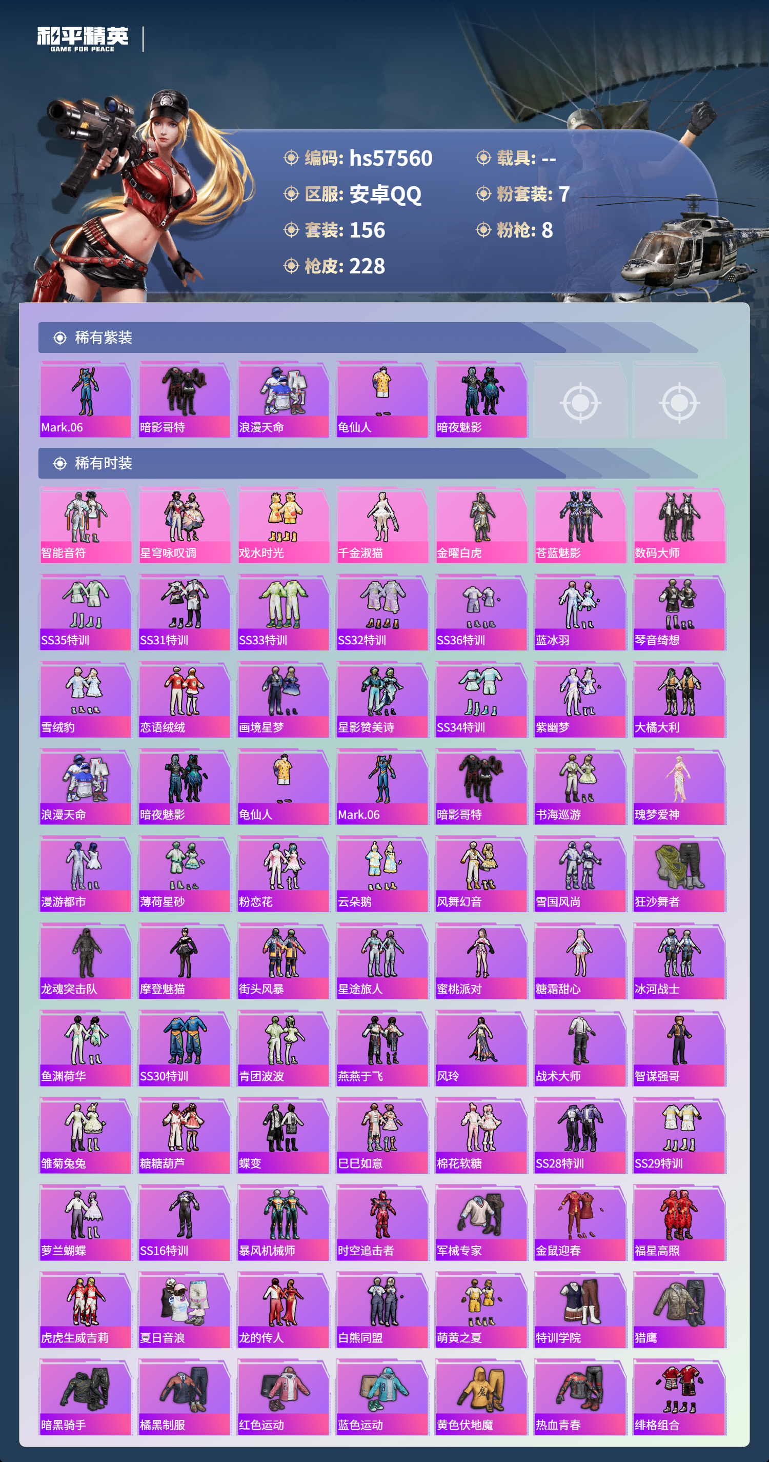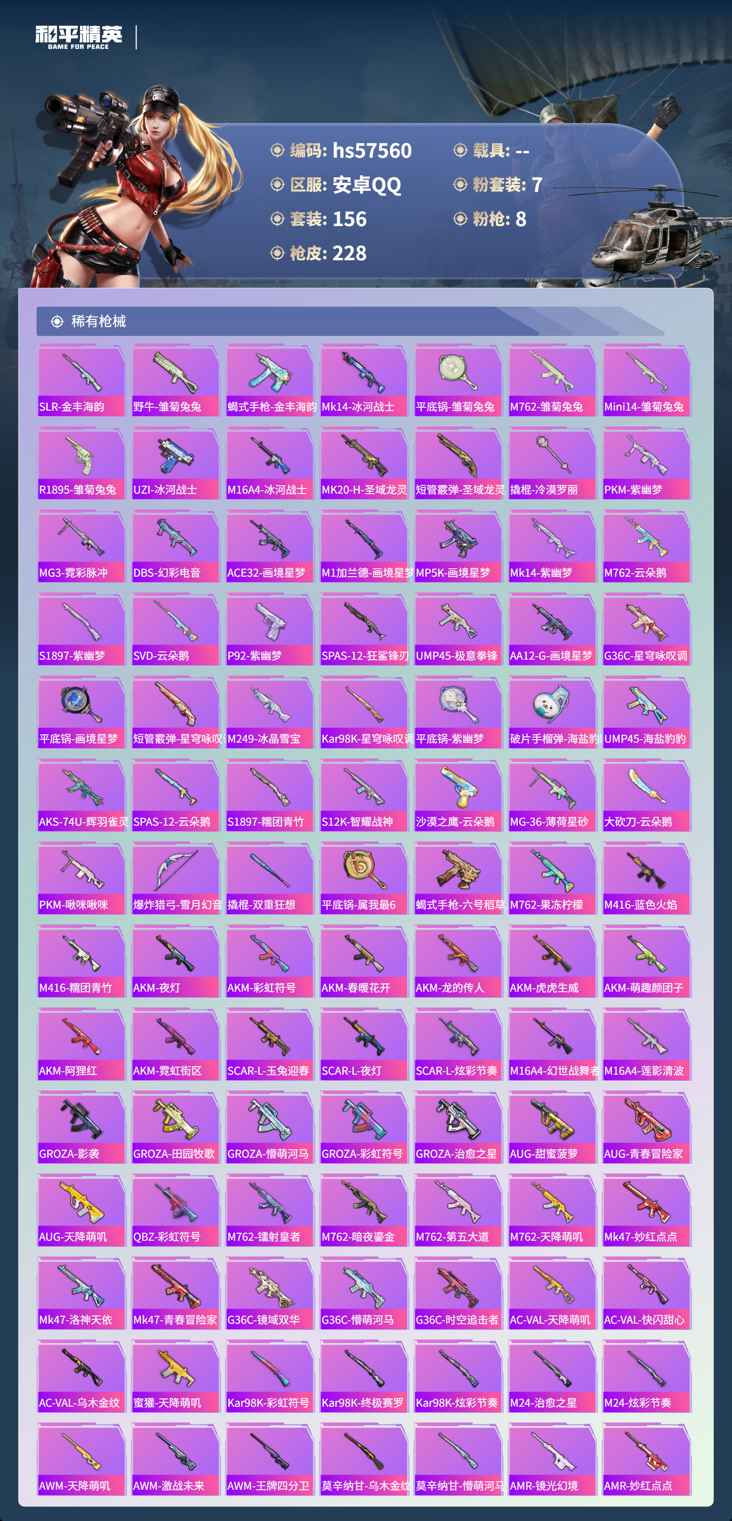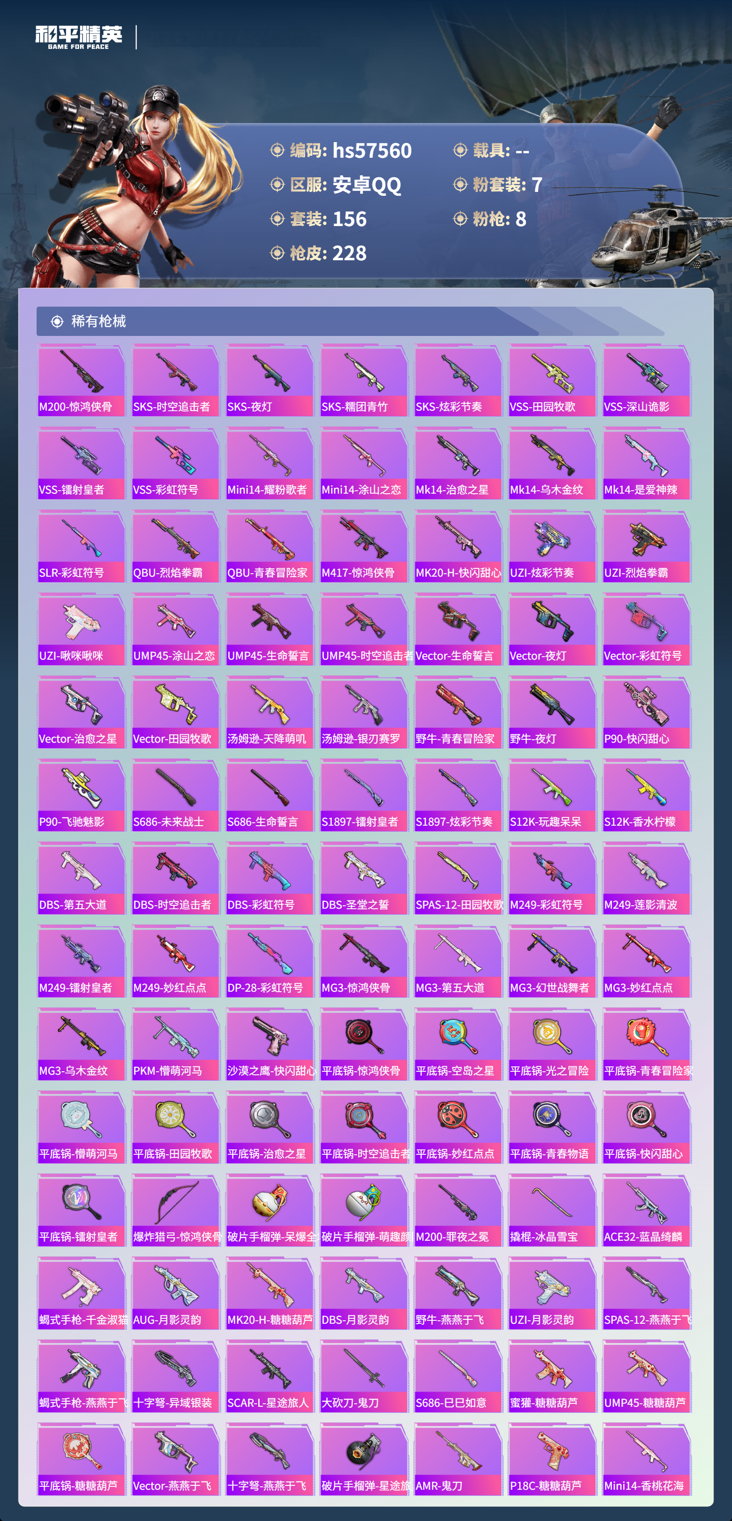0载具-156套装-228呛皮-hs57560 安卓手q-14王牌印记-7粉装-8特效呛-69501热力值-156套装-228呛皮-6卓越印记-2传奇印记【7粉装】套装-数码大师套装-星穹咏叹调套装-智能音符套装-戏水时光套装-苍蓝魅影套装-金曜白虎角色-千金淑猫【8特效呛】p90-金丰海韵/5级dp-28-豹影疾电/5级aug-暖羊咩咩/5级m200-伏羲圣卦/5级scar-l-纯梦嫁纱/7级akm