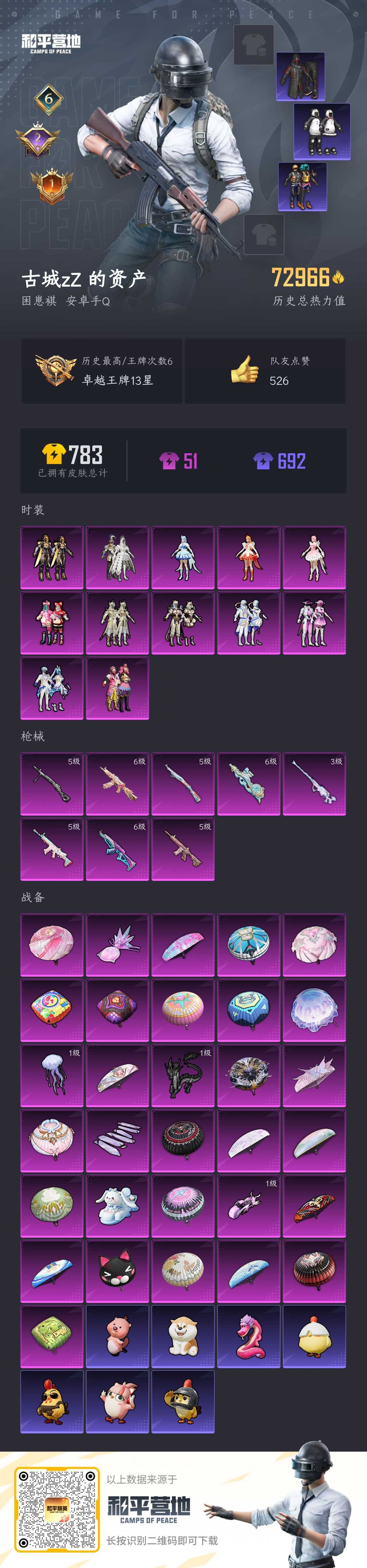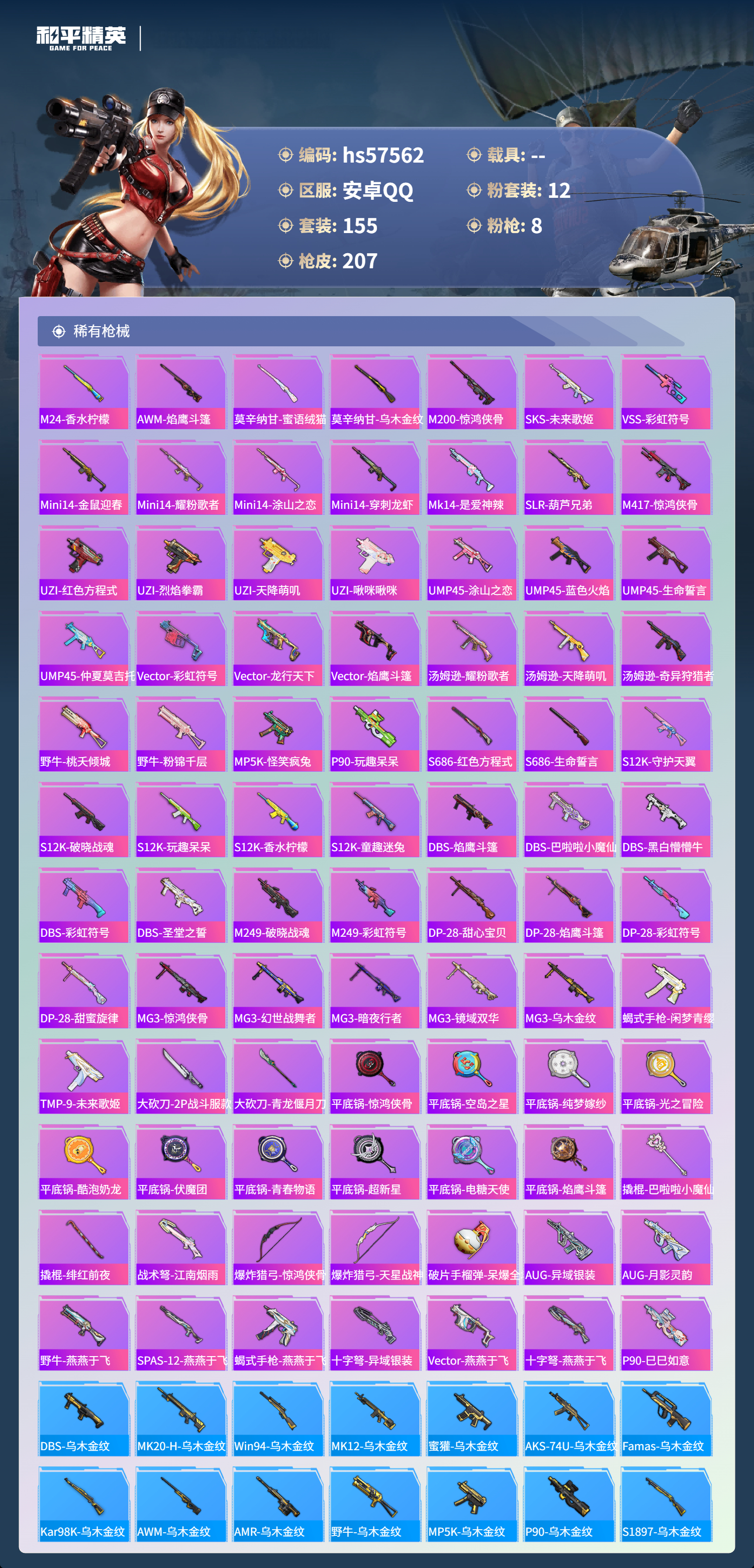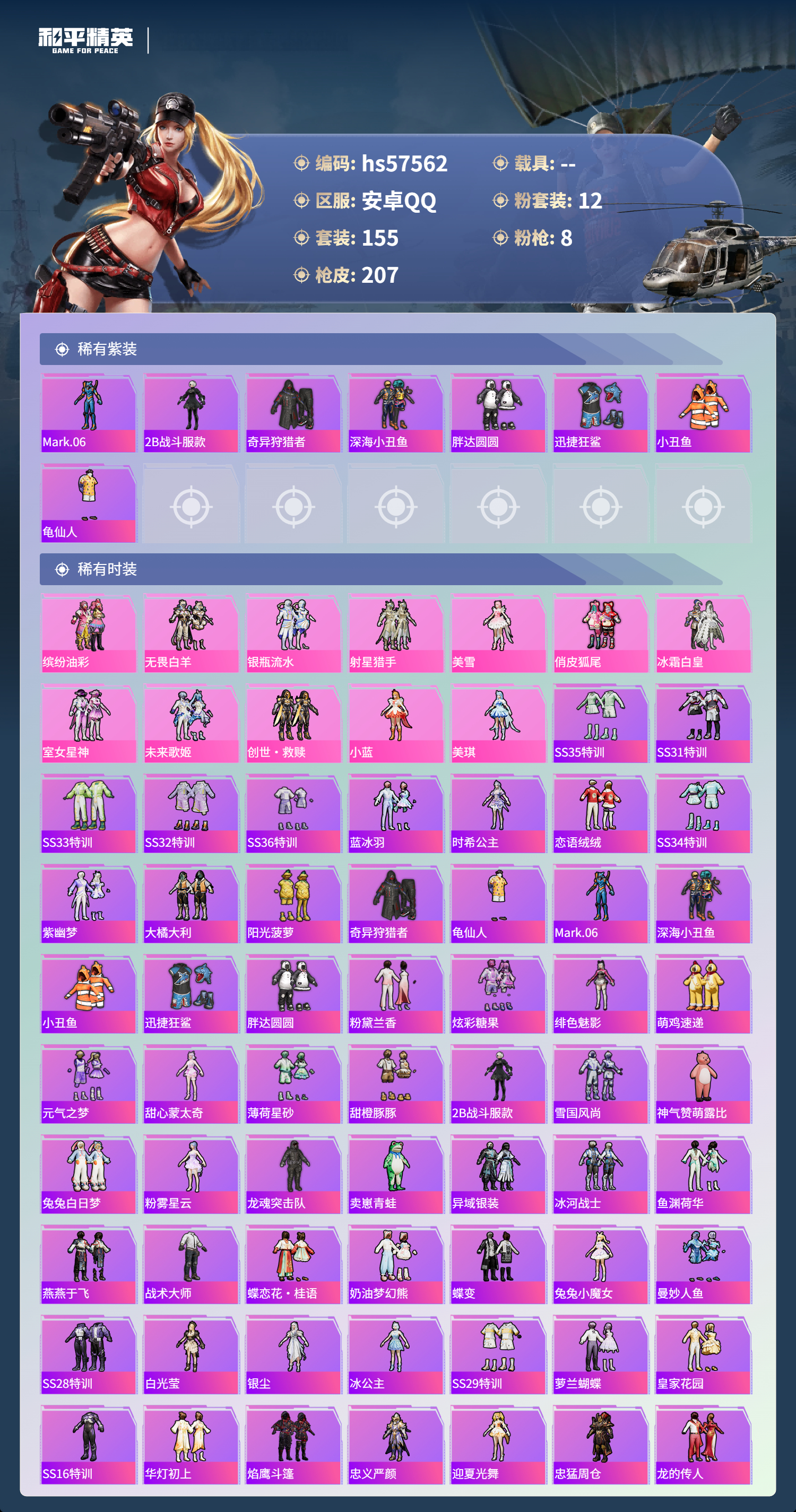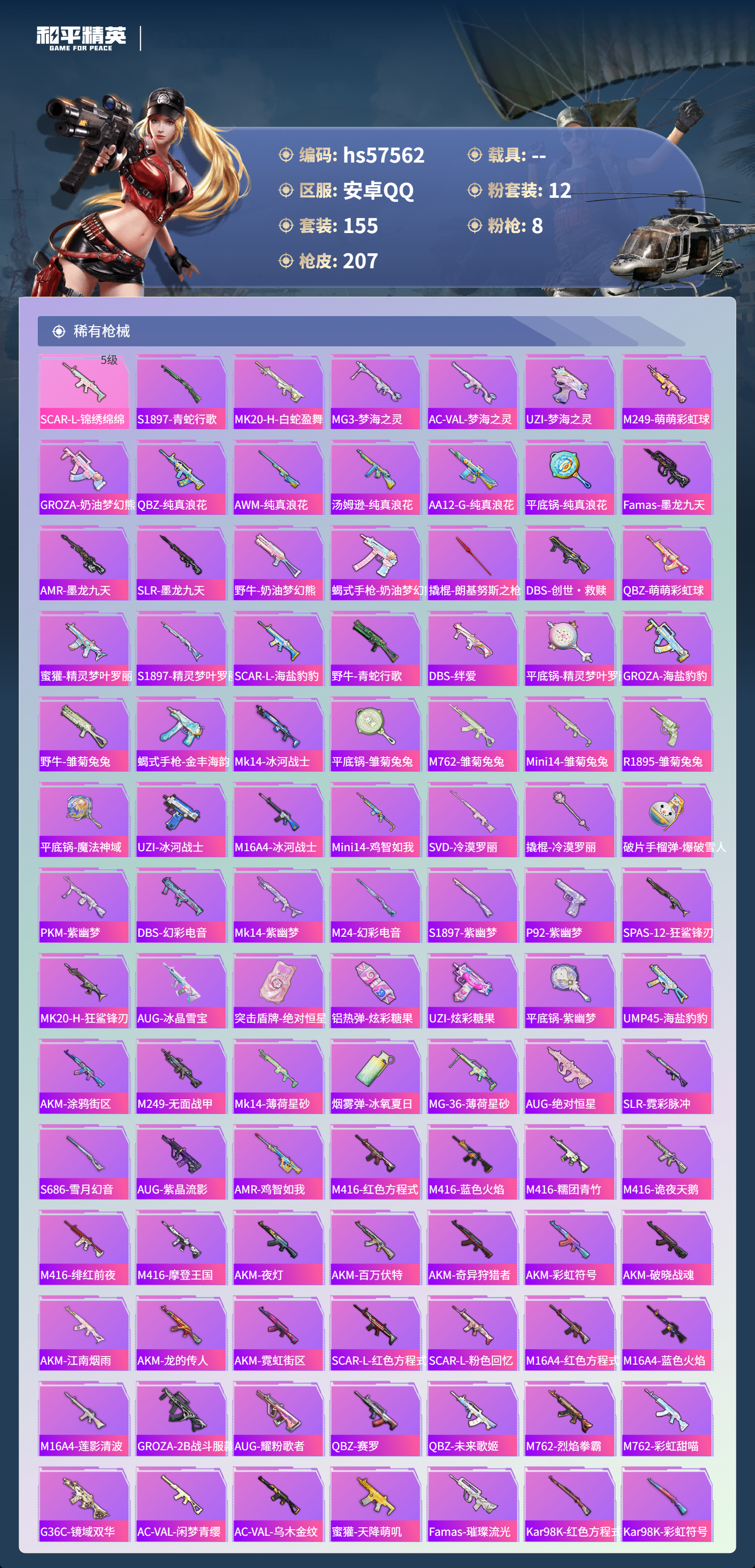 0载具-155套装-207呛皮-hs57562 安卓手q-6王牌印记-12粉装-8特效呛-72966热力值-155套装-207呛皮-2卓越印记-1传奇印记【12粉装】套装-室女星神角色-小蓝套装-冰霜白皇套装-创世·救赎套装-俏皮狐尾角色-美雪角色-美琪套装-无畏白羊套装-缤纷油彩套装-未来歌姬套装-射星猎手套装-银瓶流水【8特效呛】p90-金丰海韵/6级m416-心之恋语/5级m200-梦海之灵
