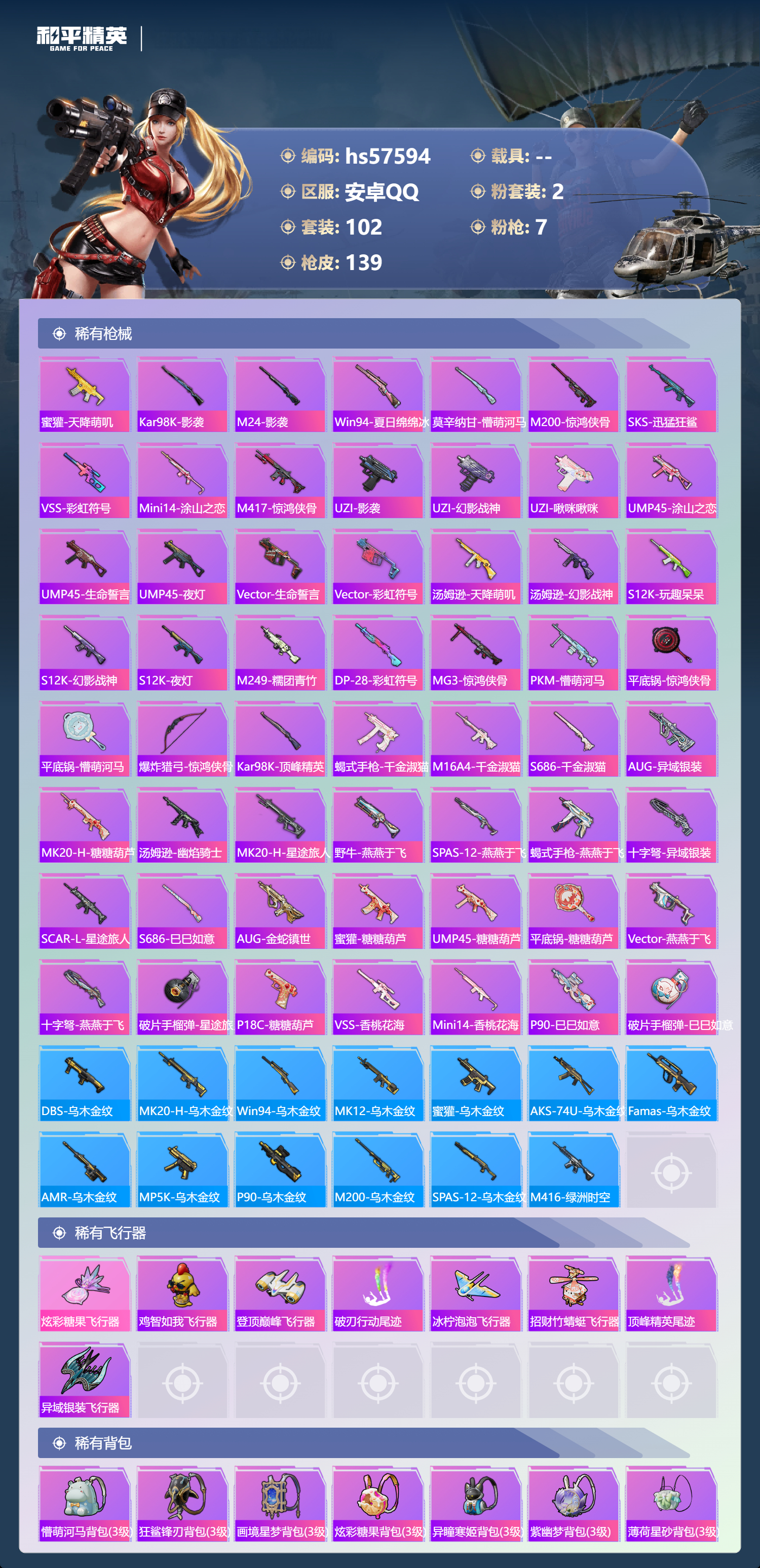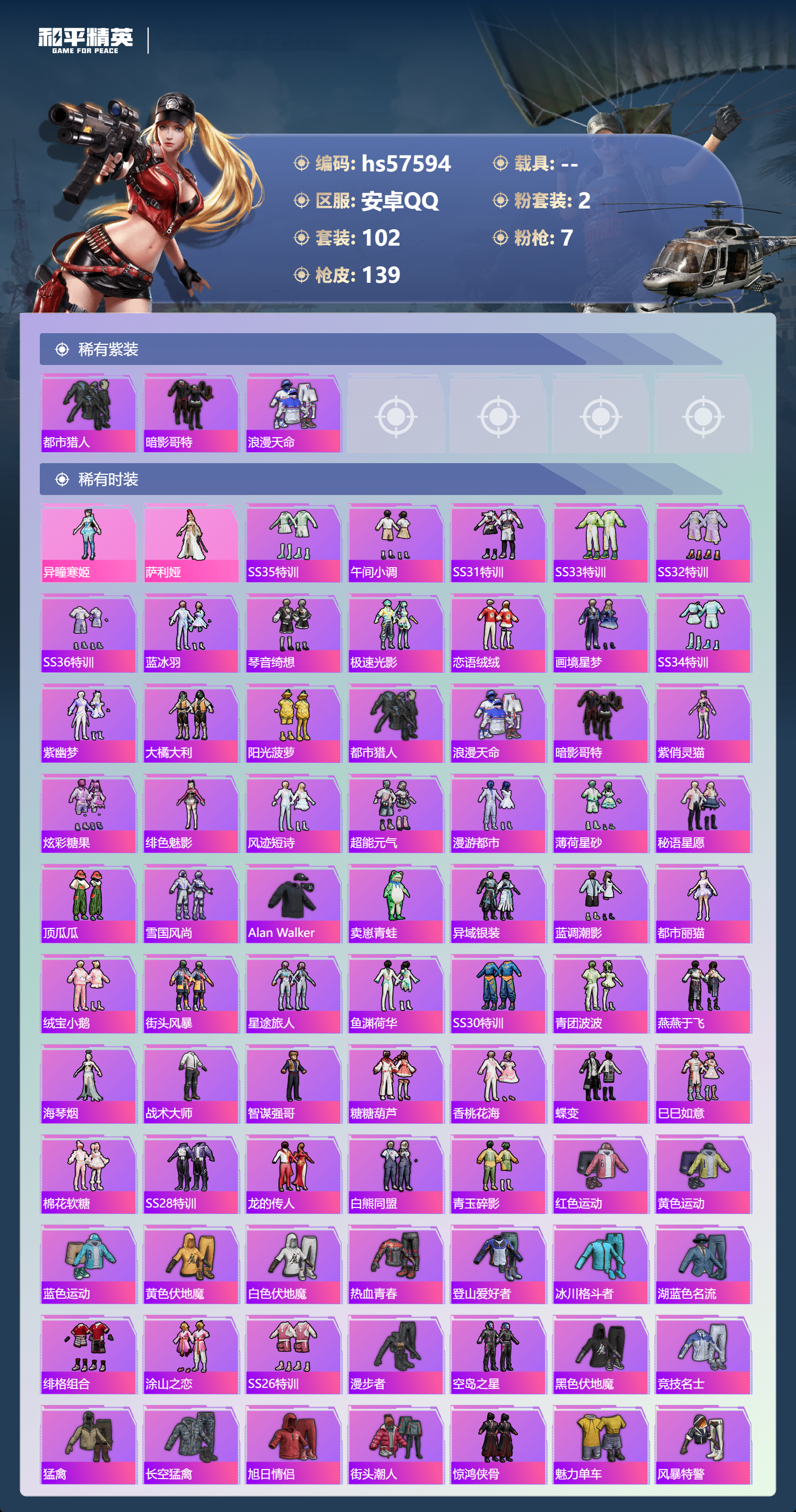 0载具-102套装-139呛皮-hs57594 安卓手q-8王牌印记-2粉装-7特效呛-39009热力值-102套装-139呛皮-4卓越印记-1传奇印记【2粉装】角色-异瞳寒姬角色-萨利娅【7特效呛】groza-镜光银凌/5级kar98k-巳巳如意/5级莫辛纳甘-未来领航者/6级dp-28-豹影疾电/5级蜜獾-异瞳寒姬/5级aug-暖羊咩咩/5级m762-青锋波束/5级【3稀有紫装】都市猎人暗影哥特浪漫天