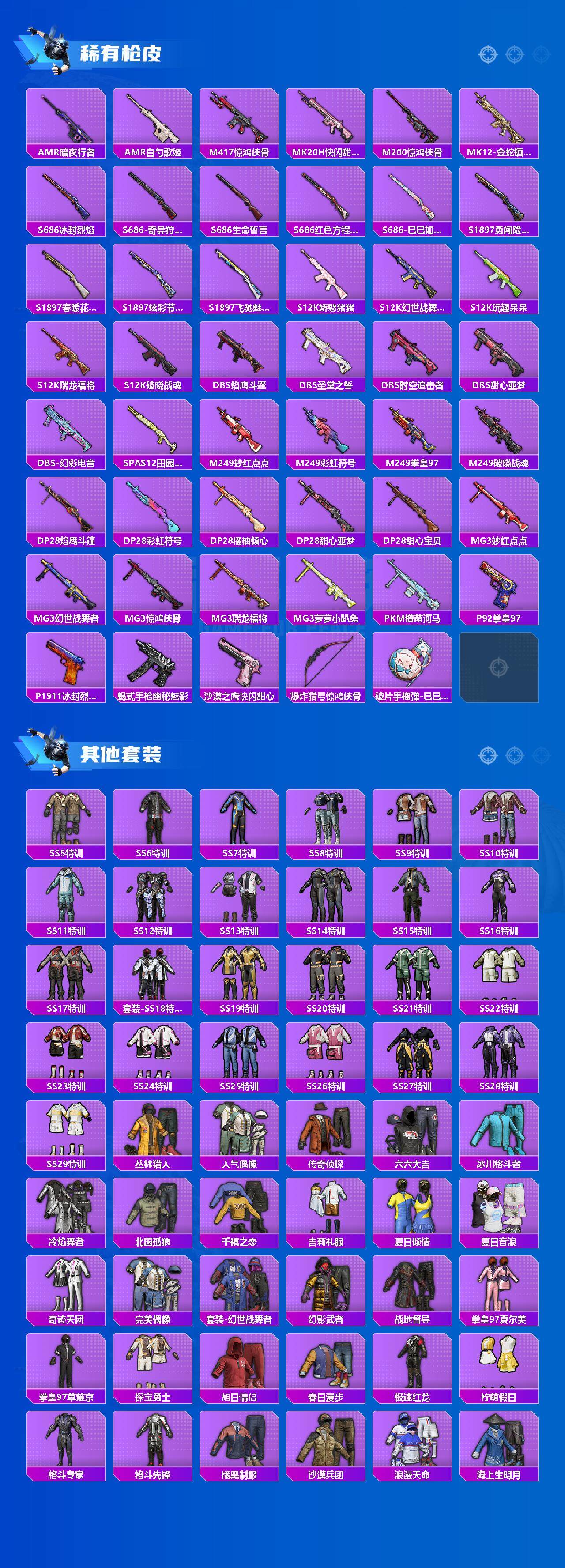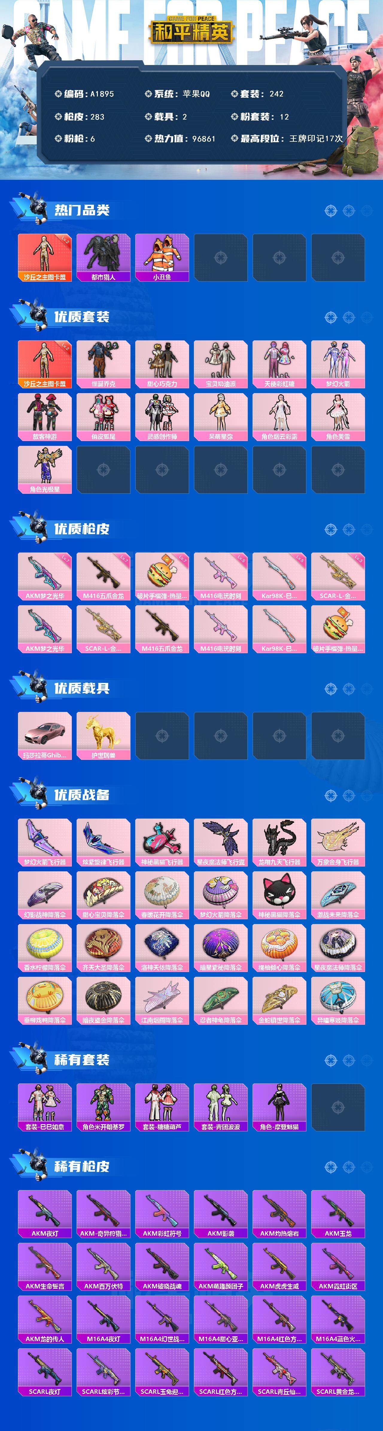 [15657136]苹果【素材号/沙丘之主-图卡盟/怪诞乔克/梦幻火箭/赤蝎幽灵/都市猎人/蓝螳螂/放客神游/萌熊伴侣背包/百万伏特背包】 手q-1神装-12粉装-6特效呛-2载具-8粉色飞行器-96861热力值-17王牌印记-242套装-283呛皮 【红色神装等级】:沙丘之主-图卡盟二级 【红色角色神装】:沙丘之主-图卡盟 【热门品类】:粉装-怪诞乔克,粉装-梦幻火箭,套装-浪漫天命,套装-赤蝎幽灵,套装-都市猎人,套装-小丑鱼,套装-龟仙人,套装-浪漫波比,套装-粉红小猪,角色-mark.06 【粉色套装】:粉装-怪诞乔克,粉装-甜心巧克力,粉装-宝贝奶油派,粉装-天使彩虹糖,粉装-梦幻火箭,粉装-放客神游,粉装-俏皮狐尾,粉装-灵感创作师,角色-呆萌星弥,角色-烟云彩露,角色-美雪,角色-光极星 【粉色呛皮等级】:akm-梦之光华七级,scar-l-金蛇镇世三级,m416-五爪金龙七级,m416-电玩时刻五级,kar98k-巳巳如意五级,破片手留单-热量炸弹七级 【粉色载具】:玛莎拉蒂ghibli(粉),护世瑞兽 【粉色呛皮】:akm-梦之光华,scar-l-金蛇镇世,m416-五爪金龙,m416-电玩时刻,kar98k-巳巳如意,破片手留单-热量炸弹 【粉色飞行器】:梦幻火箭飞行器,炫紫旋律飞行器,神秘黑猫飞行器,星夜魔法师飞行翼,龙翔九天飞行器,万象金身飞行器 【粉色降落伞】:幻影战神降落伞,甜心宝贝降落伞,春暖花开降落伞,梦幻火箭降落伞,神秘黑猫降落伞,激战未来降落伞,香水柠檬降落伞,齐天大圣降落伞,洛神天依降落伞,暗星紫秘降落伞,橘柚倾心降落伞,星夜魔法师降落伞,垂柳戏鸭降落伞,暗夜鎏金降落伞,江南烟雨降落伞,忍者神龟降落伞,金蛇镇世降落伞,异瞳寒姬降落伞 【稀有套装】:套装-龟仙人,套装-巳巳如意,角色-米开朗基罗,套装-糖糖葫芦,套装-青团波波,角色-摩登魅猫,套装-炫彩糖果 【稀有呛皮】:aug-冰晶雪宝,akm-夜灯,akm-奇异狩猎者,akm-彩虹符号,akm-影袭,akm-灼热熔岩,akm-玉龙,akm-生命誓言,akm-百万伏特,akm-破晓战魂,akm-萌趣颜团子,akm-虎虎生威,akm-霓虹街区,akm-龙的传人,m16a4-夜灯,m16a4-幻世战舞者,m16a4-甜心亚梦,m16a4-红色方程式,m16a4-蓝色火焰,