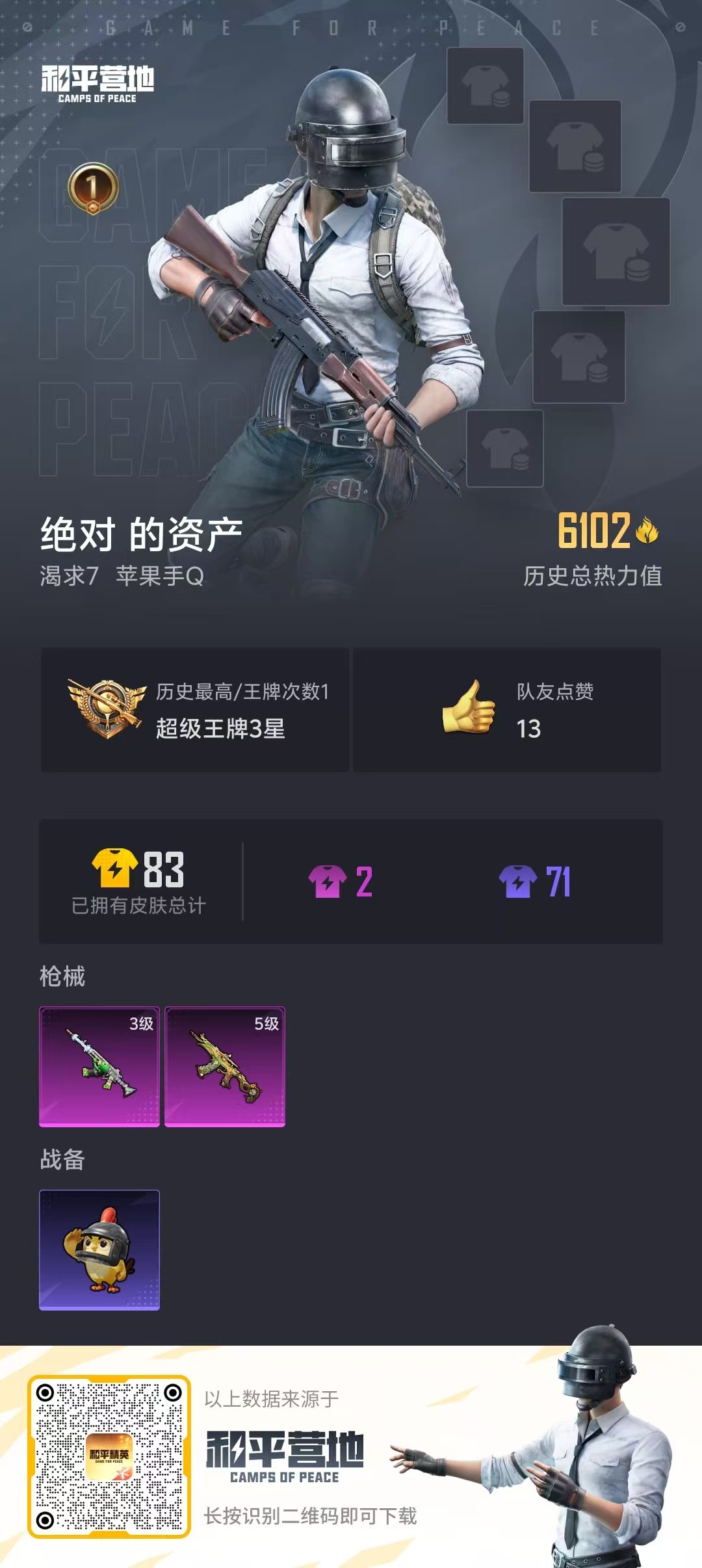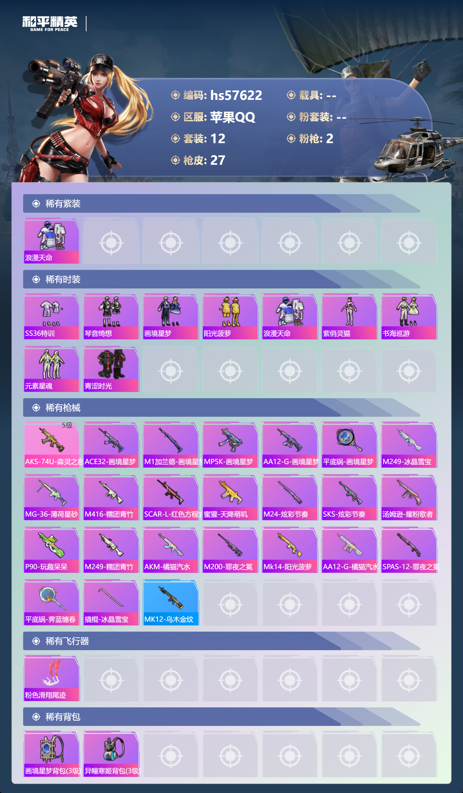 0载具-12套装-27呛皮-hs57622 苹果手q-1王牌印记-2特效呛-6102热力值-12套装-27呛皮【2特效呛】aks-74u-森灵之息/5级ace32-绿头鱼/3级【1稀有紫装】浪漫天命【9稀有时装】ss36特训琴音绮想画境星梦阳光菠萝浪漫天命紫俏灵猫书海巡游元素星魂青涩时光【24稀有呛械】aks-74u-森灵之息/5级mk12-乌木金纹ace32-画境星梦m1加兰德-画境星梦m